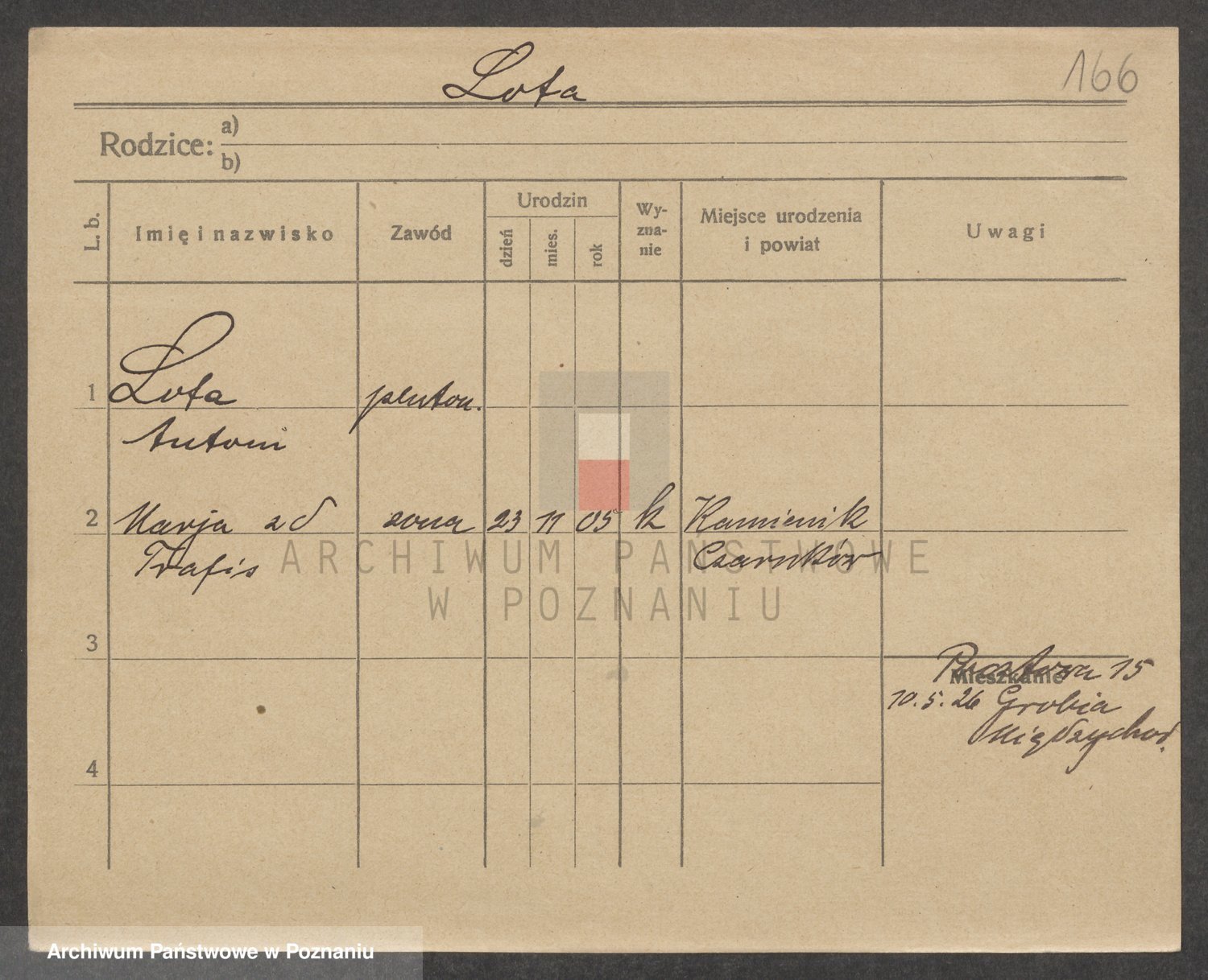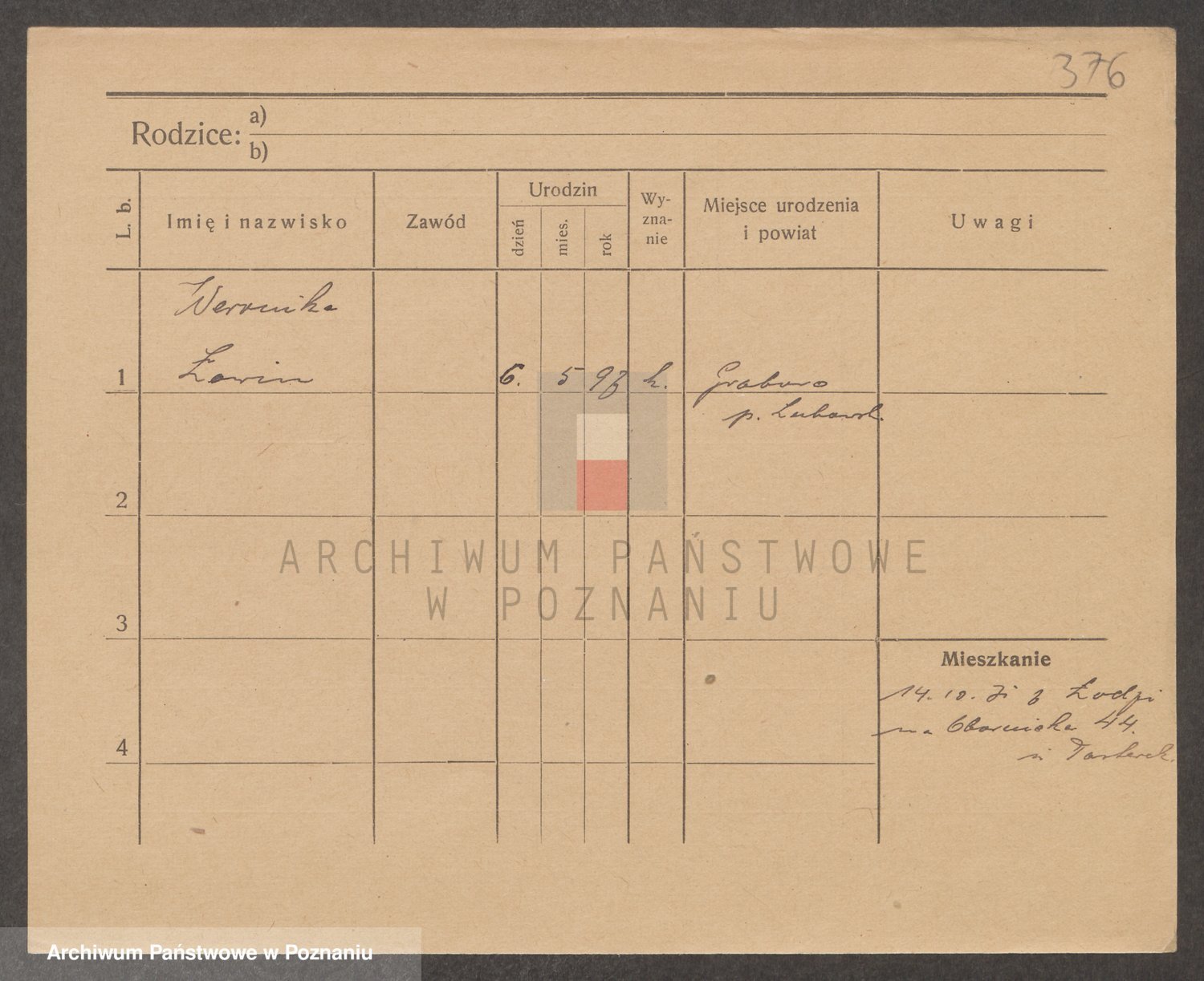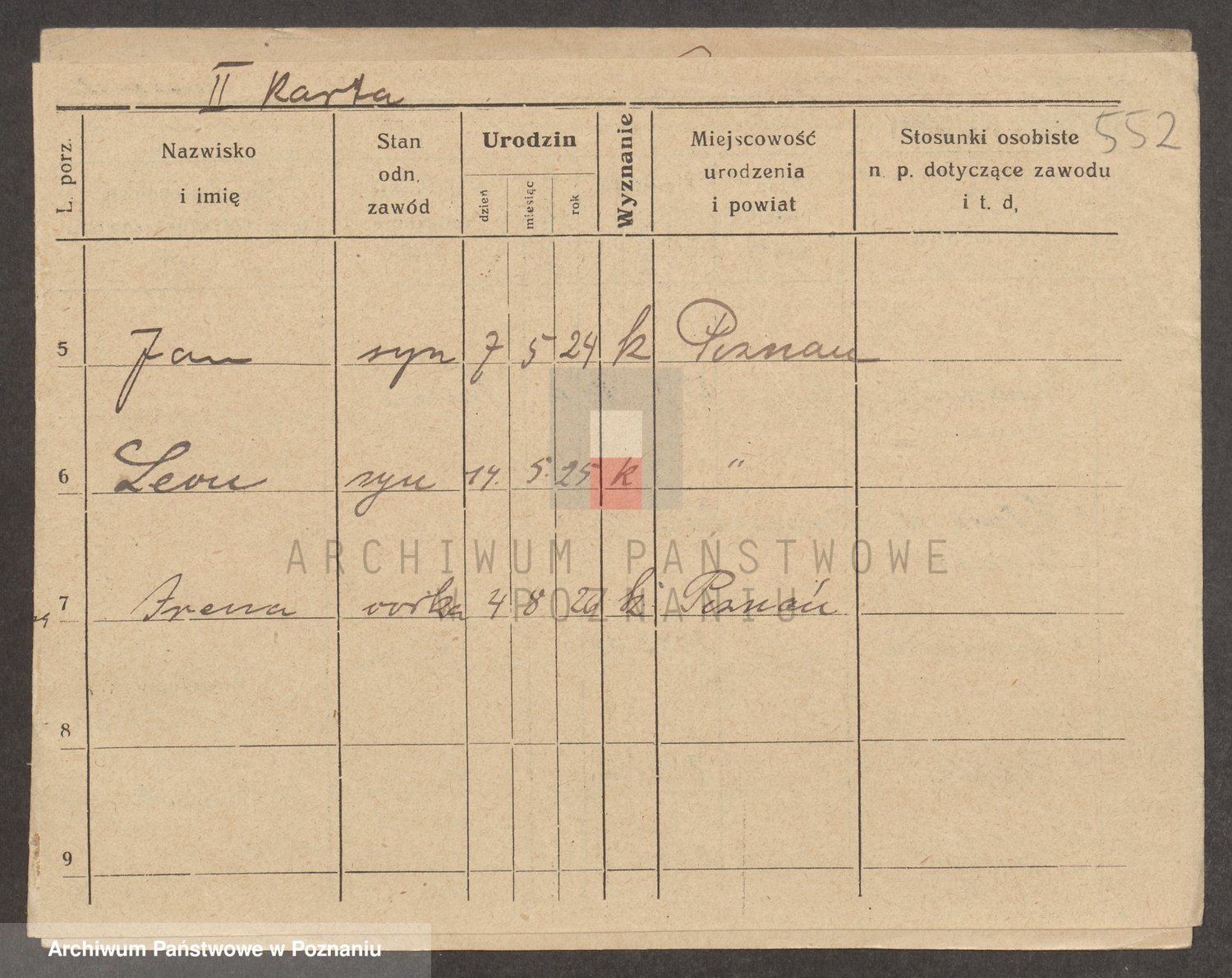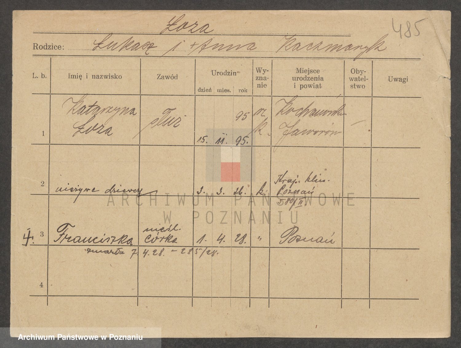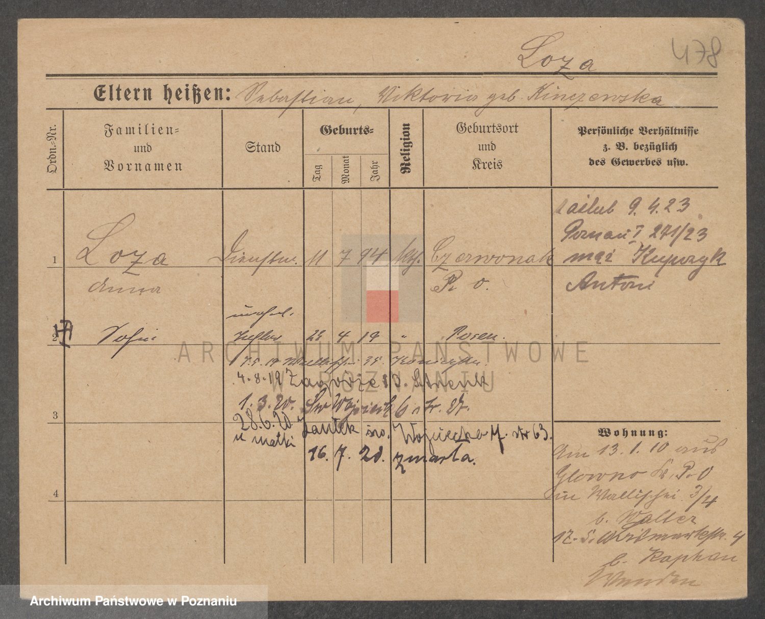 Podgląd karty osobowej dostępny jest po kliknięciu na nazwisko lub ikonkę karty. Można dokonywać powiększenia (ikony na górze) lub przechodzić między kolejnymi skanami (strzałki po bokach).