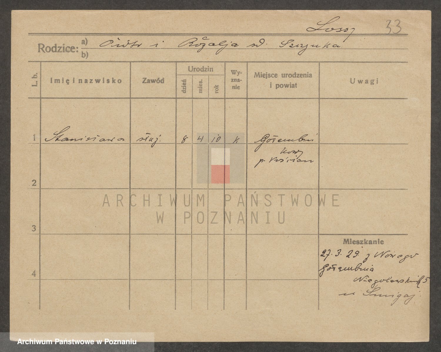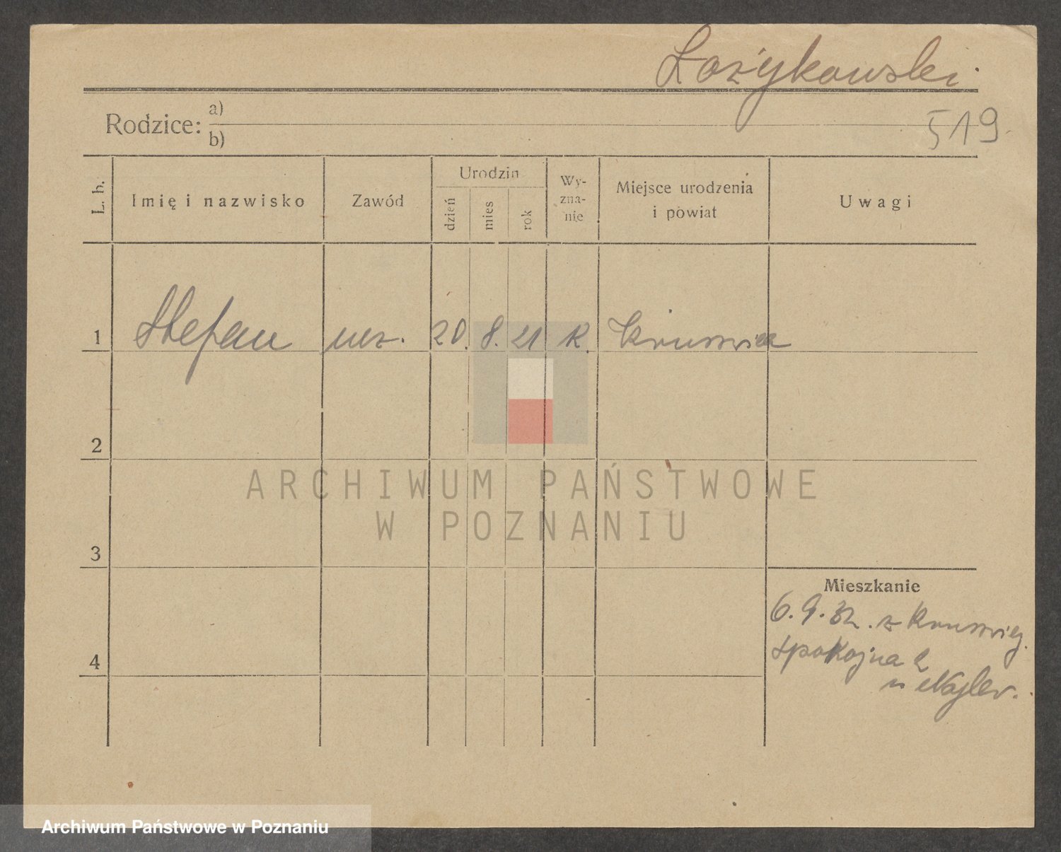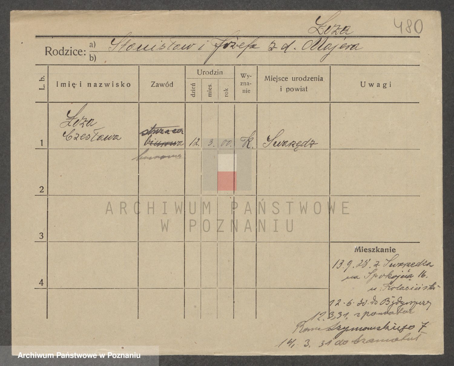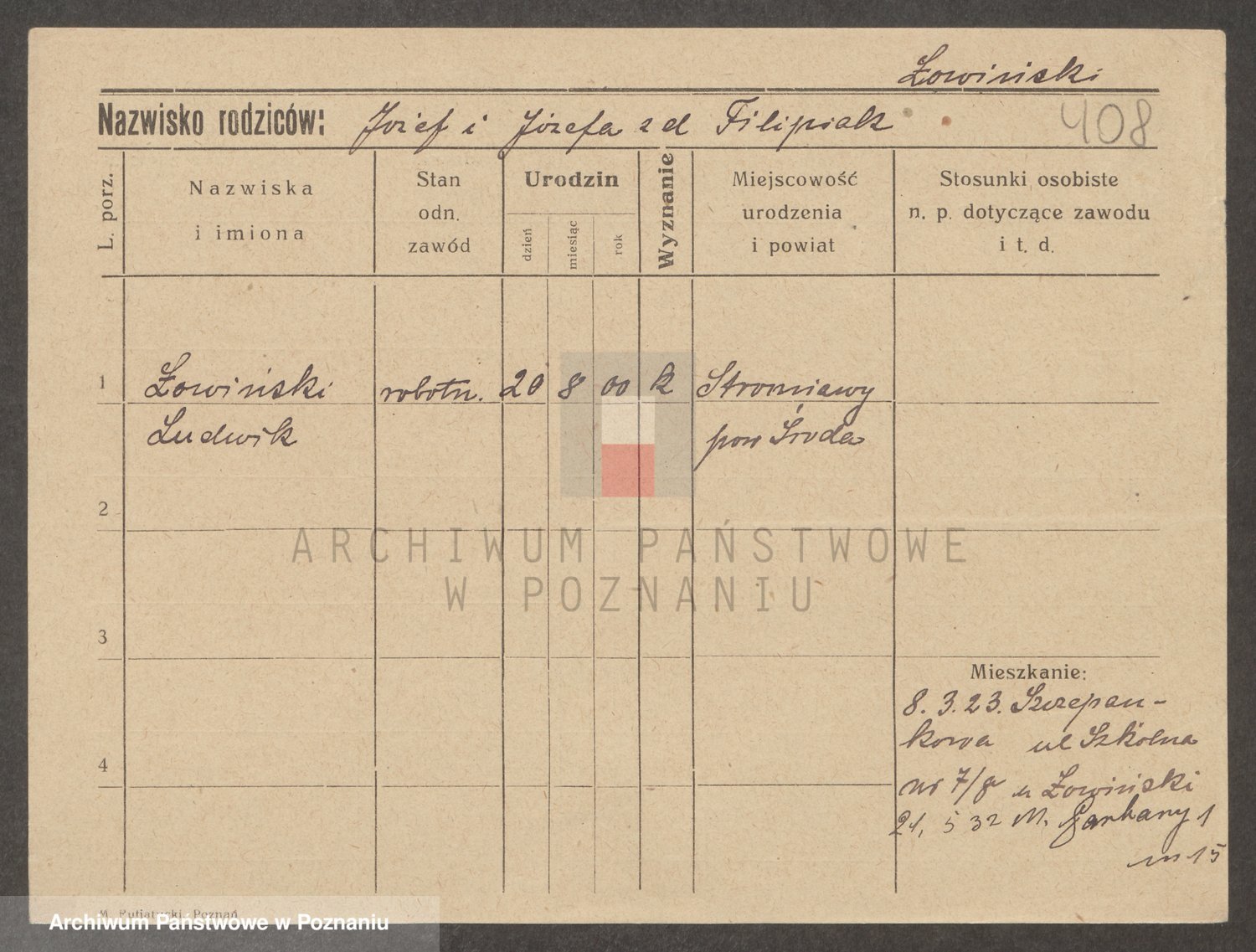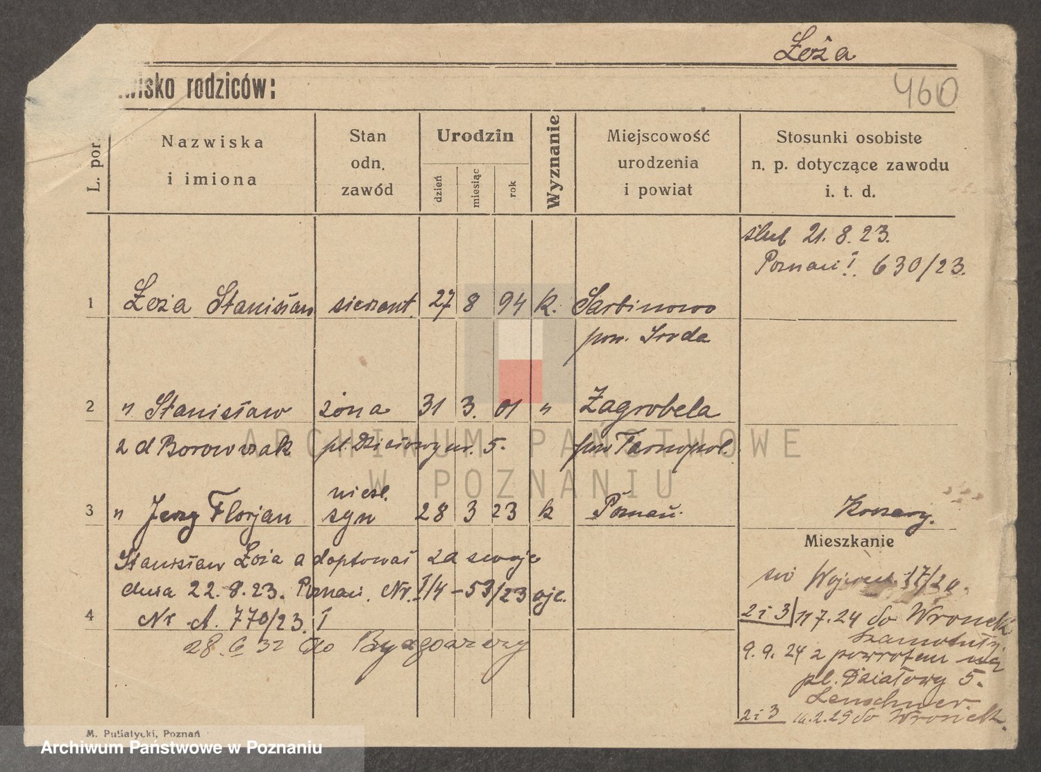 Podgląd karty osobowej dostępny jest po kliknięciu na nazwisko lub ikonkę karty. Można dokonywać powiększenia (ikony na górze) lub przechodzić między kolejnymi skanami (strzałki po bokach).