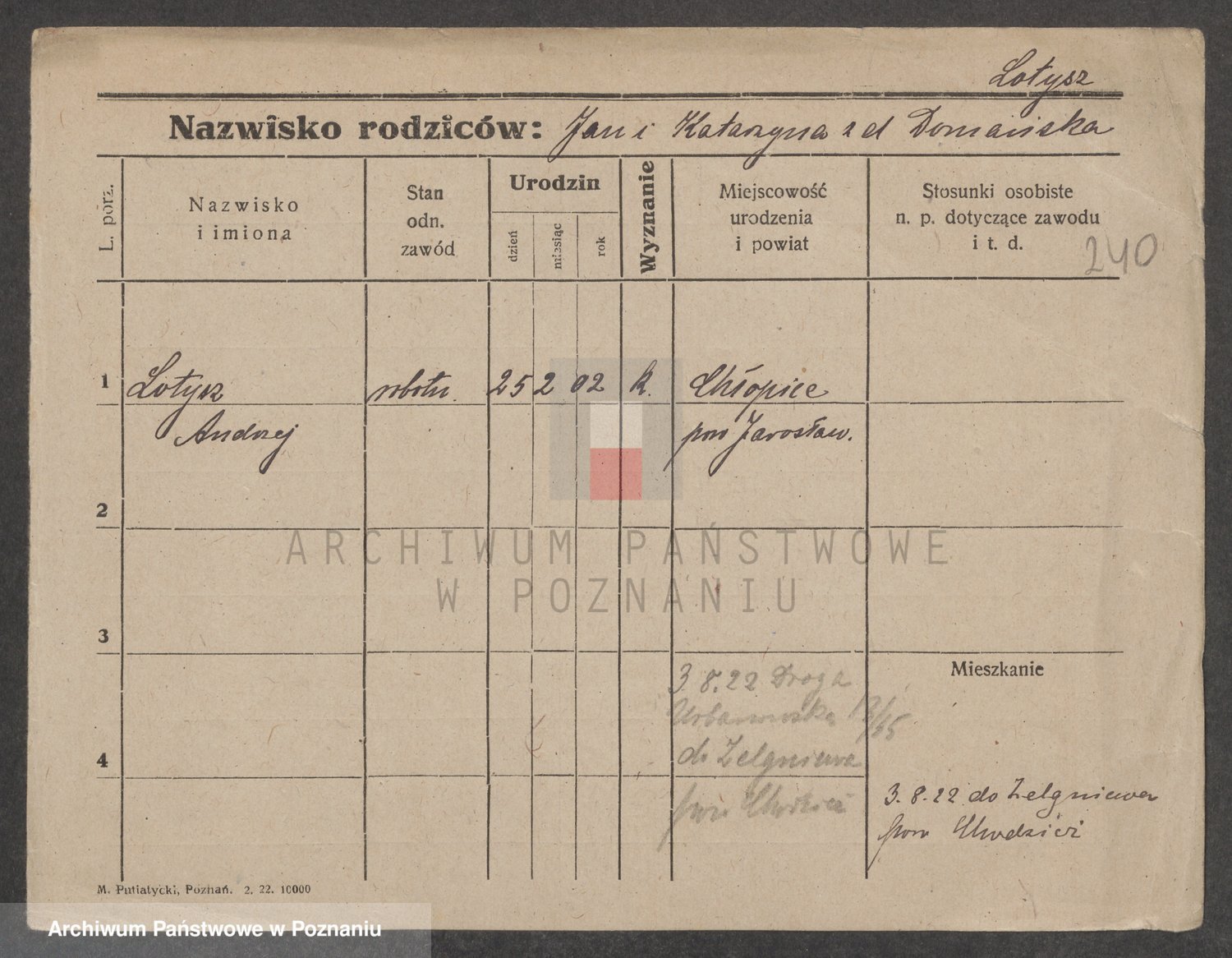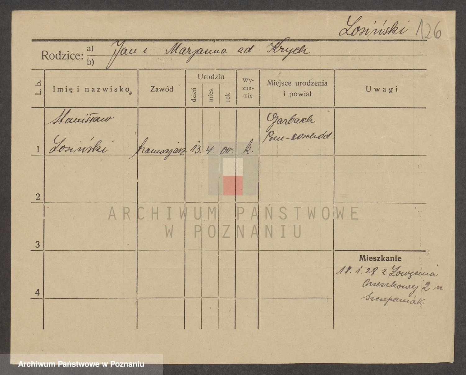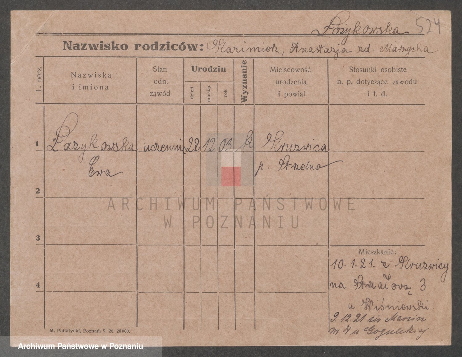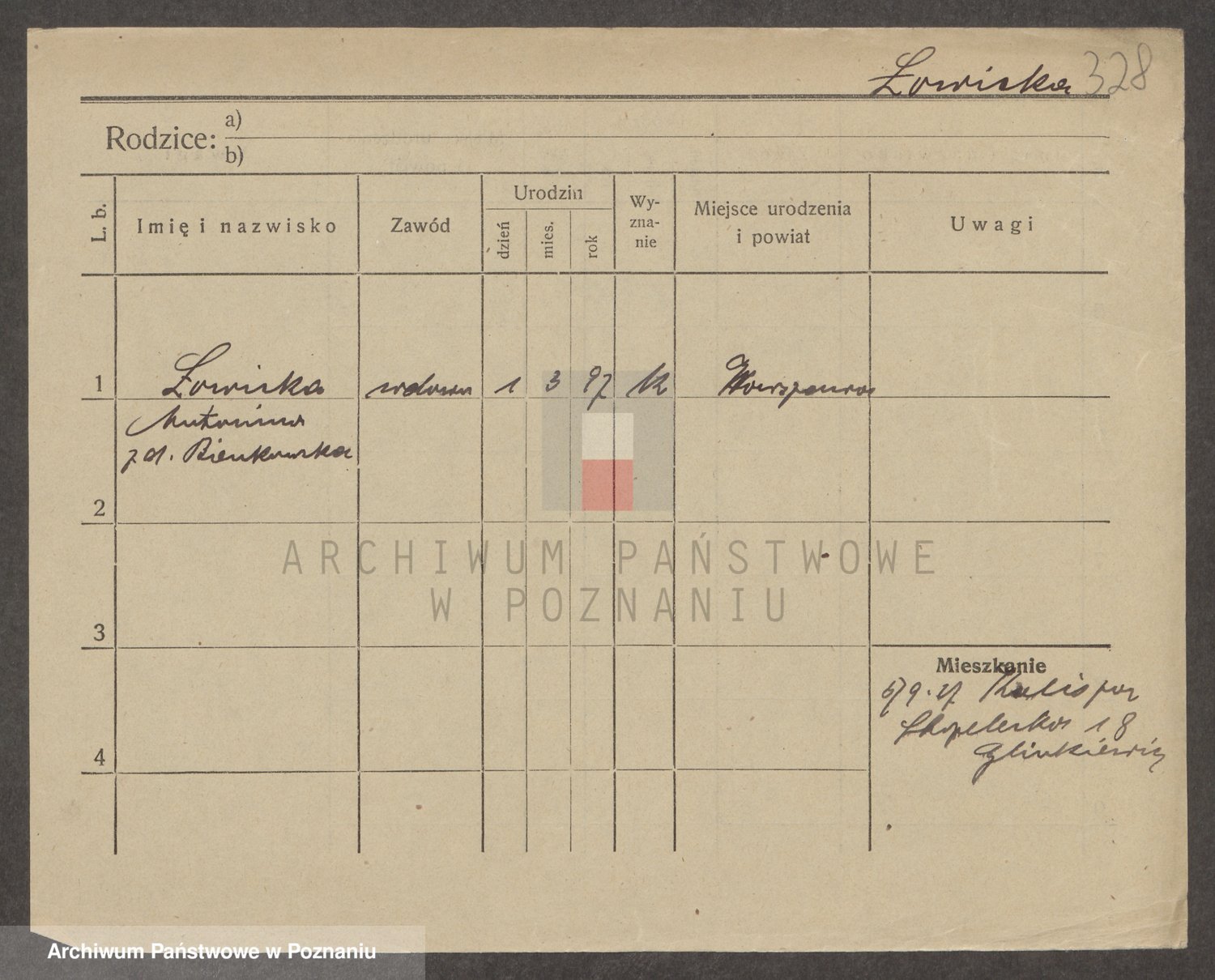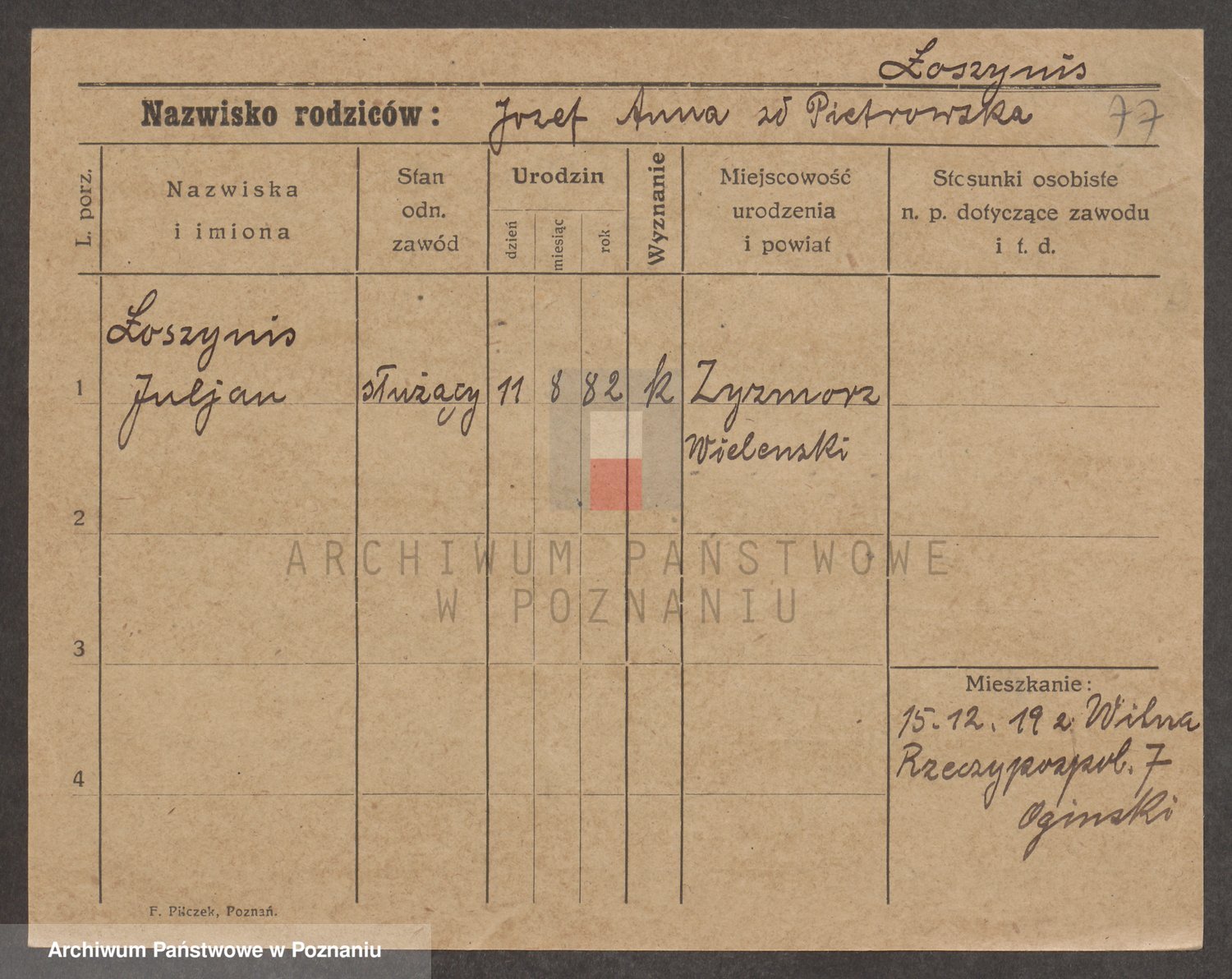 Podgląd karty osobowej dostępny jest po kliknięciu na nazwisko lub ikonkę karty. Można dokonywać powiększenia (ikony na górze) lub przechodzić między kolejnymi skanami (strzałki po bokach).
