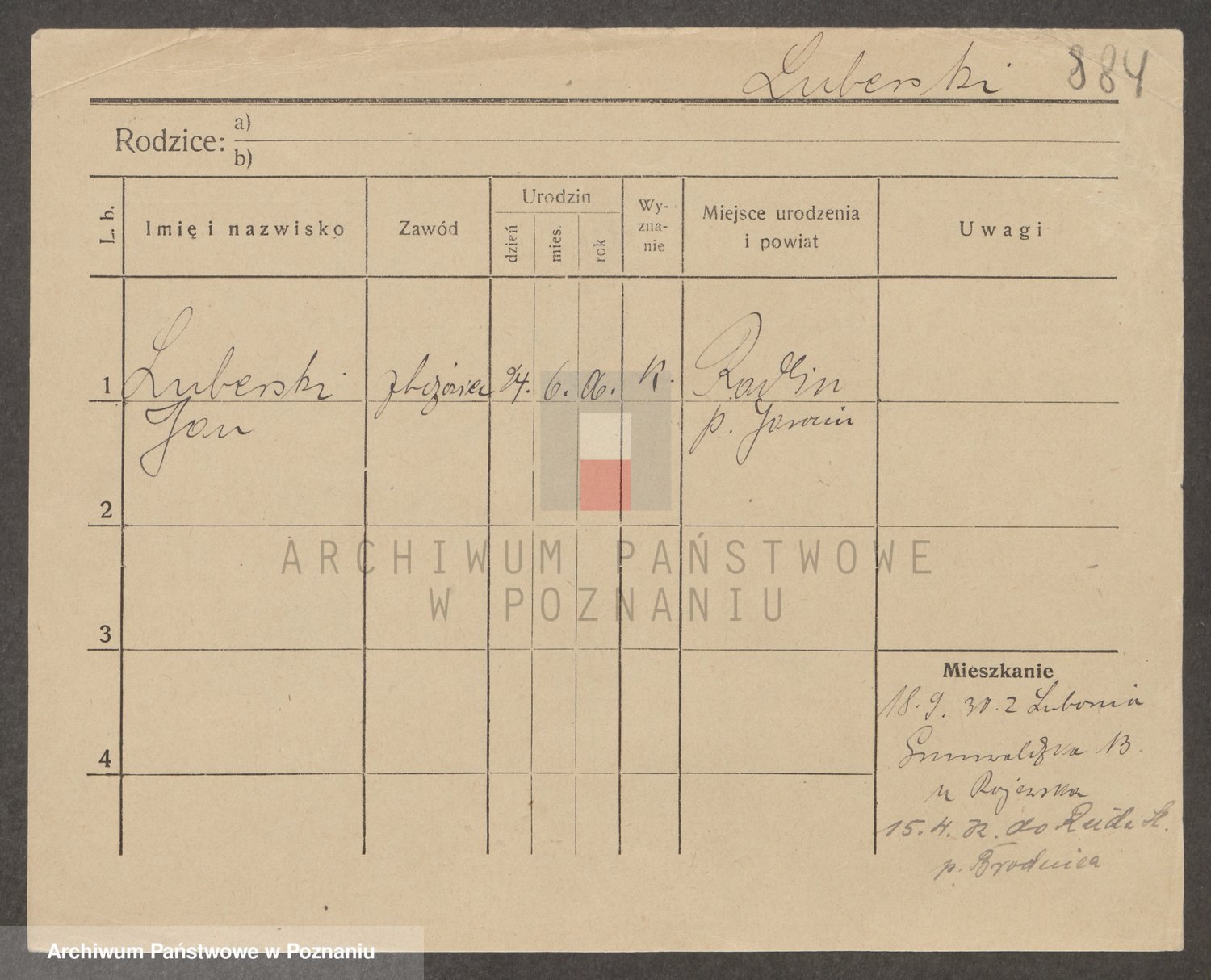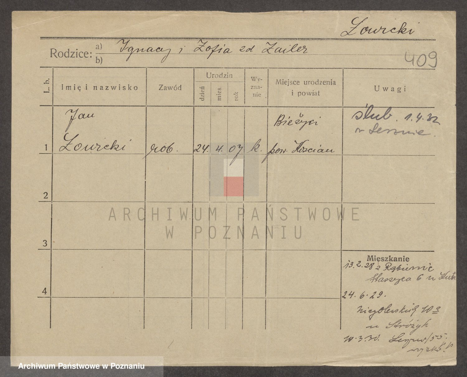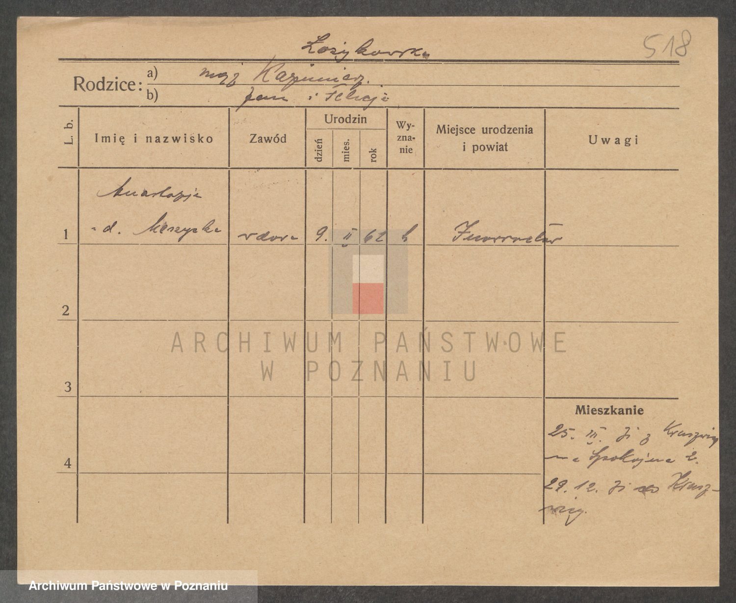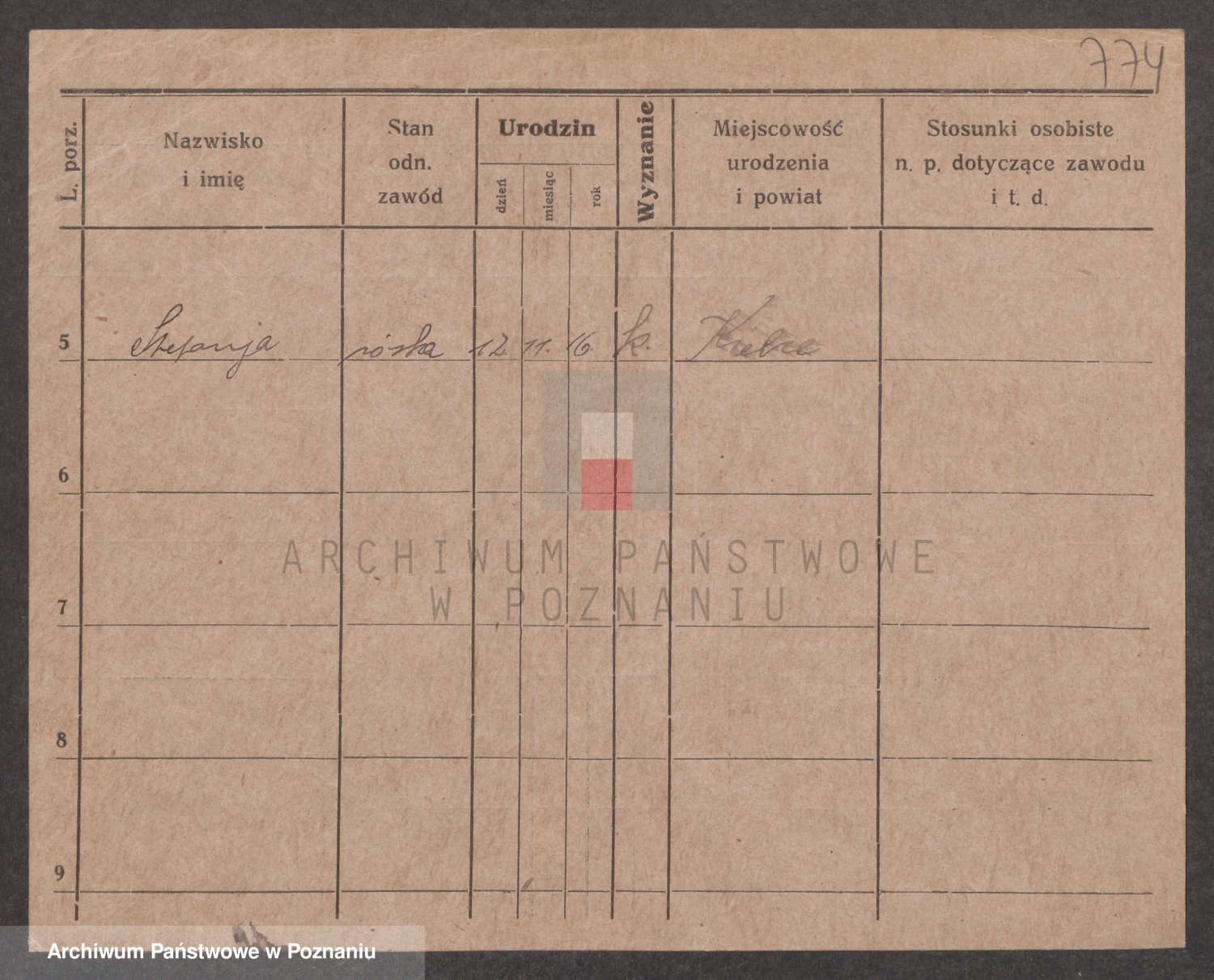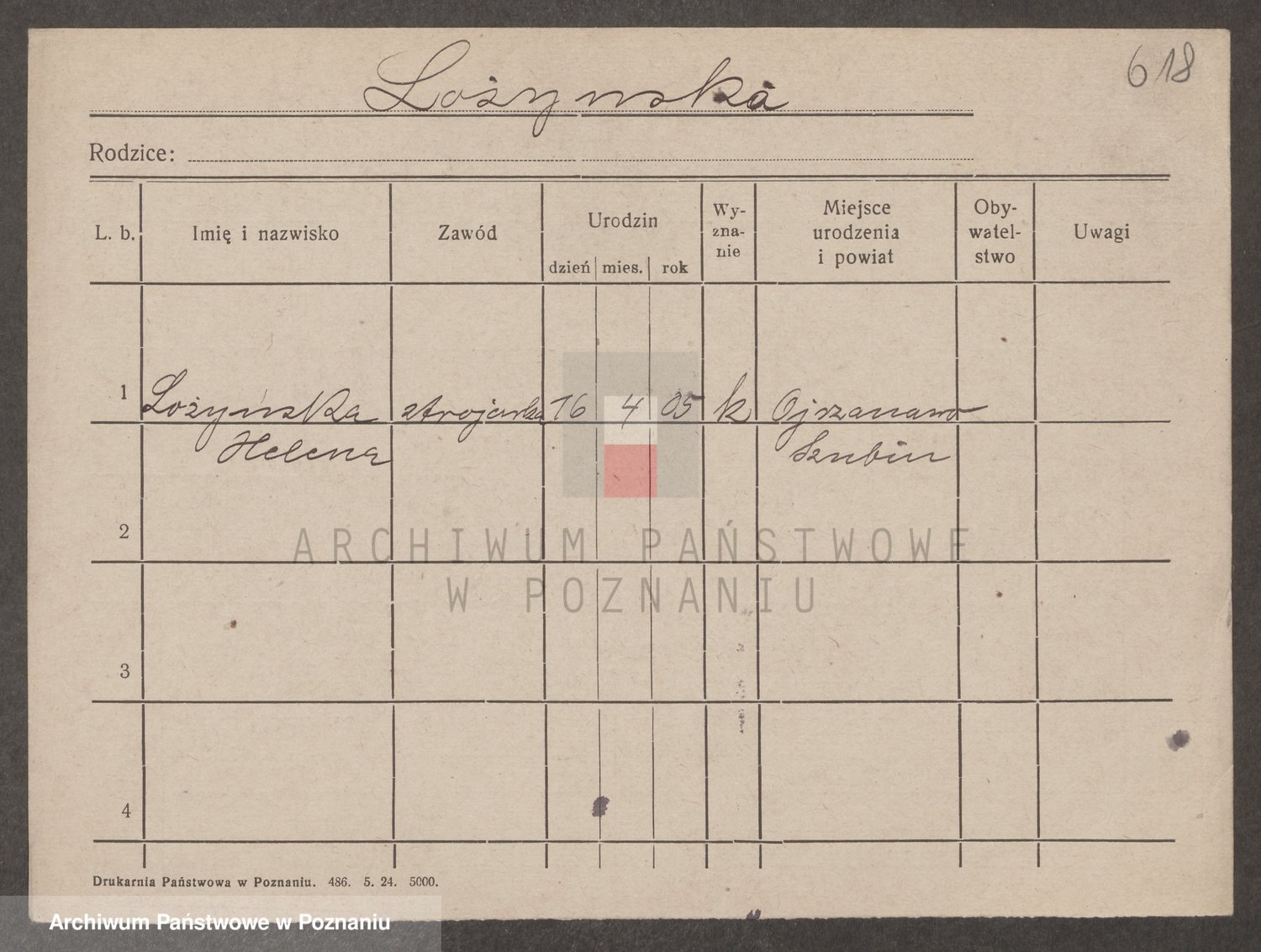 Podgląd karty osobowej dostępny jest po kliknięciu na nazwisko lub ikonkę karty. Można dokonywać powiększenia (ikony na górze) lub przechodzić między kolejnymi skanami (strzałki po bokach).