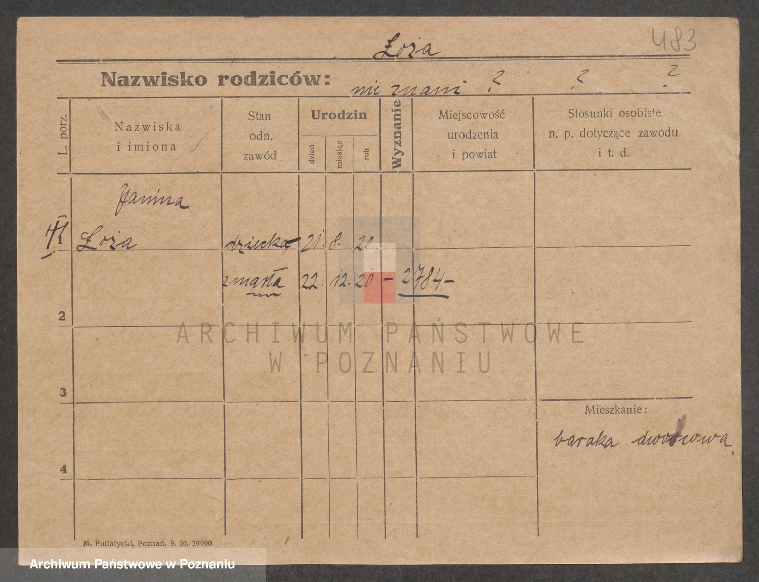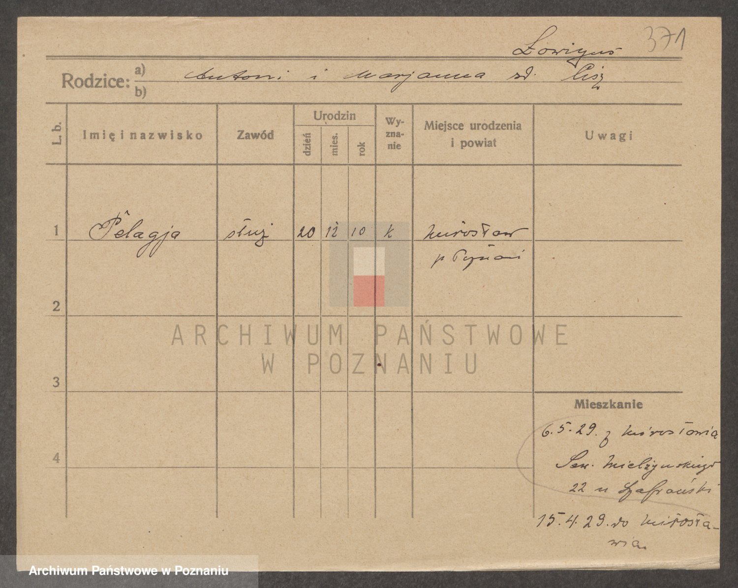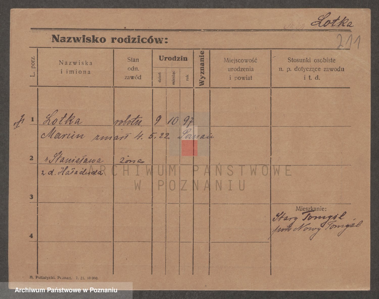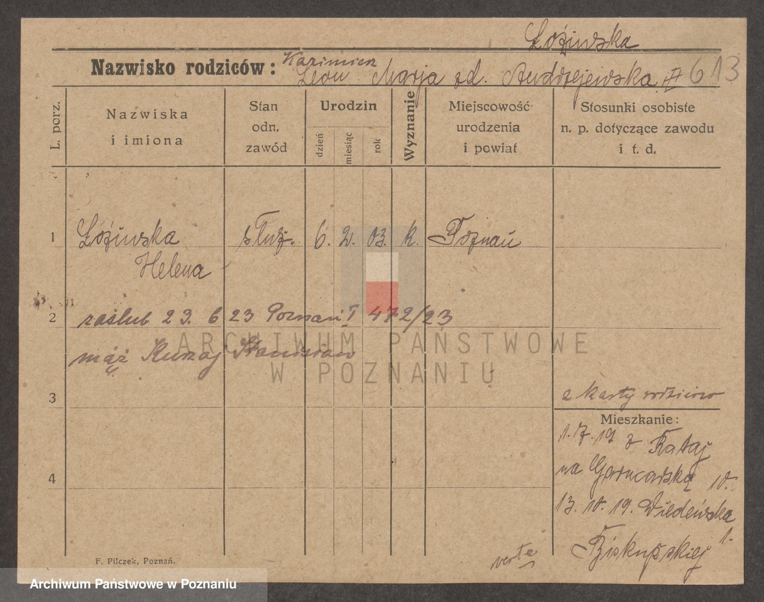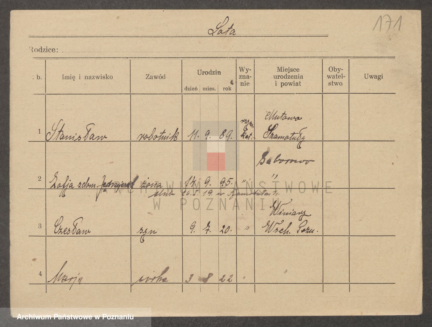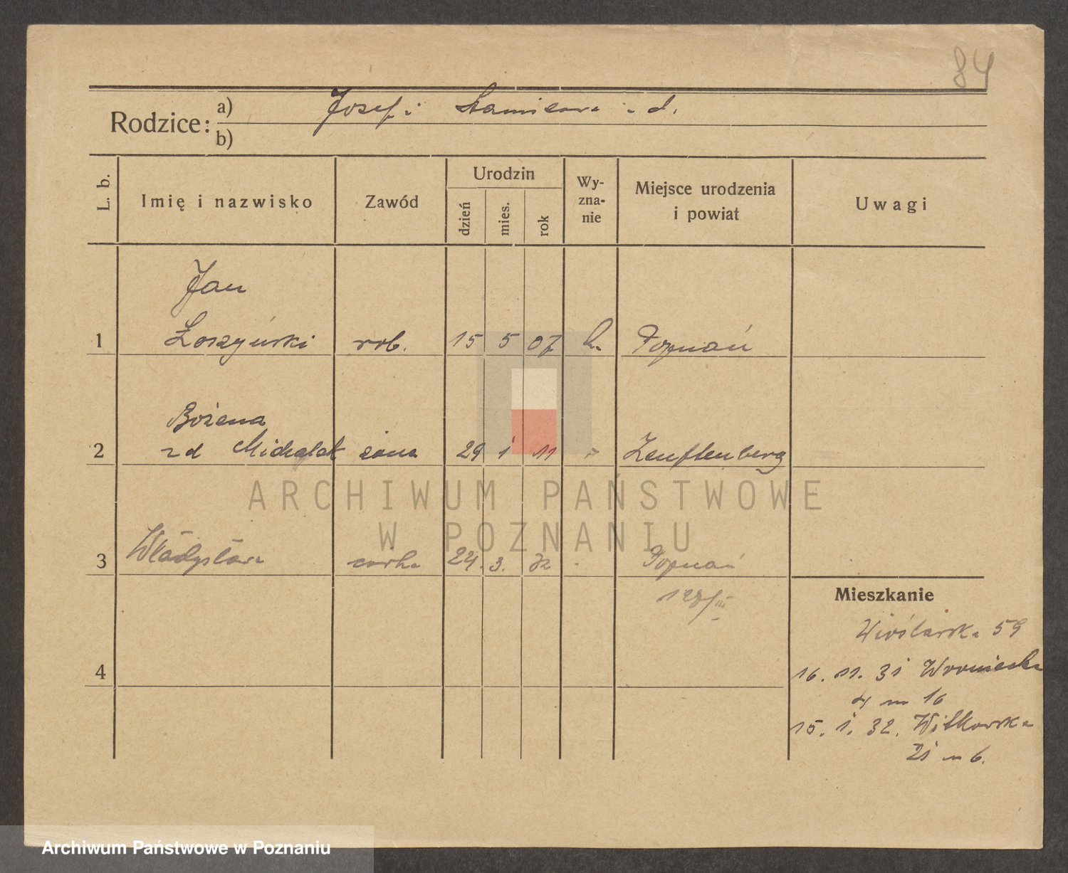 Podgląd karty osobowej dostępny jest po kliknięciu na nazwisko lub ikonkę karty. Można dokonywać powiększenia (ikony na górze) lub przechodzić między kolejnymi skanami (strzałki po bokach).
