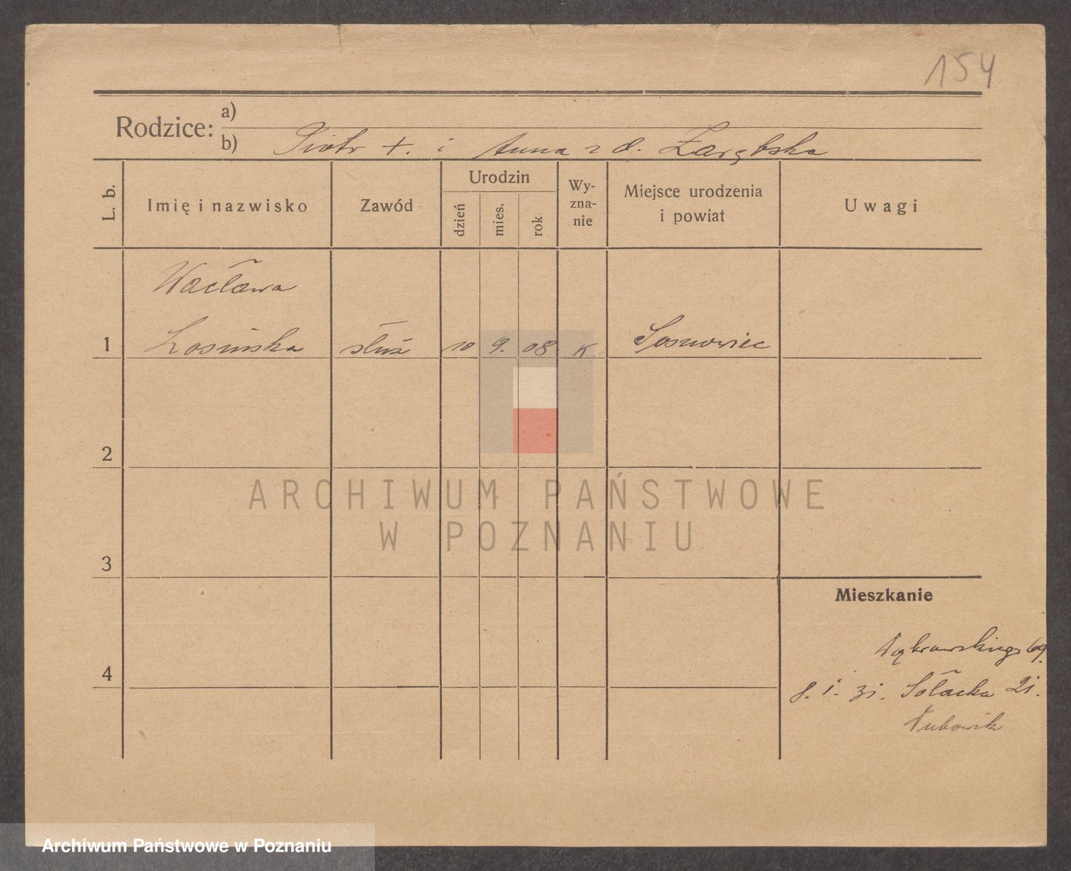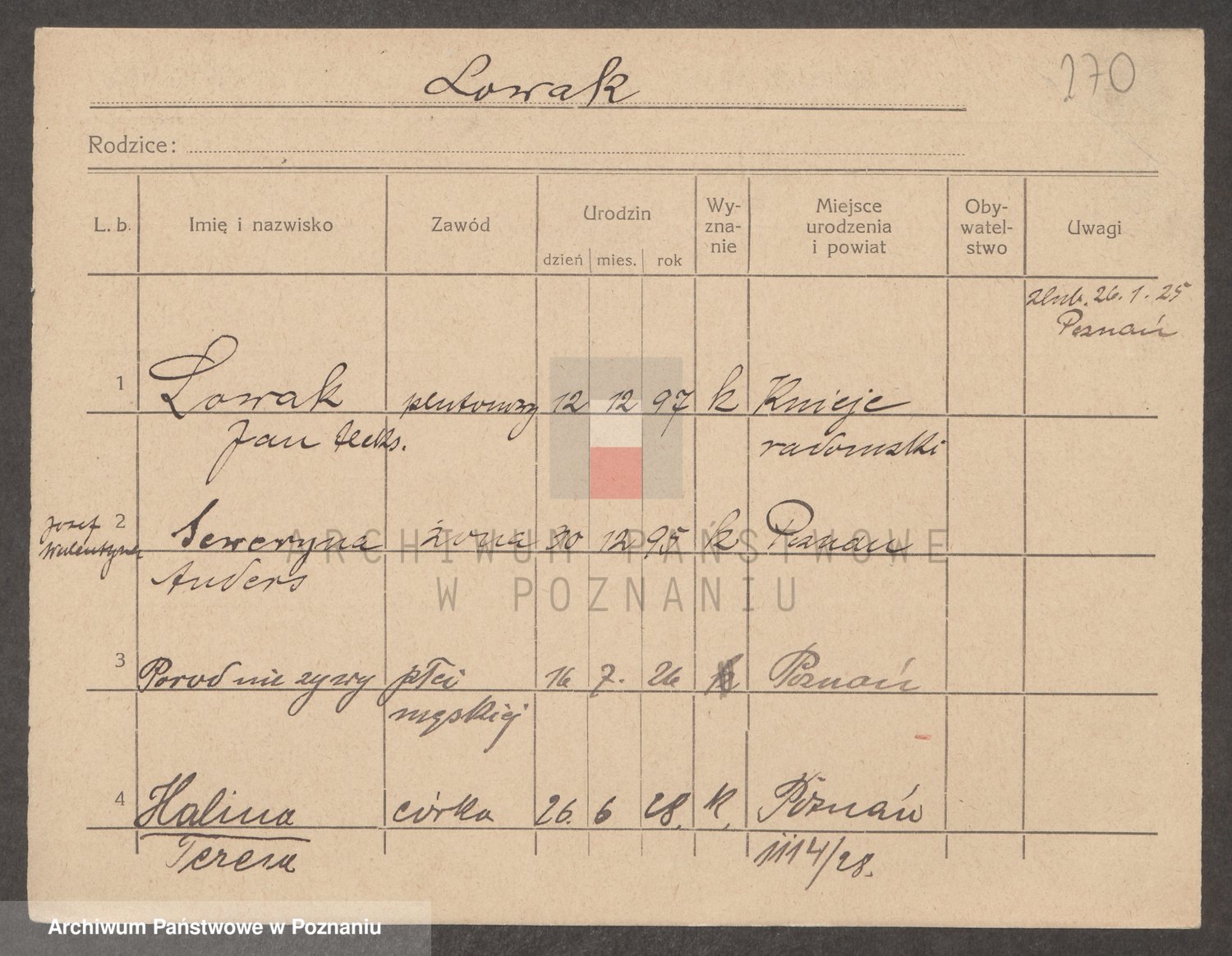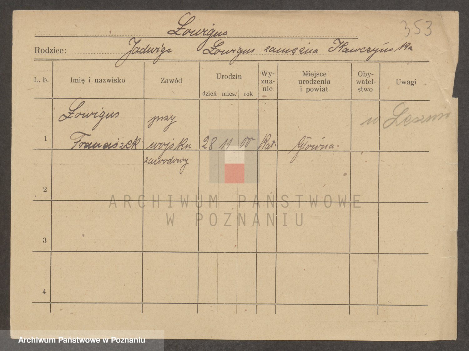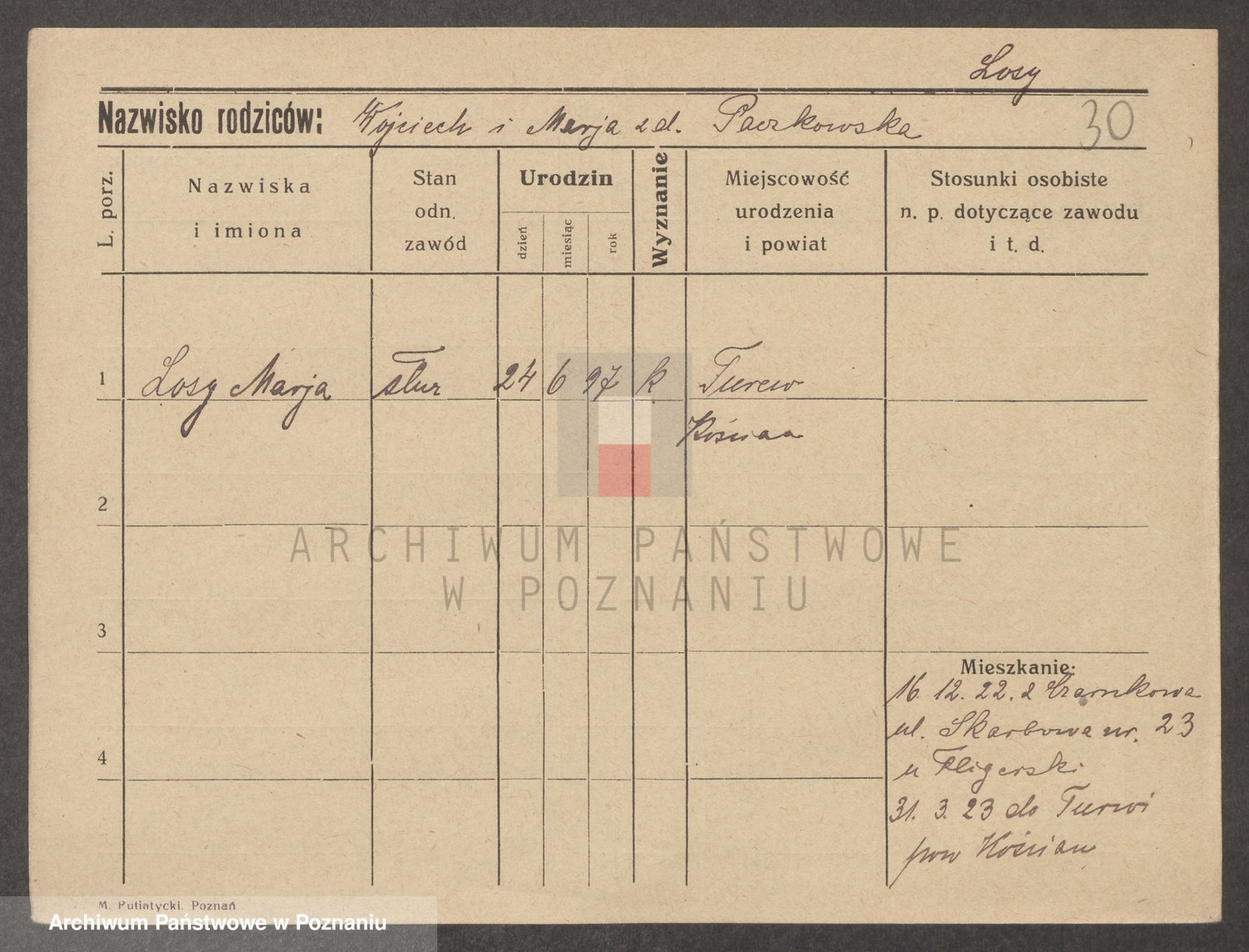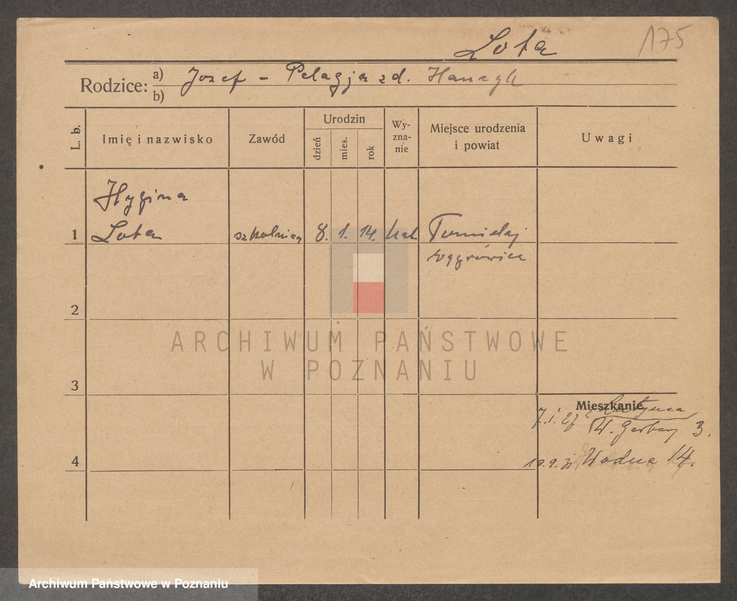 Podgląd karty osobowej dostępny jest po kliknięciu na nazwisko lub ikonkę karty. Można dokonywać powiększenia (ikony na górze) lub przechodzić między kolejnymi skanami (strzałki po bokach).