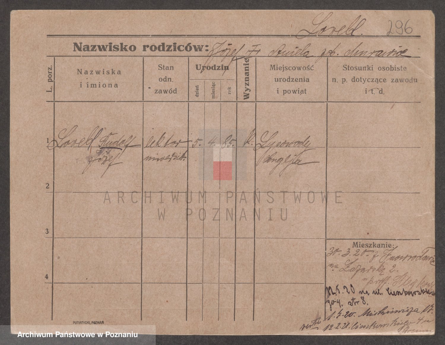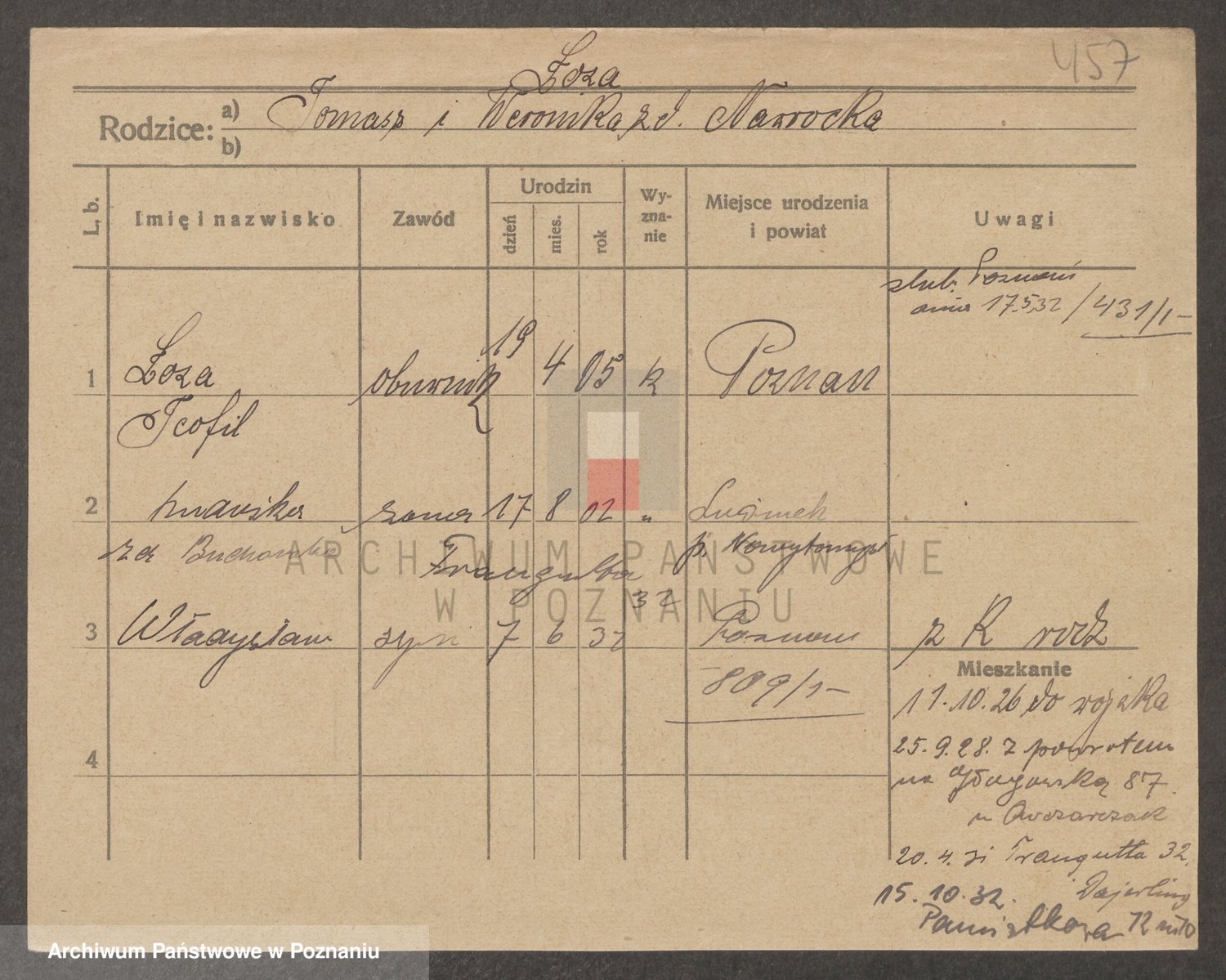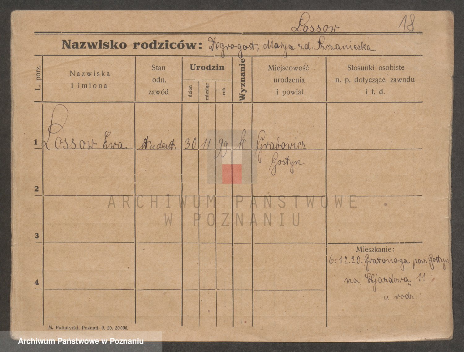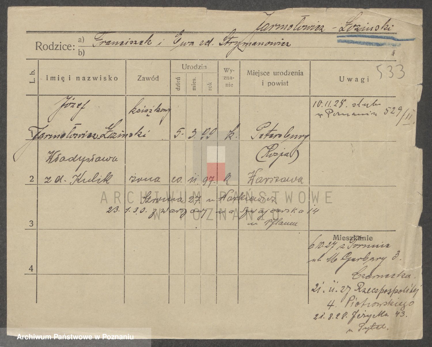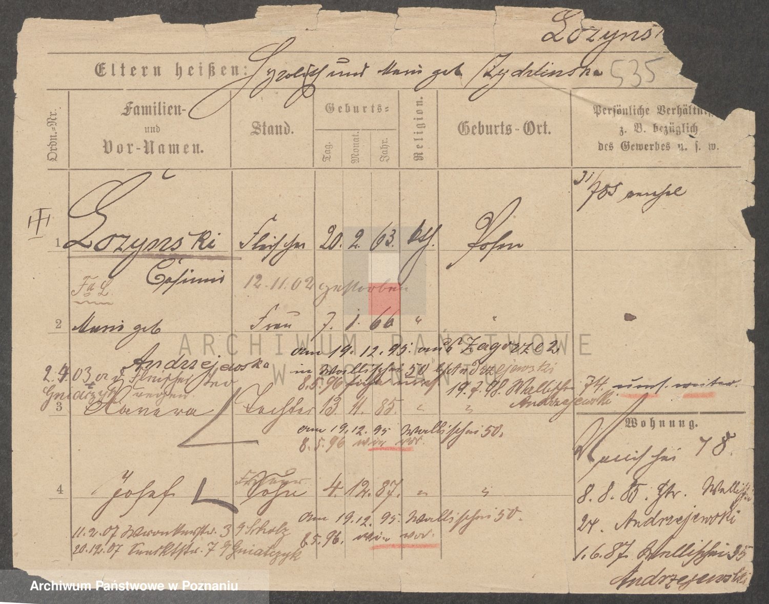 Podgląd karty osobowej dostępny jest po kliknięciu na nazwisko lub ikonkę karty. Można dokonywać powiększenia (ikony na górze) lub przechodzić między kolejnymi skanami (strzałki po bokach).