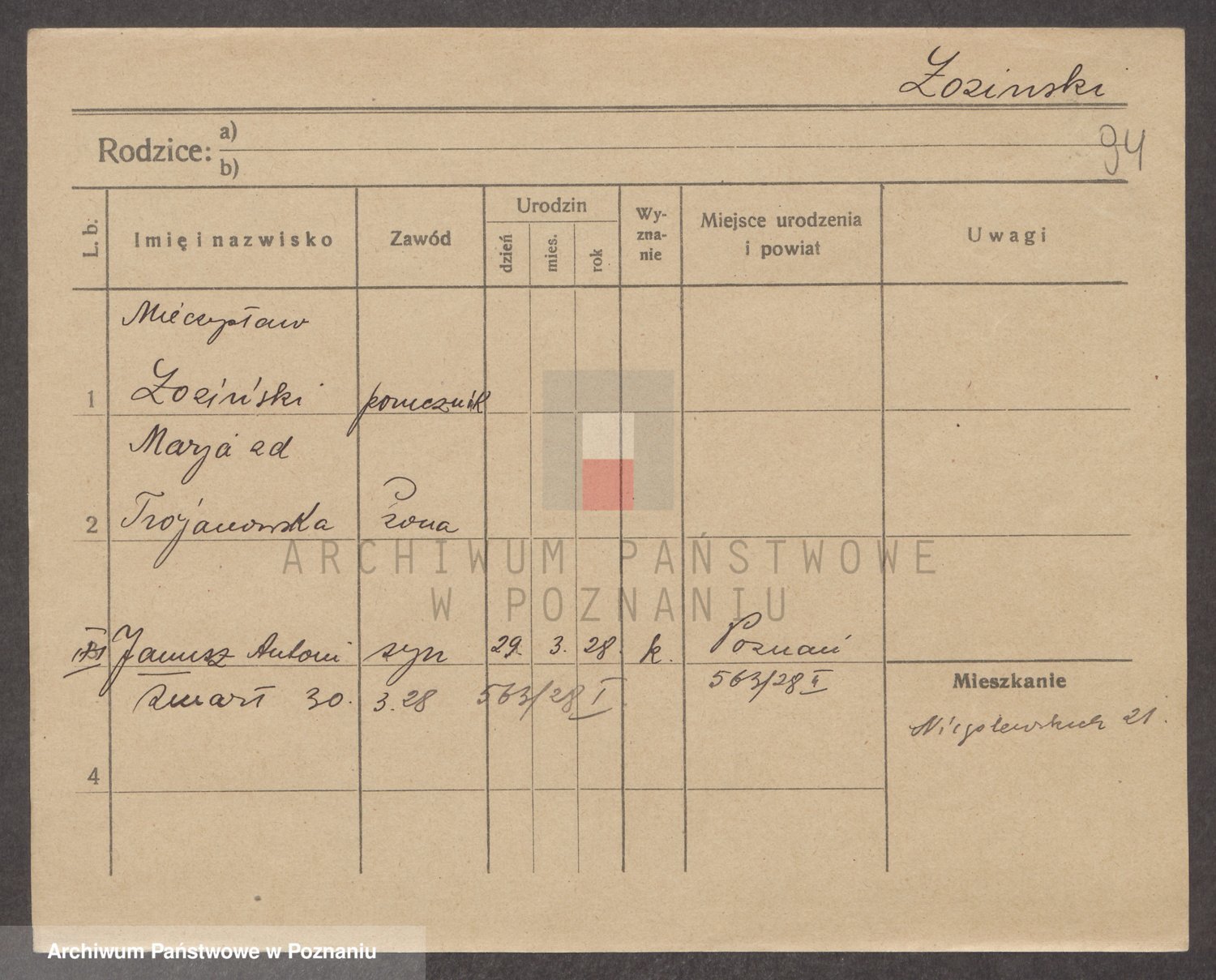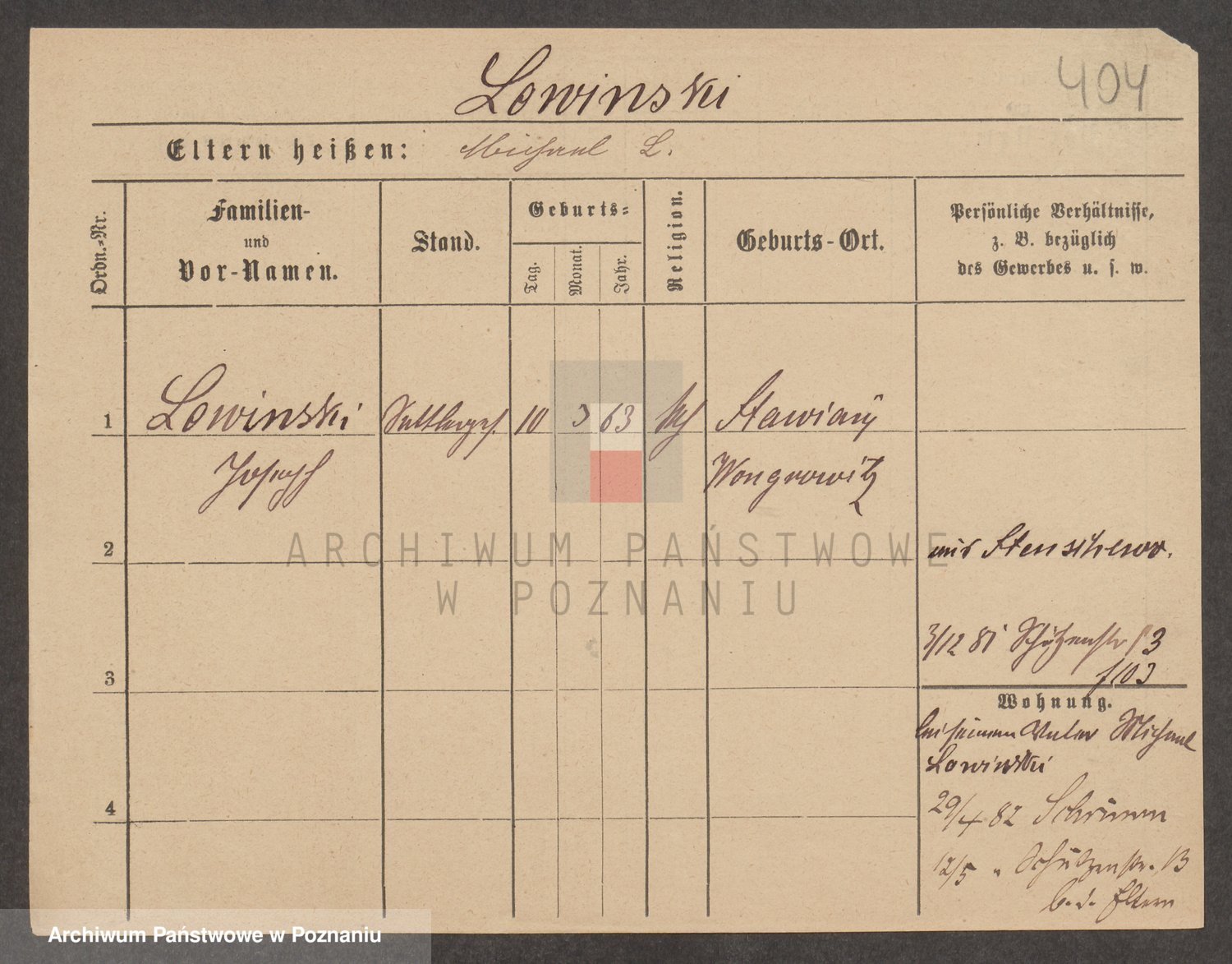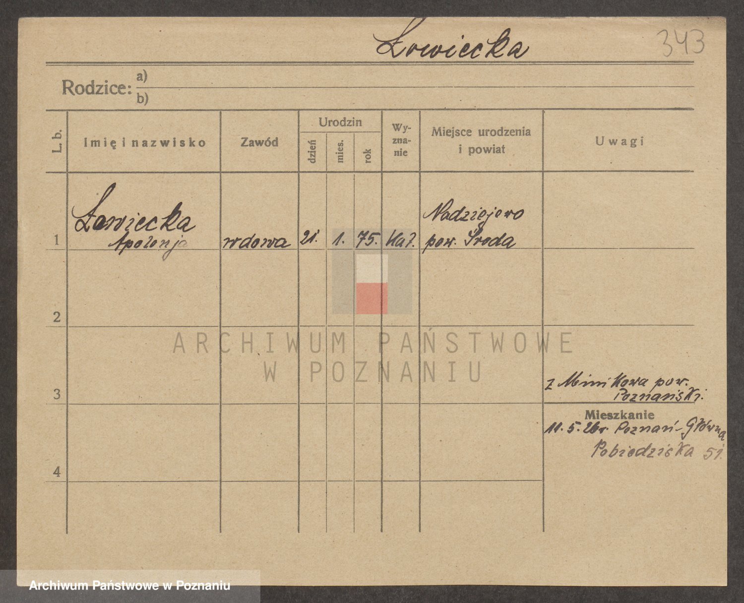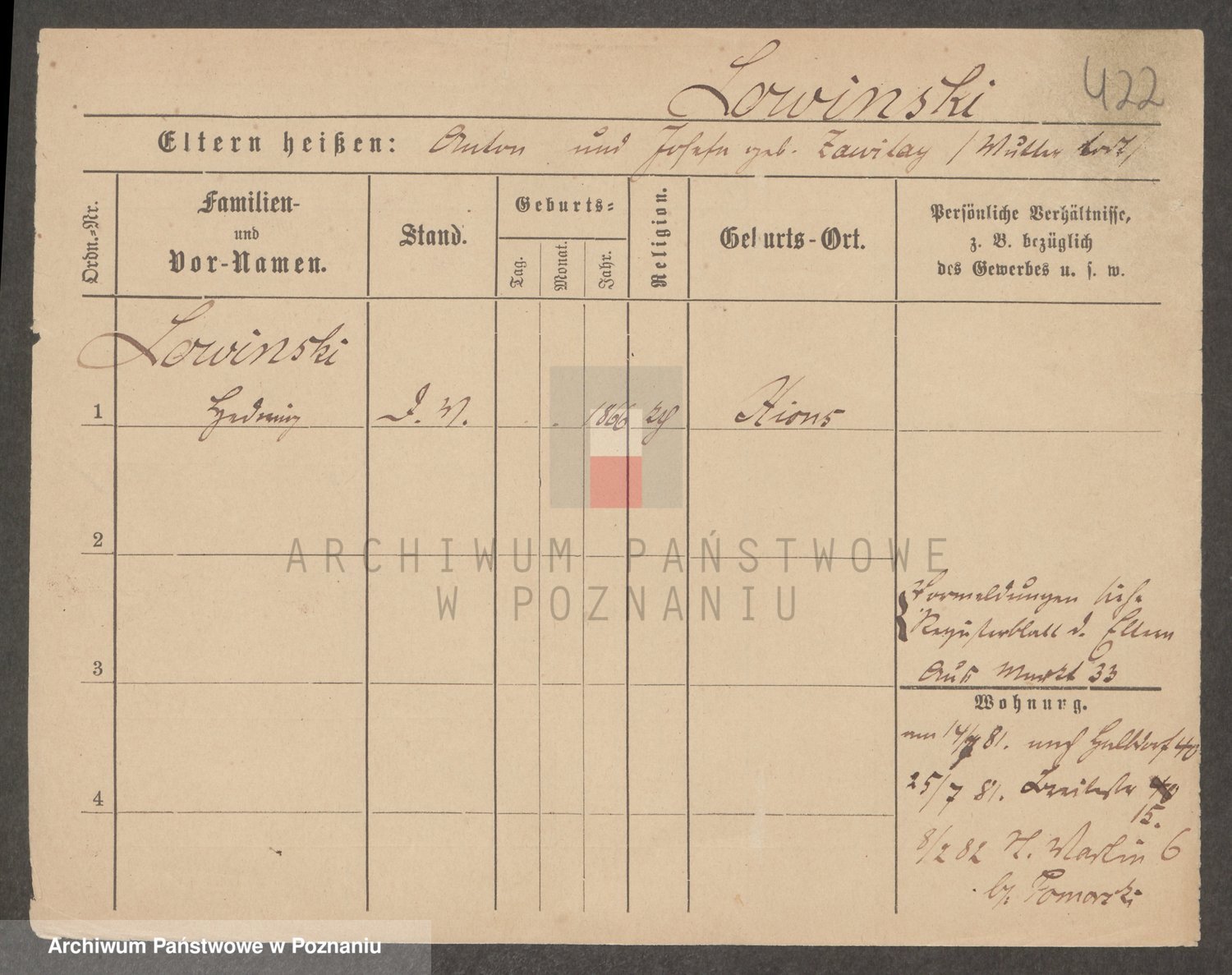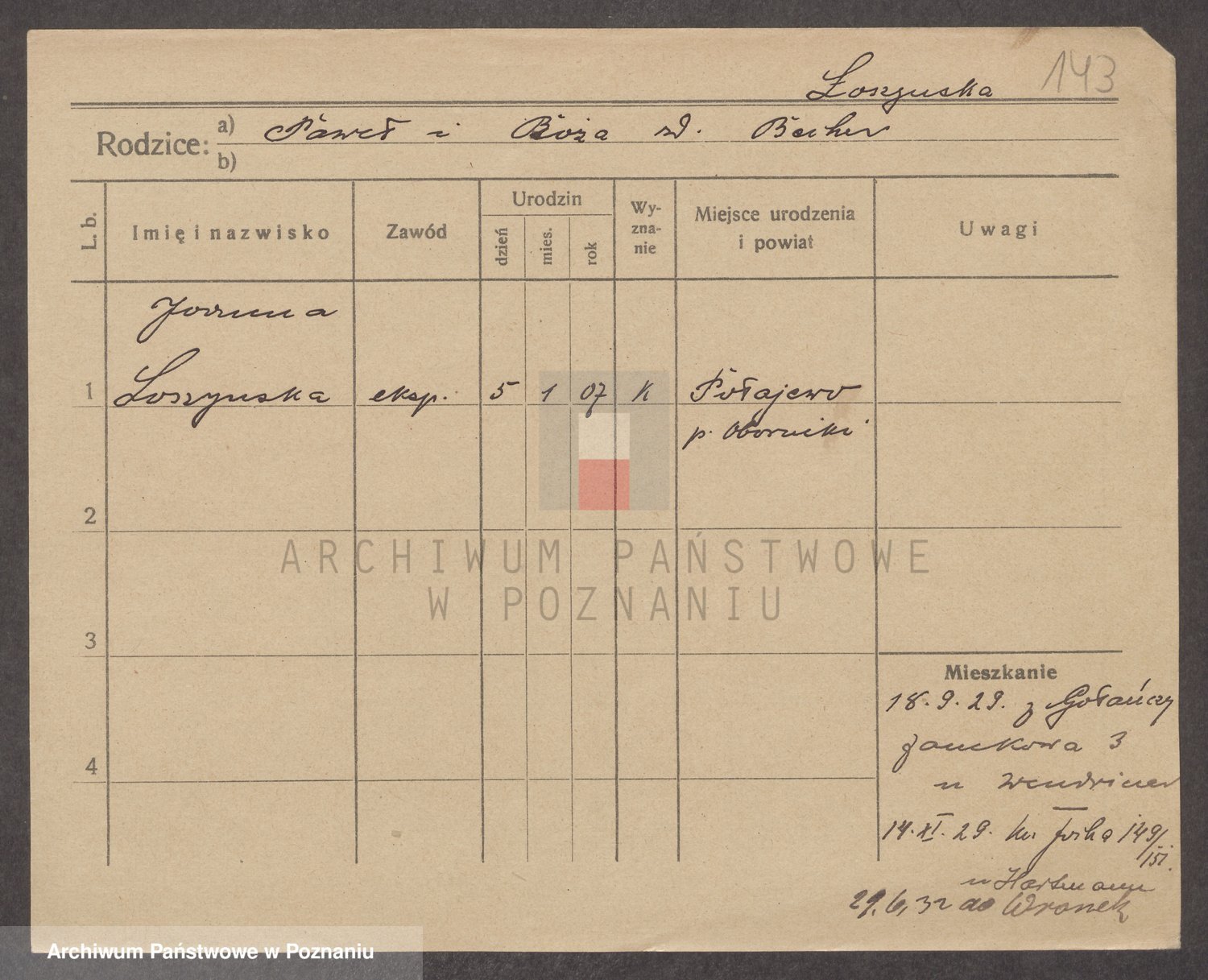 Podgląd karty osobowej dostępny jest po kliknięciu na nazwisko lub ikonkę karty. Można dokonywać powiększenia (ikony na górze) lub przechodzić między kolejnymi skanami (strzałki po bokach).