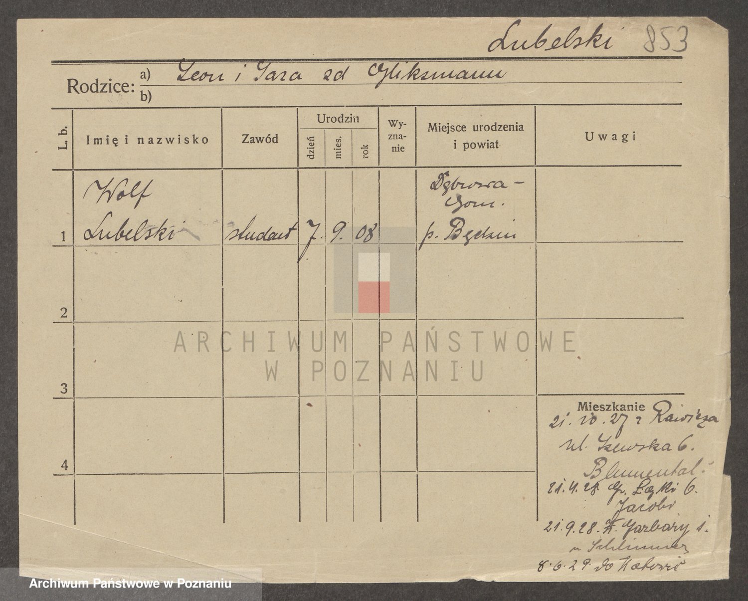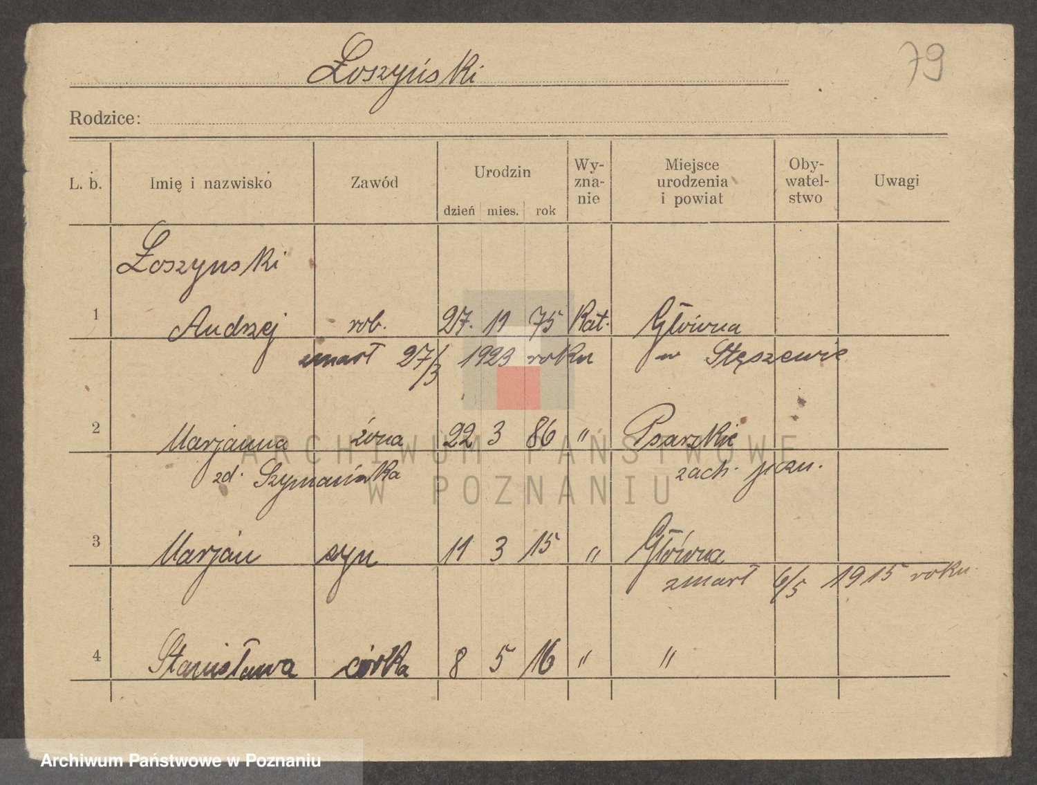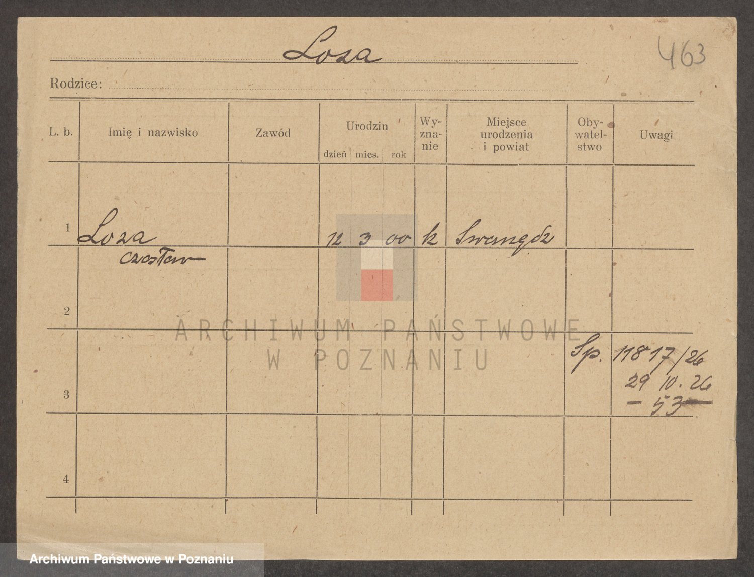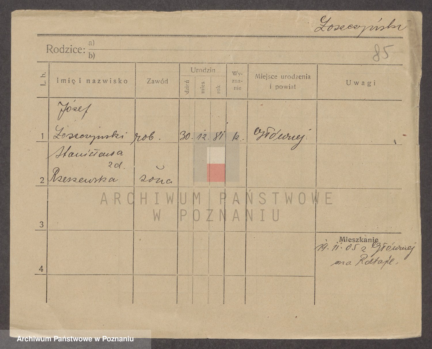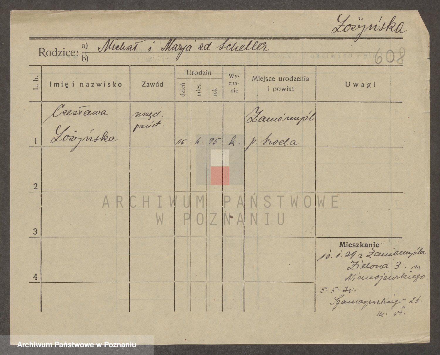 Podgląd karty osobowej dostępny jest po kliknięciu na nazwisko lub ikonkę karty. Można dokonywać powiększenia (ikony na górze) lub przechodzić między kolejnymi skanami (strzałki po bokach).