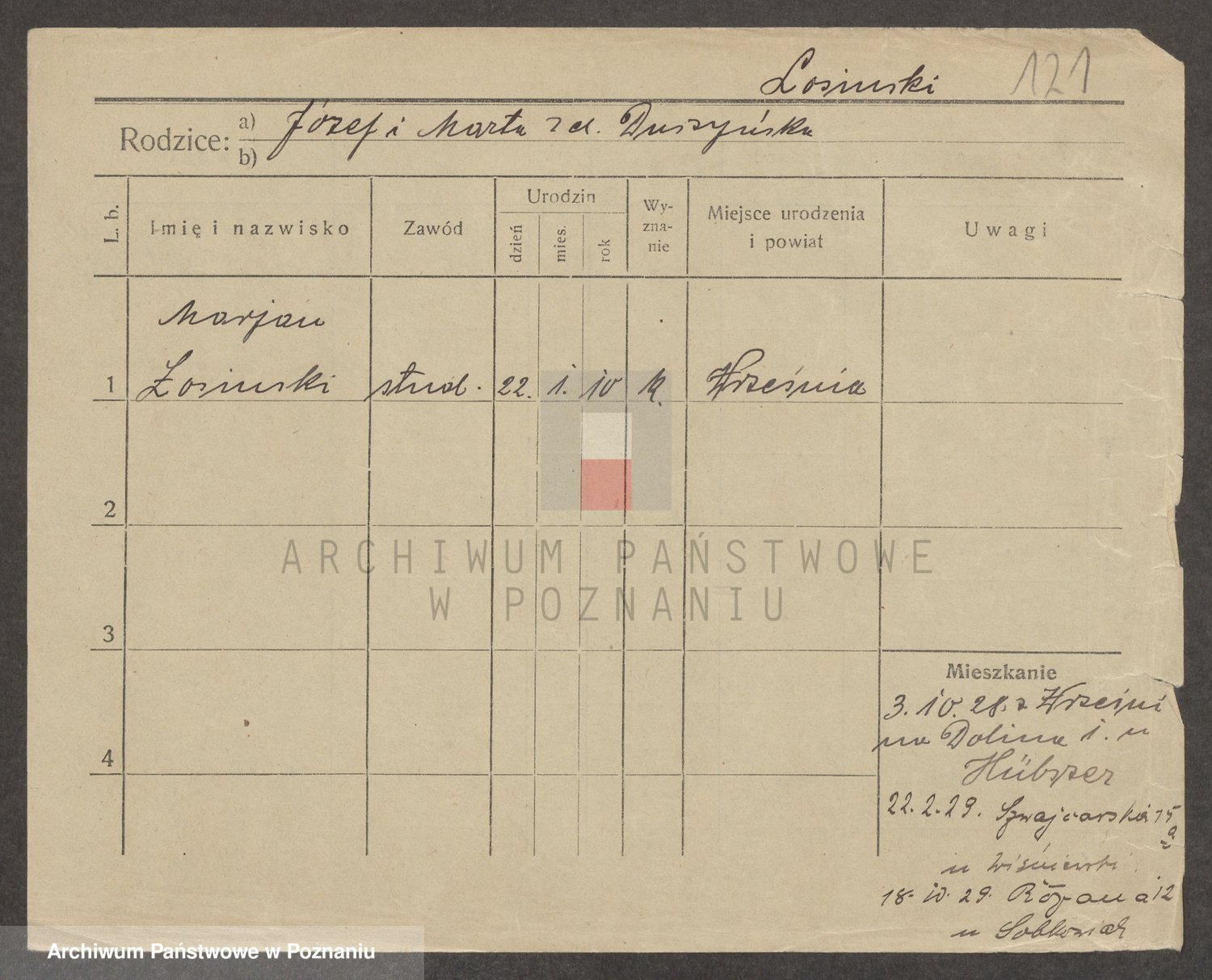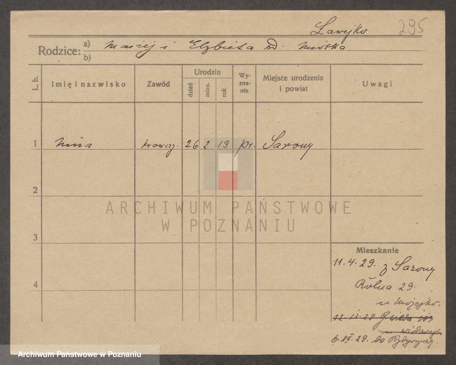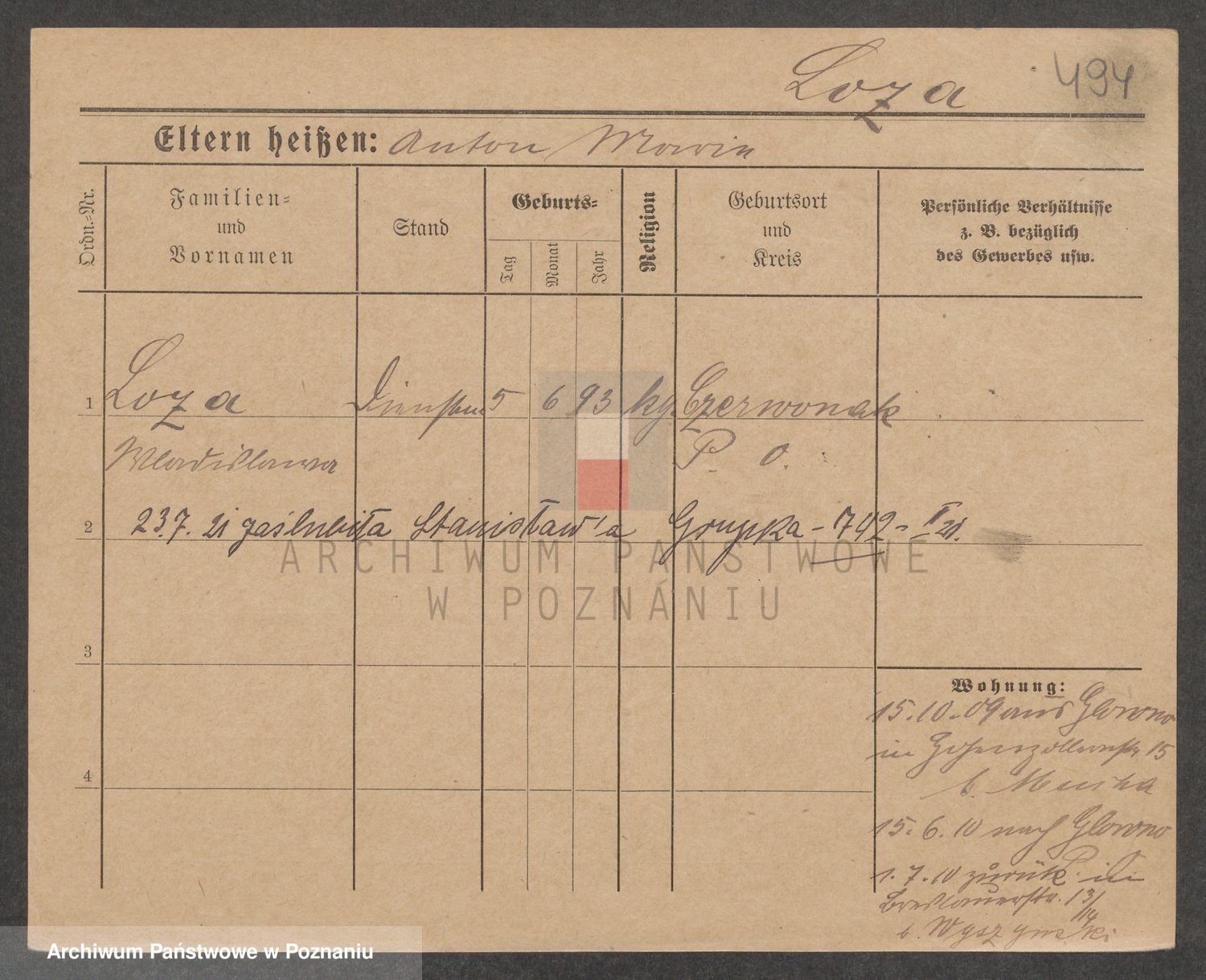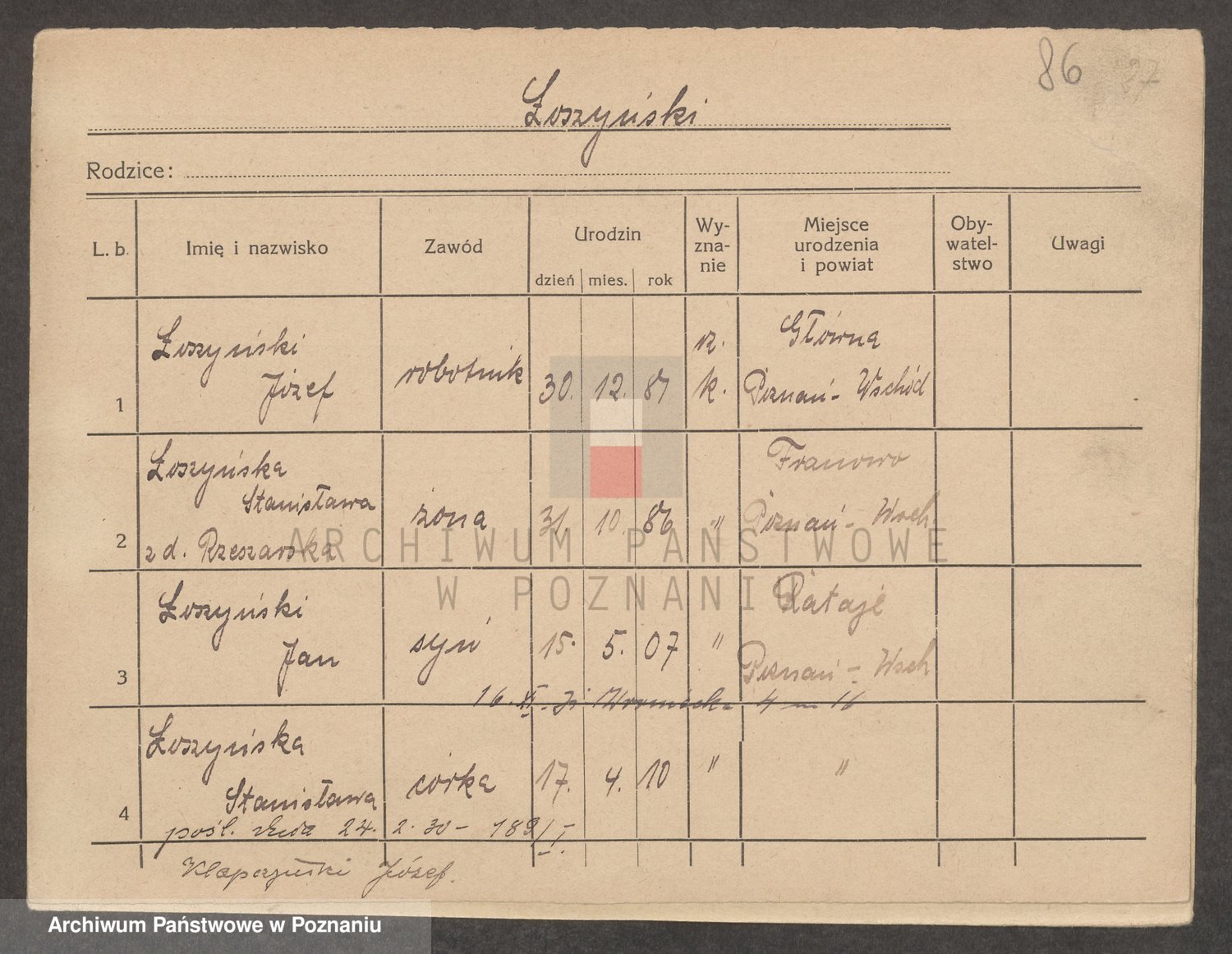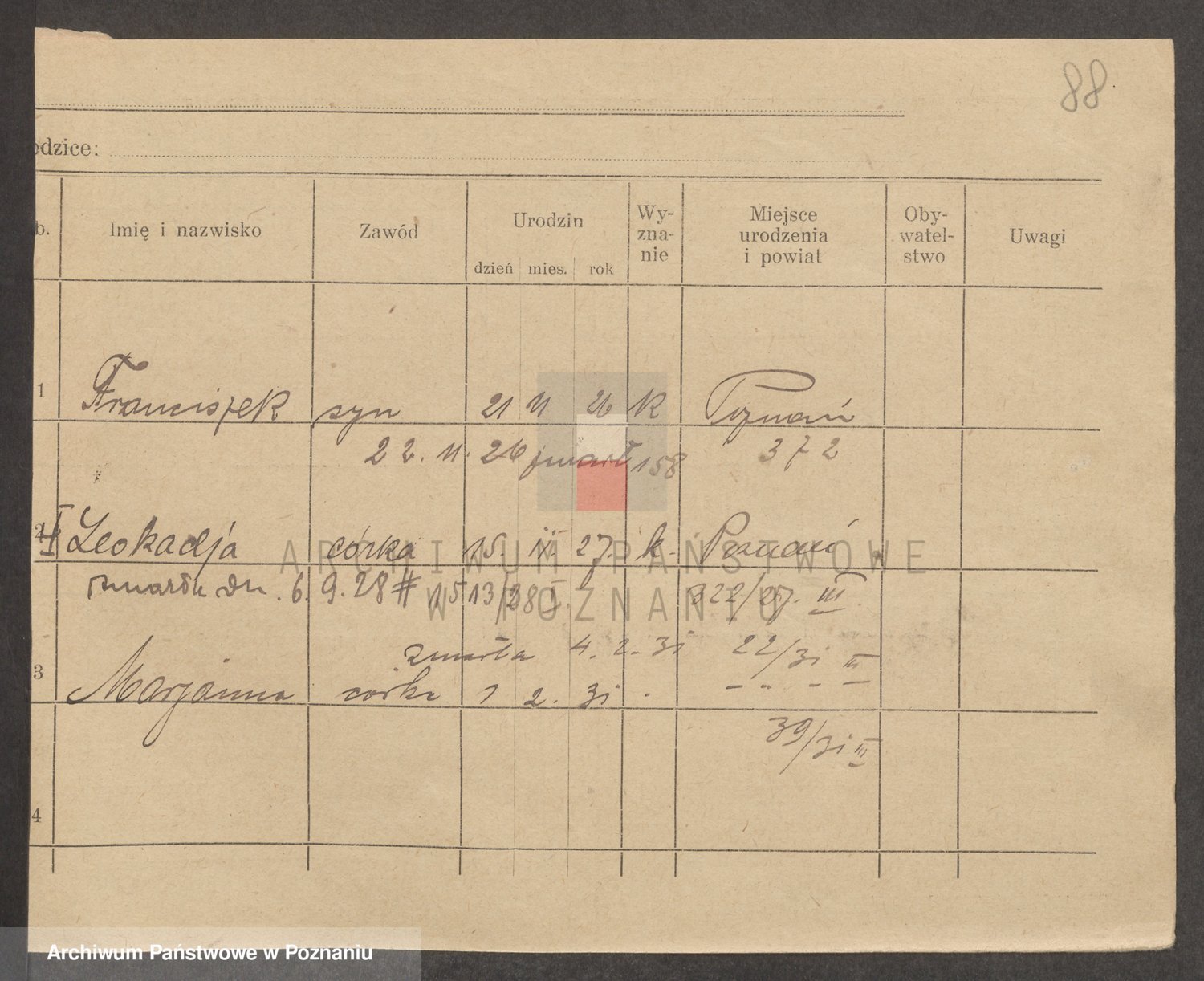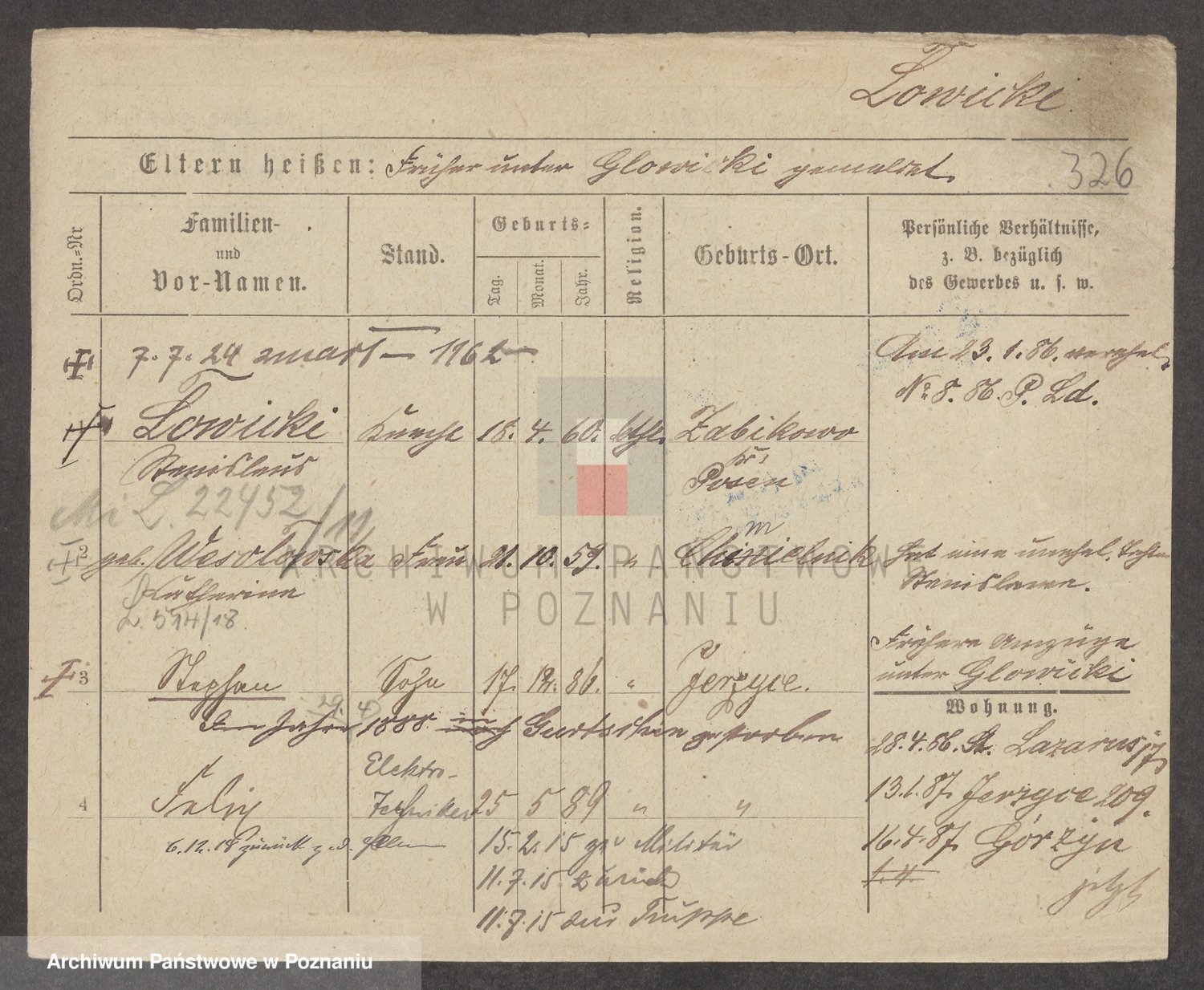 Podgląd karty osobowej dostępny jest po kliknięciu na nazwisko lub ikonkę karty. Można dokonywać powiększenia (ikony na górze) lub przechodzić między kolejnymi skanami (strzałki po bokach).