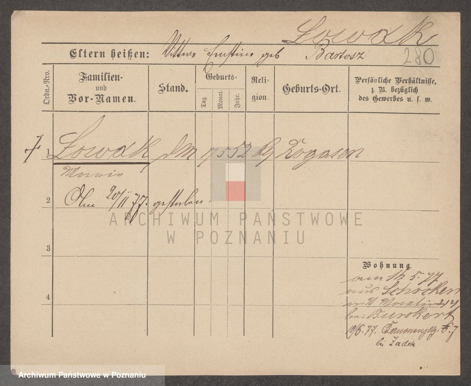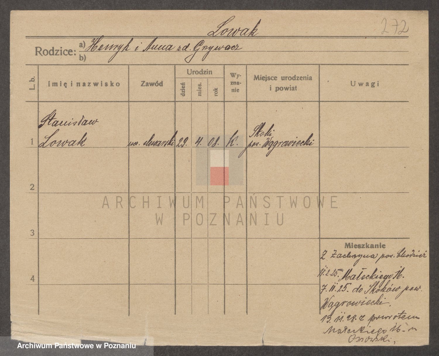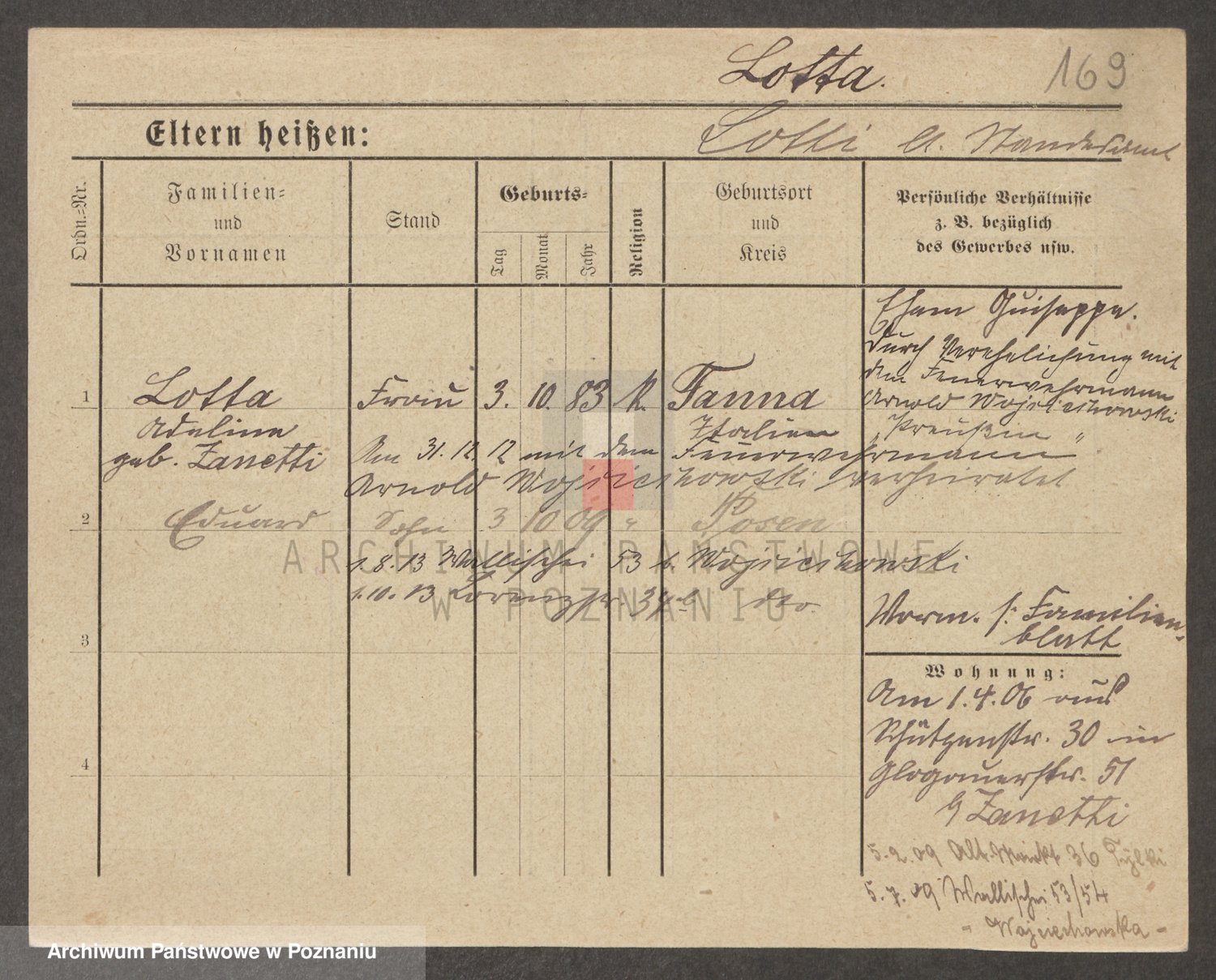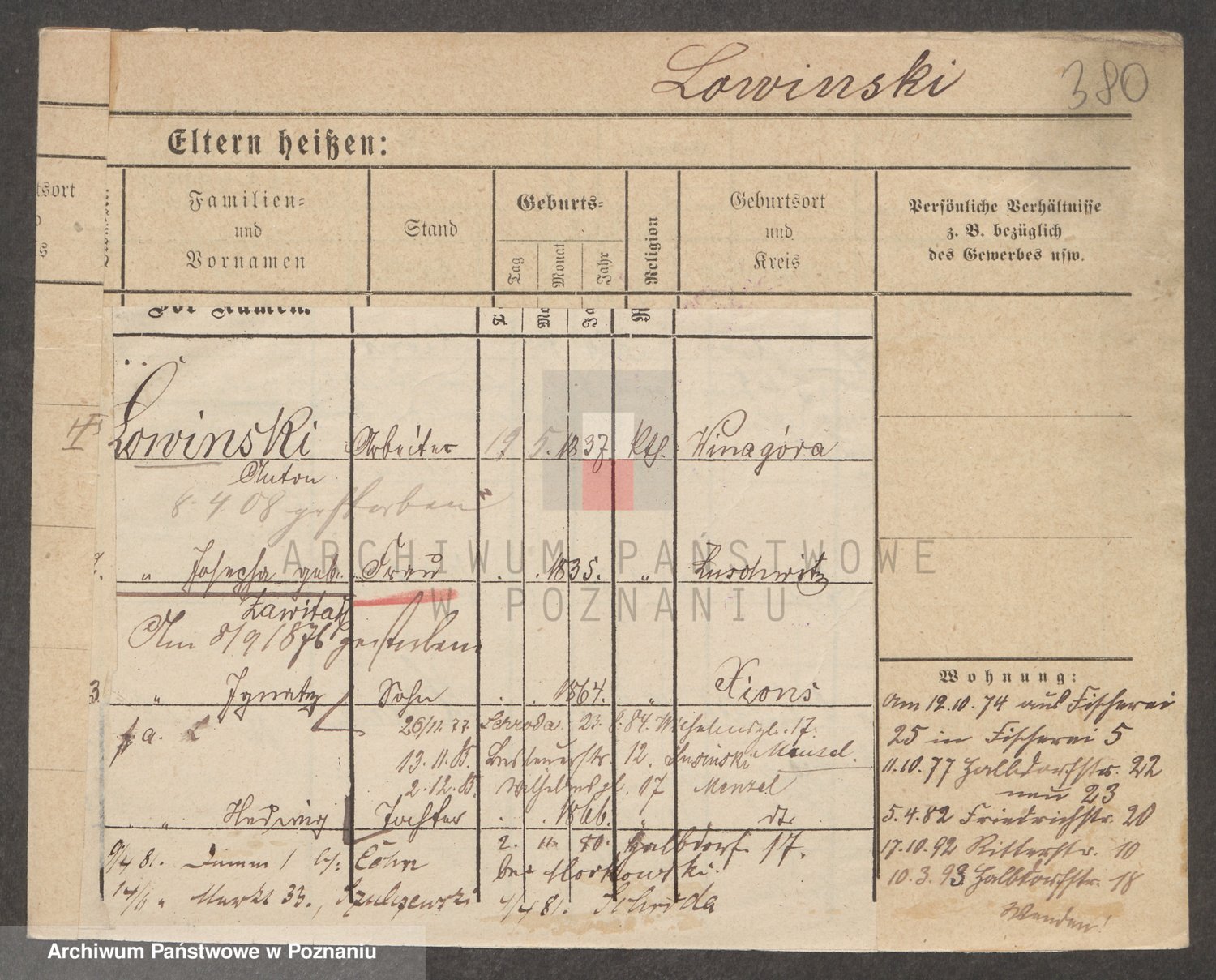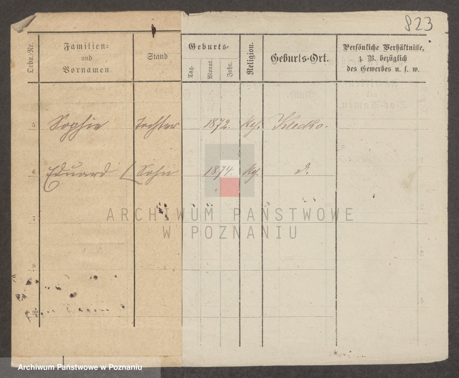 Podgląd karty osobowej dostępny jest po kliknięciu na nazwisko lub ikonkę karty. Można dokonywać powiększenia (ikony na górze) lub przechodzić między kolejnymi skanami (strzałki po bokach).