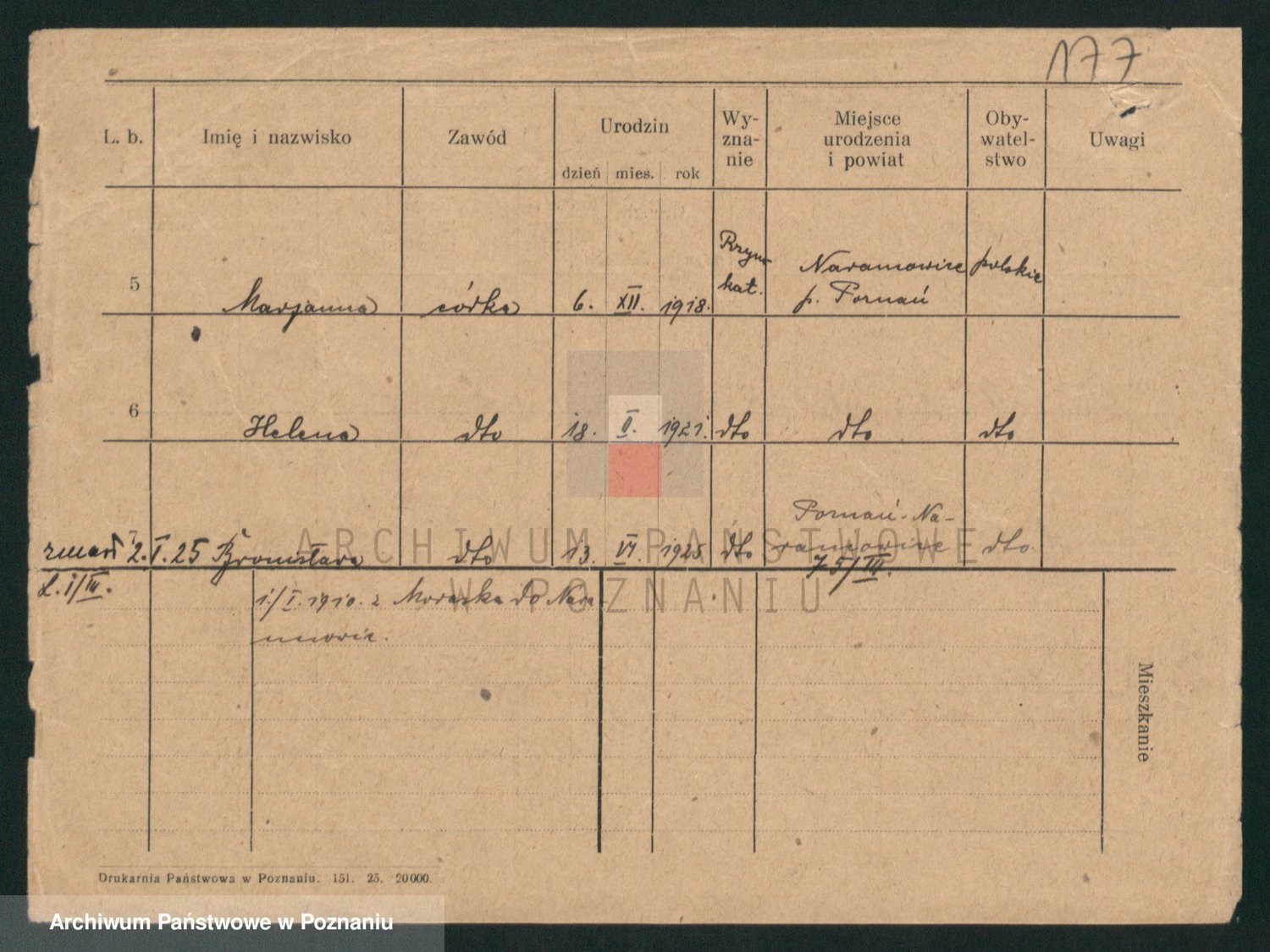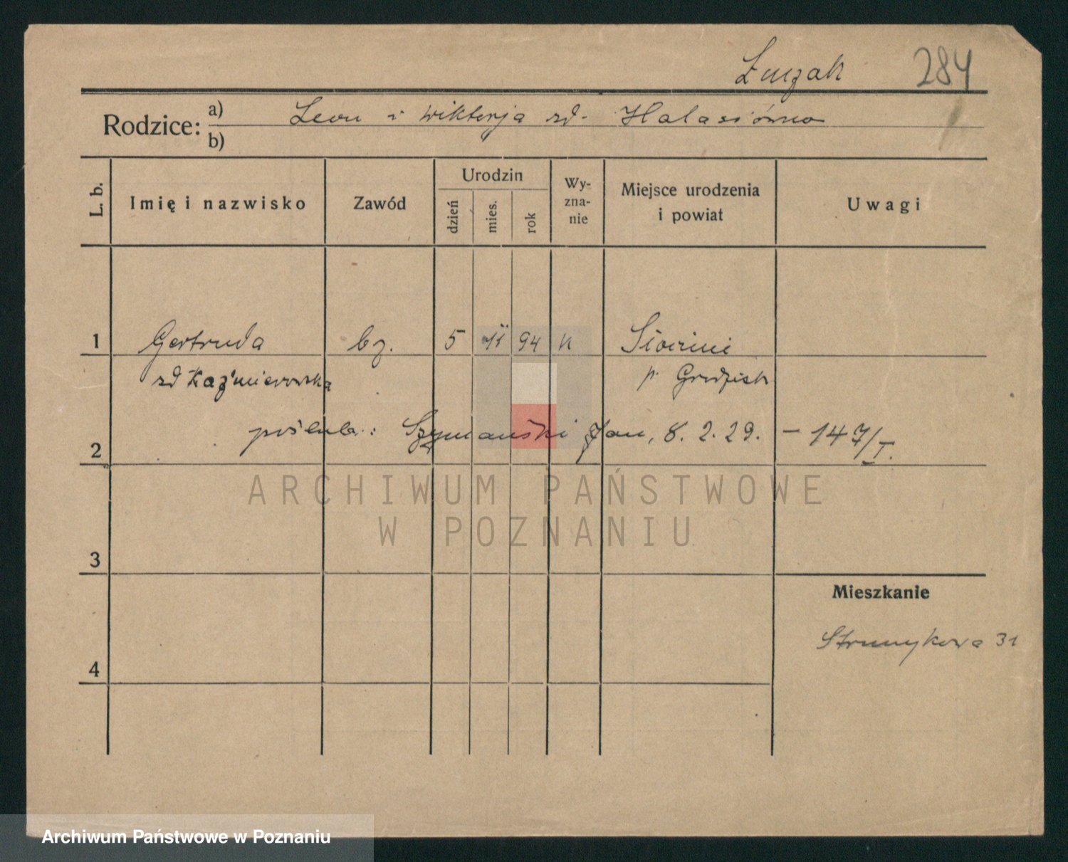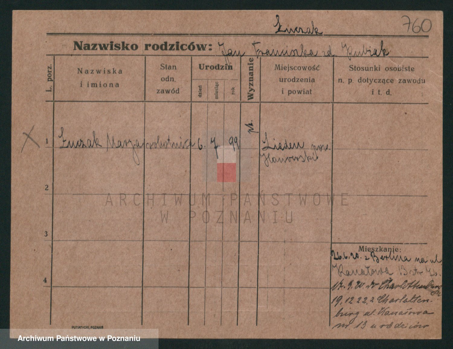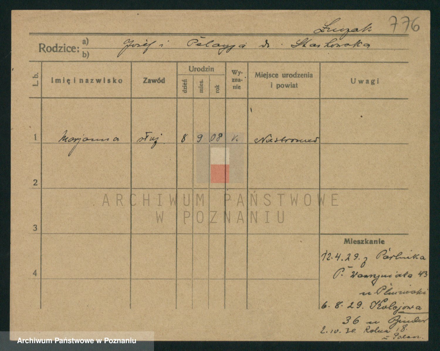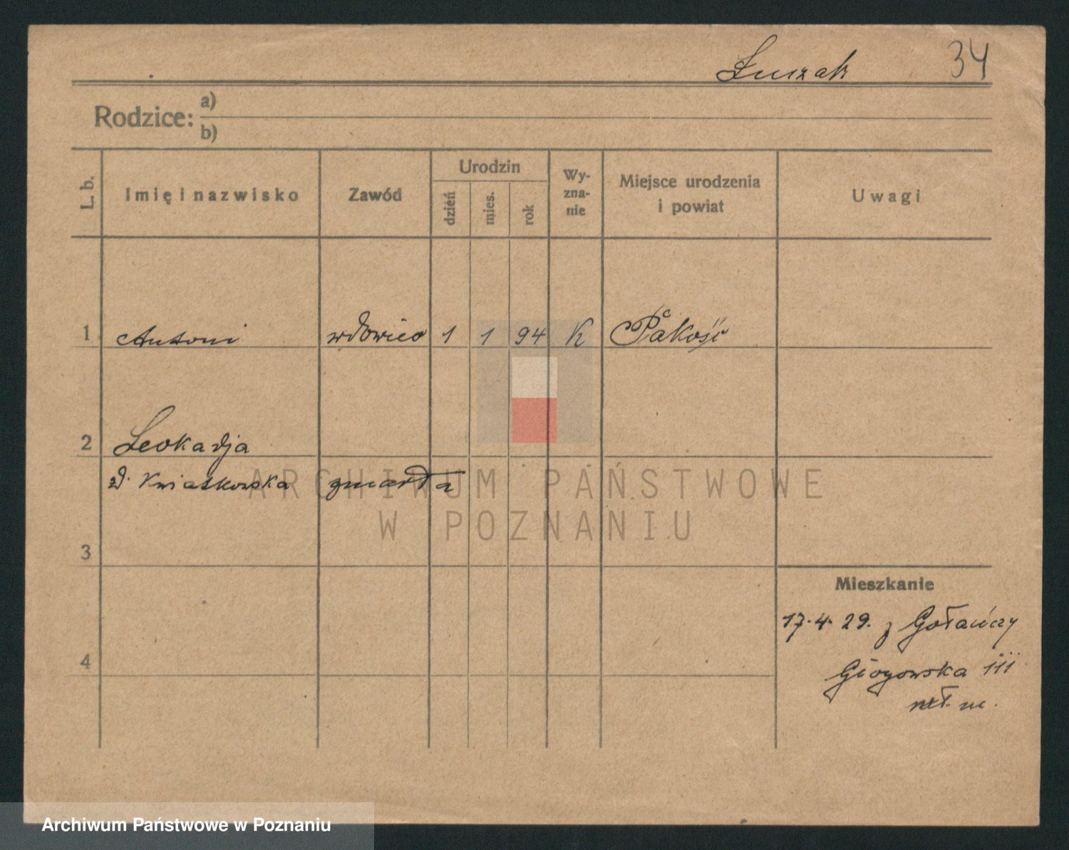 Podgląd karty osobowej dostępny jest po kliknięciu na nazwisko lub ikonkę karty. Można dokonywać powiększenia (ikony na górze) lub przechodzić między kolejnymi skanami (strzałki po bokach).