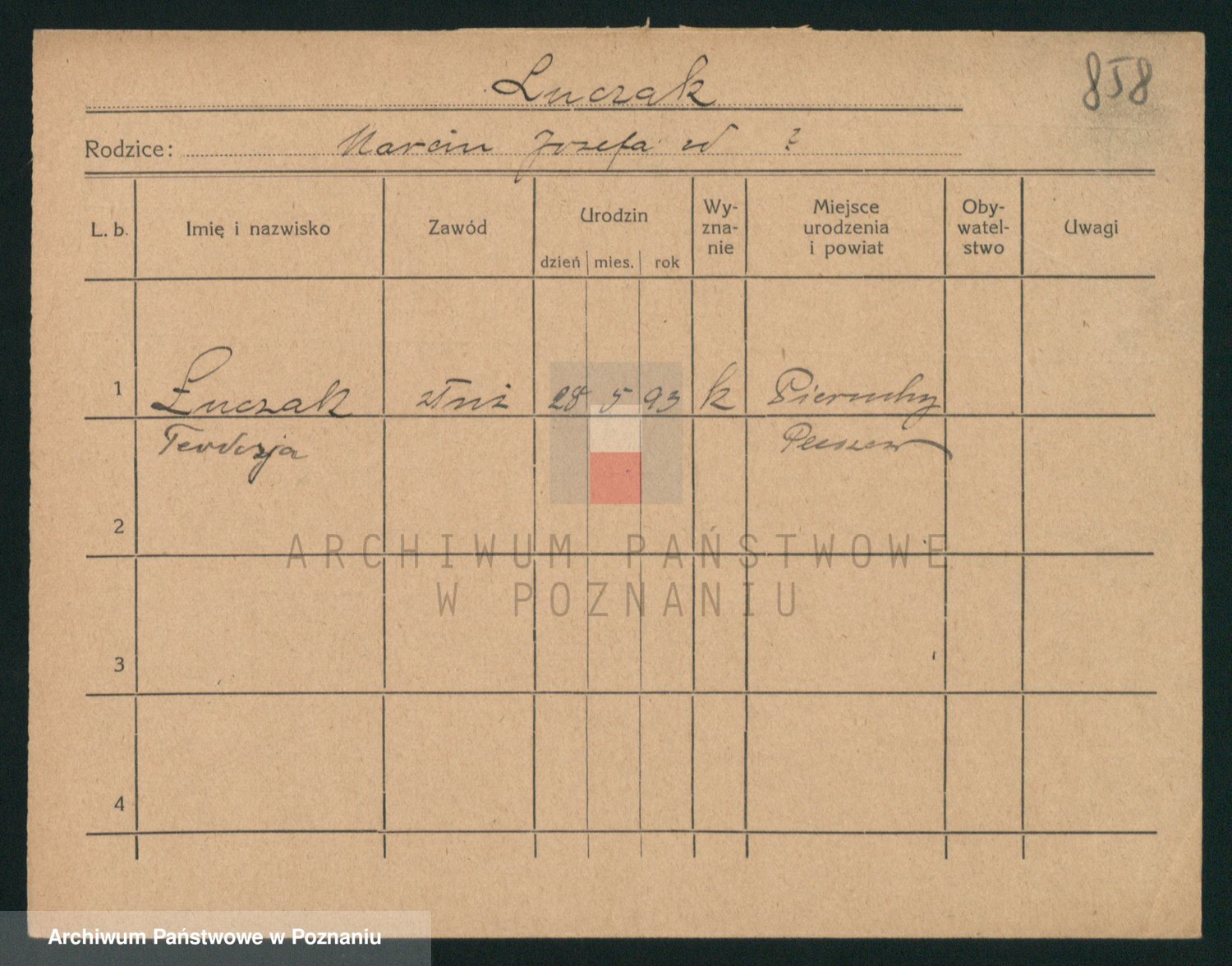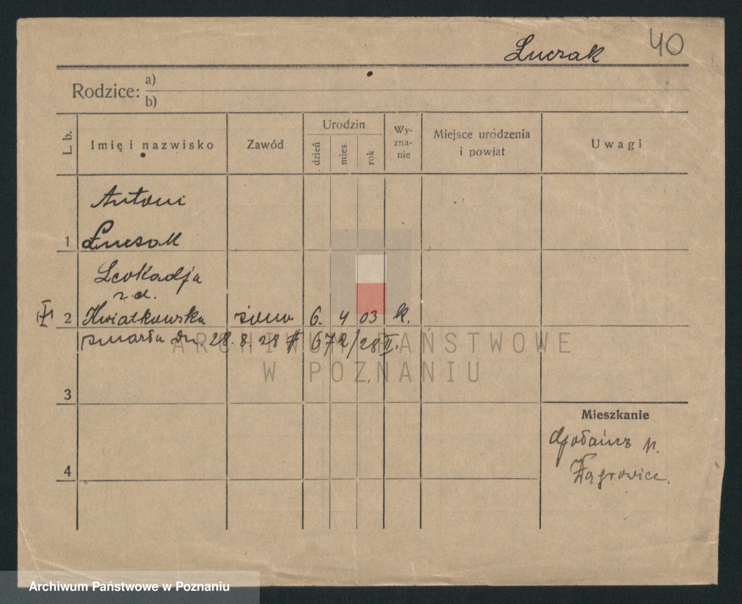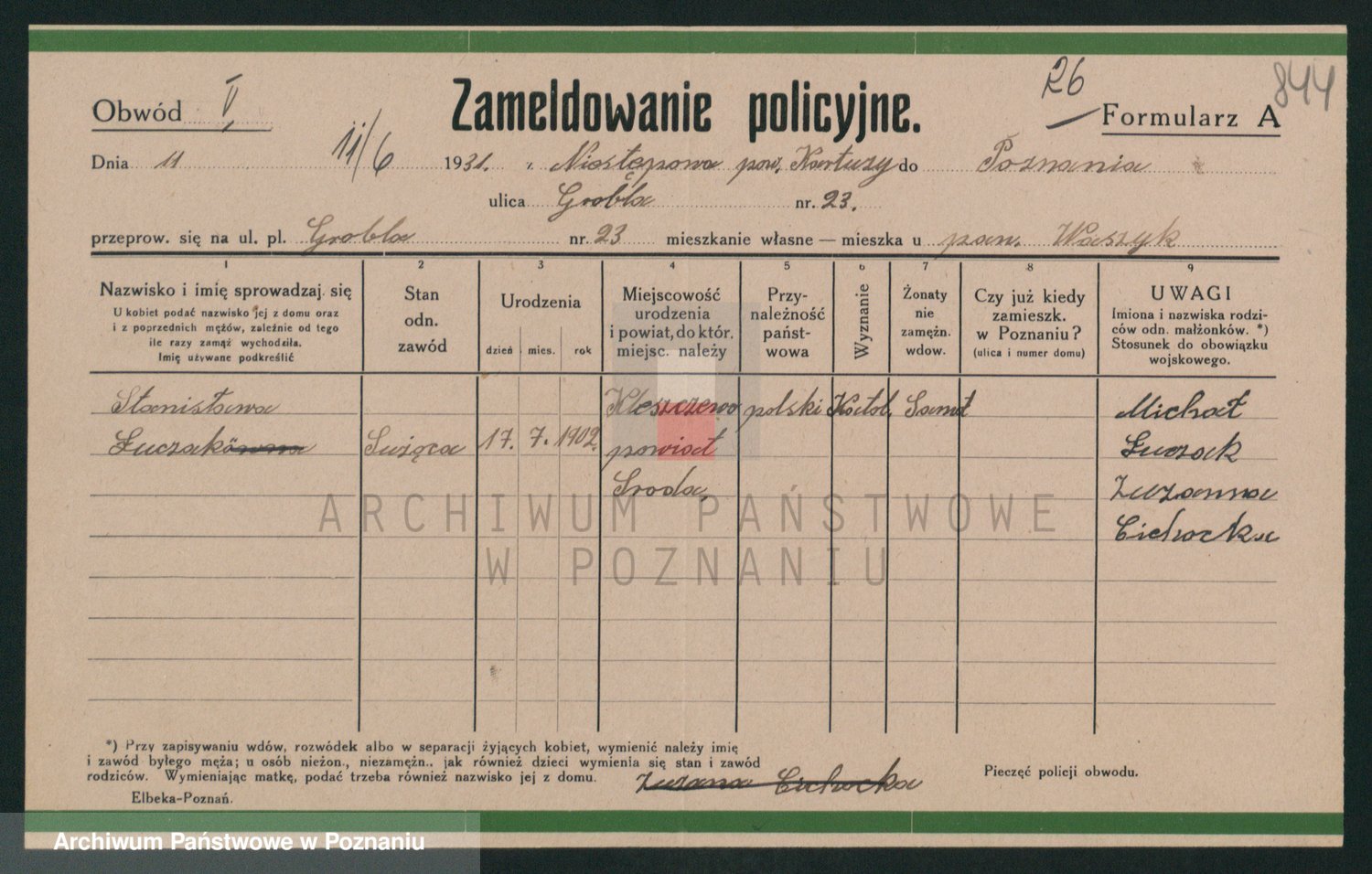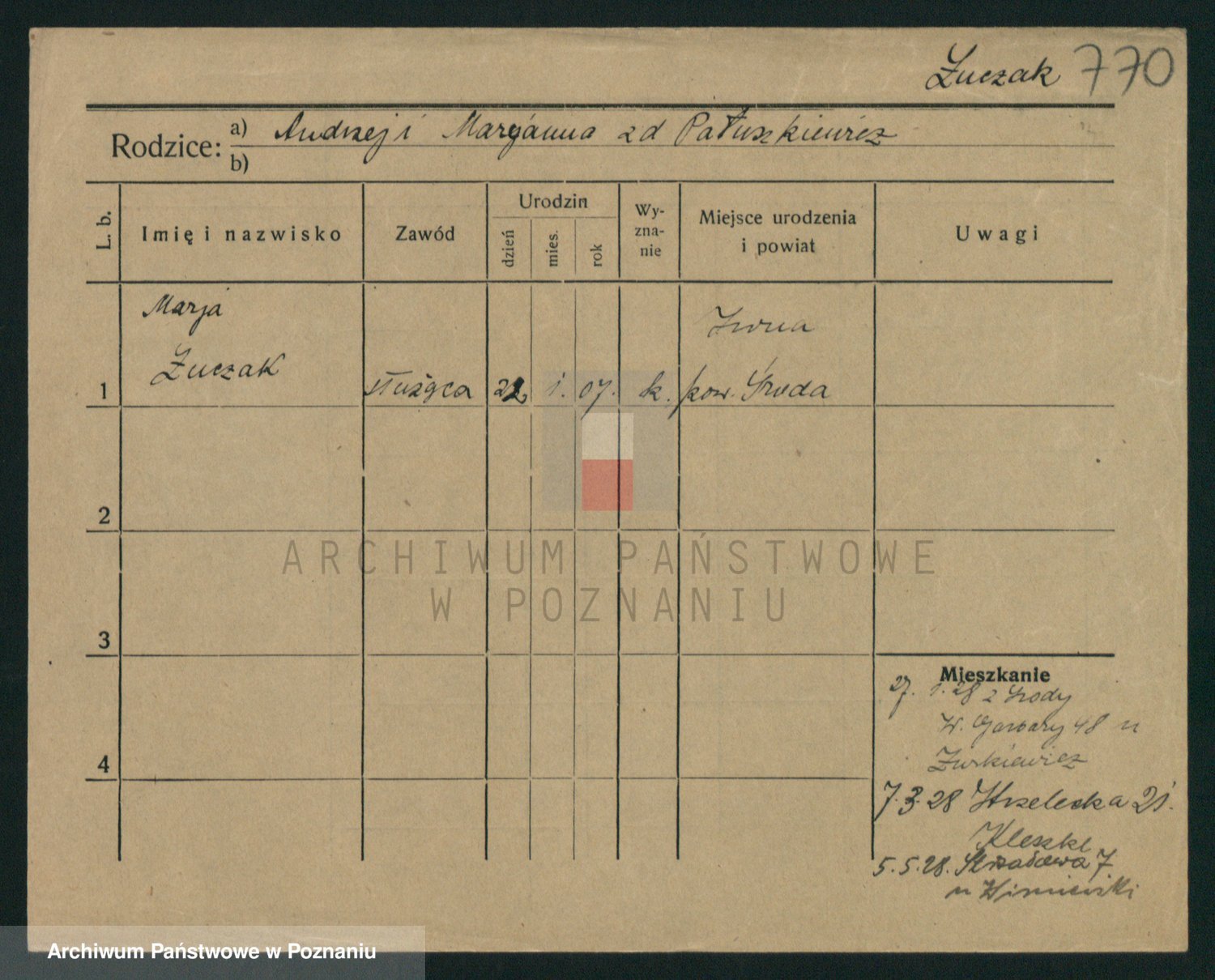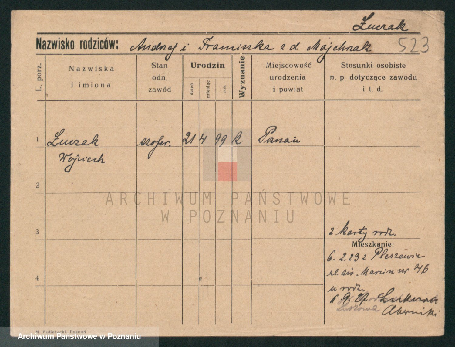 Podgląd karty osobowej dostępny jest po kliknięciu na nazwisko lub ikonkę karty. Można dokonywać powiększenia (ikony na górze) lub przechodzić między kolejnymi skanami (strzałki po bokach).