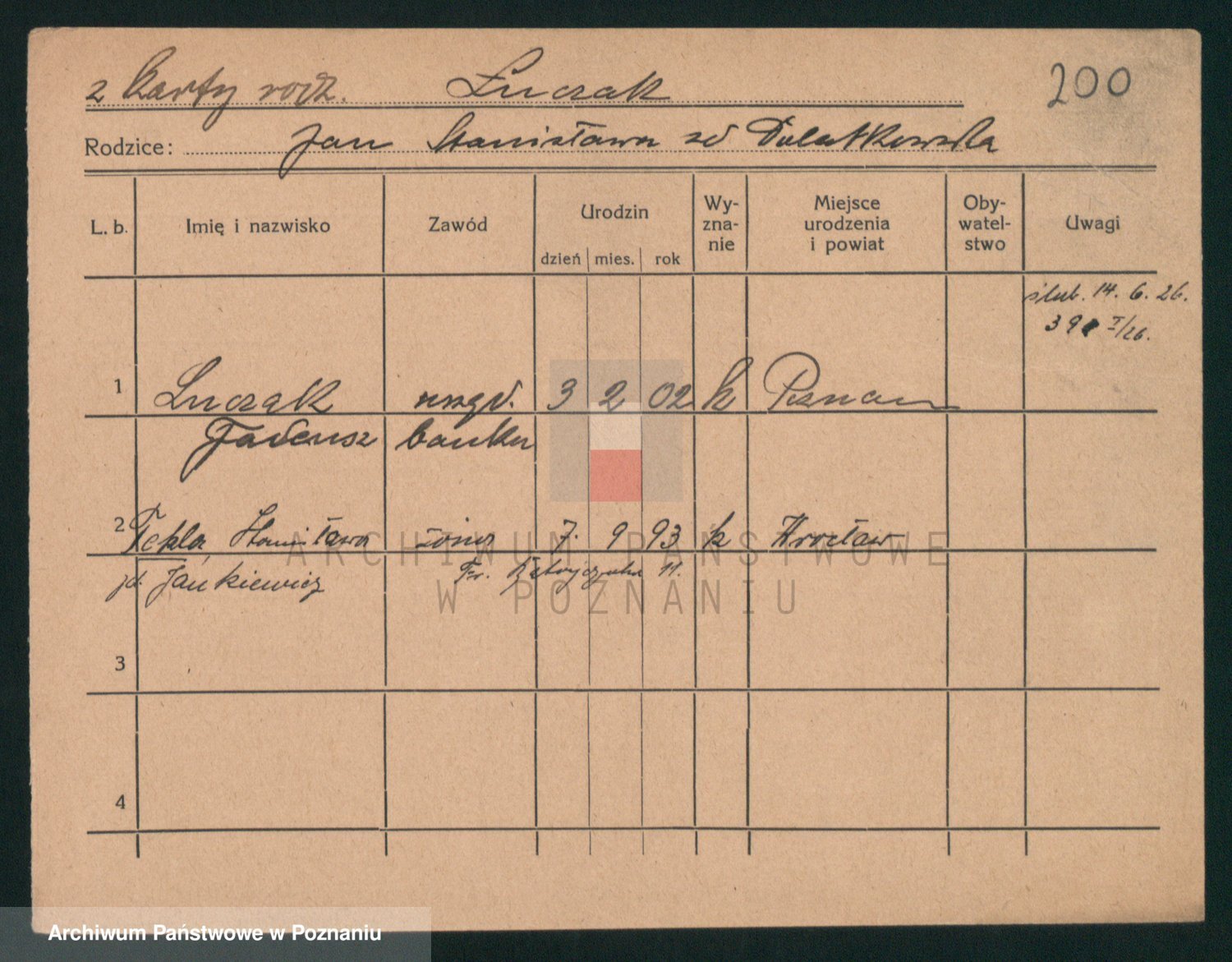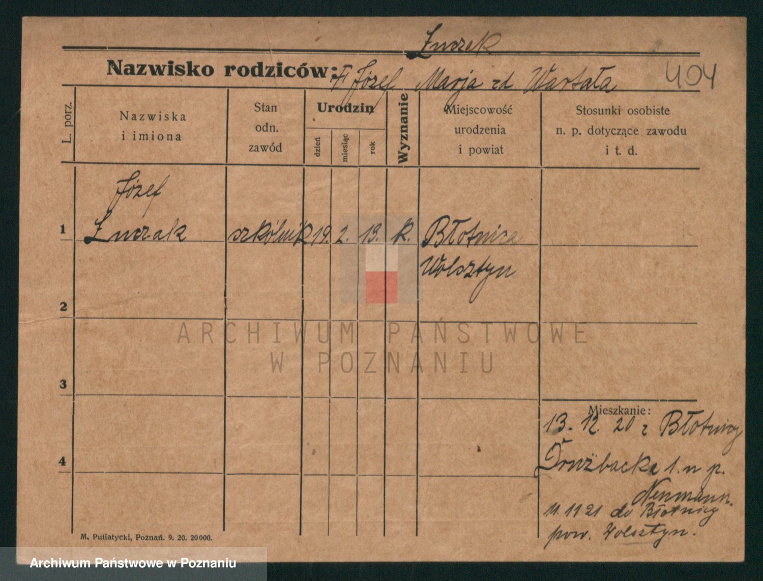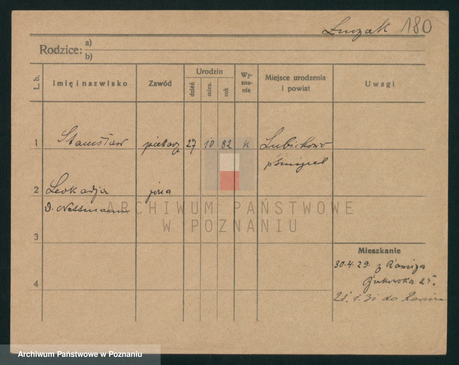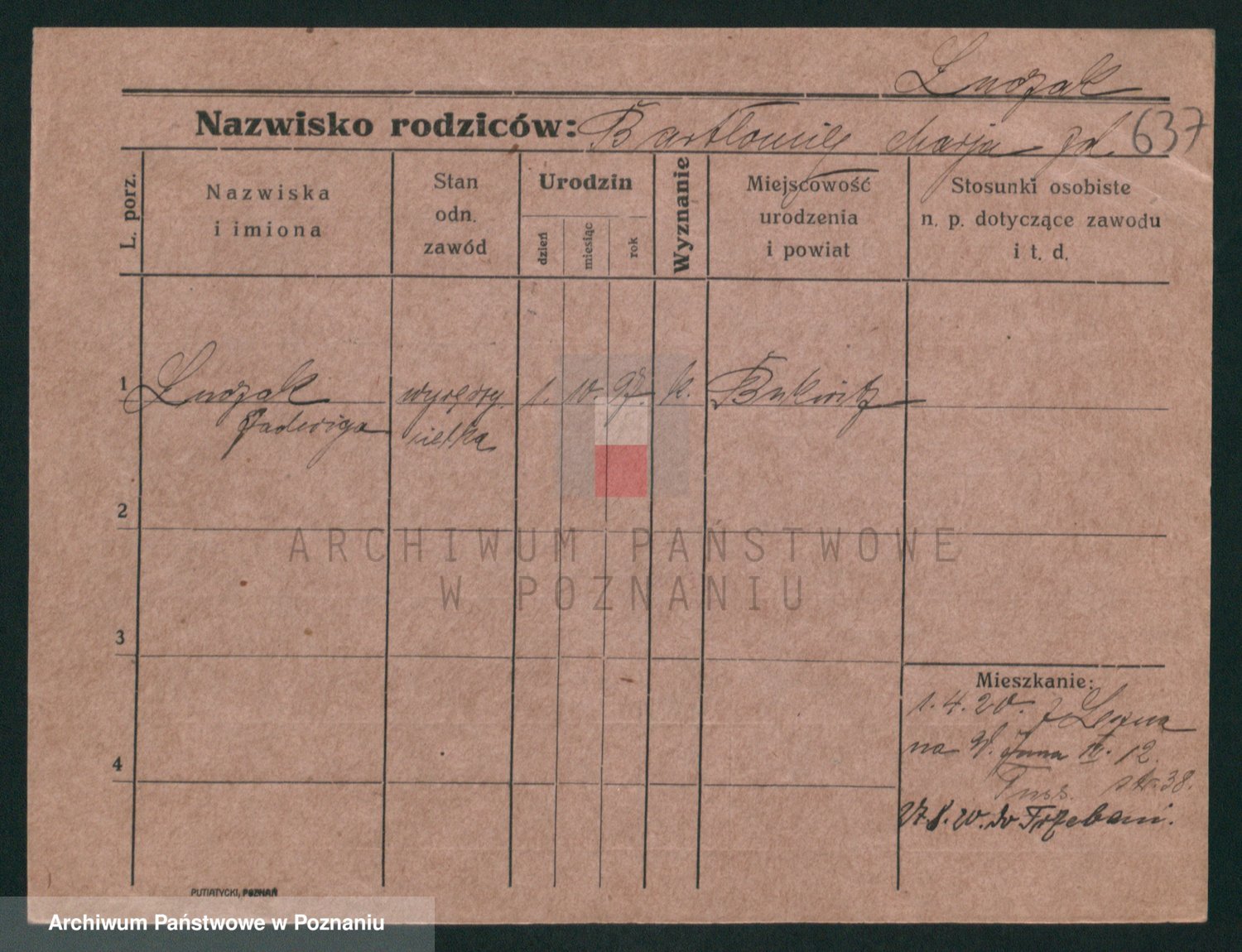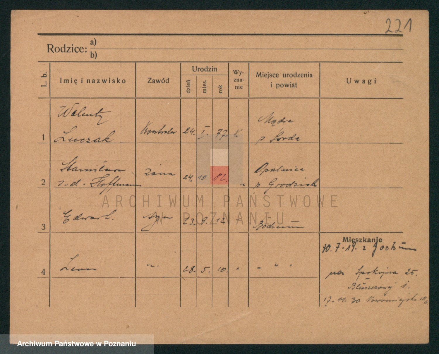 Podgląd karty osobowej dostępny jest po kliknięciu na nazwisko lub ikonkę karty. Można dokonywać powiększenia (ikony na górze) lub przechodzić między kolejnymi skanami (strzałki po bokach).
