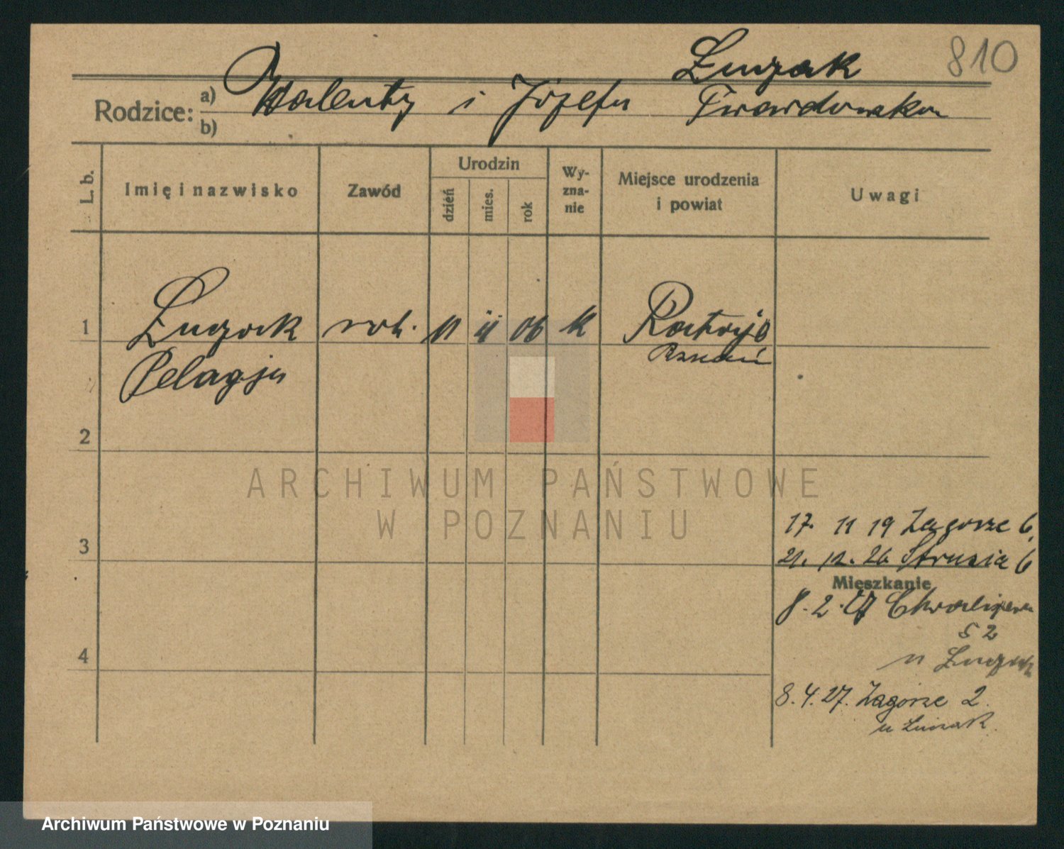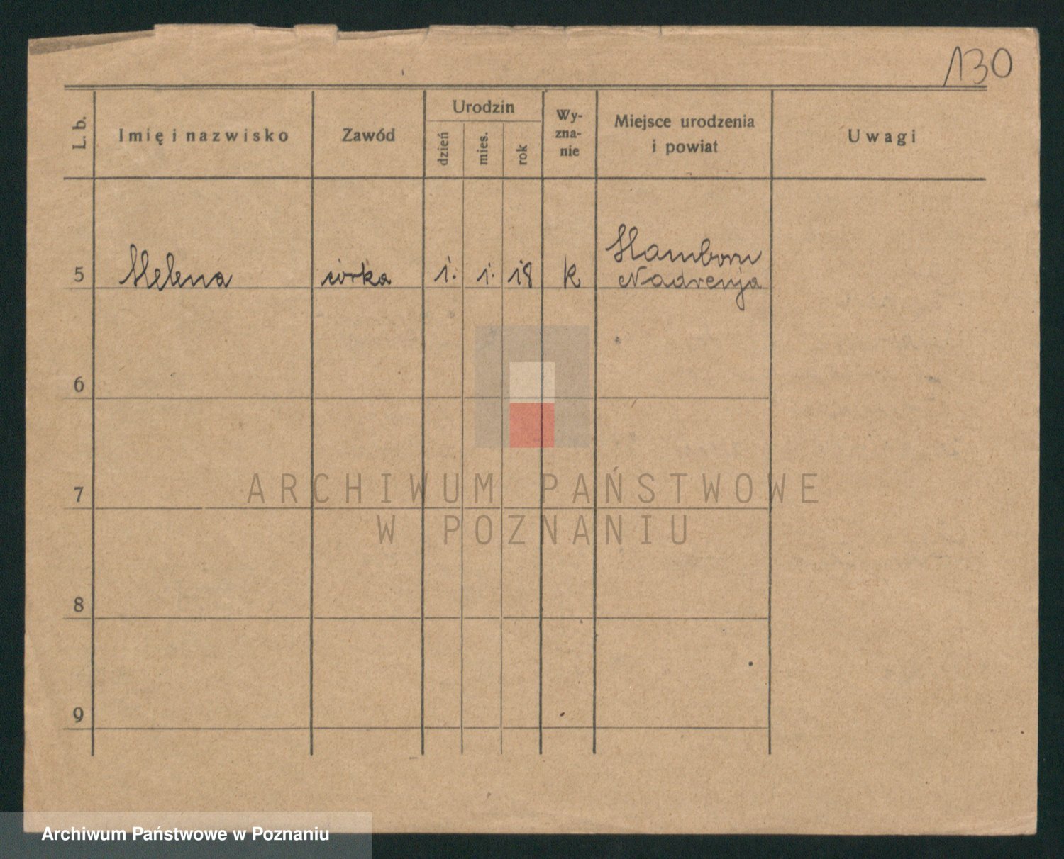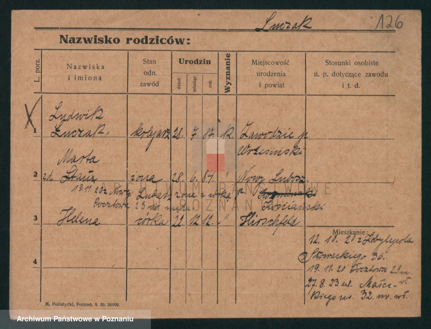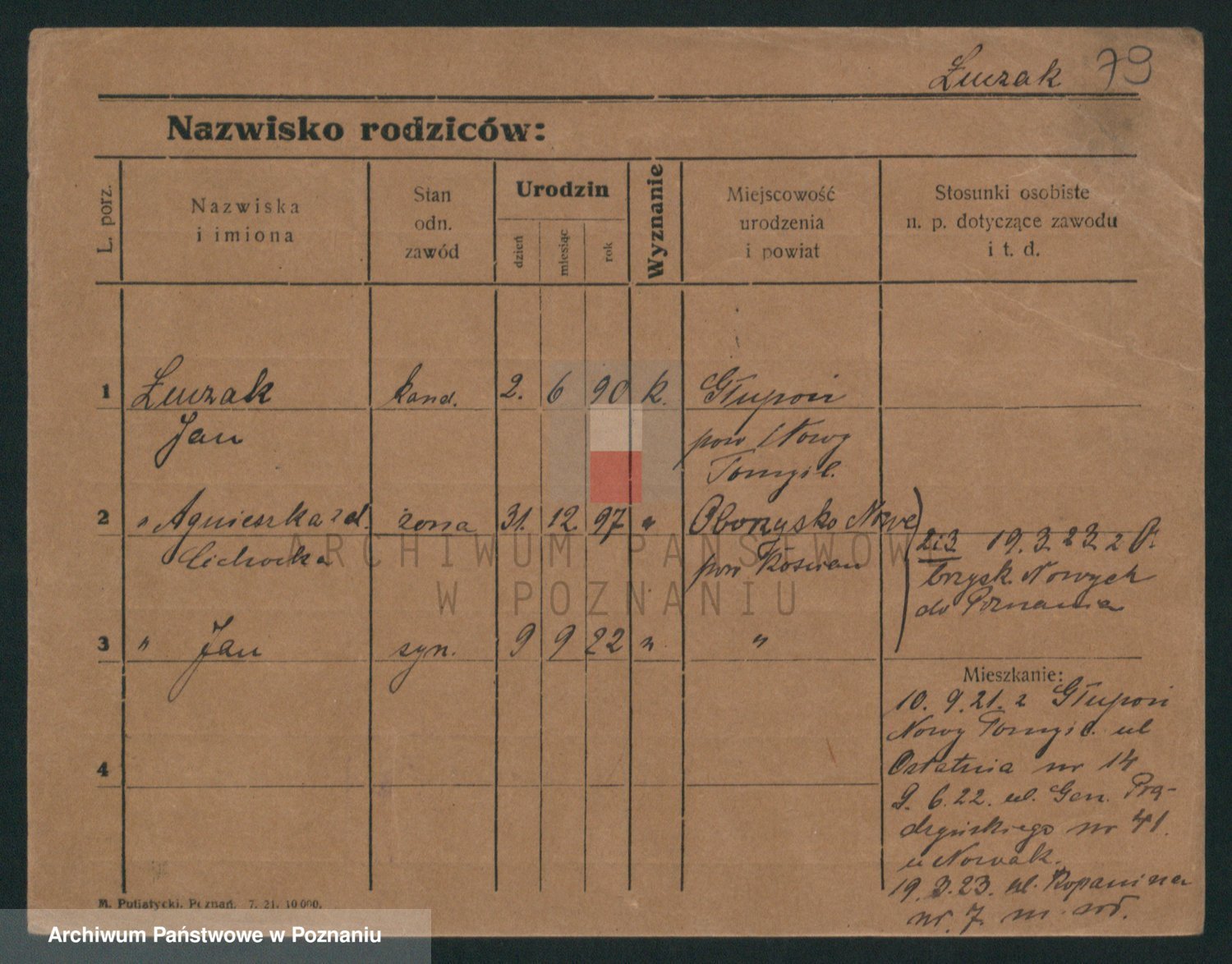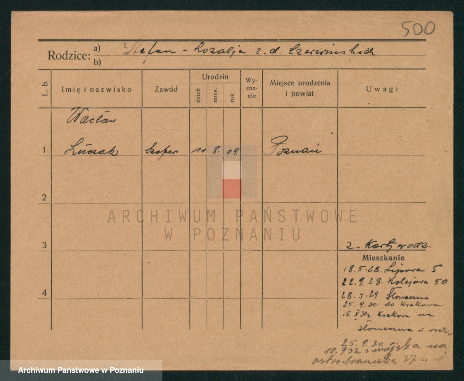 Podgląd karty osobowej dostępny jest po kliknięciu na nazwisko lub ikonkę karty. Można dokonywać powiększenia (ikony na górze) lub przechodzić między kolejnymi skanami (strzałki po bokach).