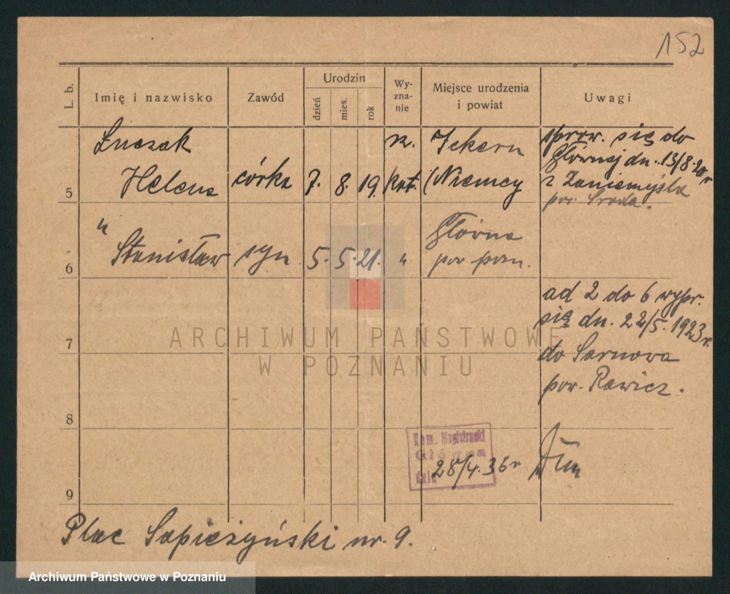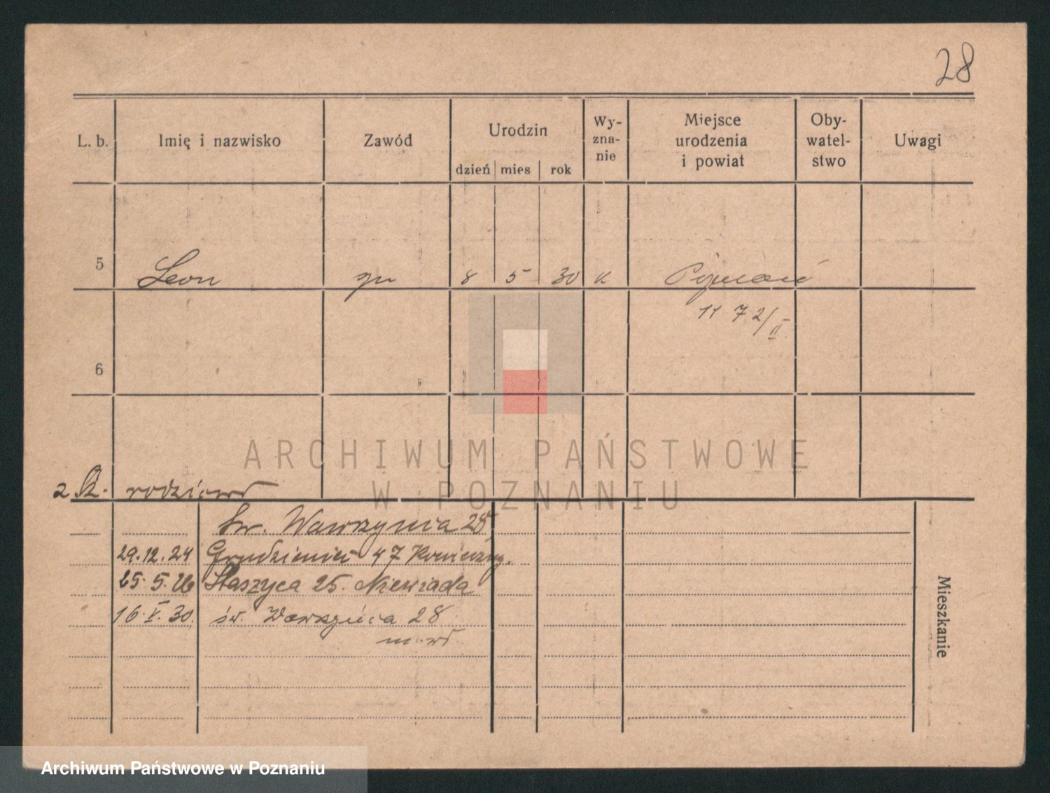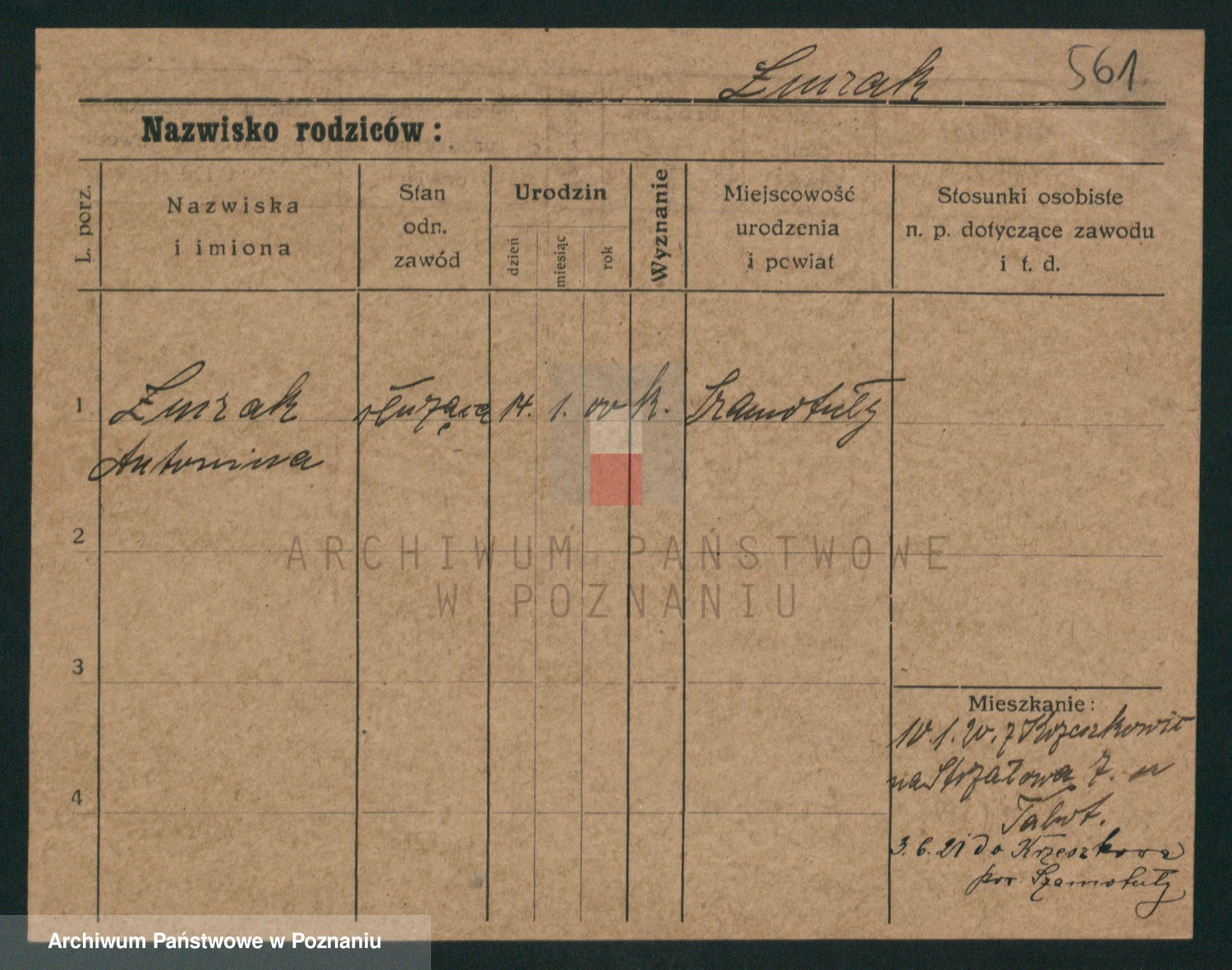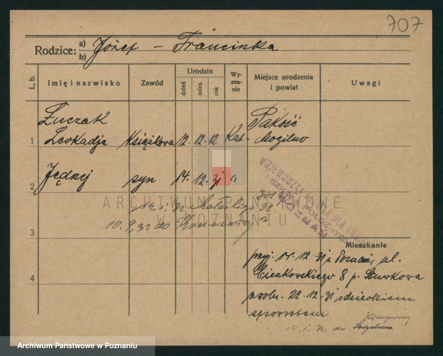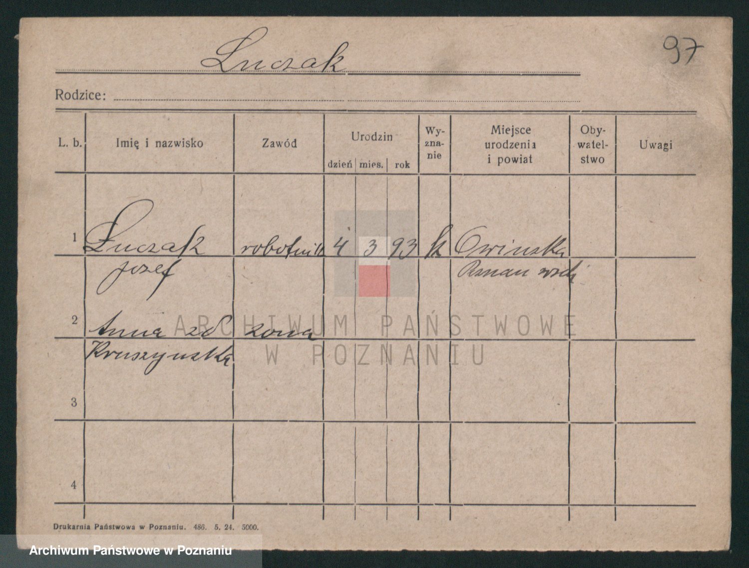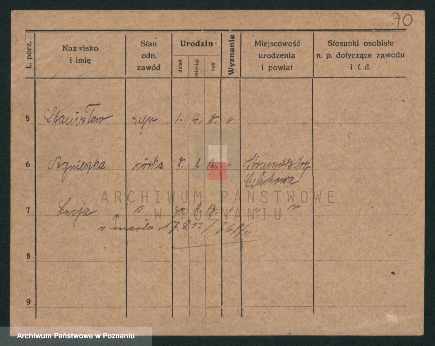 Podgląd karty osobowej dostępny jest po kliknięciu na nazwisko lub ikonkę karty. Można dokonywać powiększenia (ikony na górze) lub przechodzić między kolejnymi skanami (strzałki po bokach).