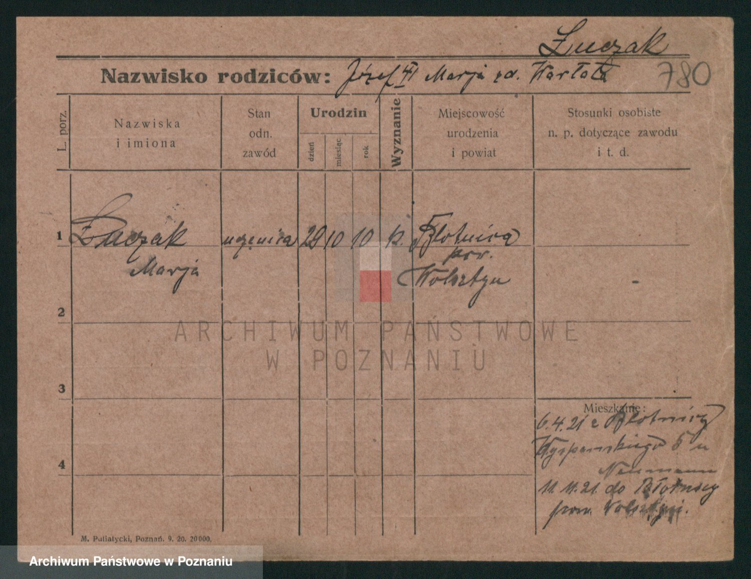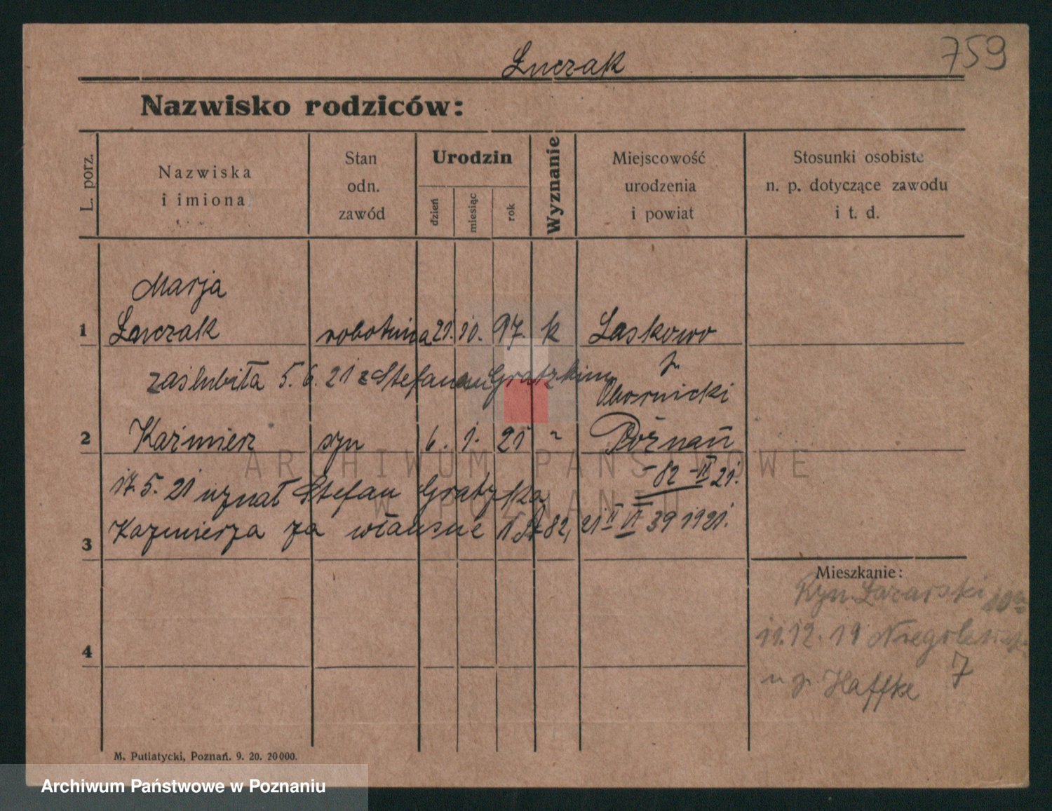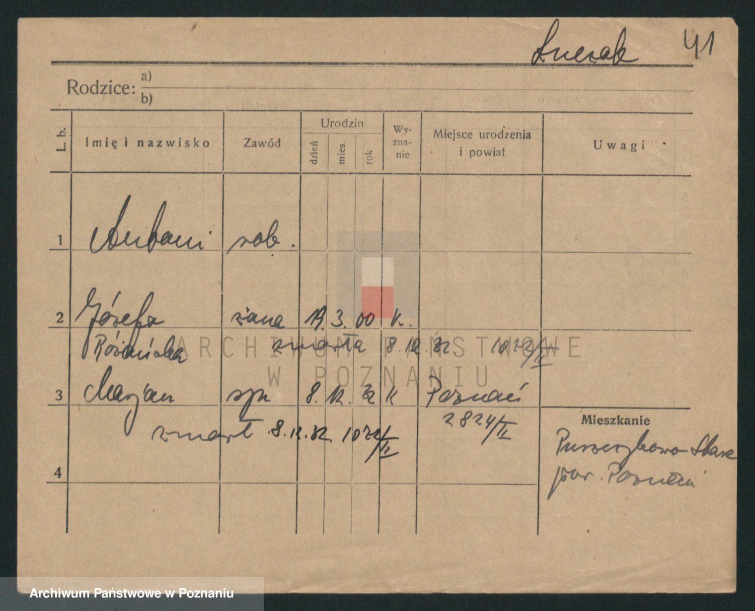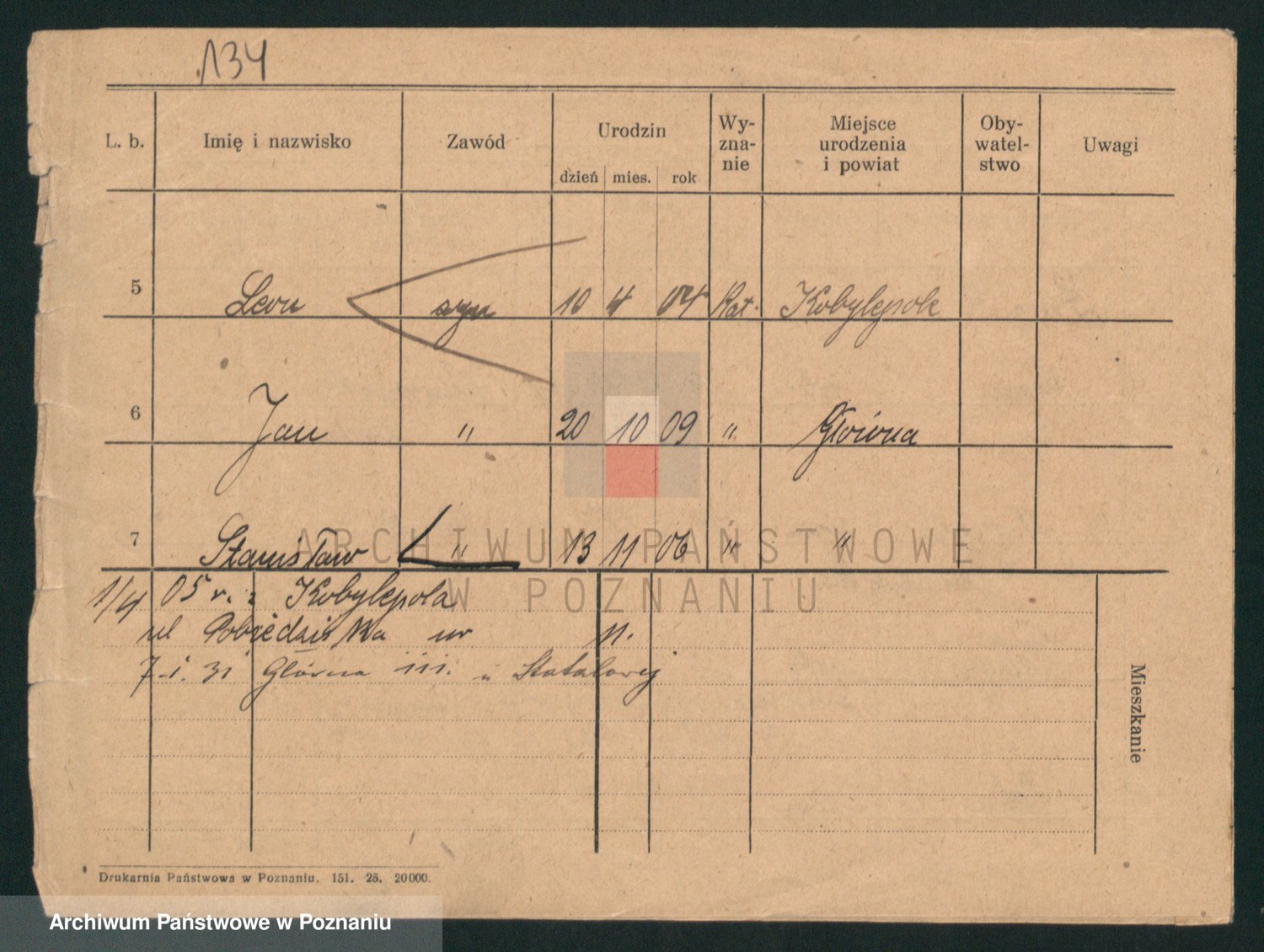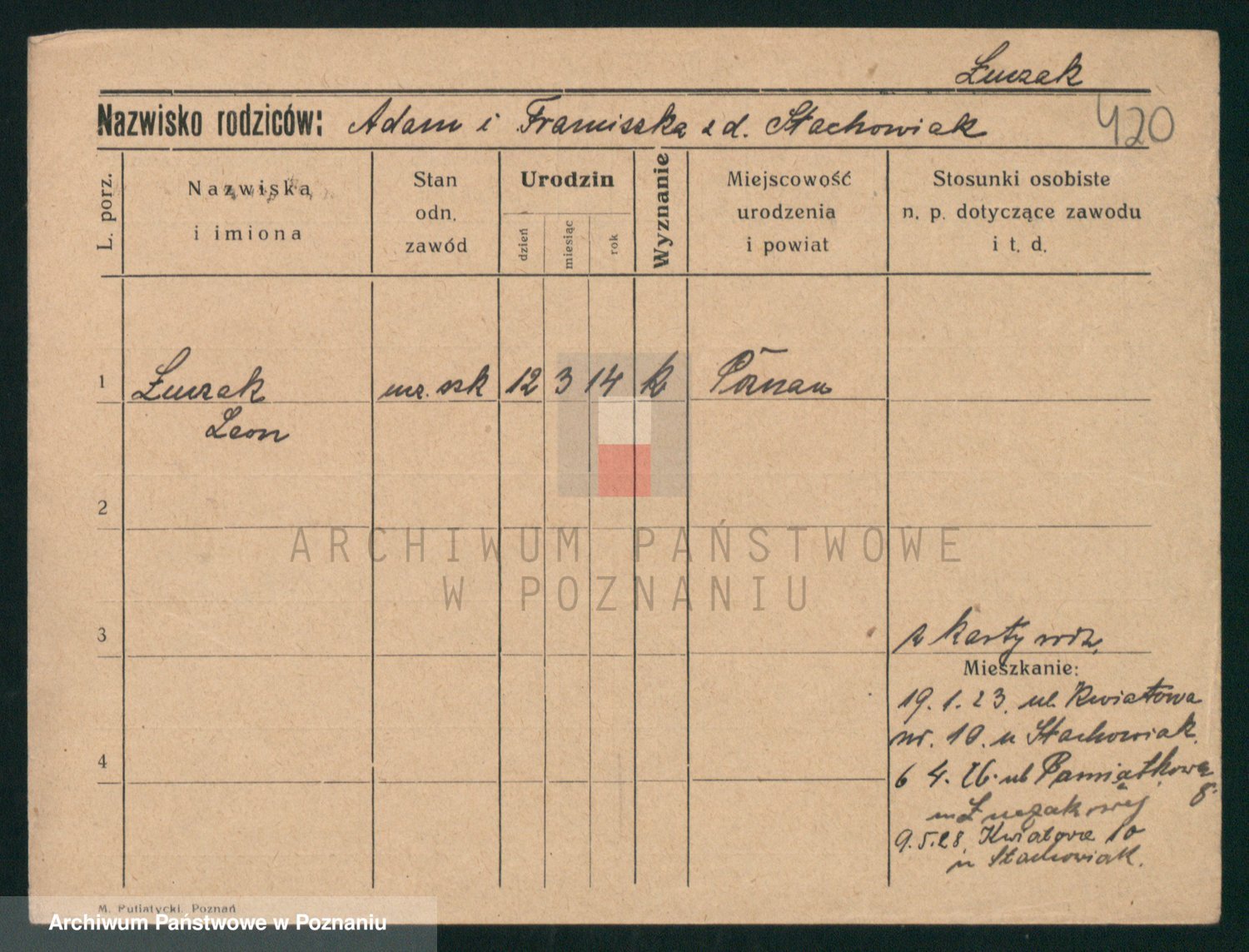 Podgląd karty osobowej dostępny jest po kliknięciu na nazwisko lub ikonkę karty. Można dokonywać powiększenia (ikony na górze) lub przechodzić między kolejnymi skanami (strzałki po bokach).