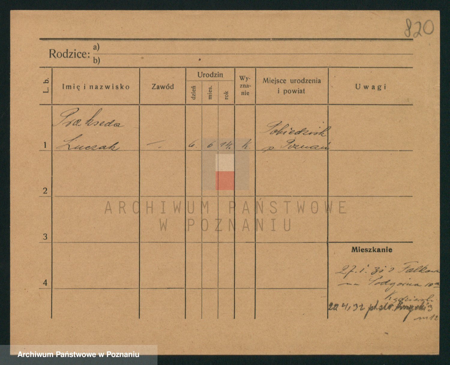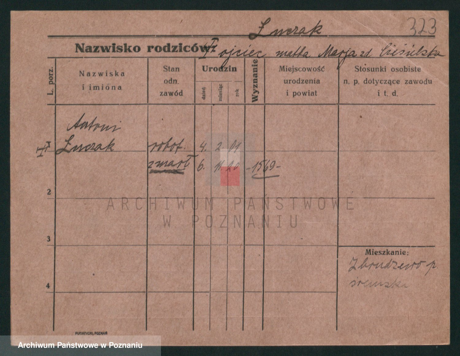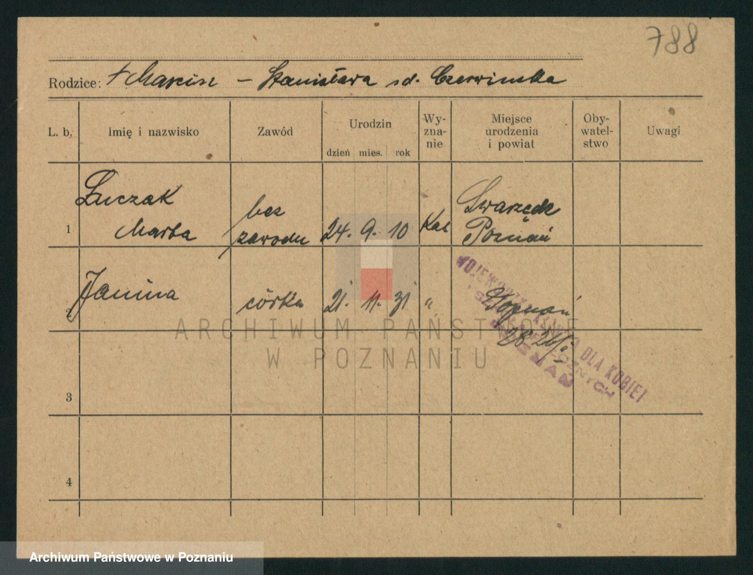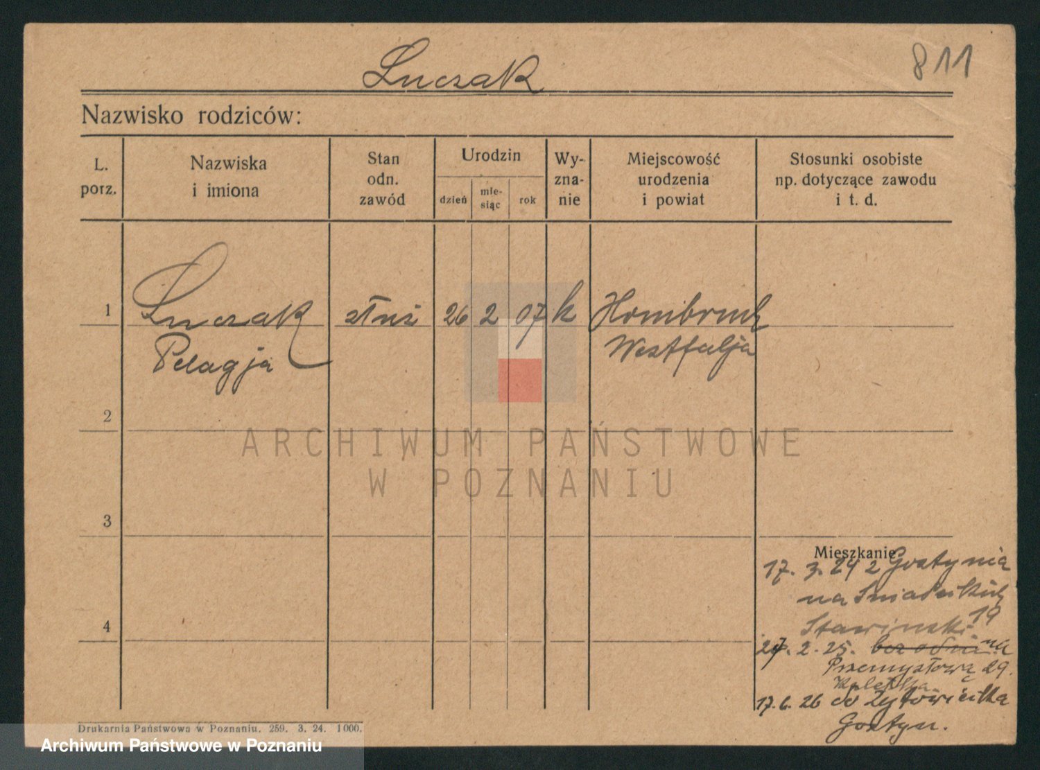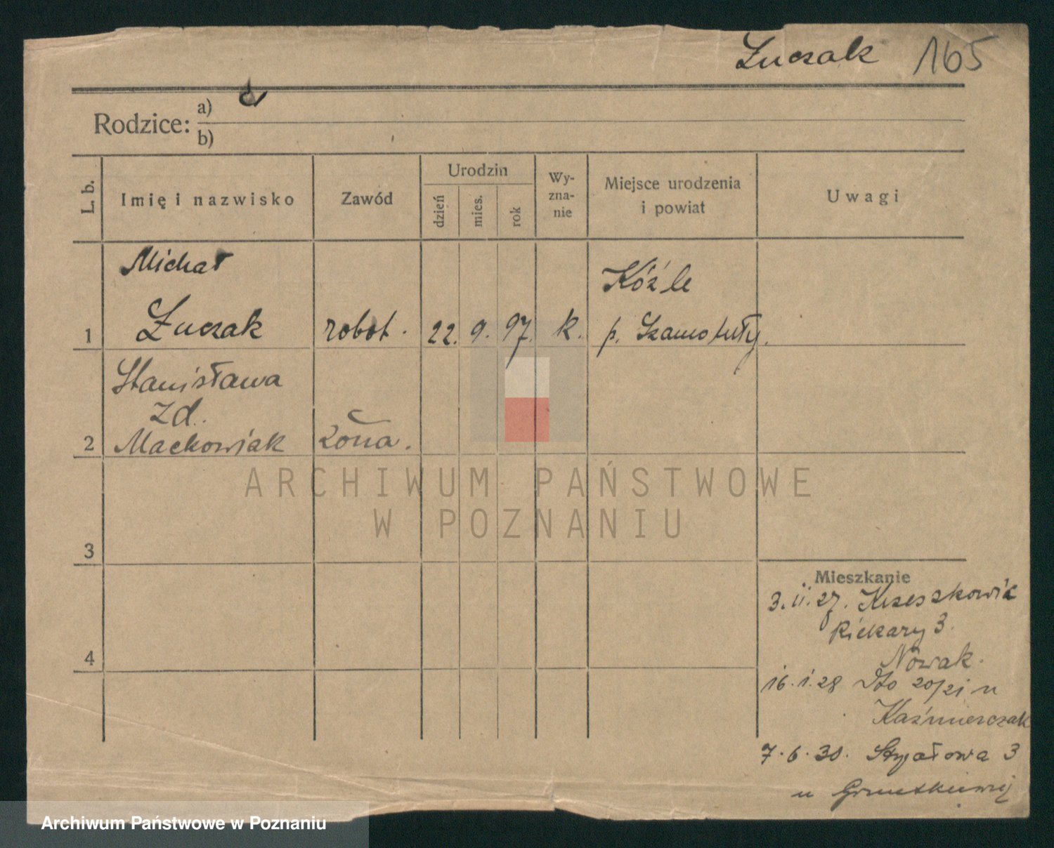 Podgląd karty osobowej dostępny jest po kliknięciu na nazwisko lub ikonkę karty. Można dokonywać powiększenia (ikony na górze) lub przechodzić między kolejnymi skanami (strzałki po bokach).