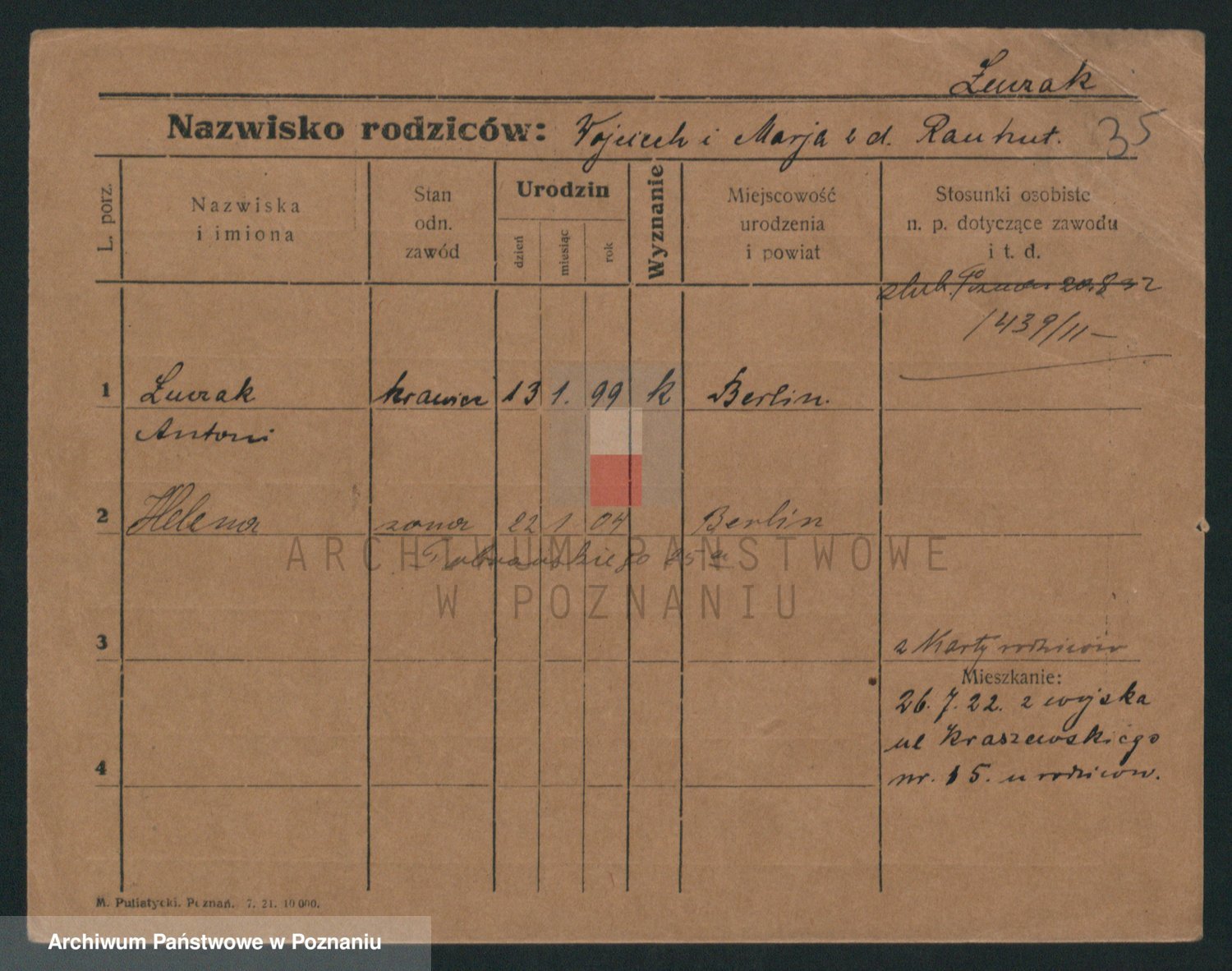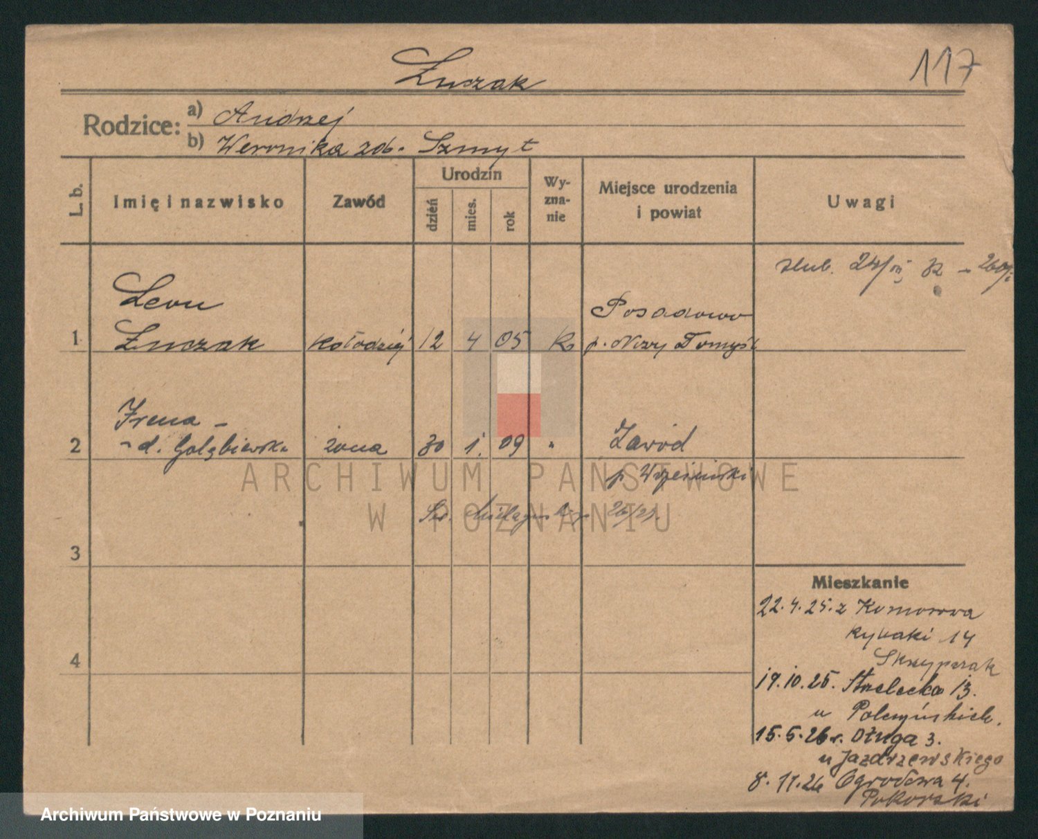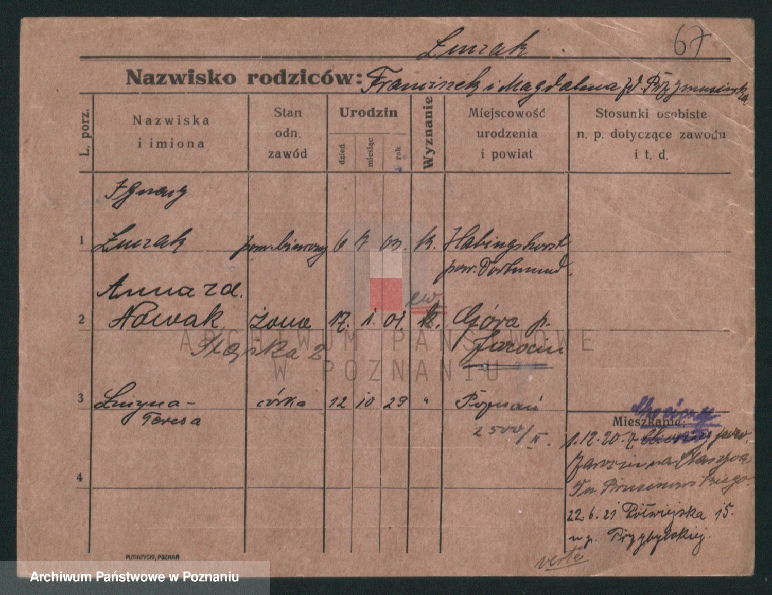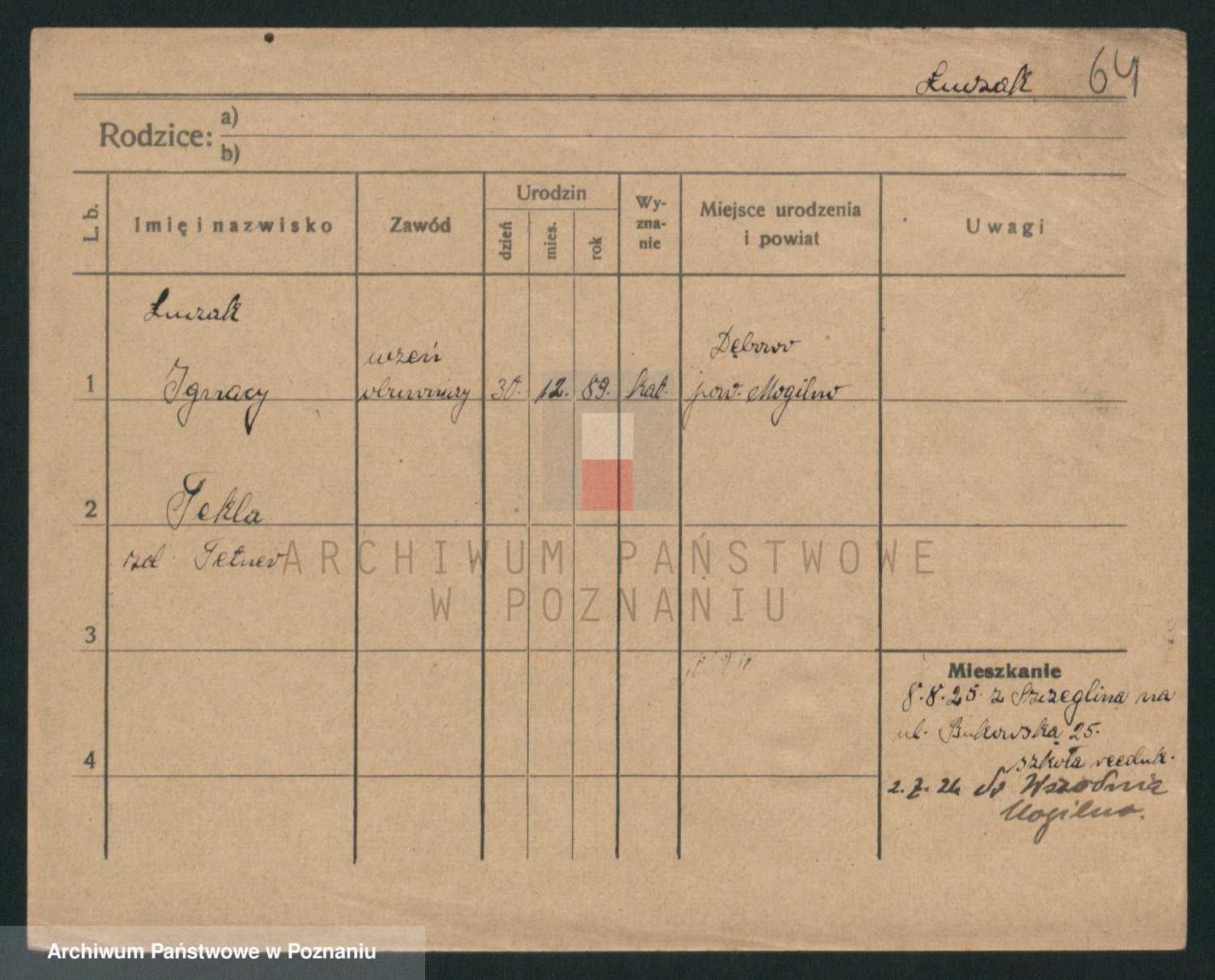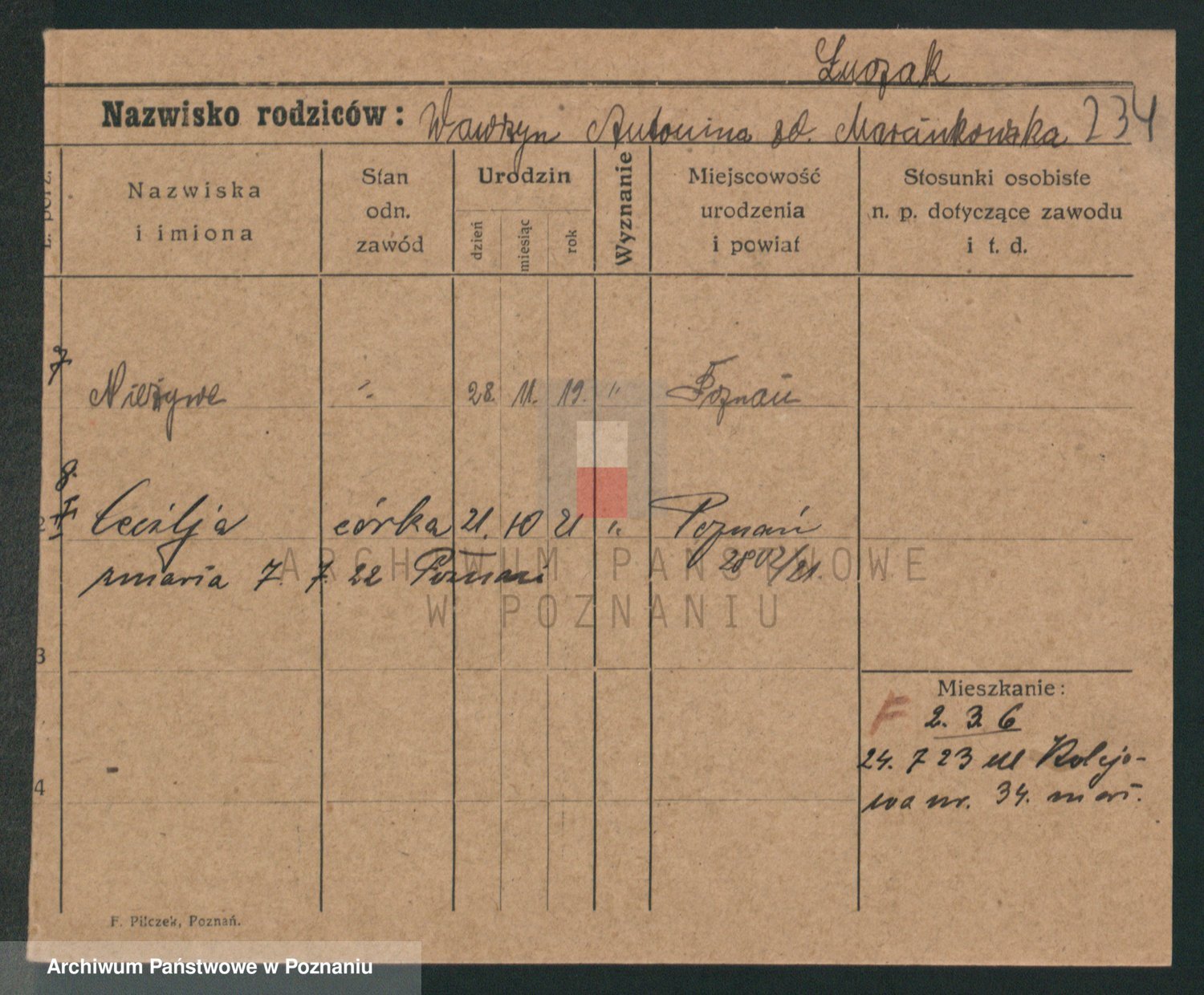 Podgląd karty osobowej dostępny jest po kliknięciu na nazwisko lub ikonkę karty. Można dokonywać powiększenia (ikony na górze) lub przechodzić między kolejnymi skanami (strzałki po bokach).