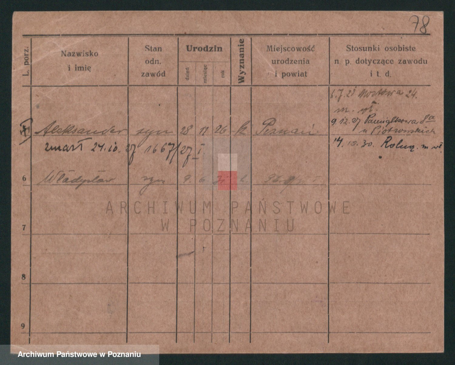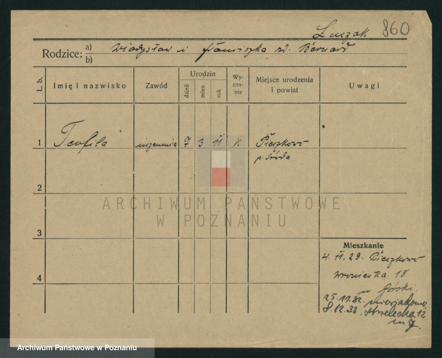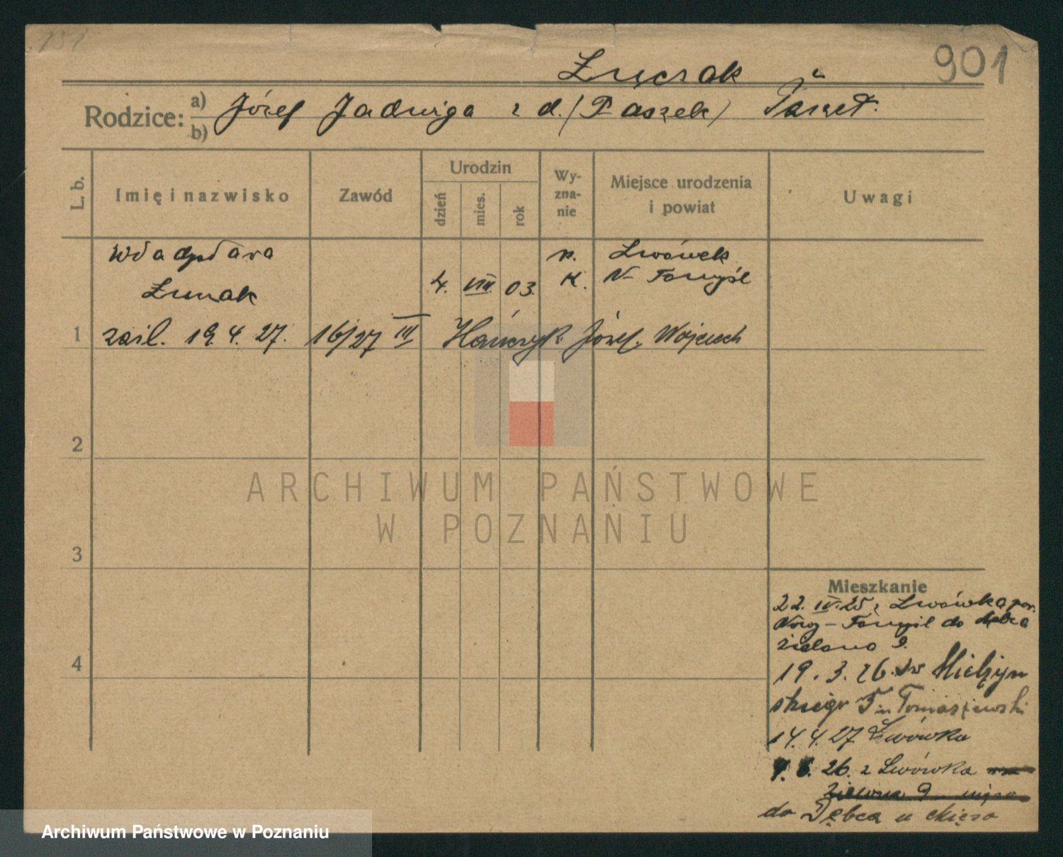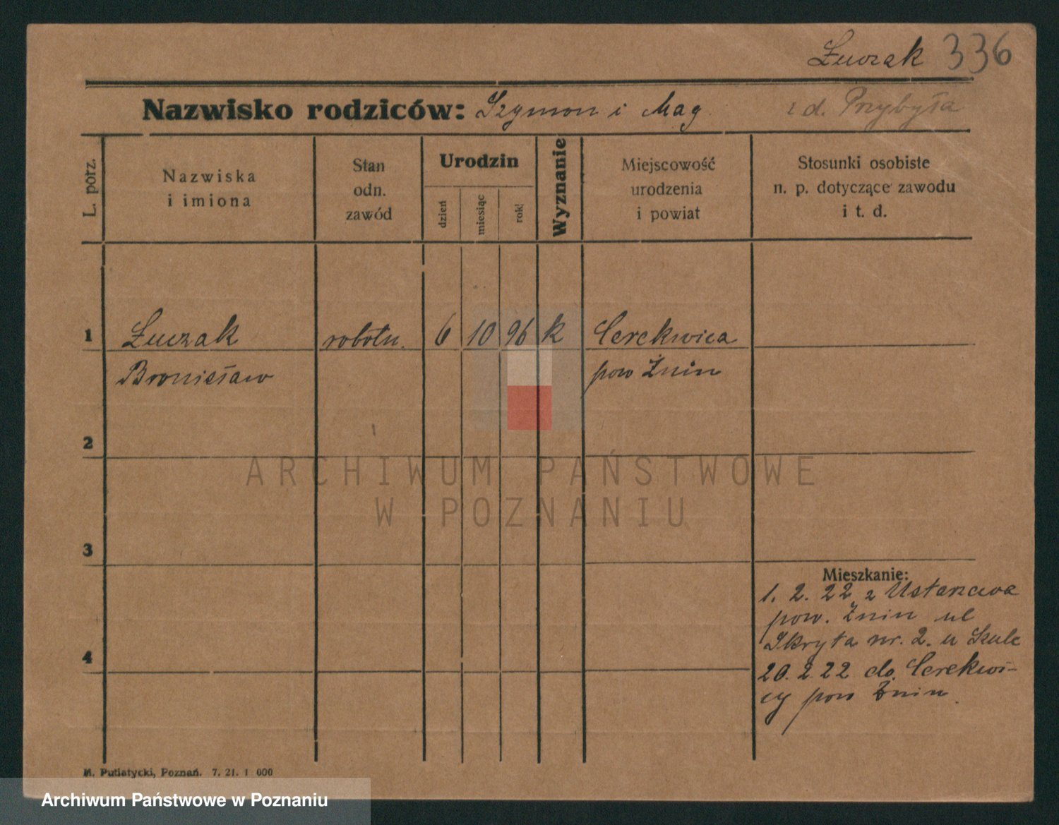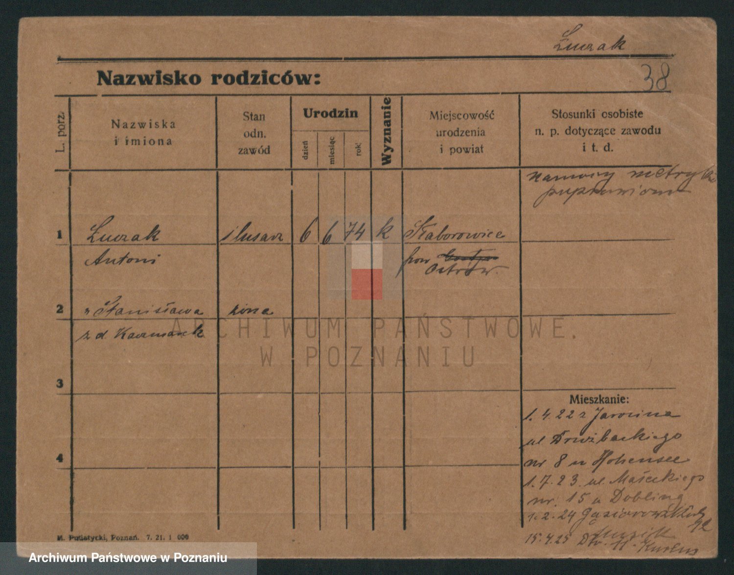 Podgląd karty osobowej dostępny jest po kliknięciu na nazwisko lub ikonkę karty. Można dokonywać powiększenia (ikony na górze) lub przechodzić między kolejnymi skanami (strzałki po bokach).