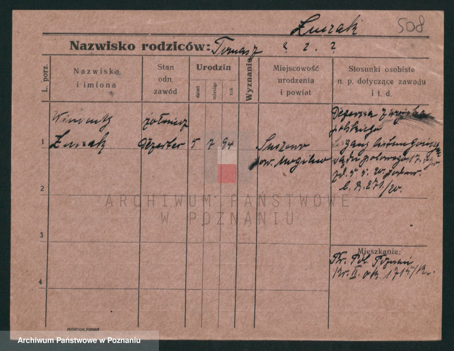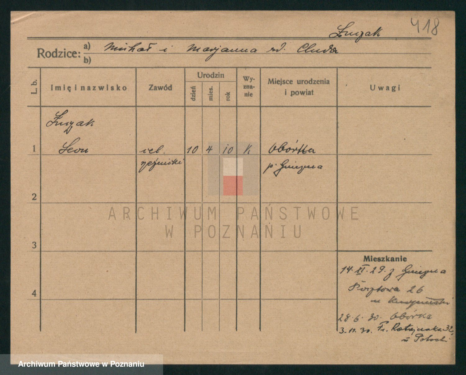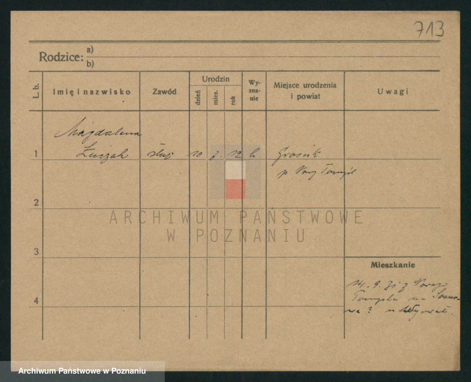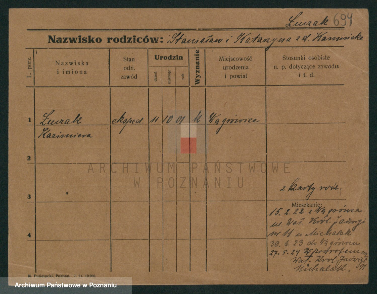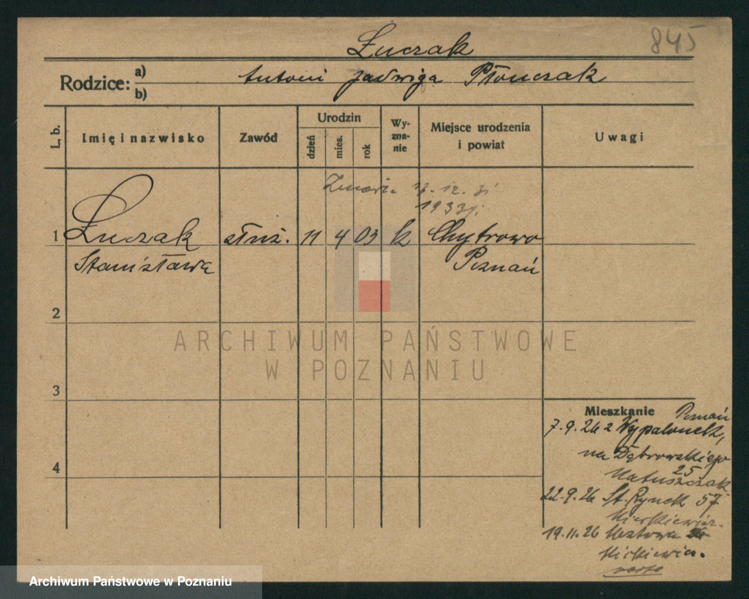 Podgląd karty osobowej dostępny jest po kliknięciu na nazwisko lub ikonkę karty. Można dokonywać powiększenia (ikony na górze) lub przechodzić między kolejnymi skanami (strzałki po bokach).