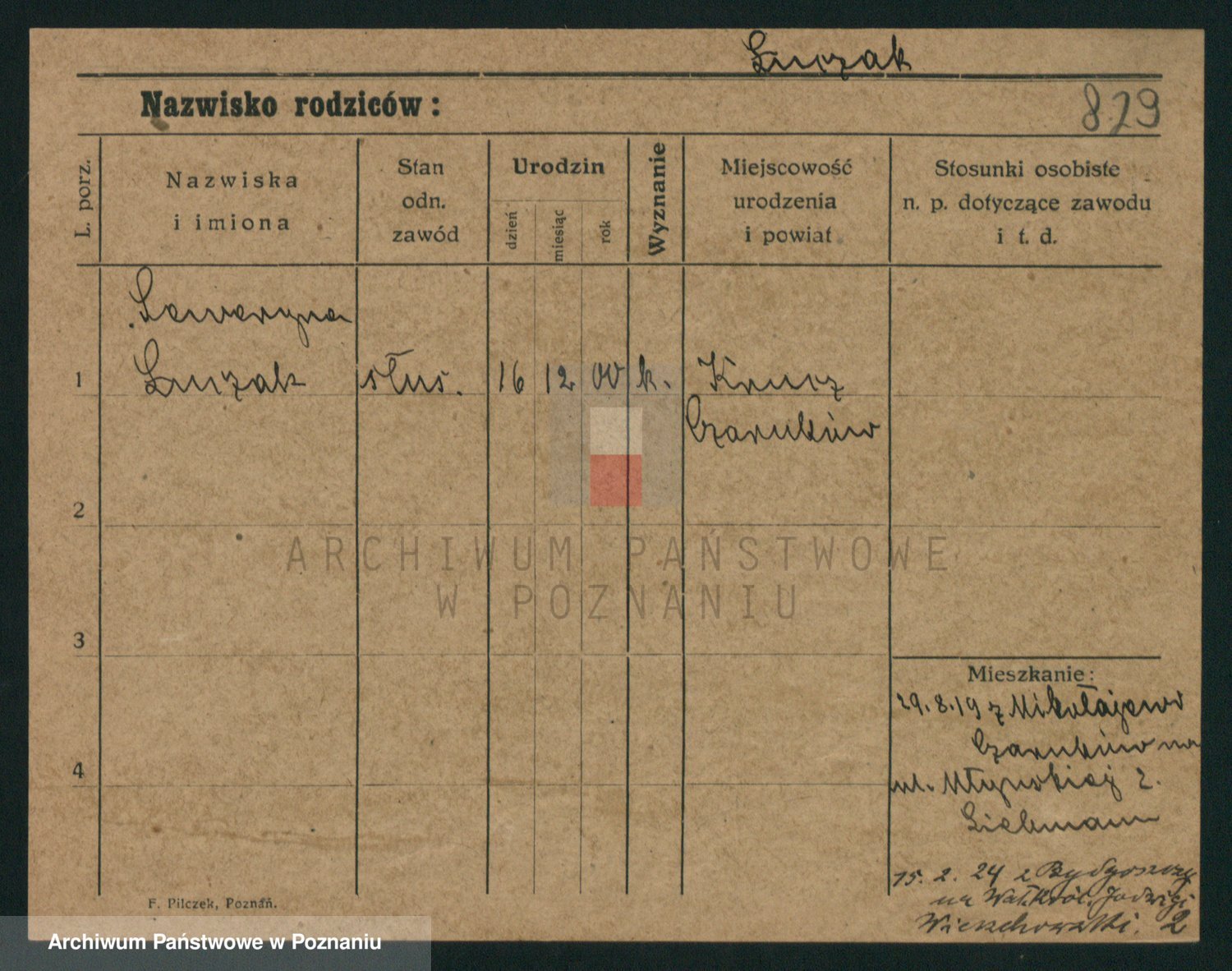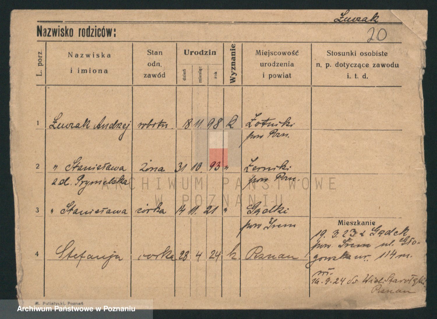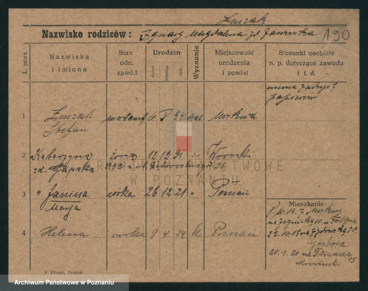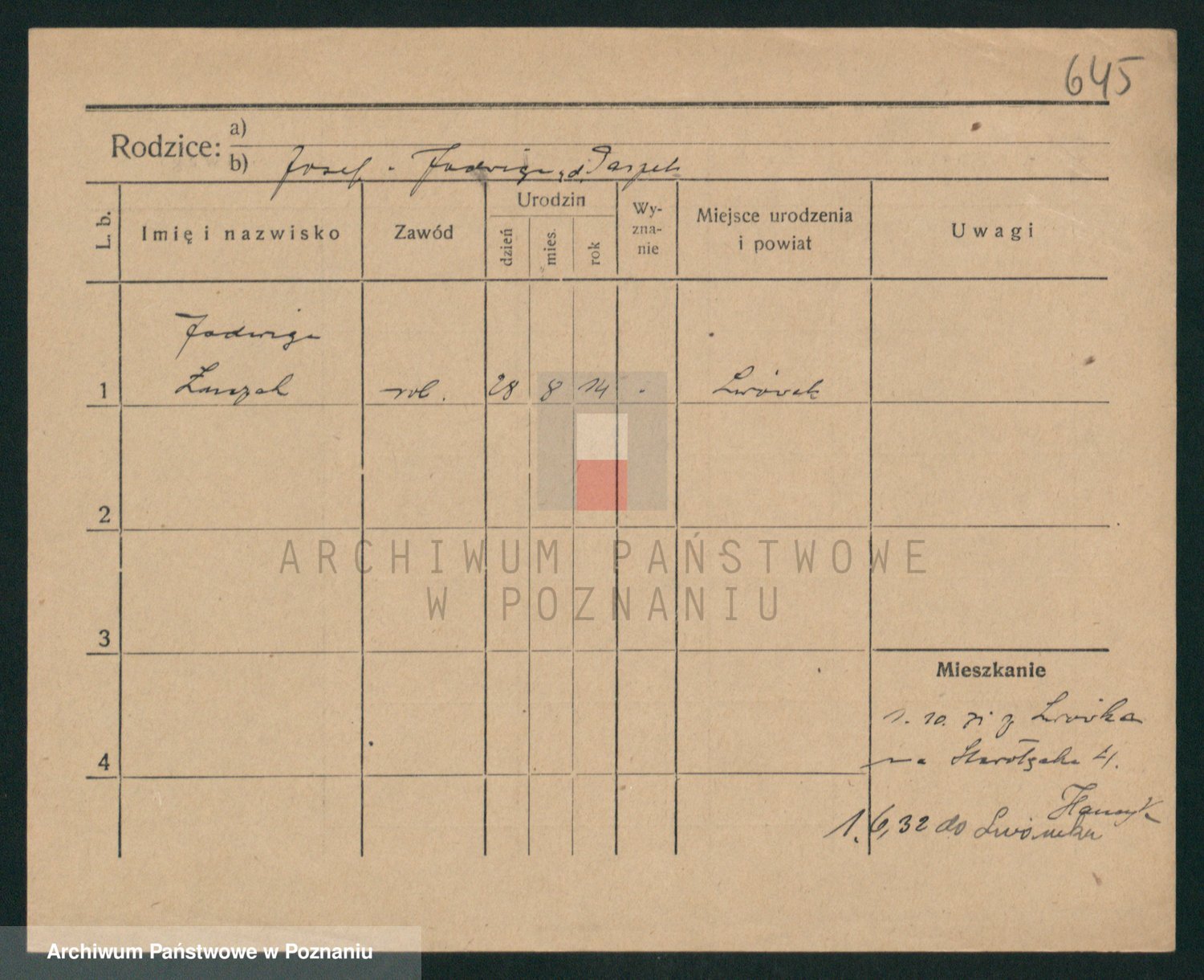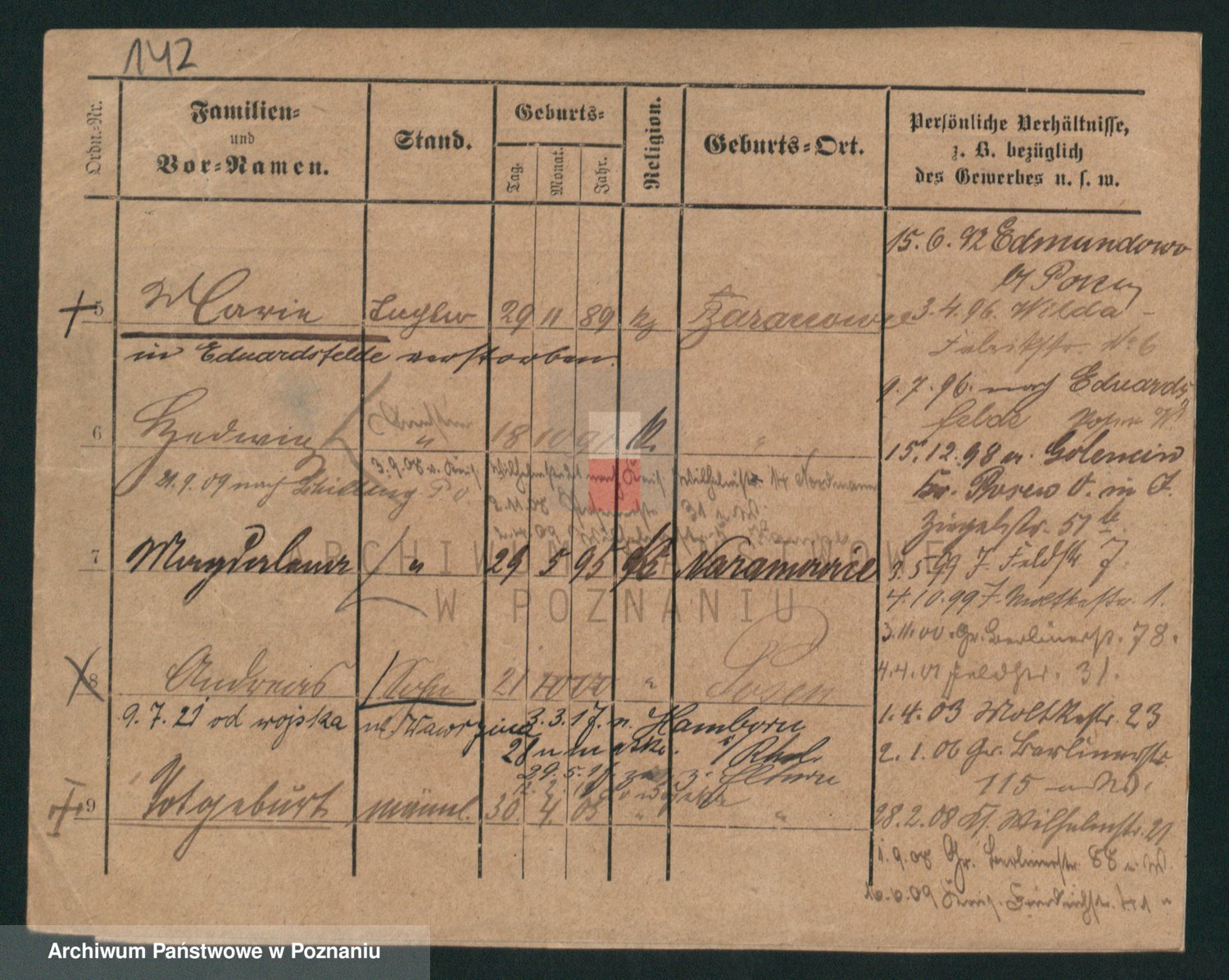 Podgląd karty osobowej dostępny jest po kliknięciu na nazwisko lub ikonkę karty. Można dokonywać powiększenia (ikony na górze) lub przechodzić między kolejnymi skanami (strzałki po bokach).