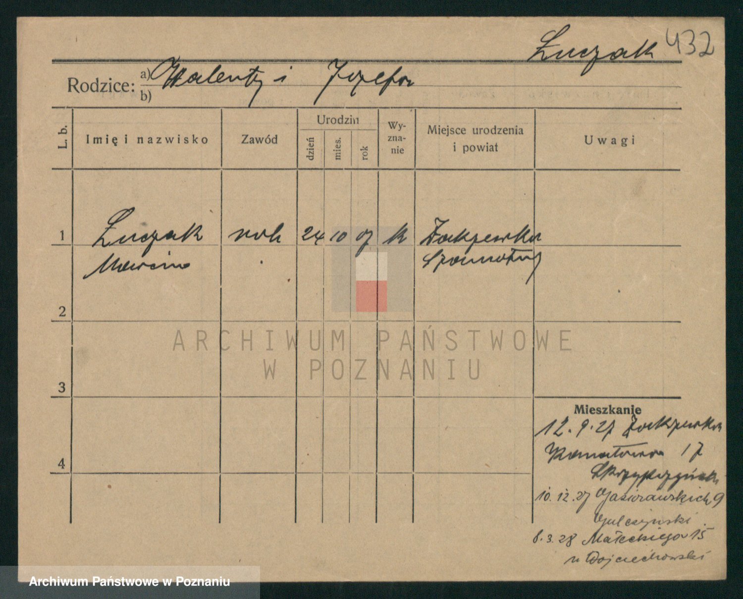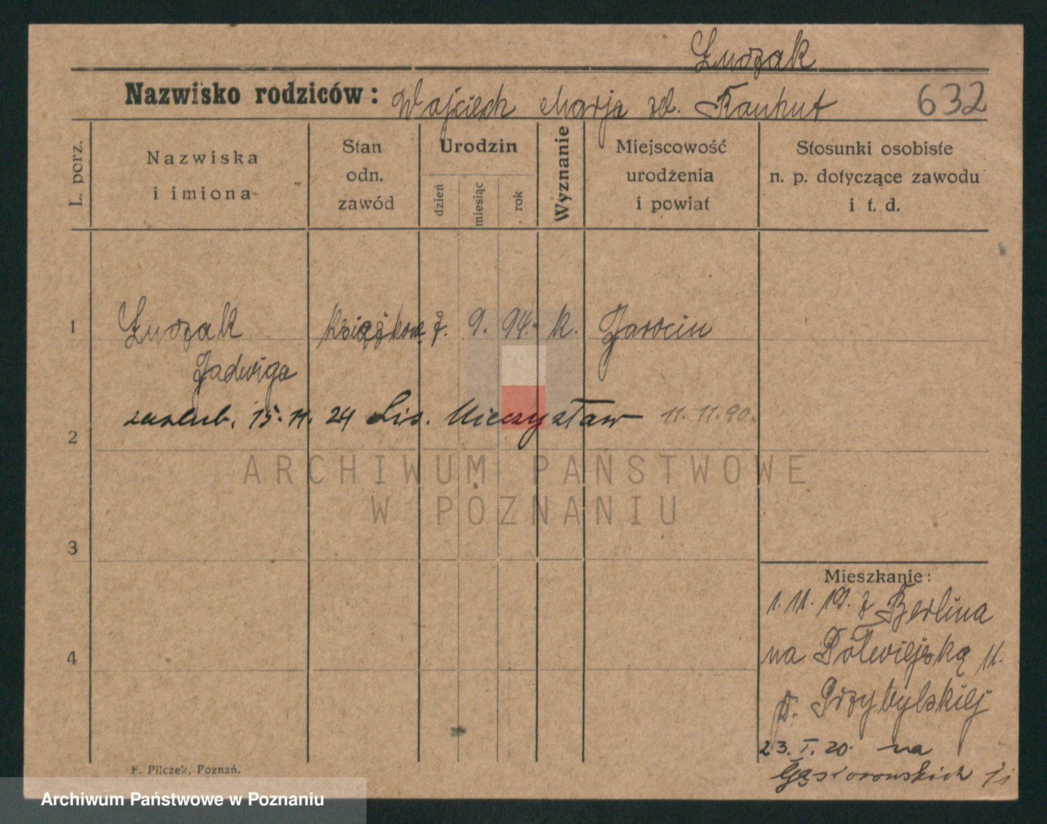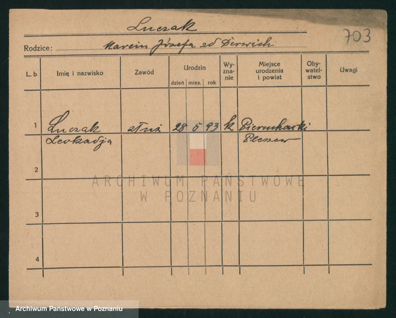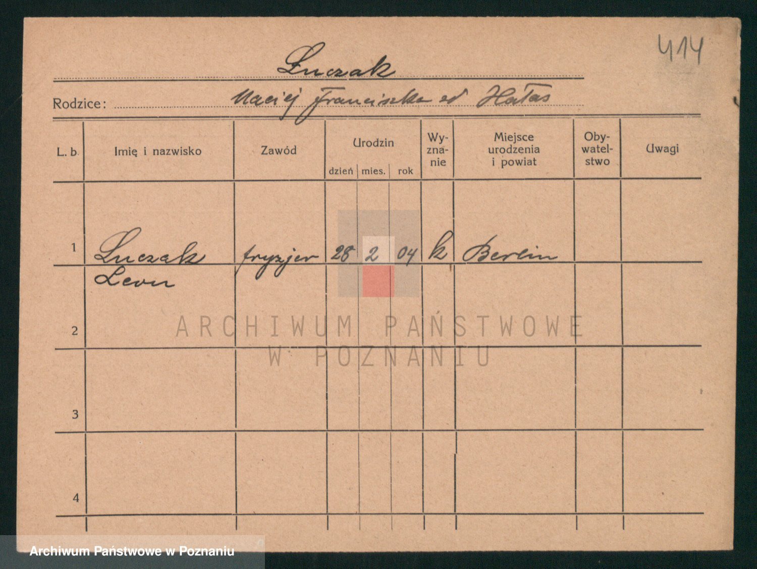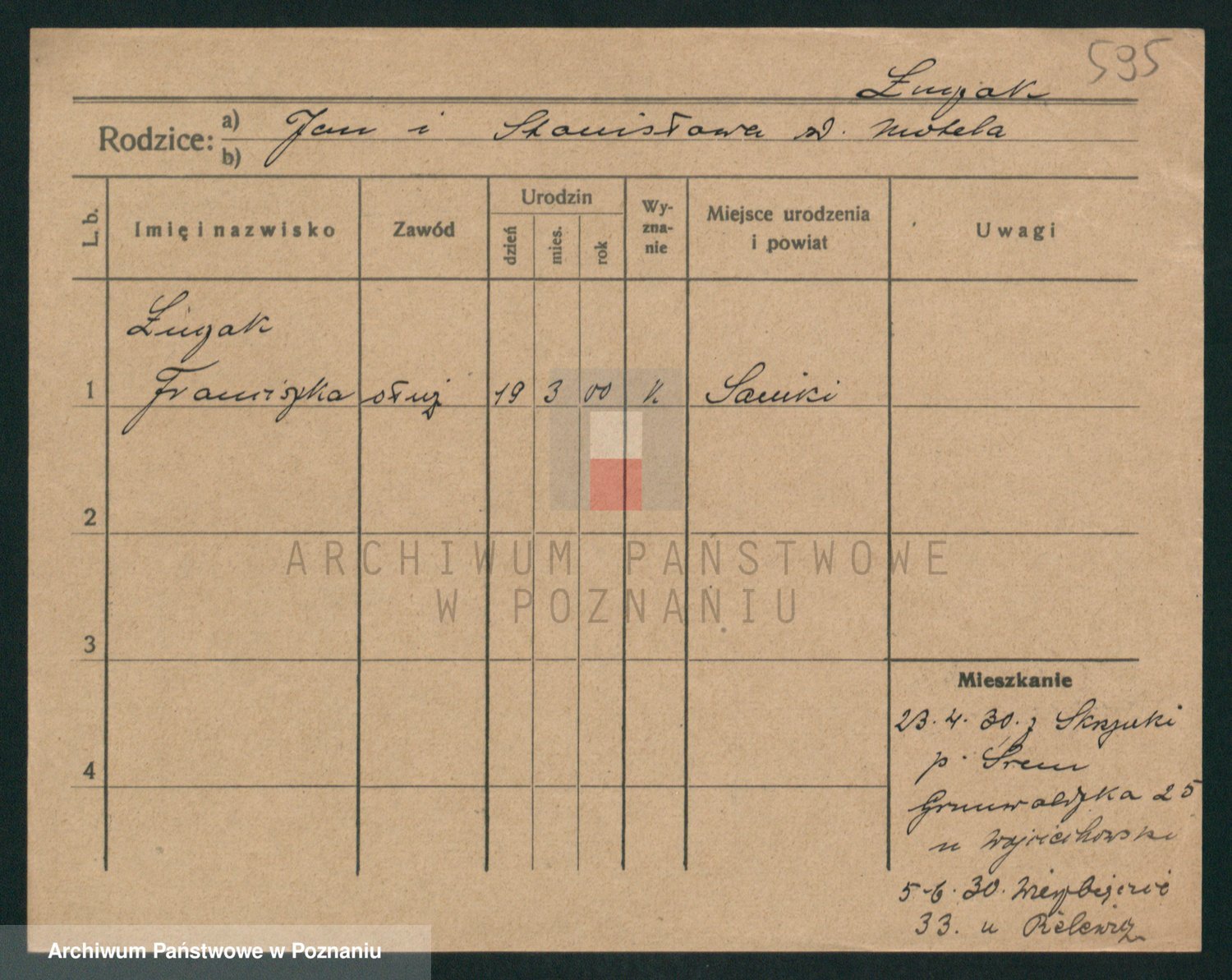 Podgląd karty osobowej dostępny jest po kliknięciu na nazwisko lub ikonkę karty. Można dokonywać powiększenia (ikony na górze) lub przechodzić między kolejnymi skanami (strzałki po bokach).