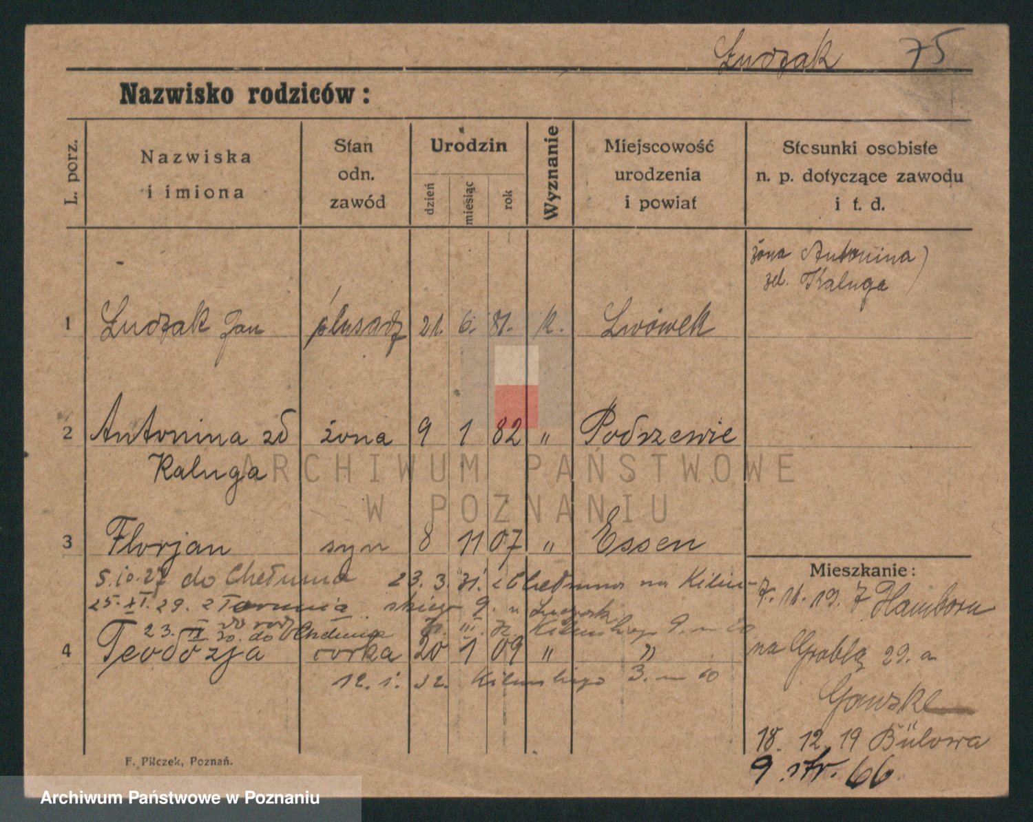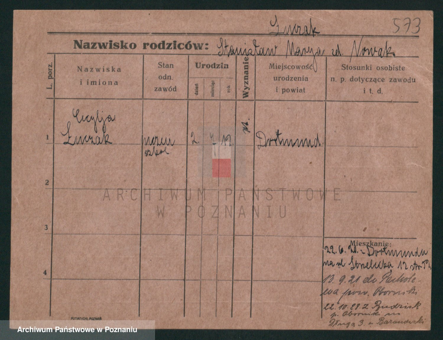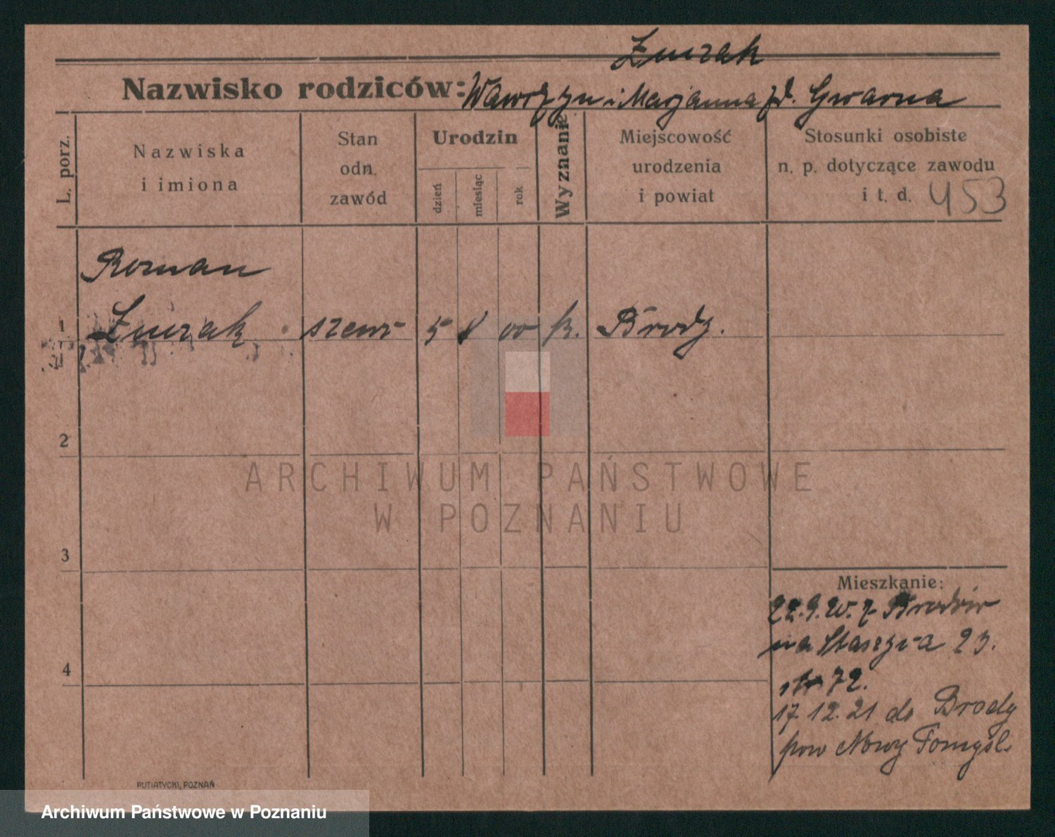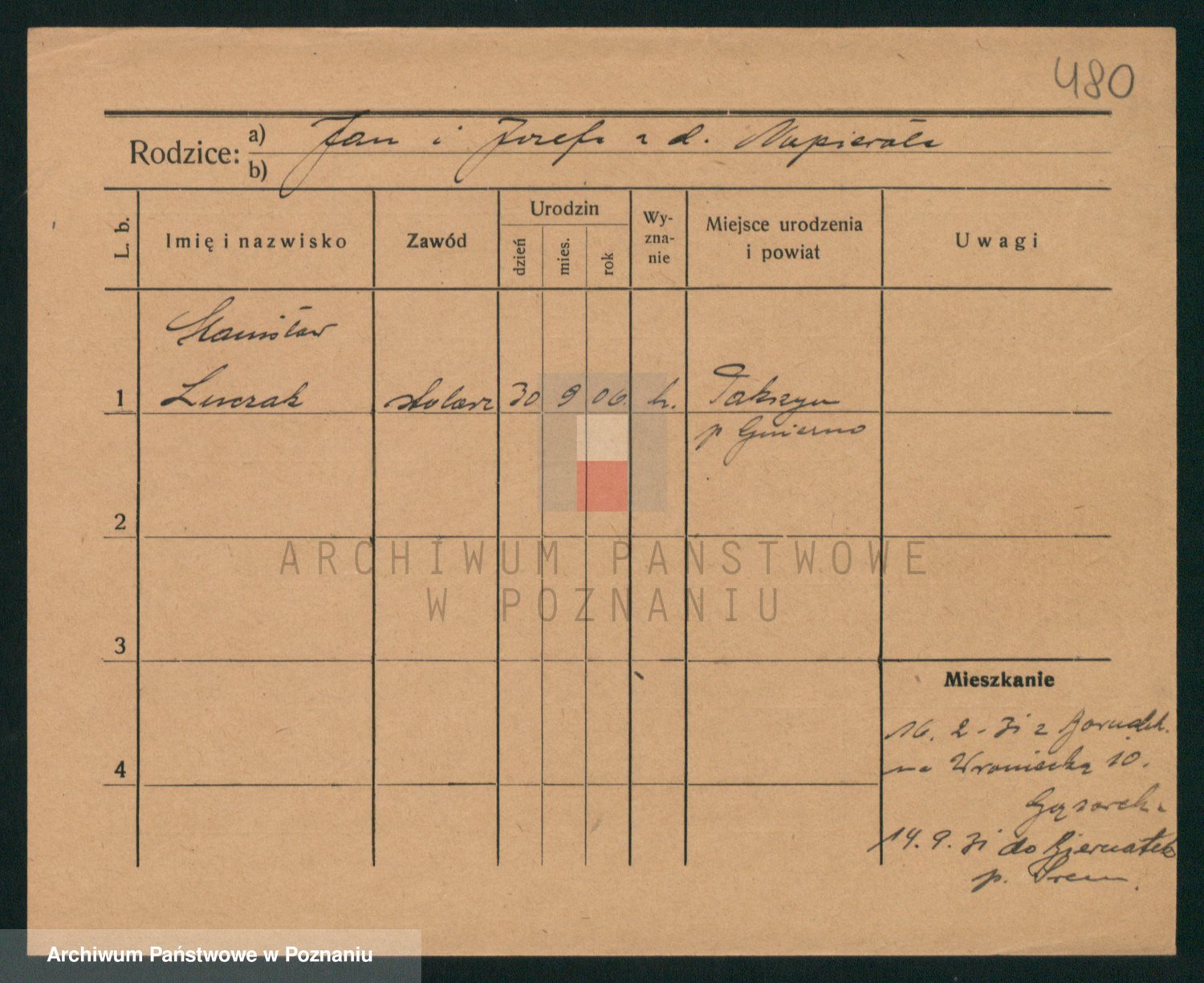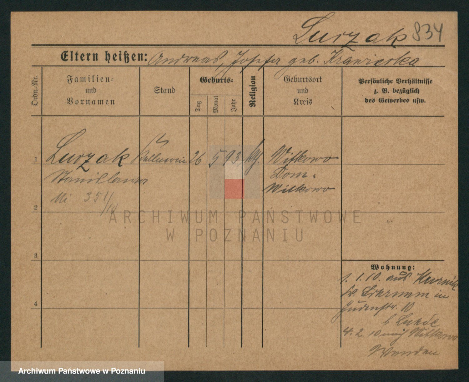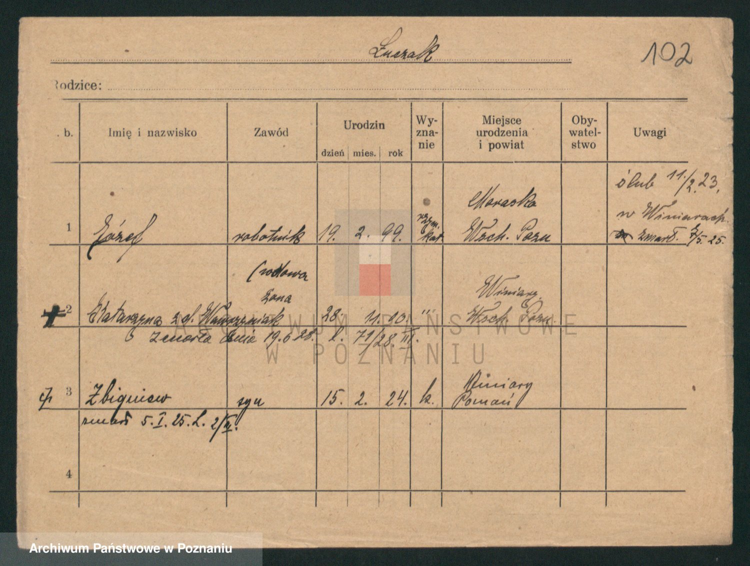 Podgląd karty osobowej dostępny jest po kliknięciu na nazwisko lub ikonkę karty. Można dokonywać powiększenia (ikony na górze) lub przechodzić między kolejnymi skanami (strzałki po bokach).