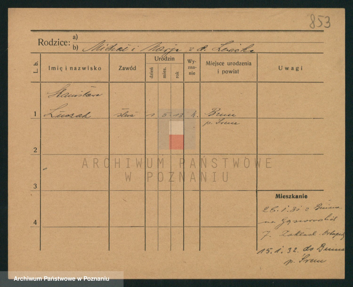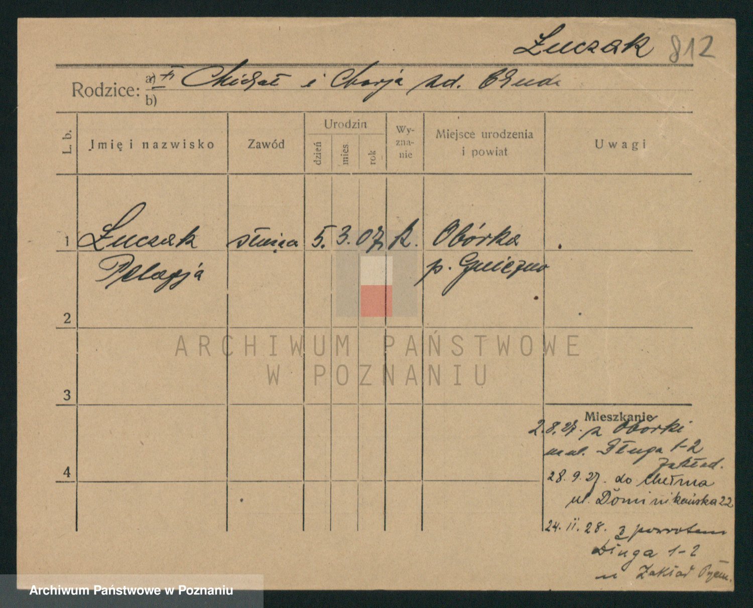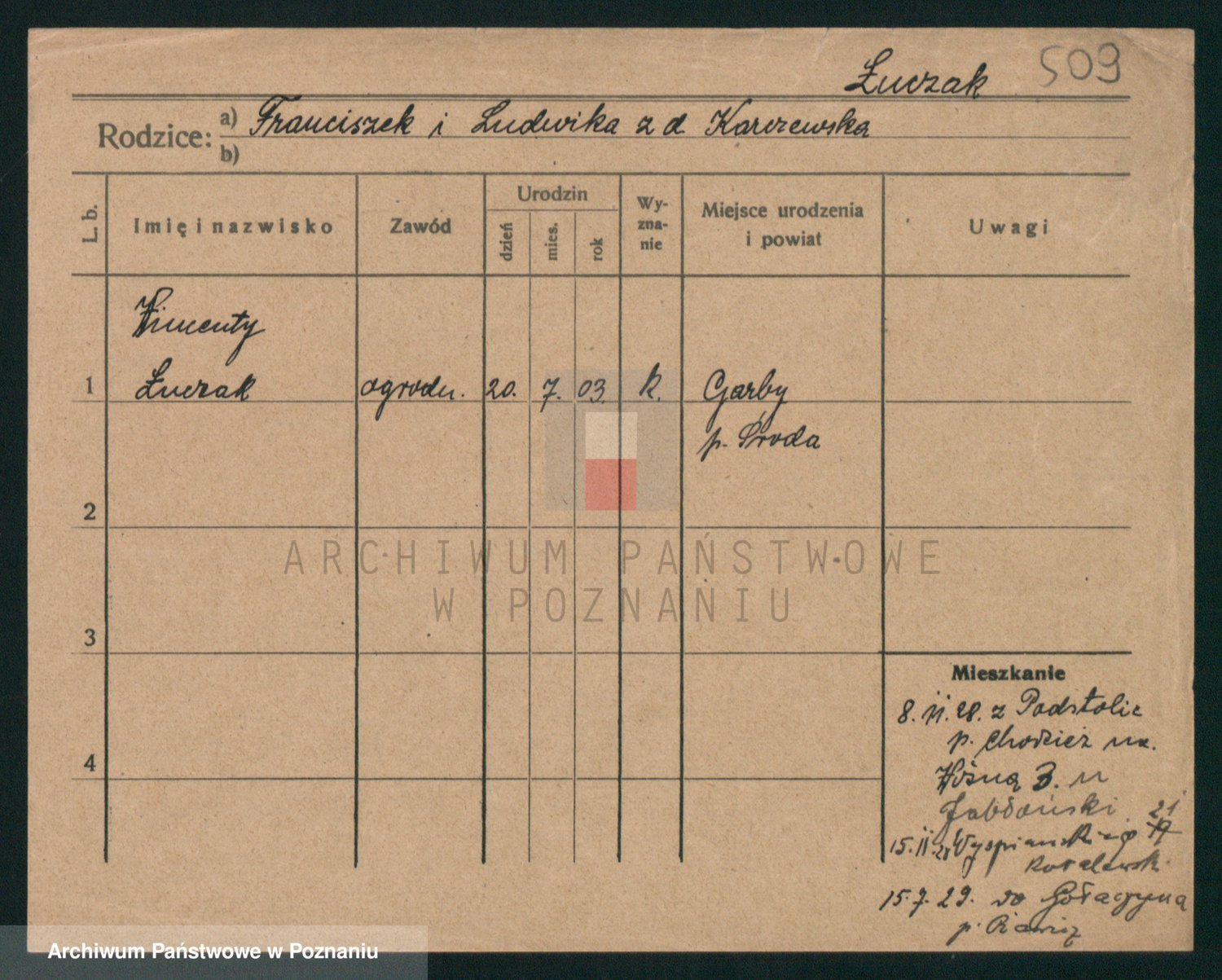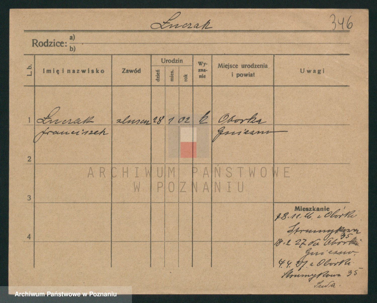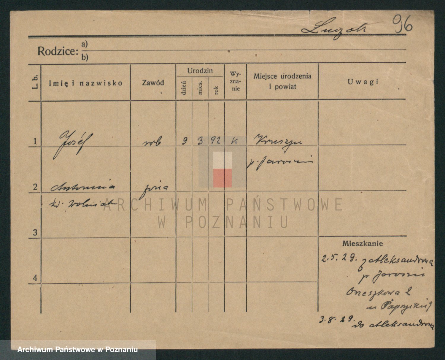 Podgląd karty osobowej dostępny jest po kliknięciu na nazwisko lub ikonkę karty. Można dokonywać powiększenia (ikony na górze) lub przechodzić między kolejnymi skanami (strzałki po bokach).