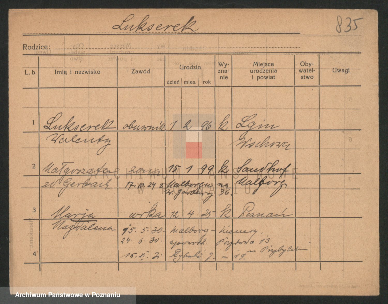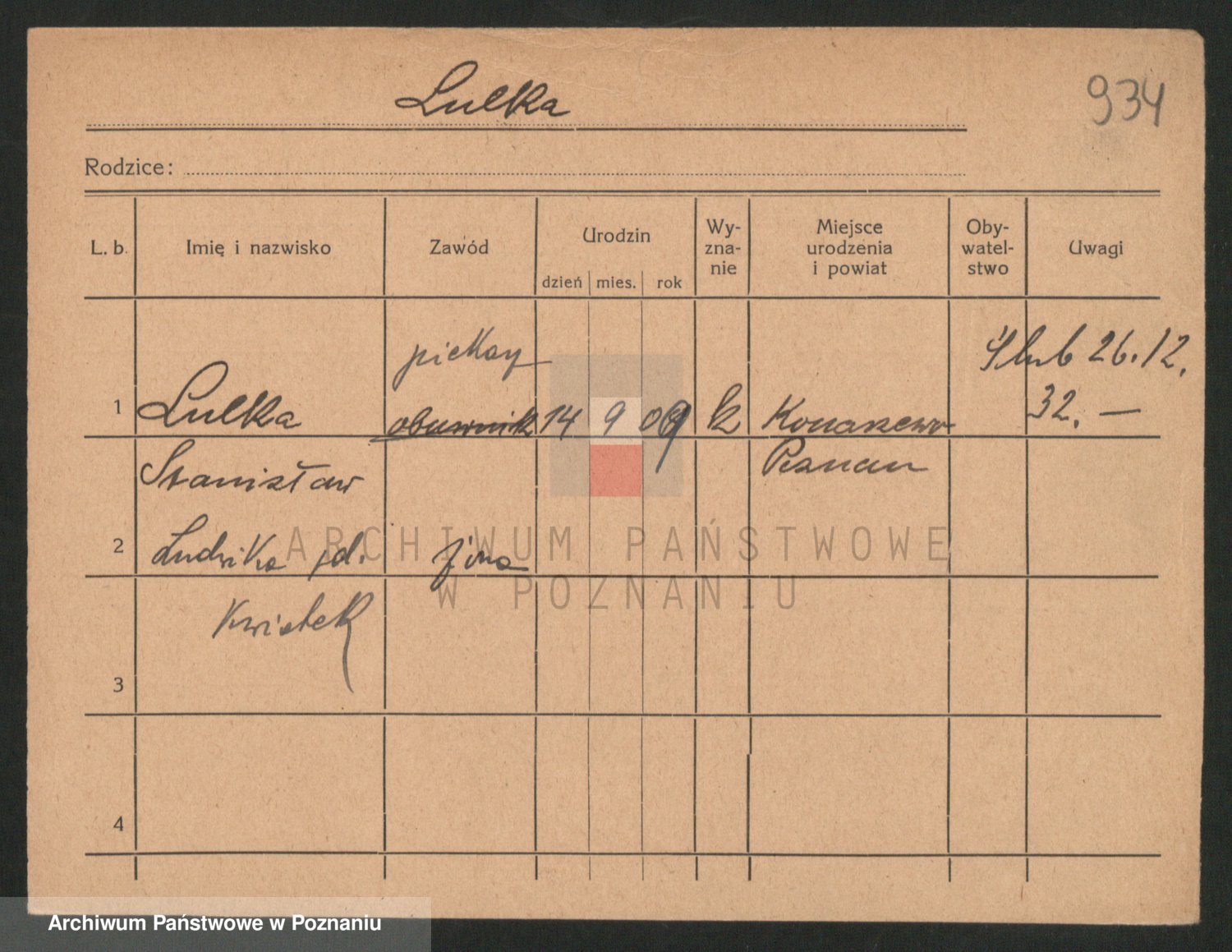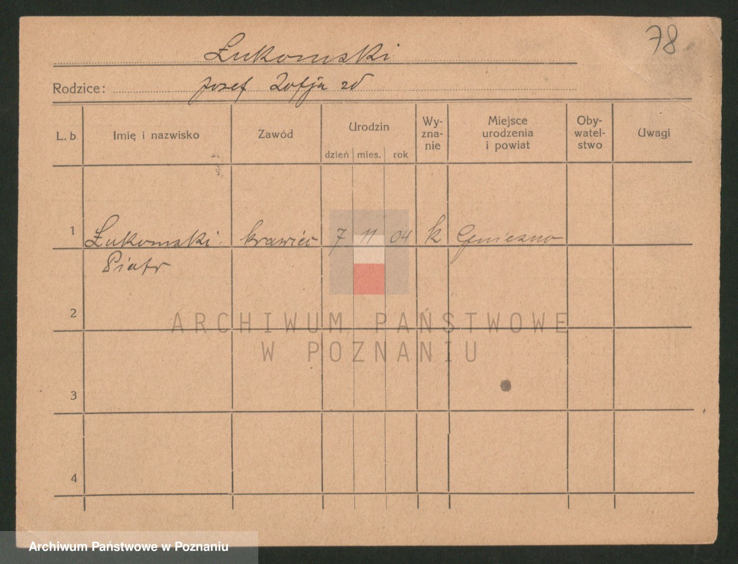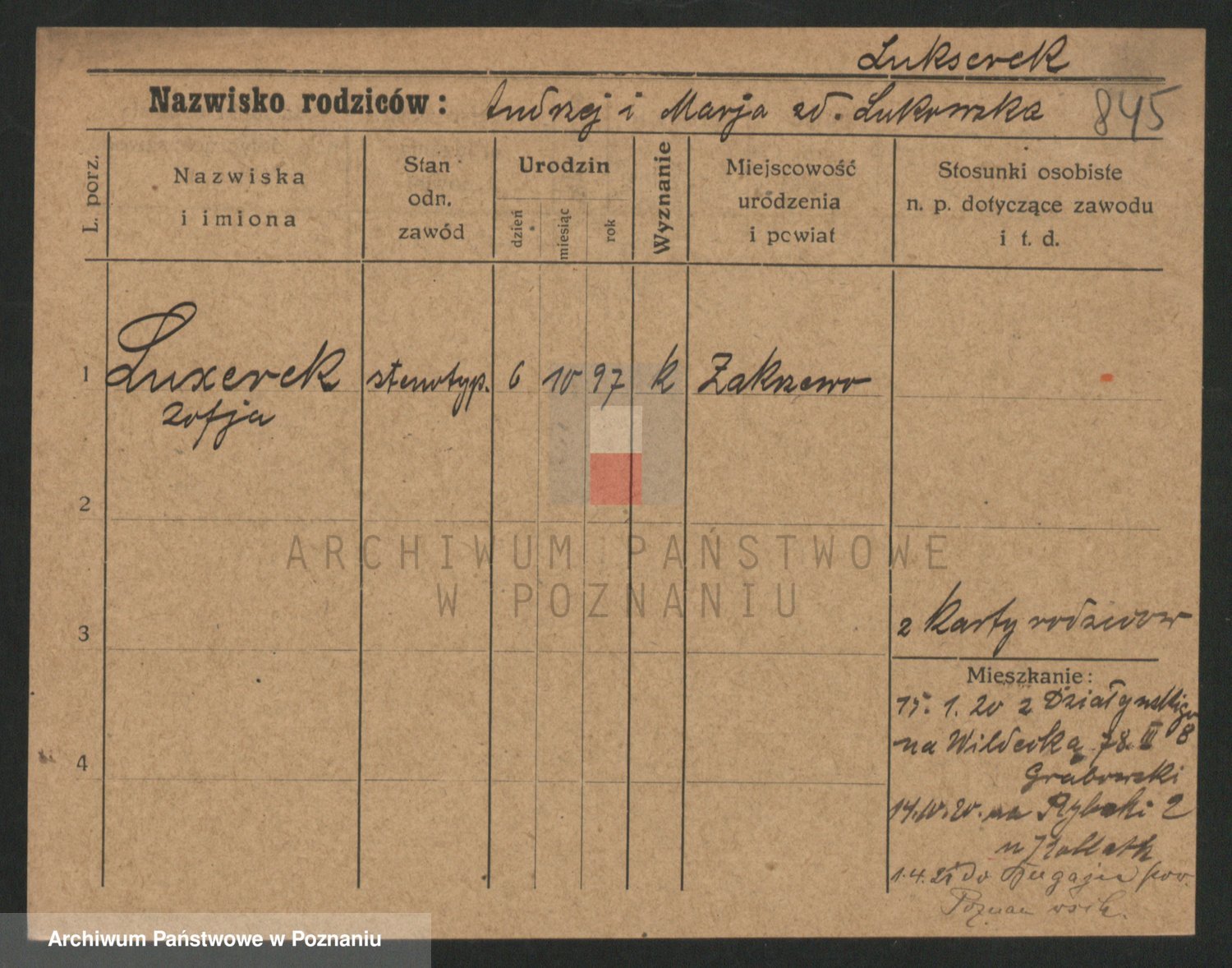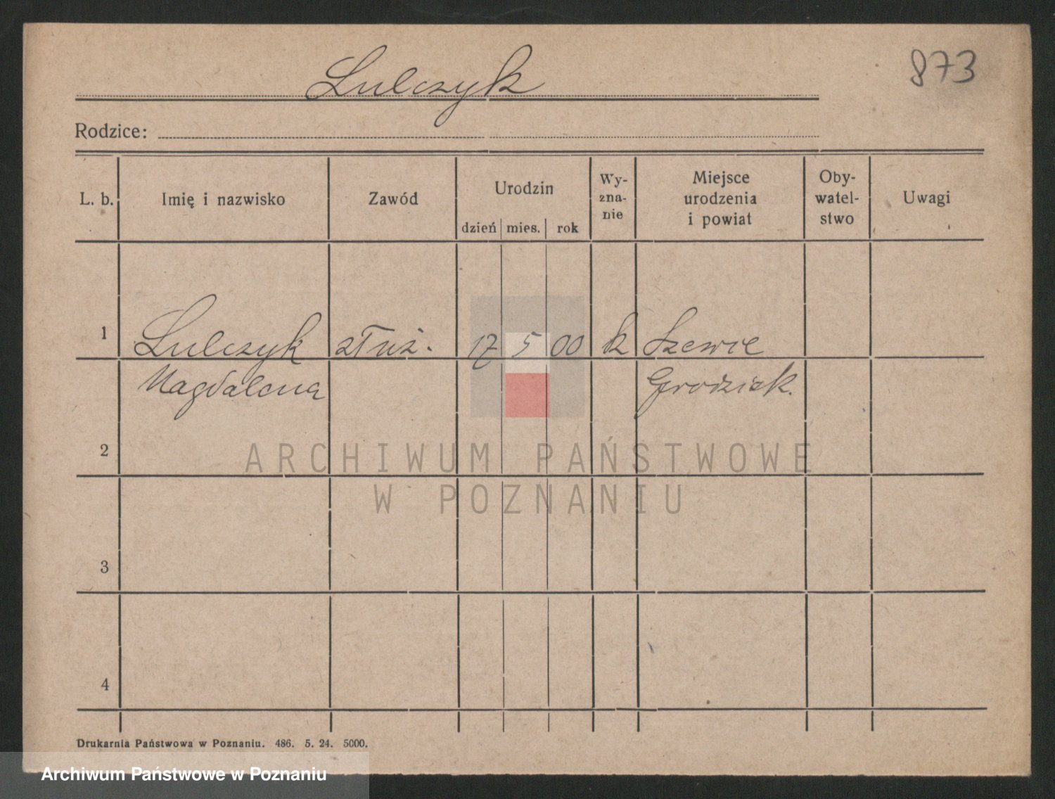 Podgląd karty osobowej dostępny jest po kliknięciu na nazwisko lub ikonkę karty. Można dokonywać powiększenia (ikony na górze) lub przechodzić między kolejnymi skanami (strzałki po bokach).