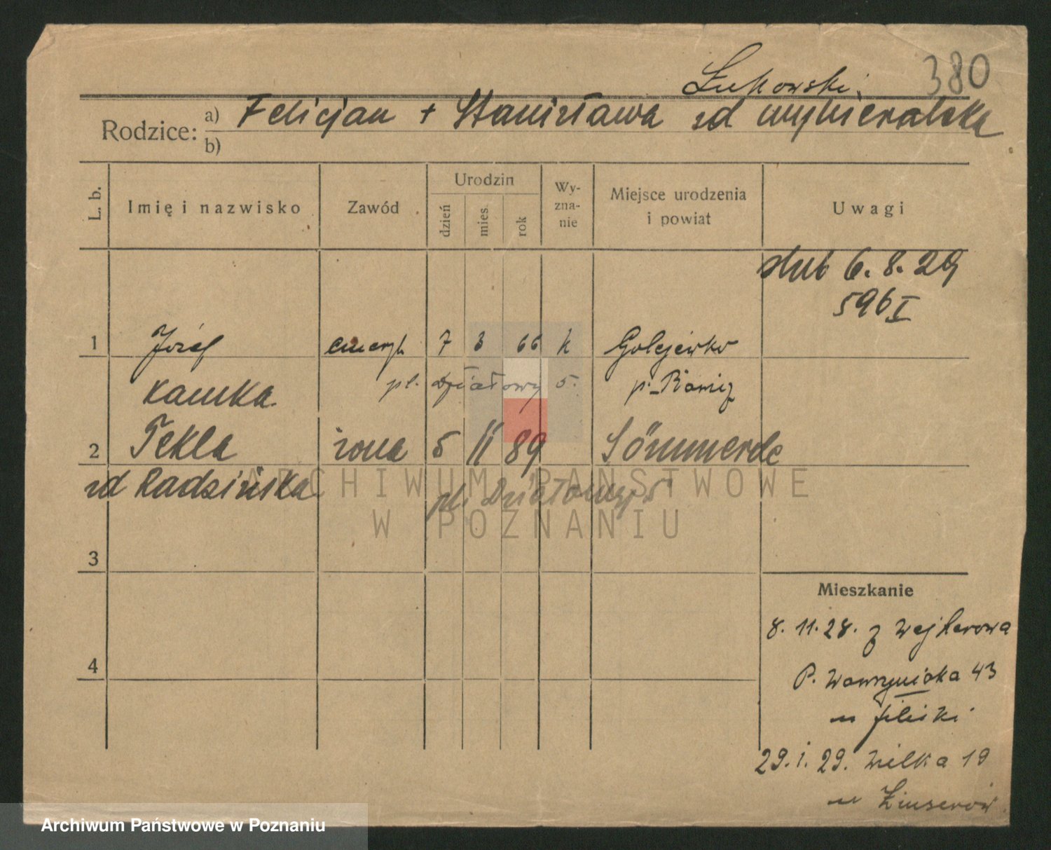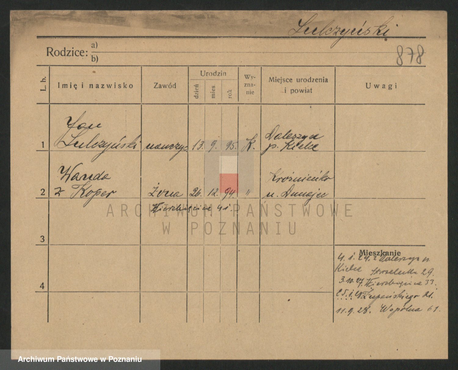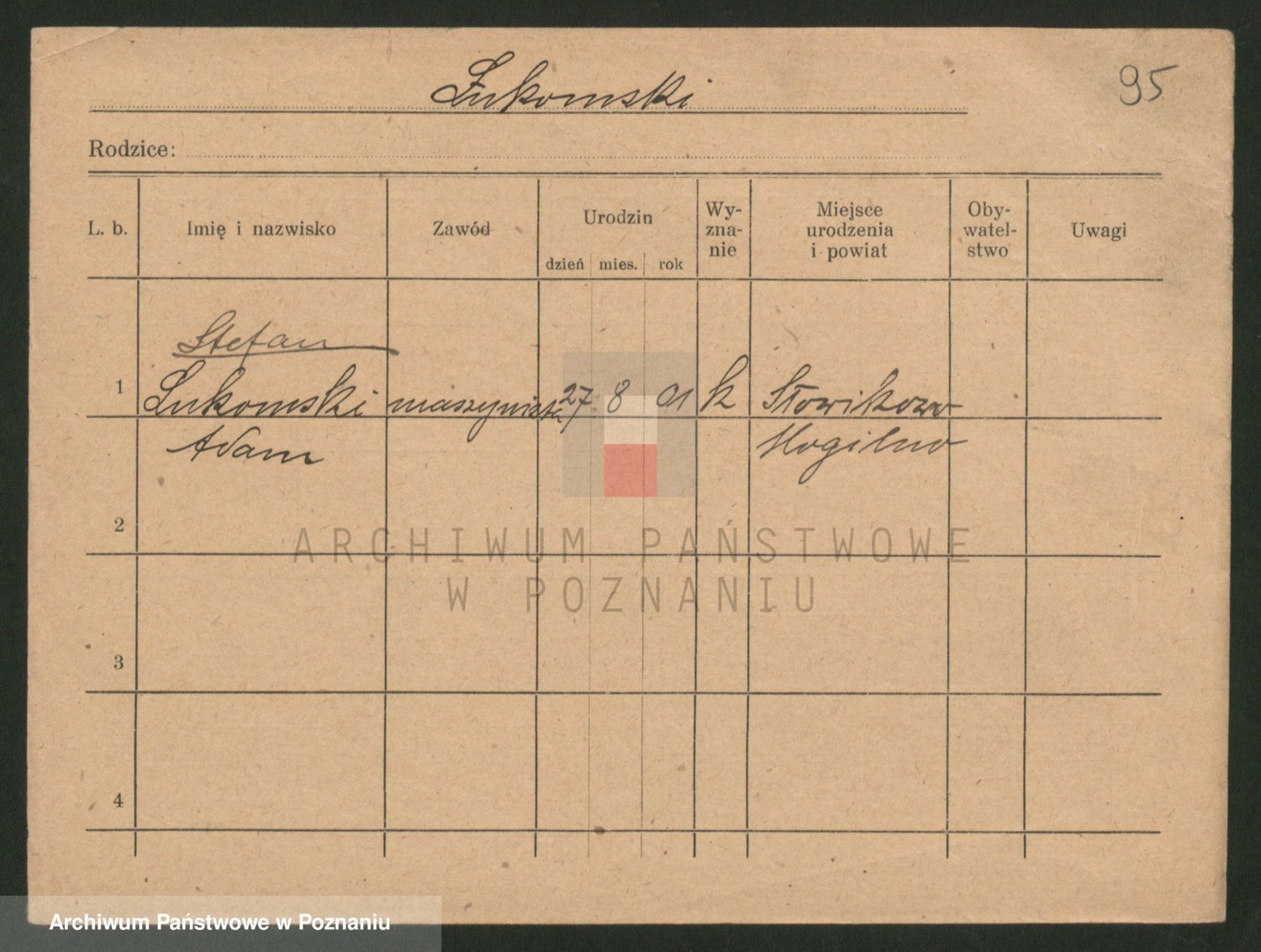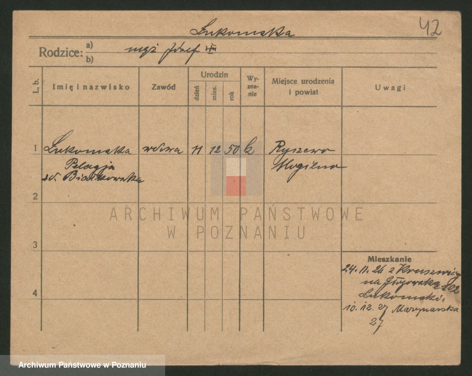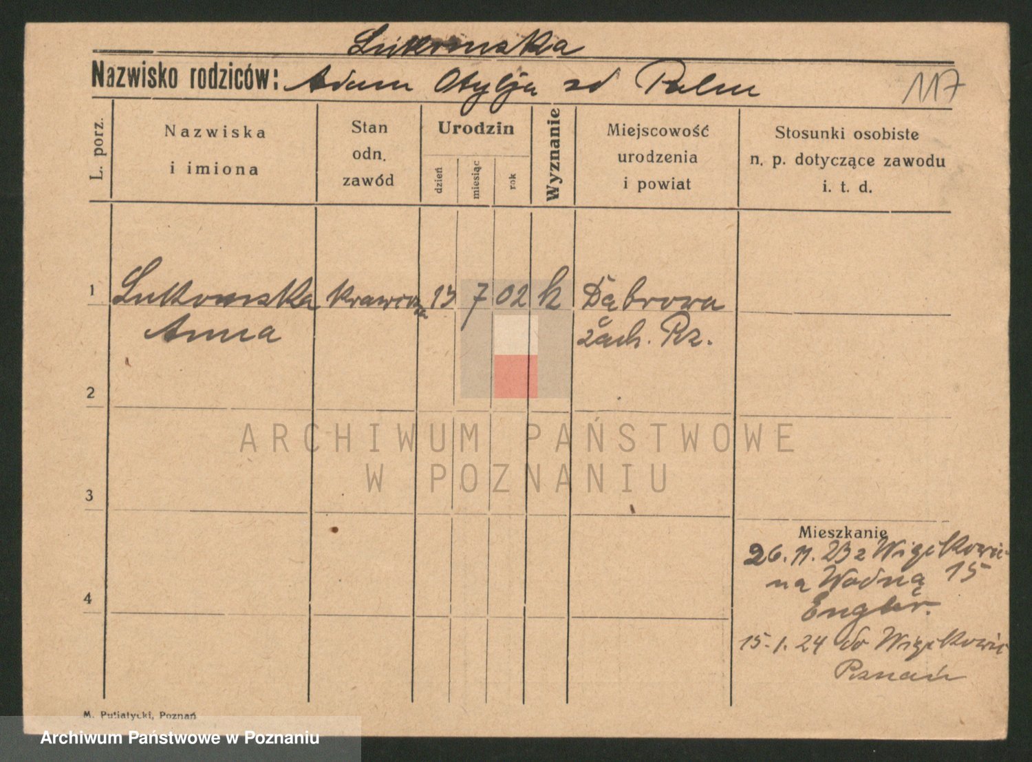 Podgląd karty osobowej dostępny jest po kliknięciu na nazwisko lub ikonkę karty. Można dokonywać powiększenia (ikony na górze) lub przechodzić między kolejnymi skanami (strzałki po bokach).