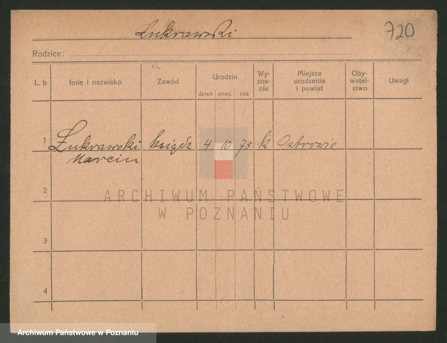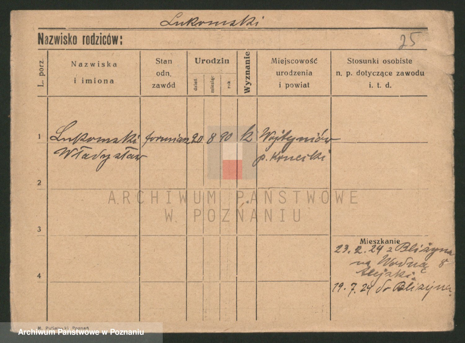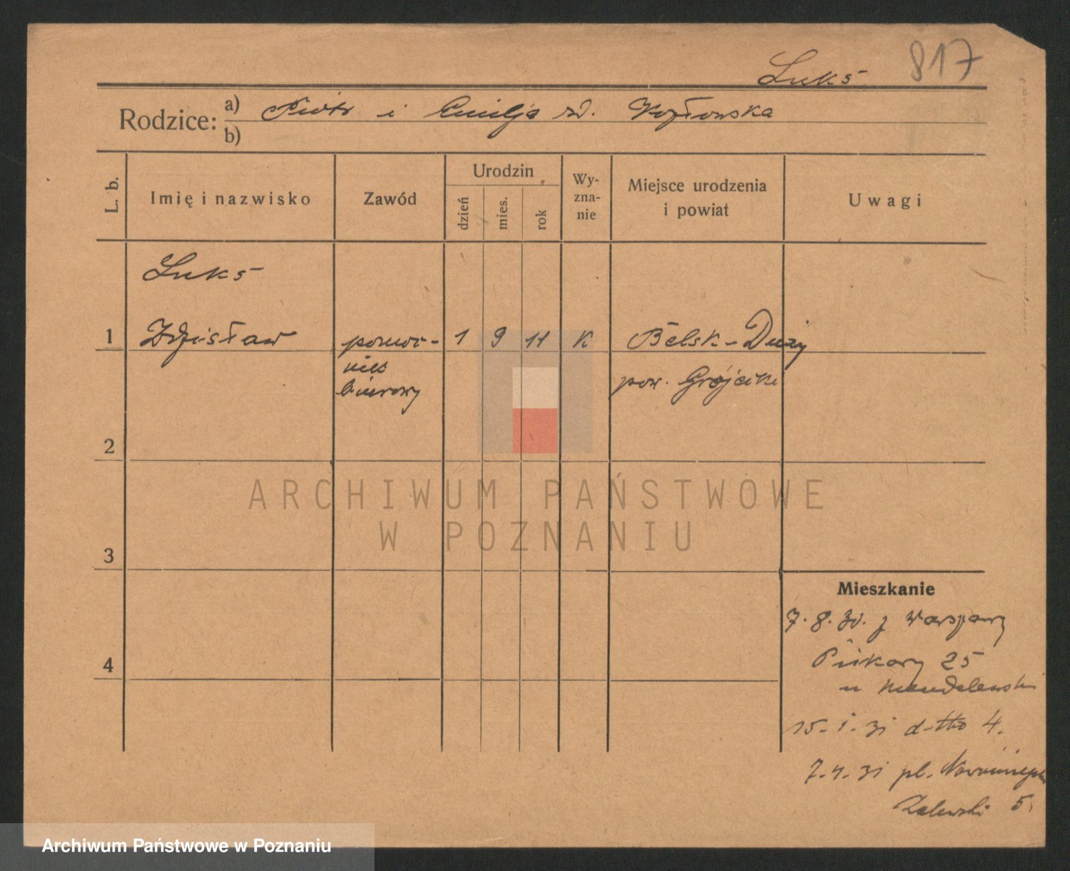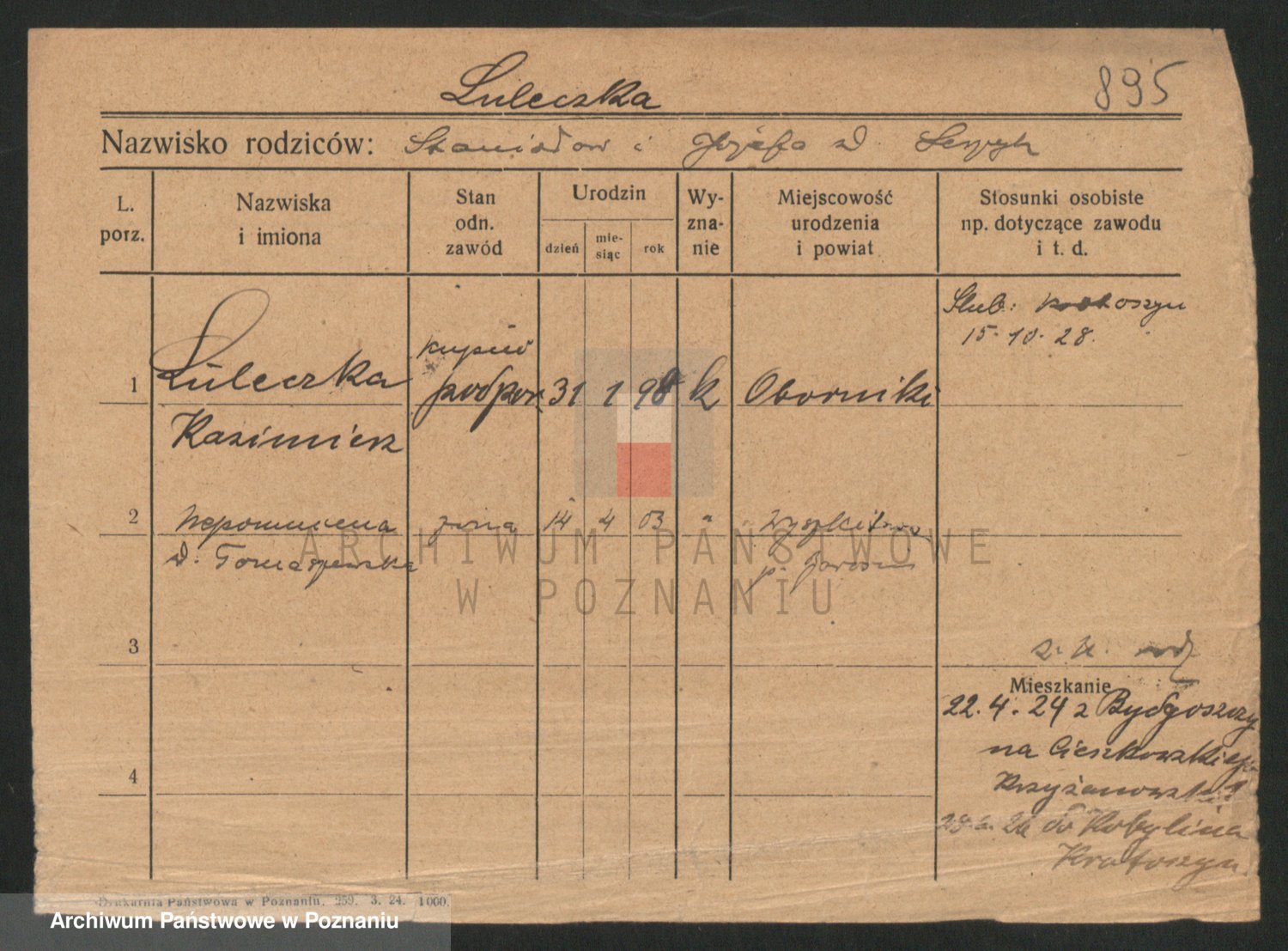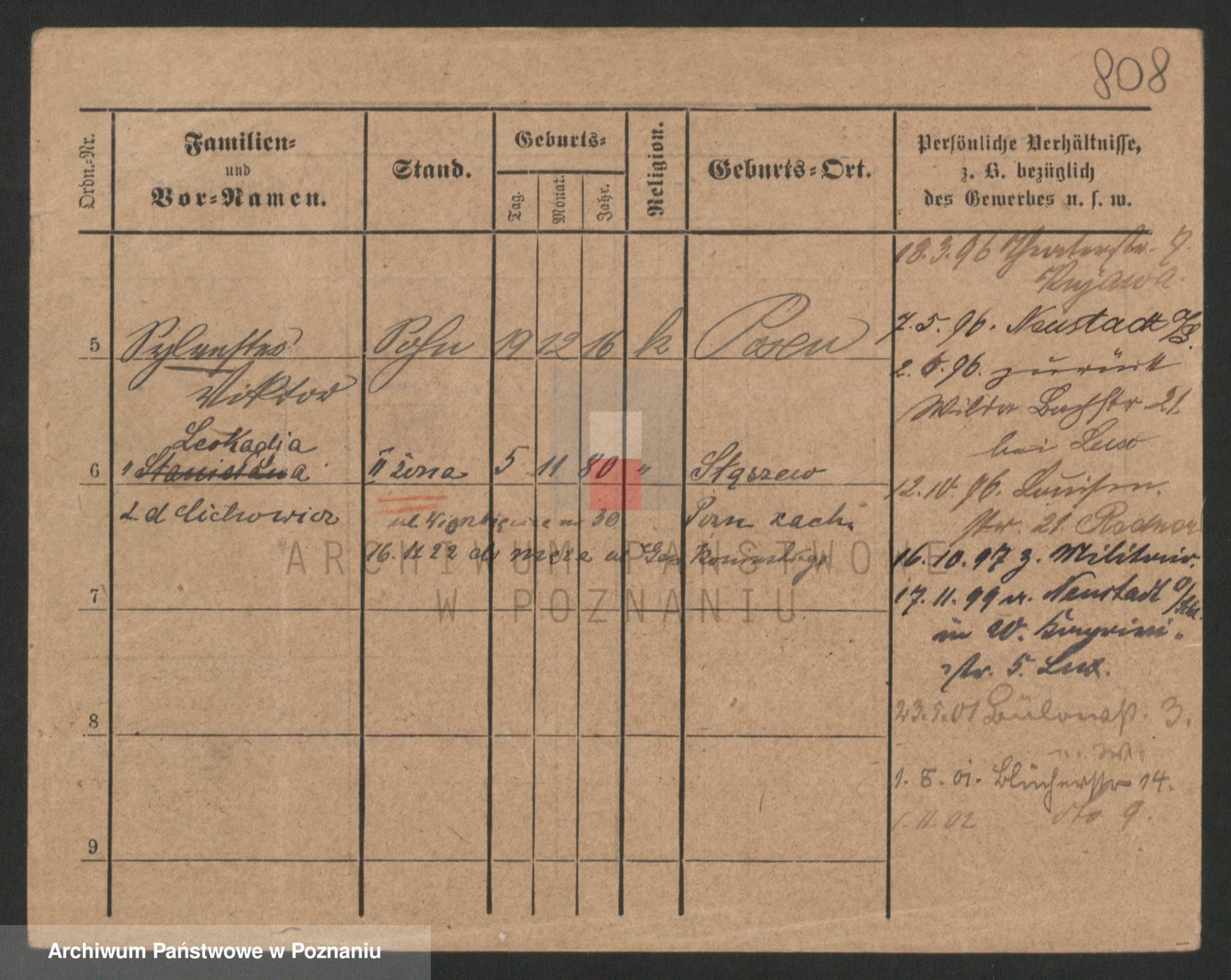 Podgląd karty osobowej dostępny jest po kliknięciu na nazwisko lub ikonkę karty. Można dokonywać powiększenia (ikony na górze) lub przechodzić między kolejnymi skanami (strzałki po bokach).