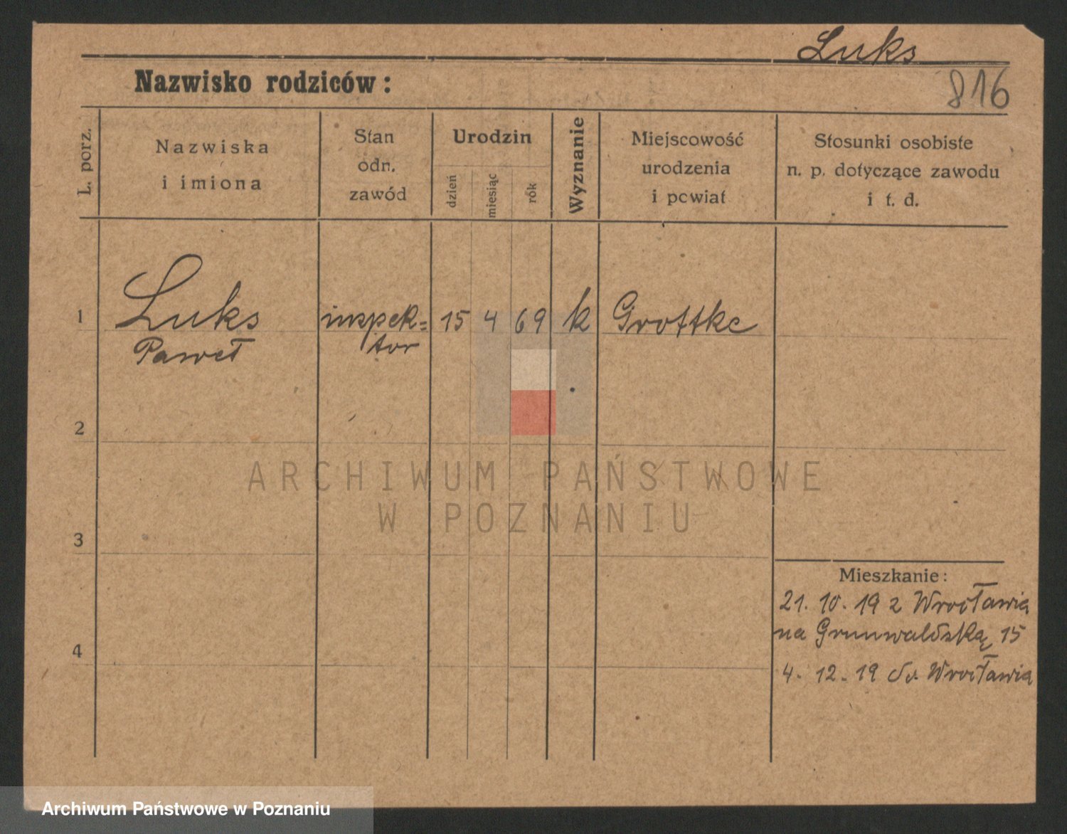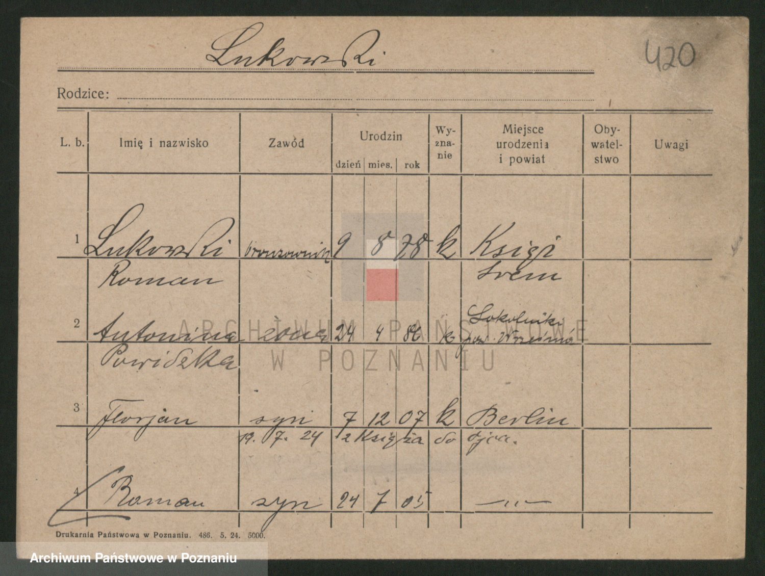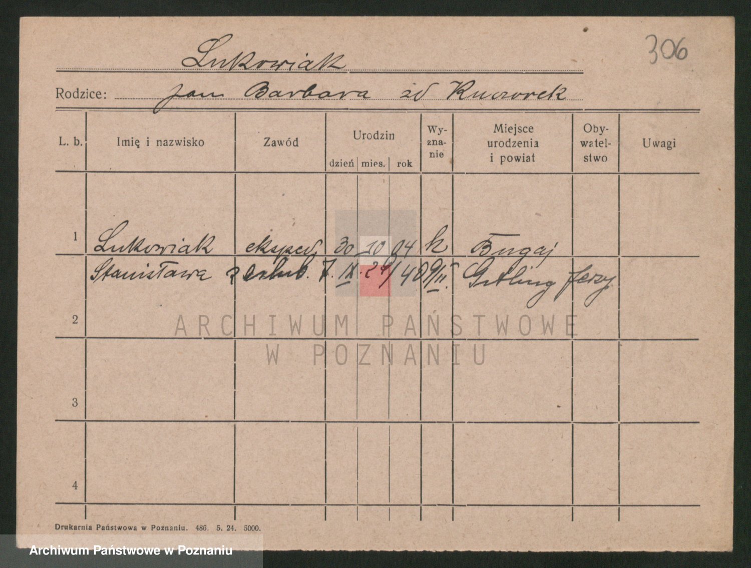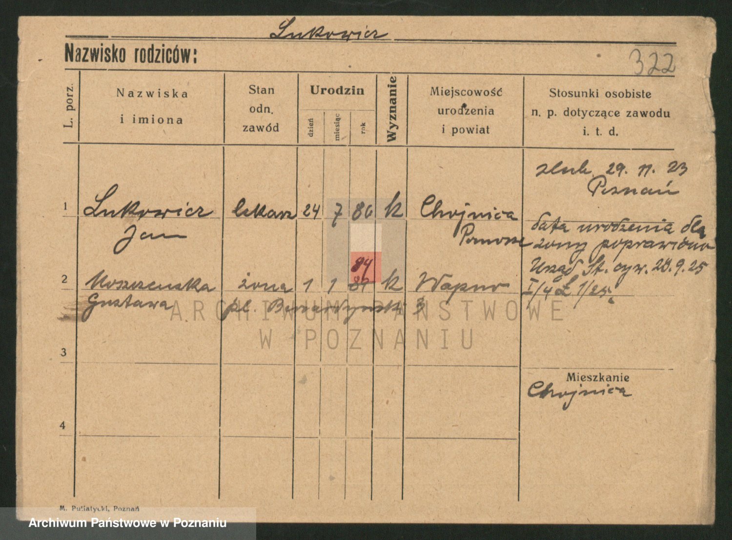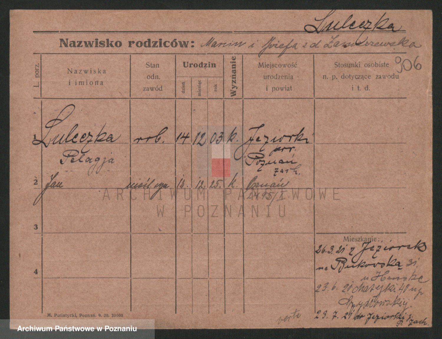 Podgląd karty osobowej dostępny jest po kliknięciu na nazwisko lub ikonkę karty. Można dokonywać powiększenia (ikony na górze) lub przechodzić między kolejnymi skanami (strzałki po bokach).