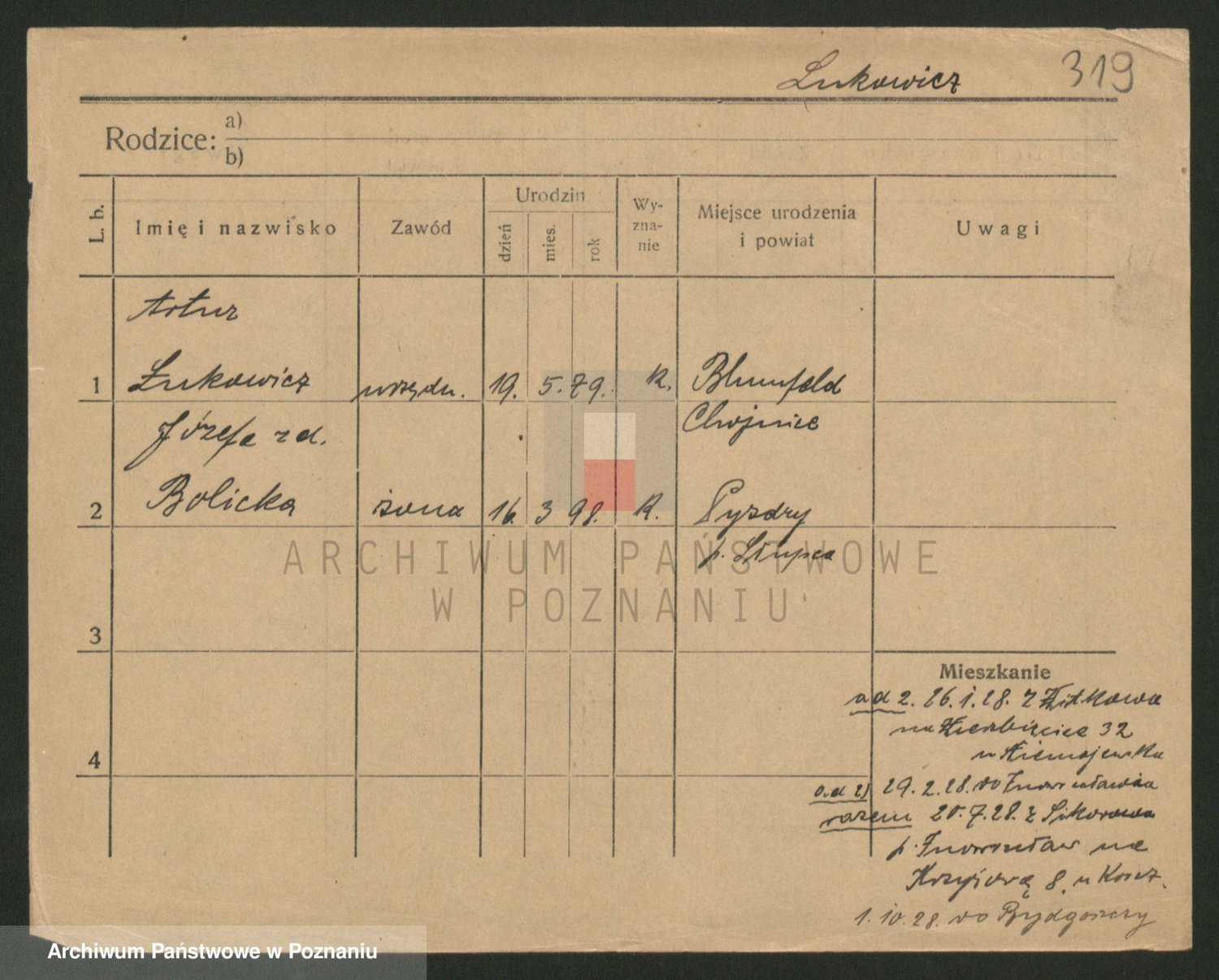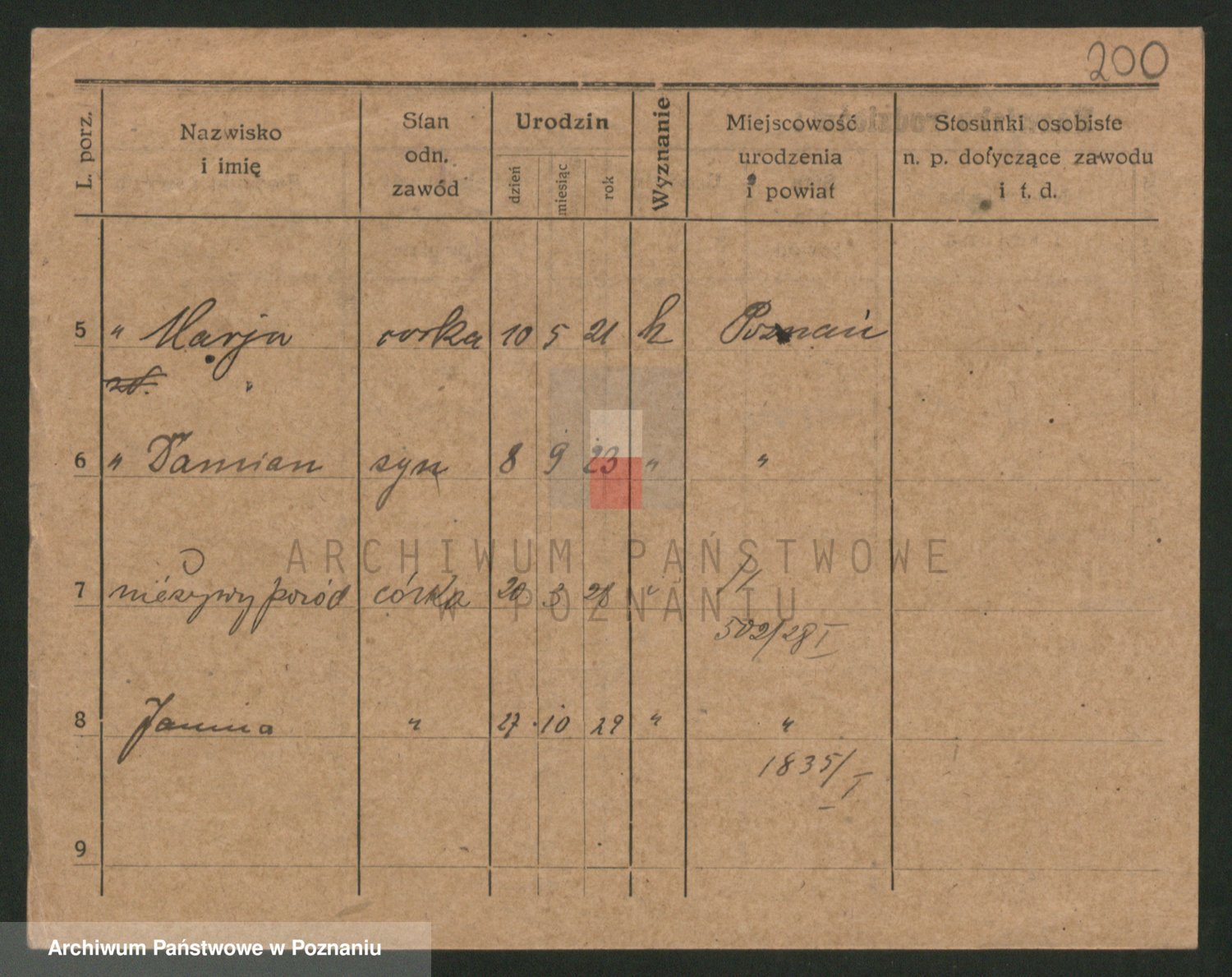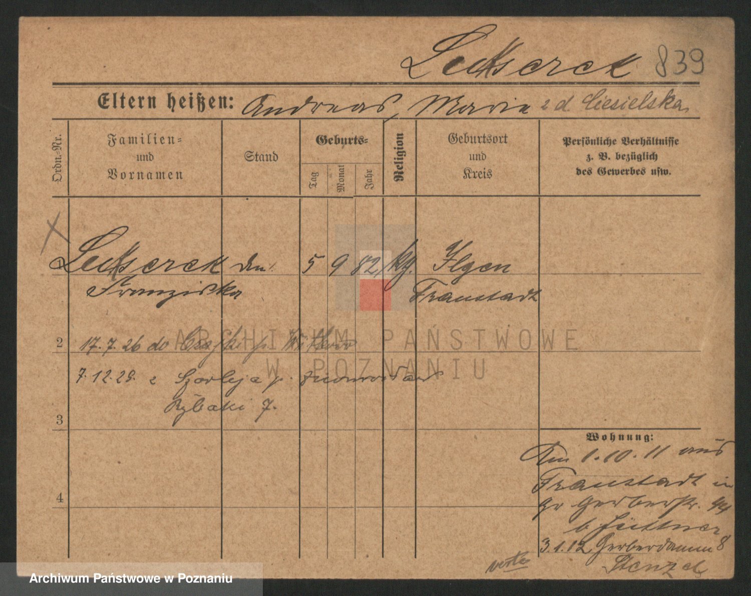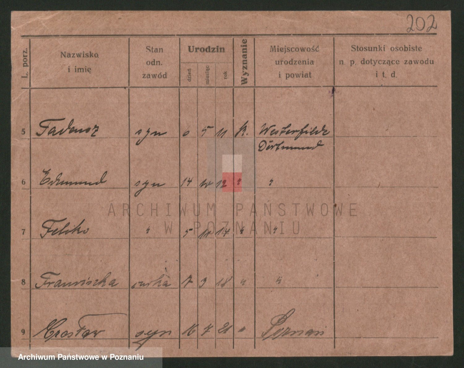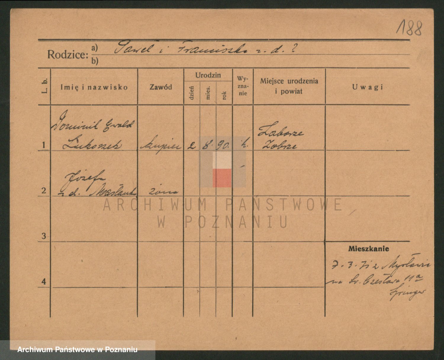 Podgląd karty osobowej dostępny jest po kliknięciu na nazwisko lub ikonkę karty. Można dokonywać powiększenia (ikony na górze) lub przechodzić między kolejnymi skanami (strzałki po bokach).