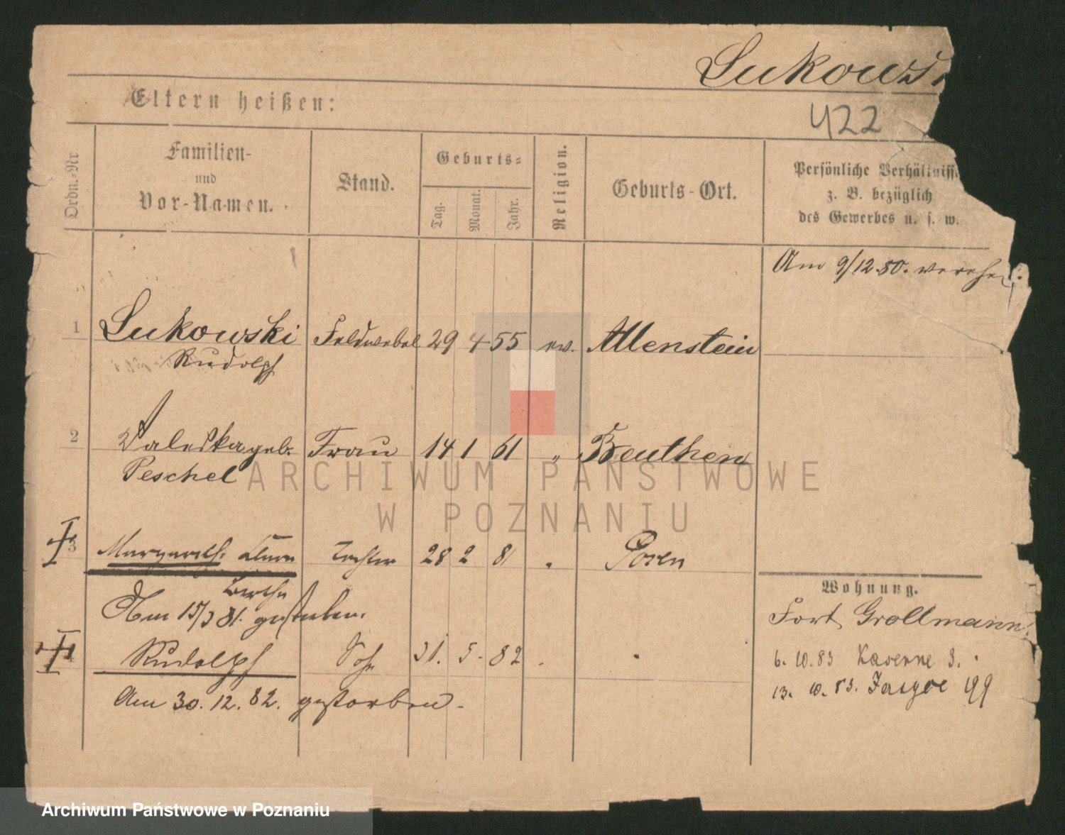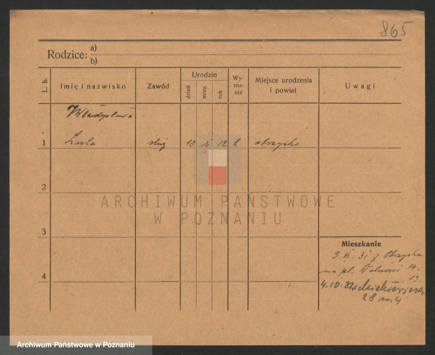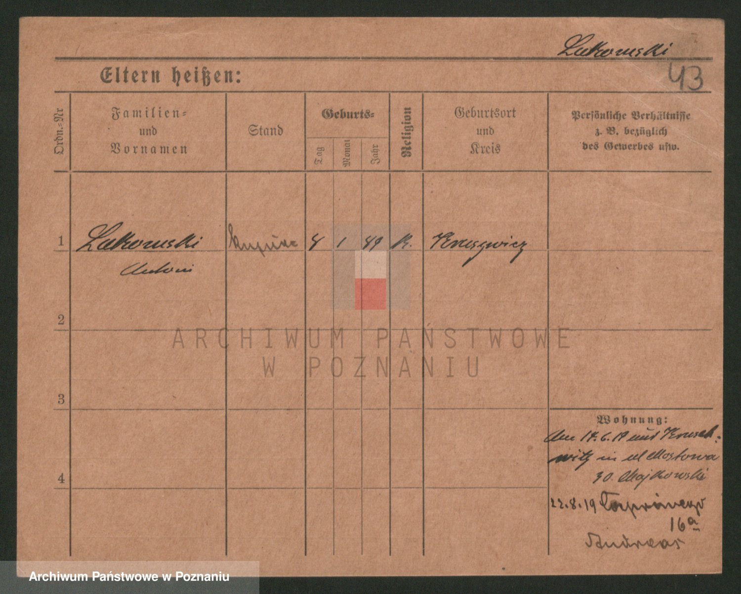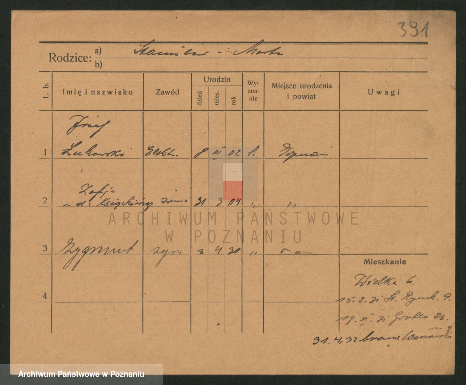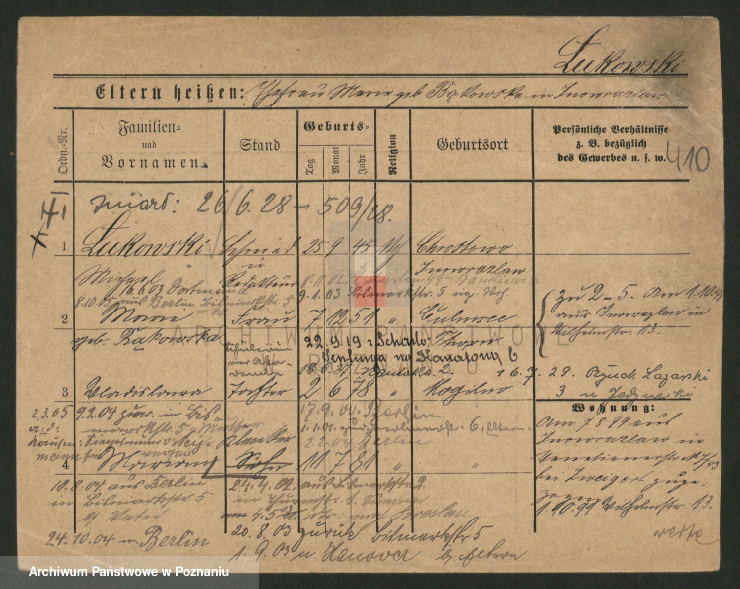 Podgląd karty osobowej dostępny jest po kliknięciu na nazwisko lub ikonkę karty. Można dokonywać powiększenia (ikony na górze) lub przechodzić między kolejnymi skanami (strzałki po bokach).