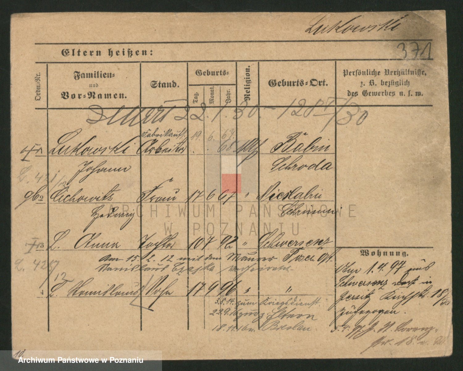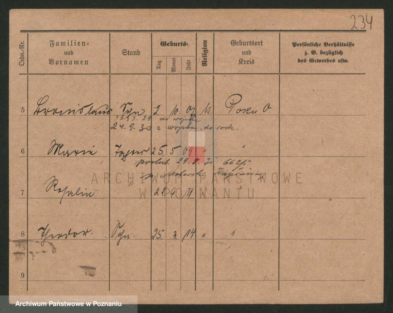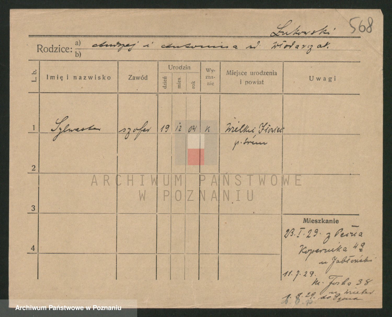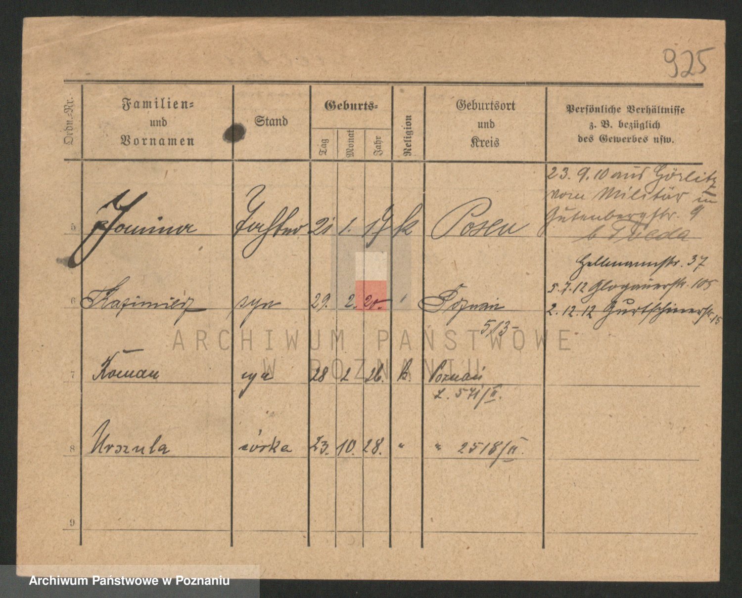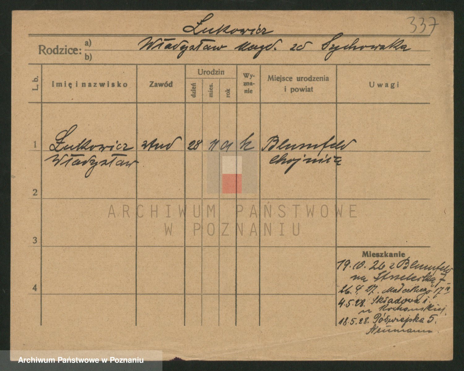 Podgląd karty osobowej dostępny jest po kliknięciu na nazwisko lub ikonkę karty. Można dokonywać powiększenia (ikony na górze) lub przechodzić między kolejnymi skanami (strzałki po bokach).