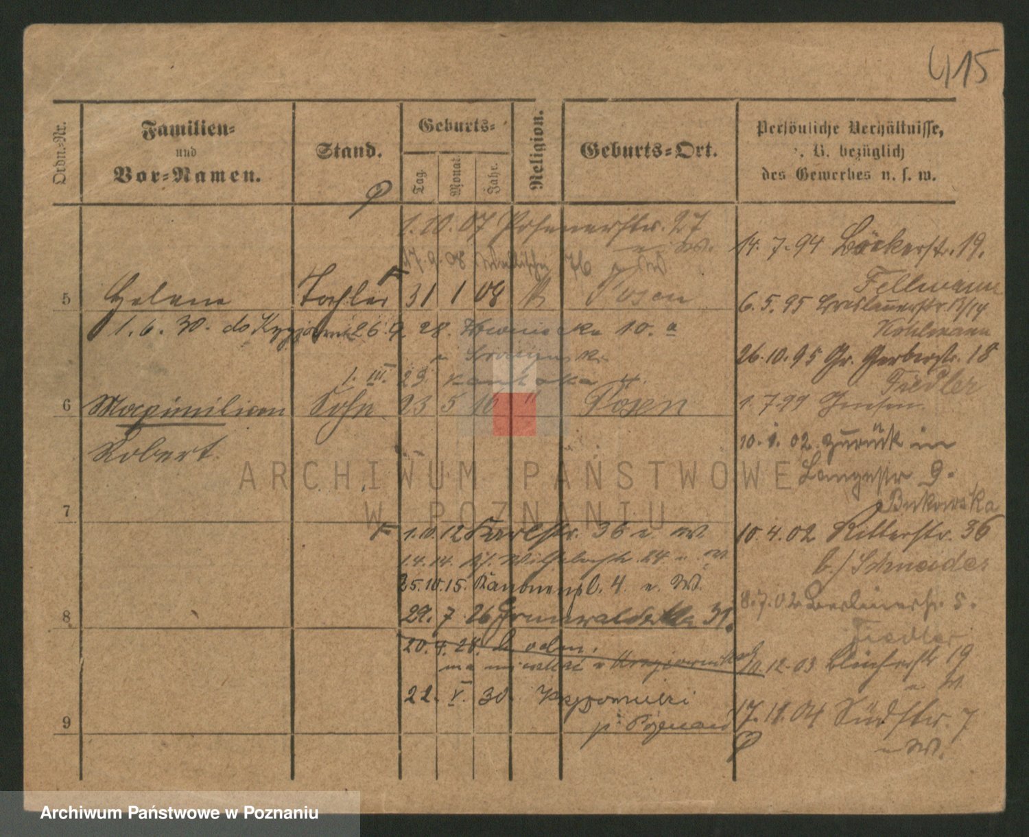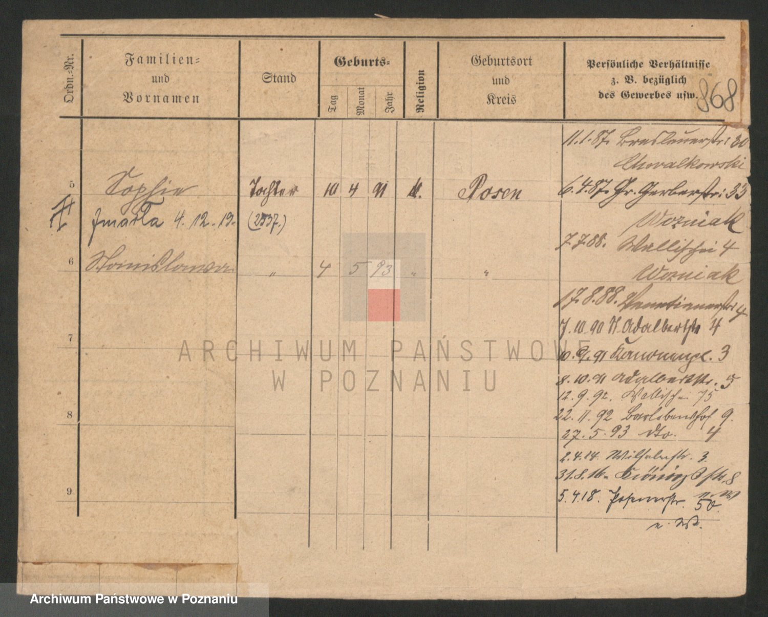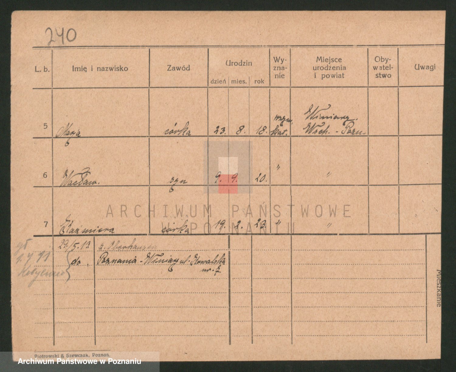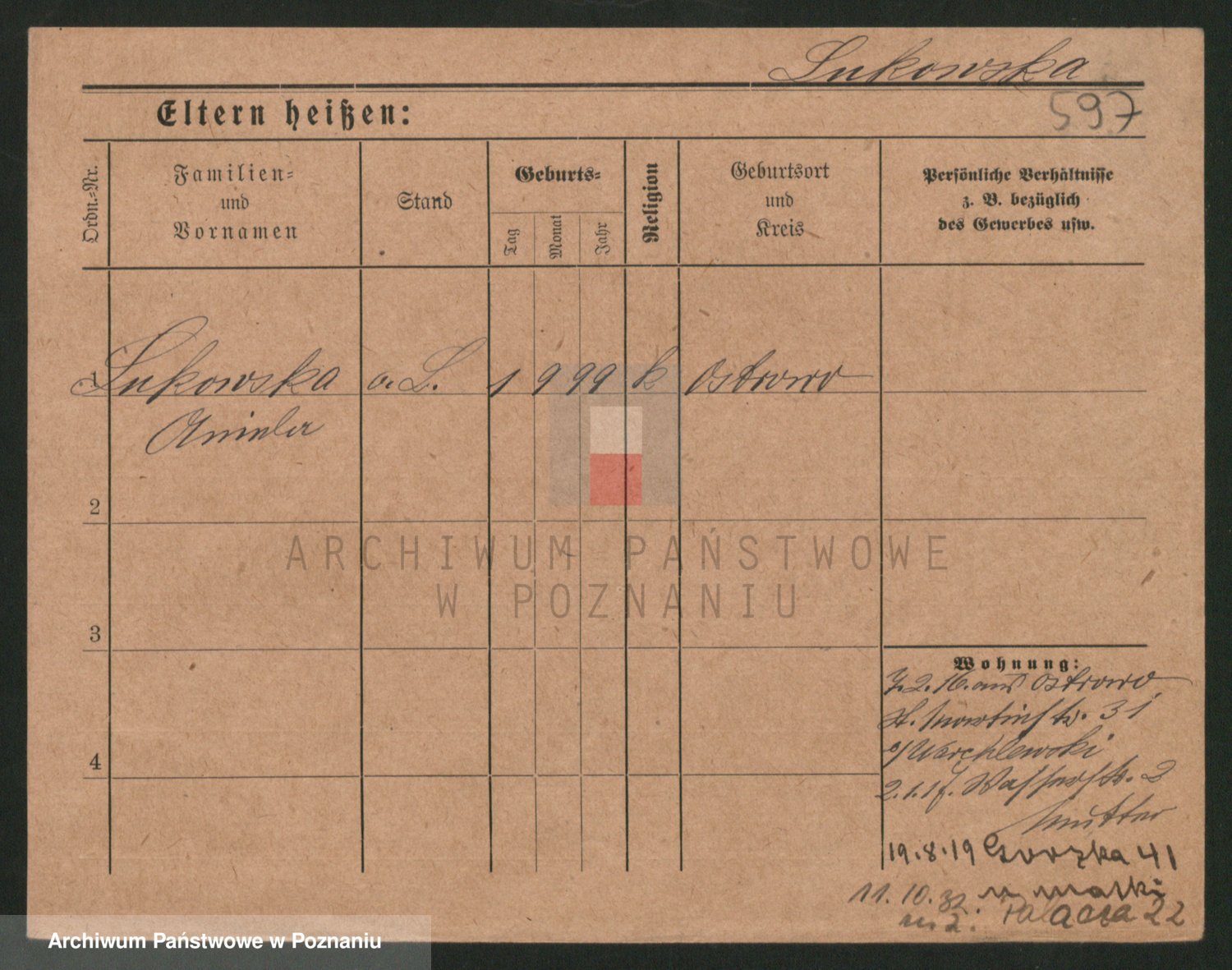 Podgląd karty osobowej dostępny jest po kliknięciu na nazwisko lub ikonkę karty. Można dokonywać powiększenia (ikony na górze) lub przechodzić między kolejnymi skanami (strzałki po bokach).
