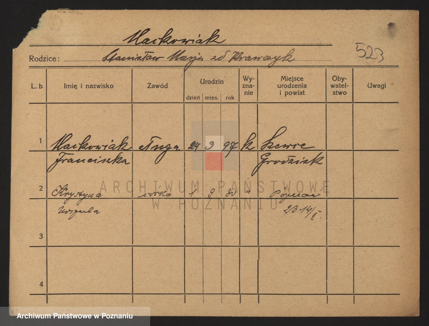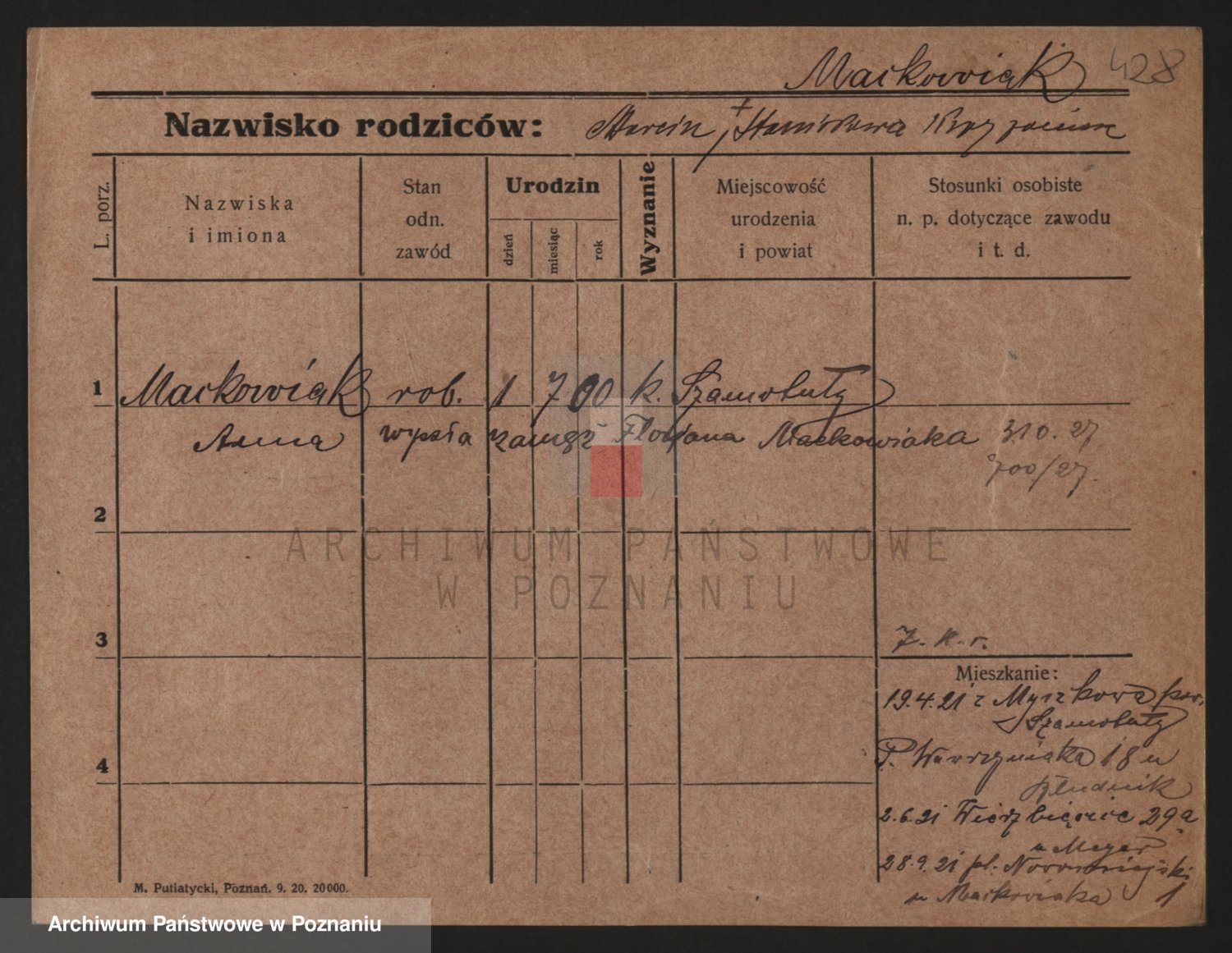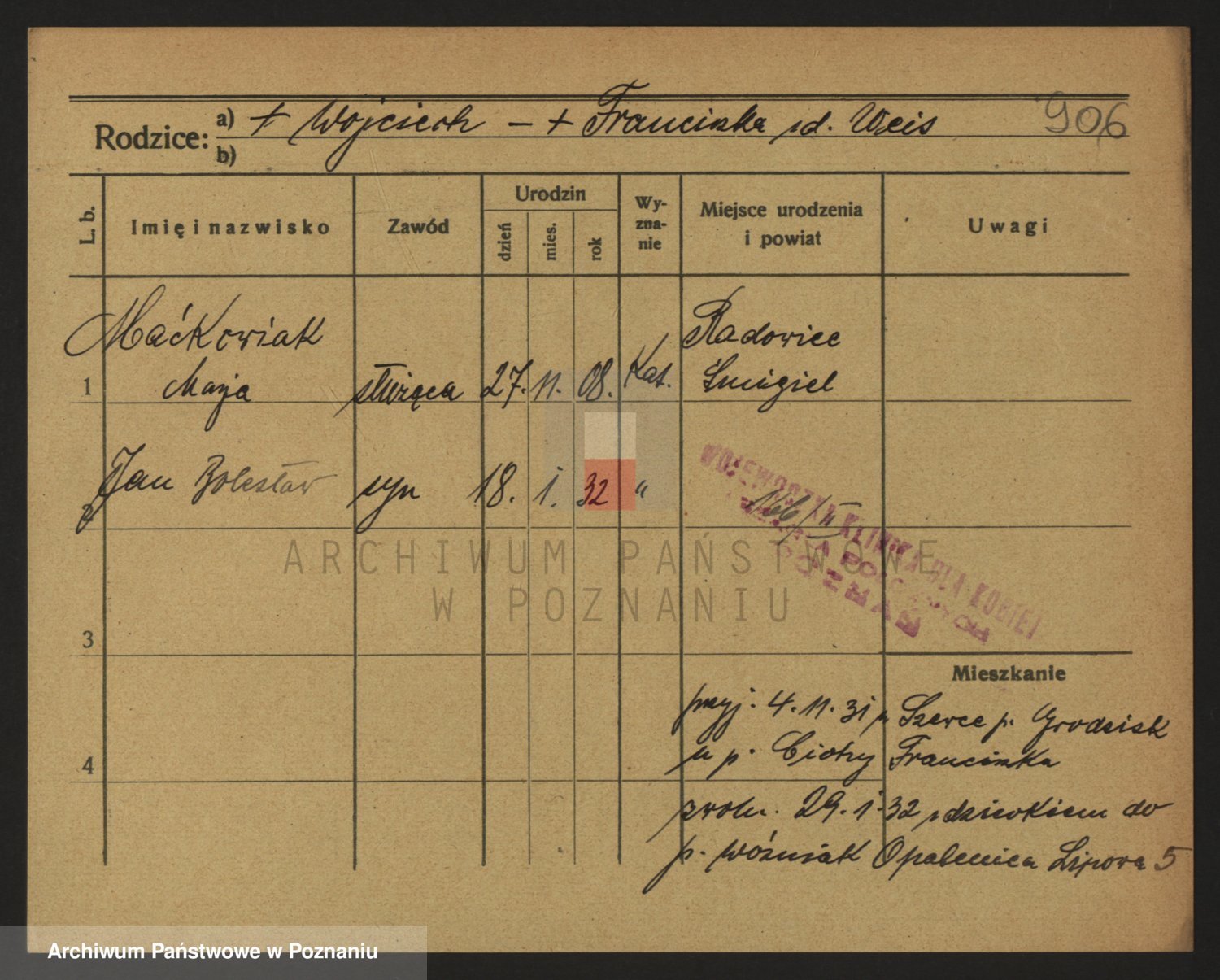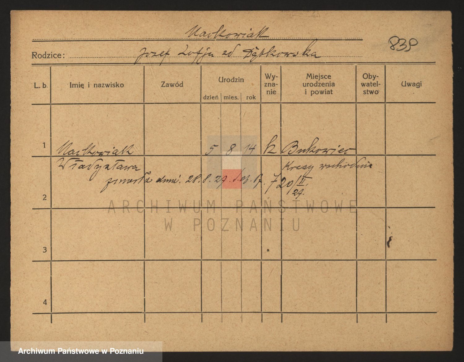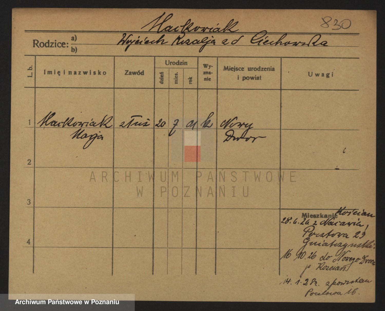 Podgląd karty osobowej dostępny jest po kliknięciu na nazwisko lub ikonkę karty. Można dokonywać powiększenia (ikony na górze) lub przechodzić między kolejnymi skanami (strzałki po bokach).