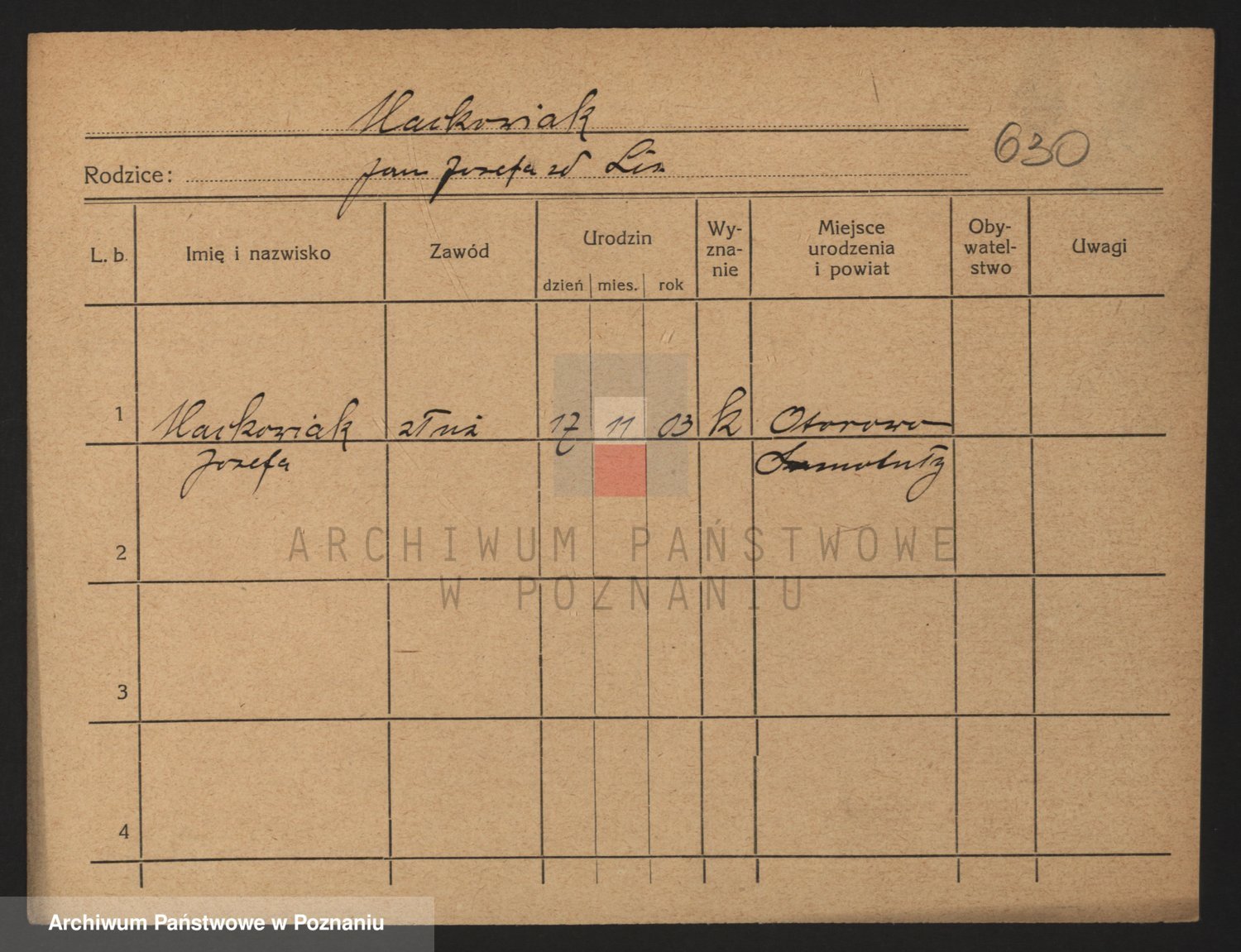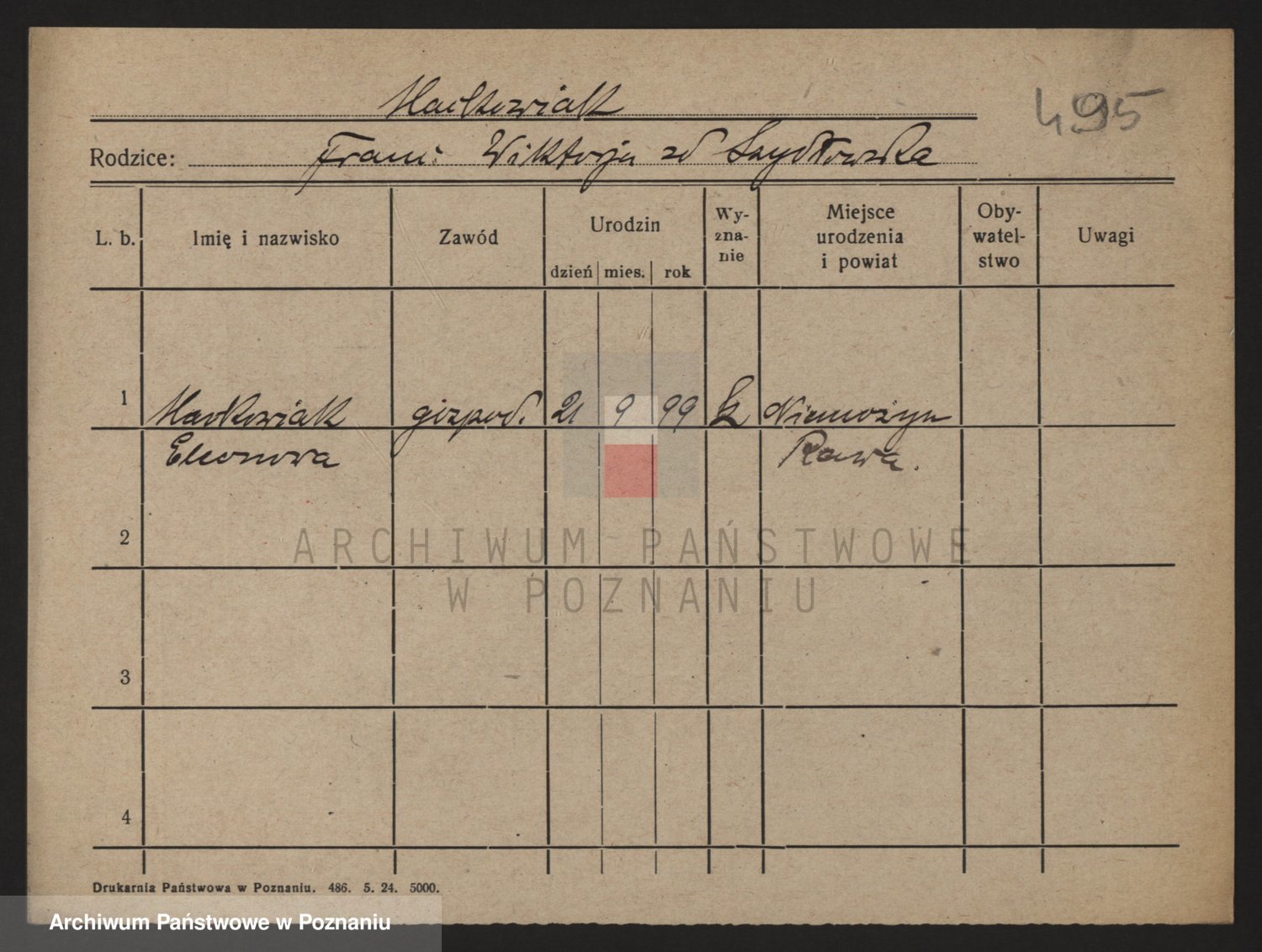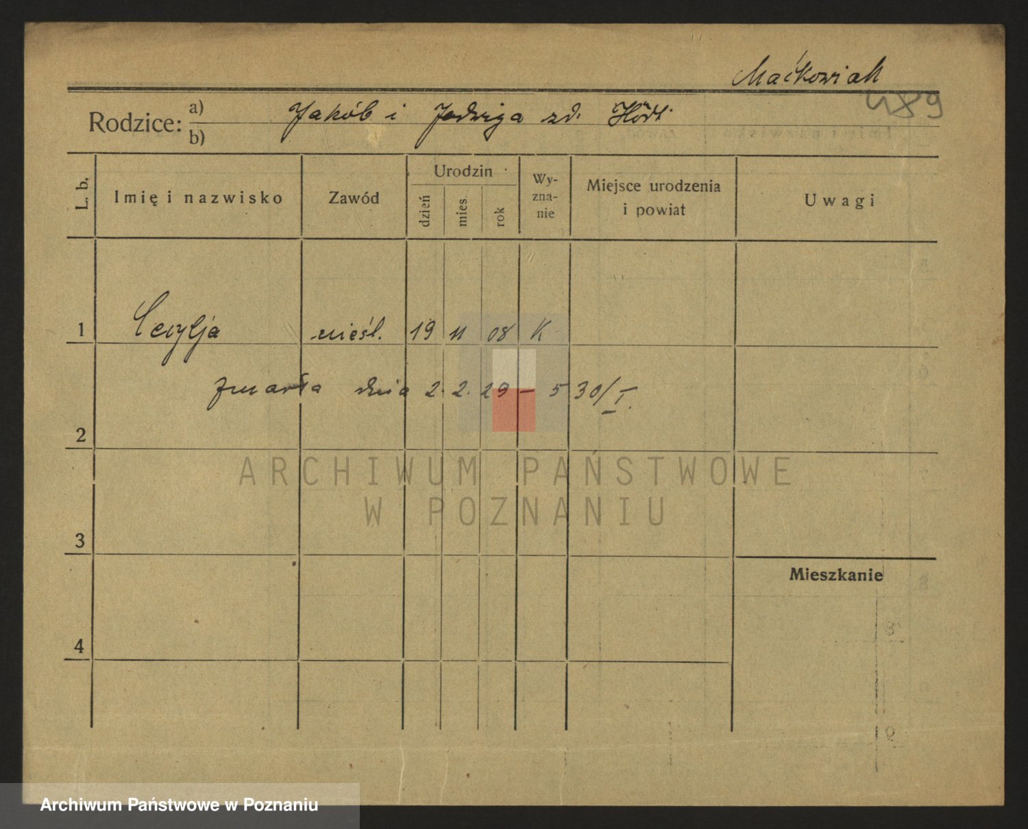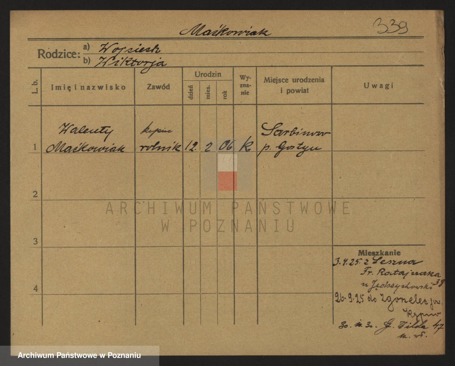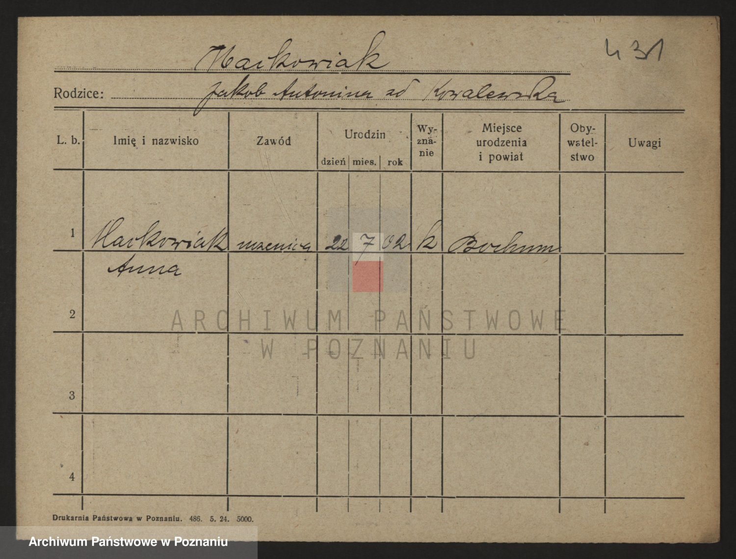 Podgląd karty osobowej dostępny jest po kliknięciu na nazwisko lub ikonkę karty. Można dokonywać powiększenia (ikony na górze) lub przechodzić między kolejnymi skanami (strzałki po bokach).