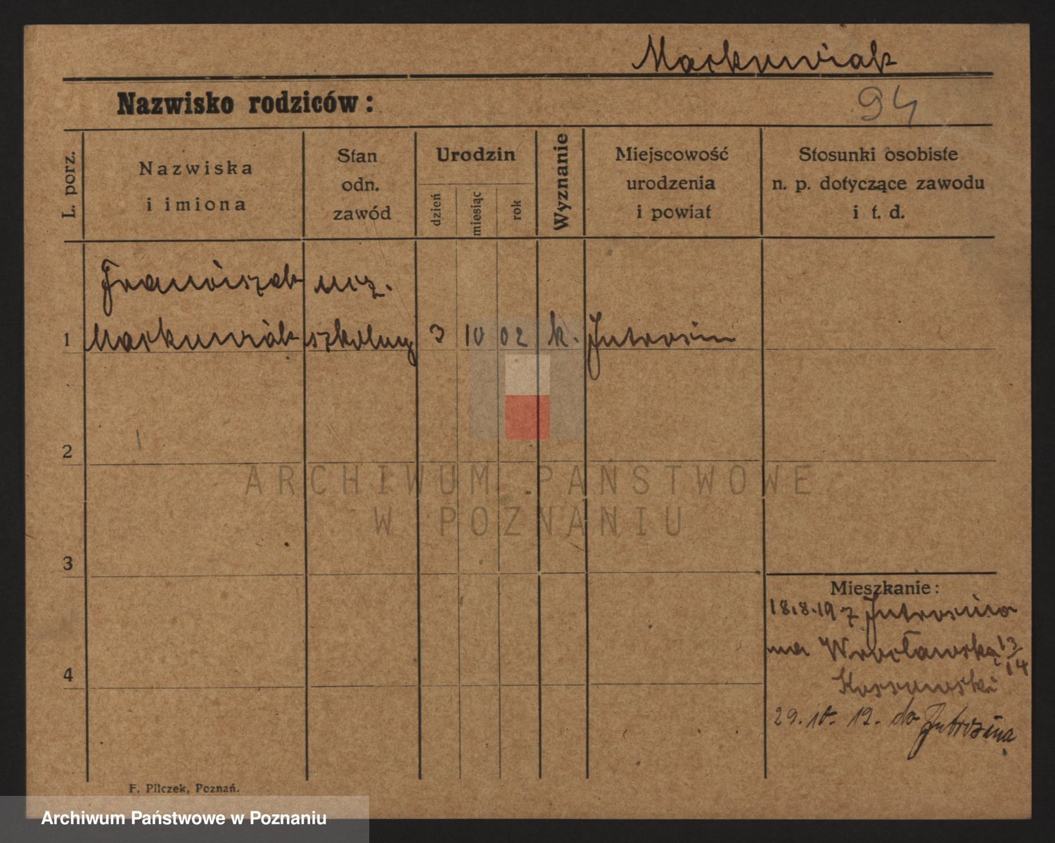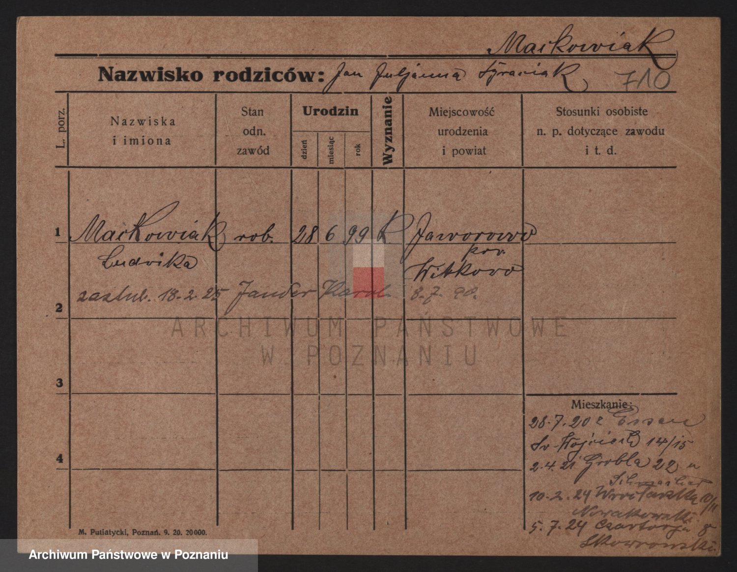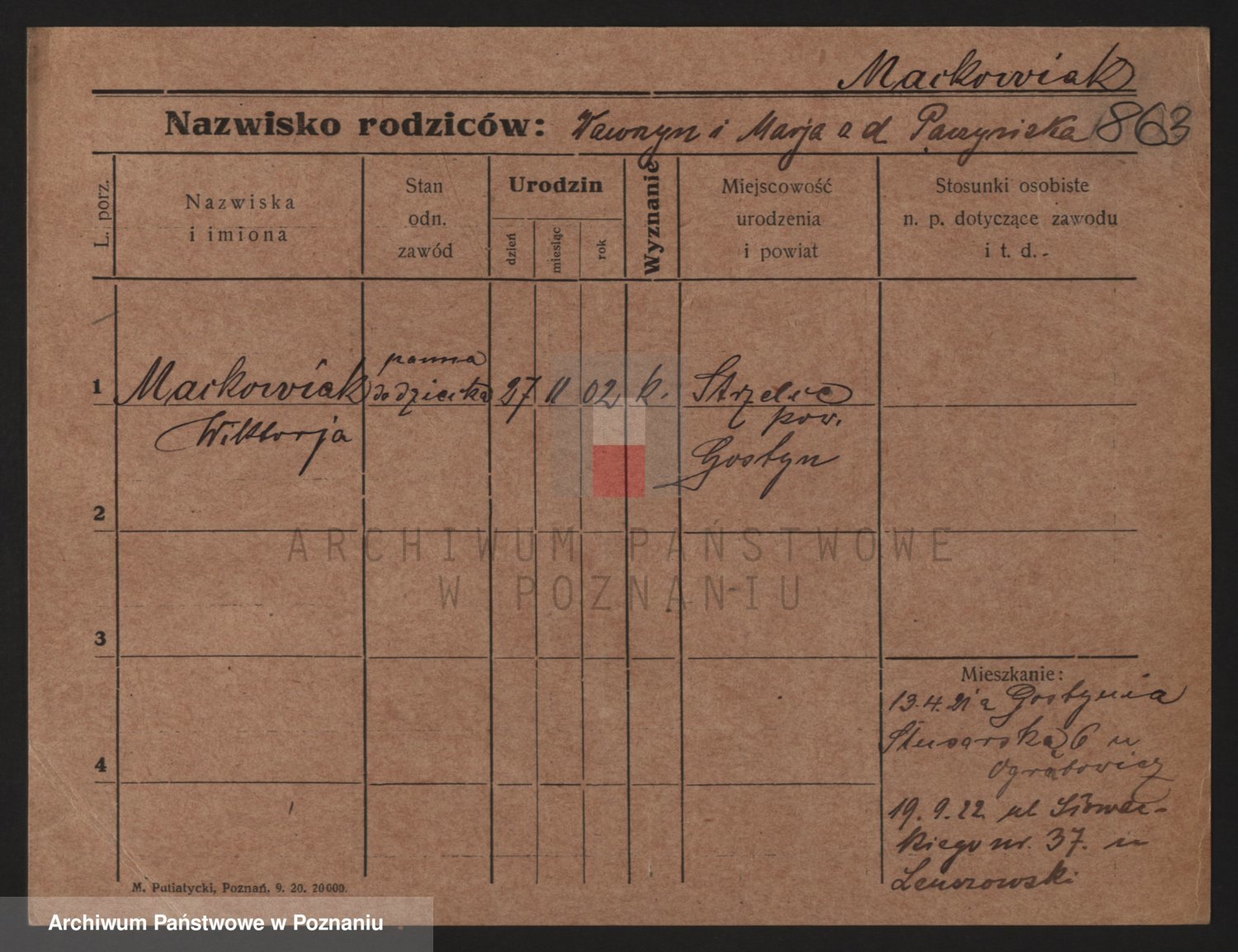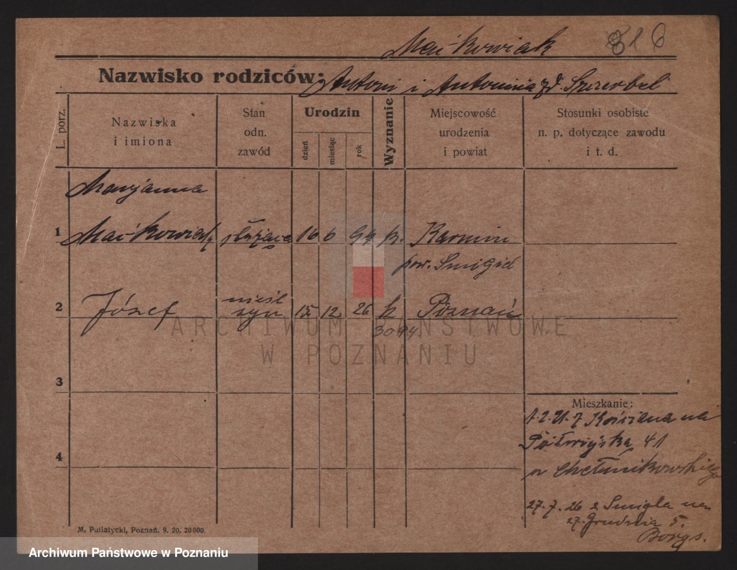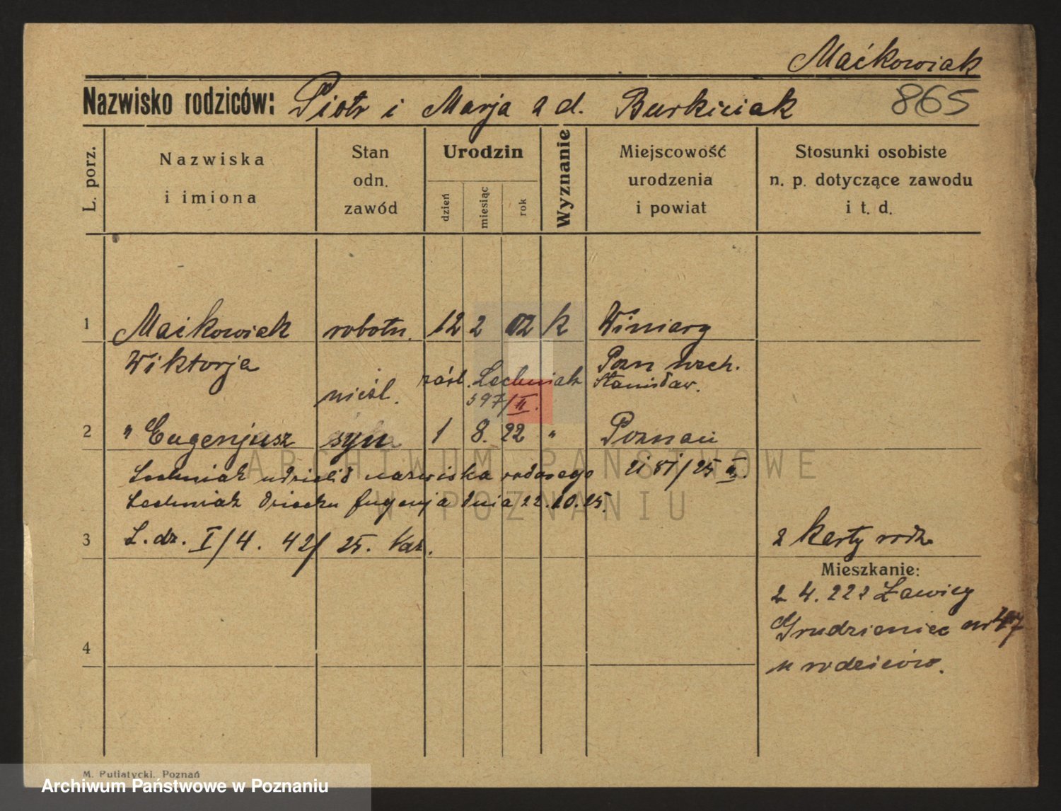 Podgląd karty osobowej dostępny jest po kliknięciu na nazwisko lub ikonkę karty. Można dokonywać powiększenia (ikony na górze) lub przechodzić między kolejnymi skanami (strzałki po bokach).