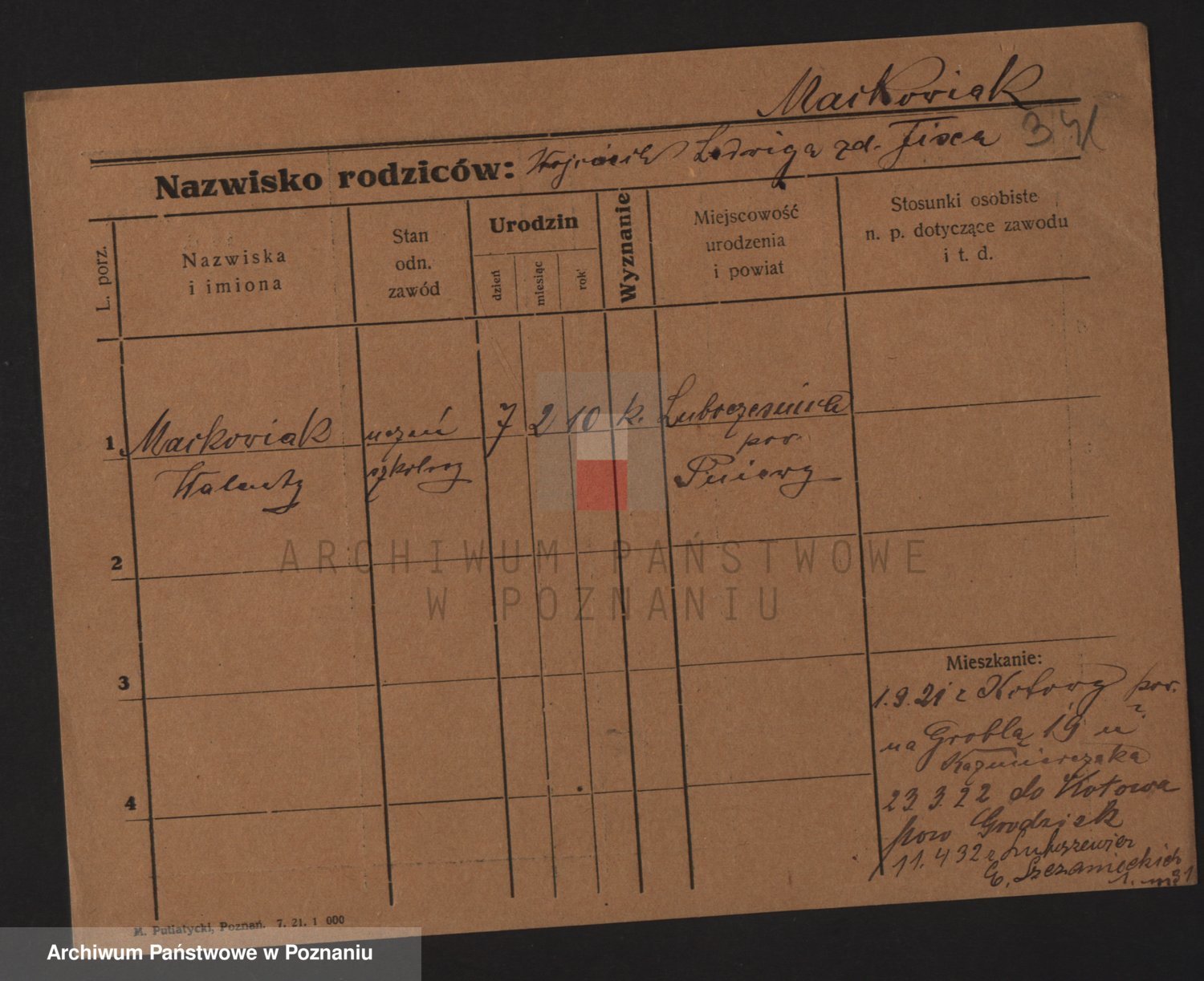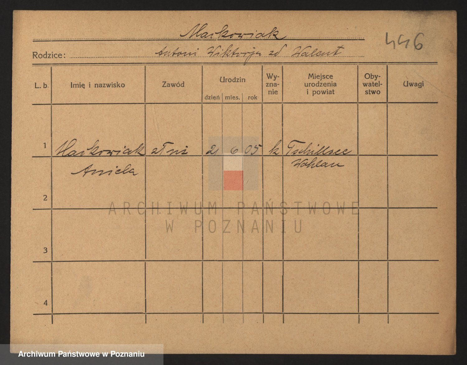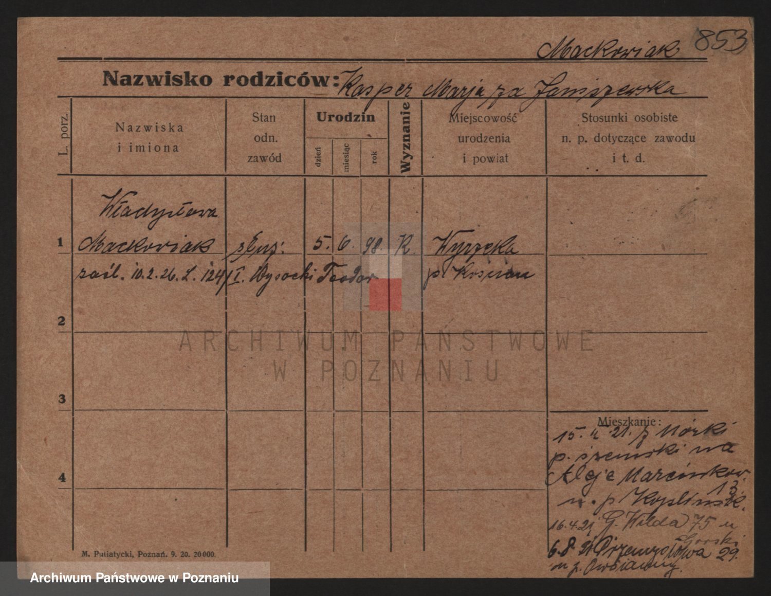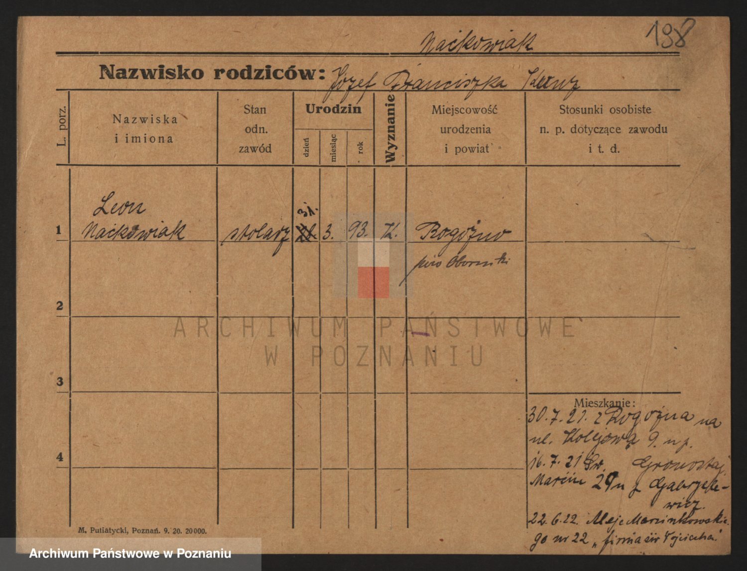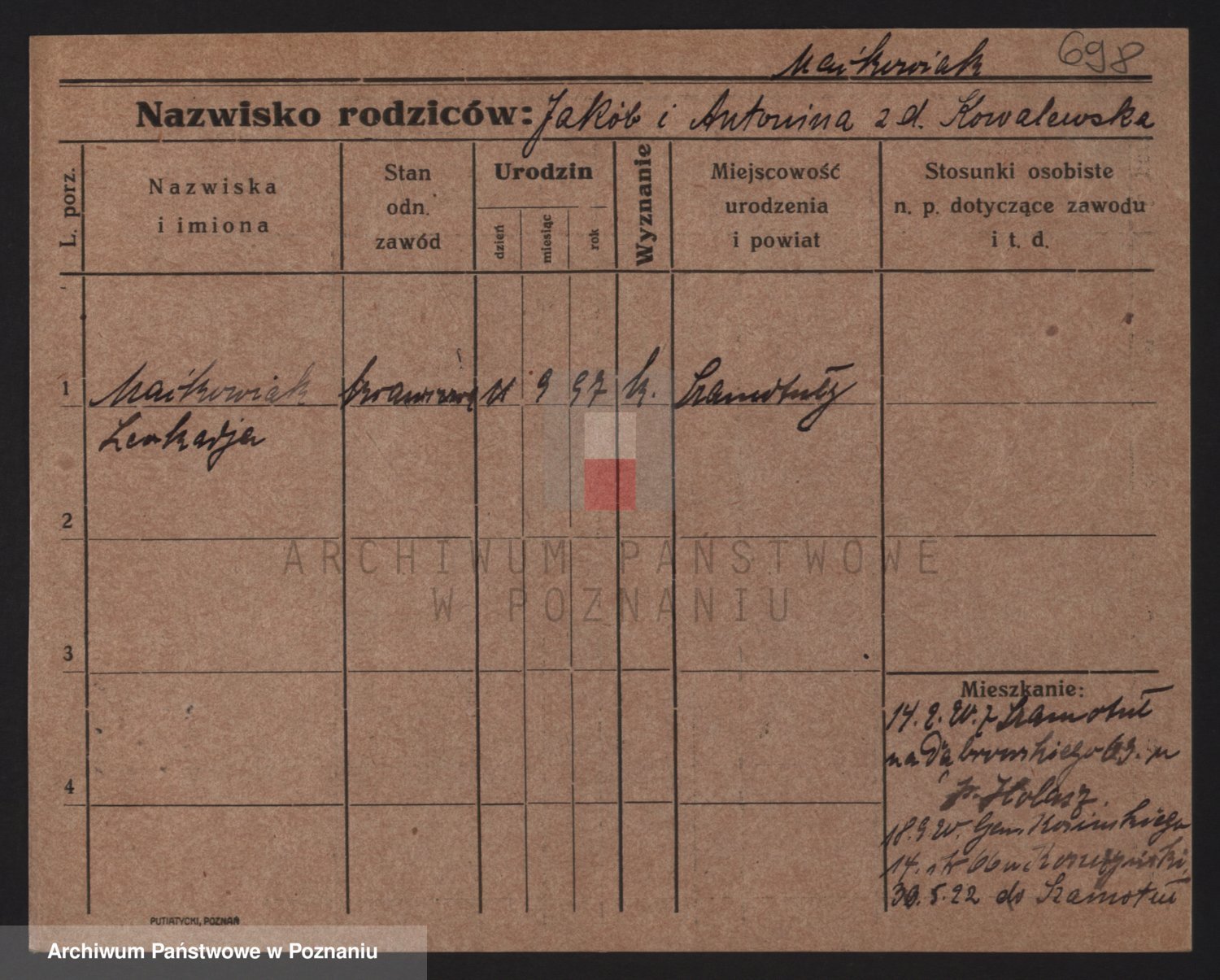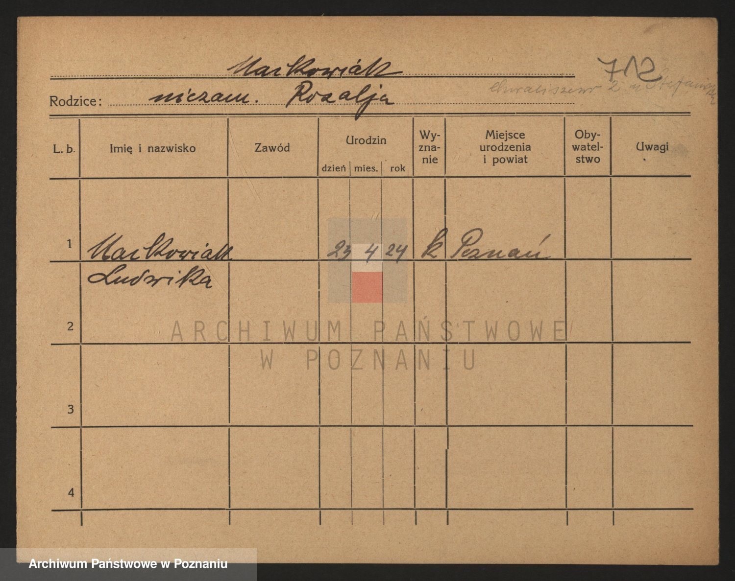 Podgląd karty osobowej dostępny jest po kliknięciu na nazwisko lub ikonkę karty. Można dokonywać powiększenia (ikony na górze) lub przechodzić między kolejnymi skanami (strzałki po bokach).