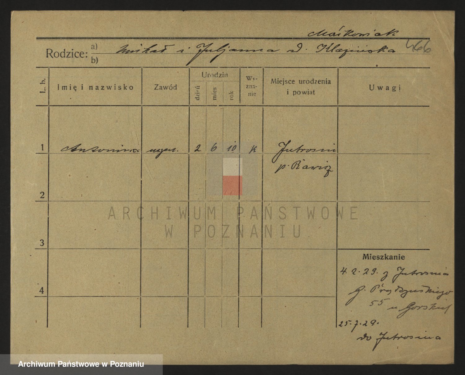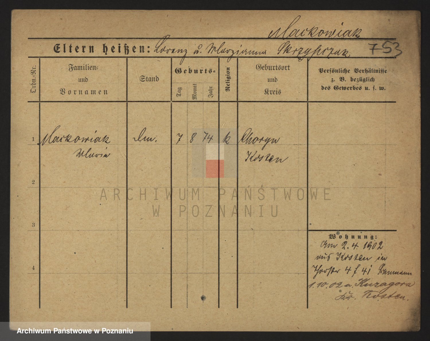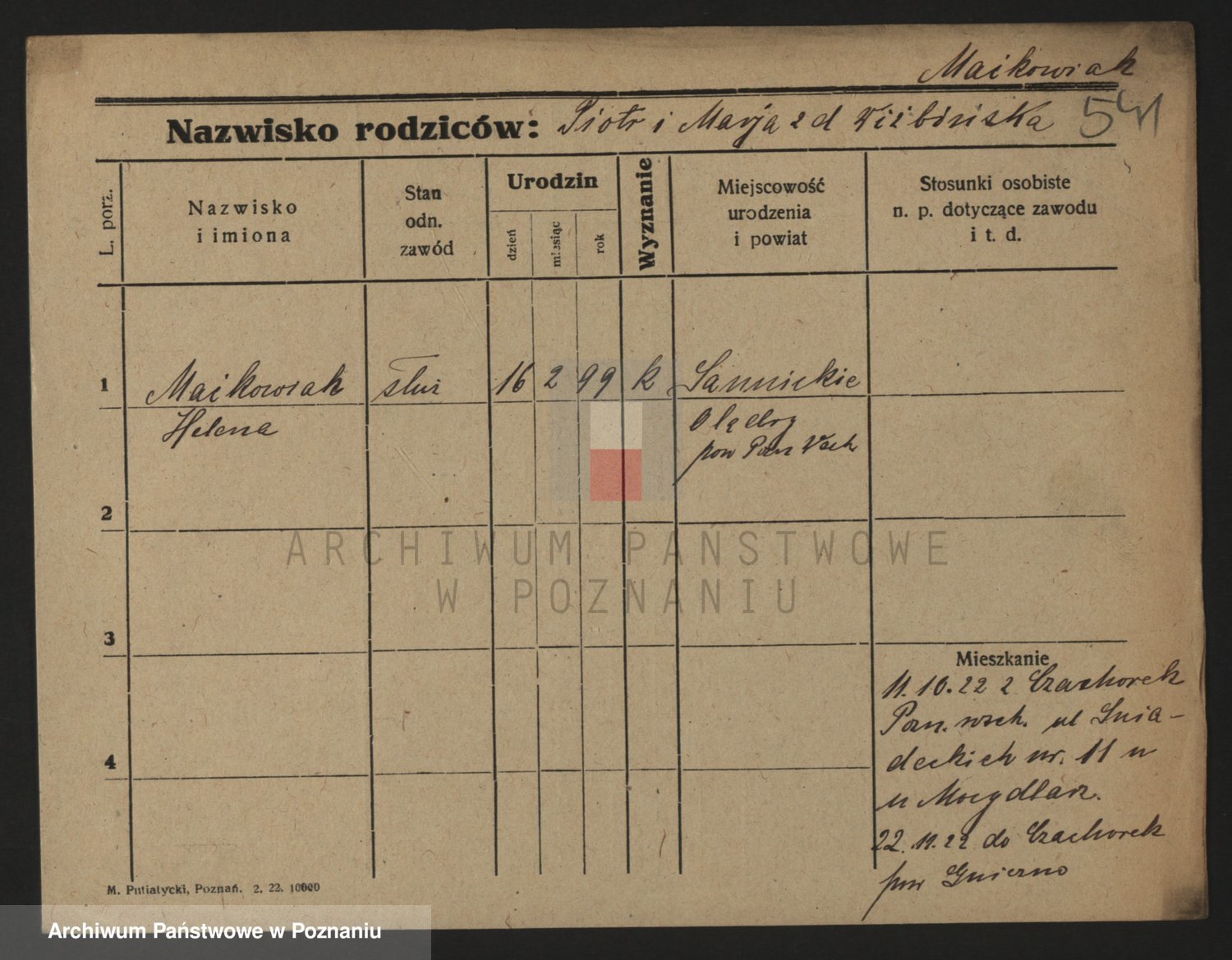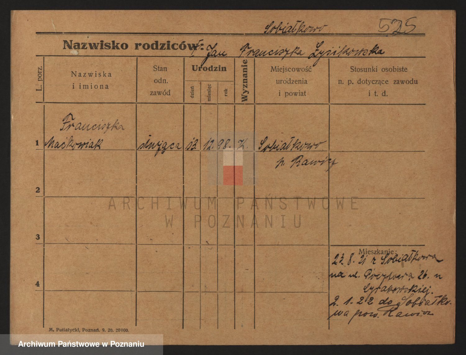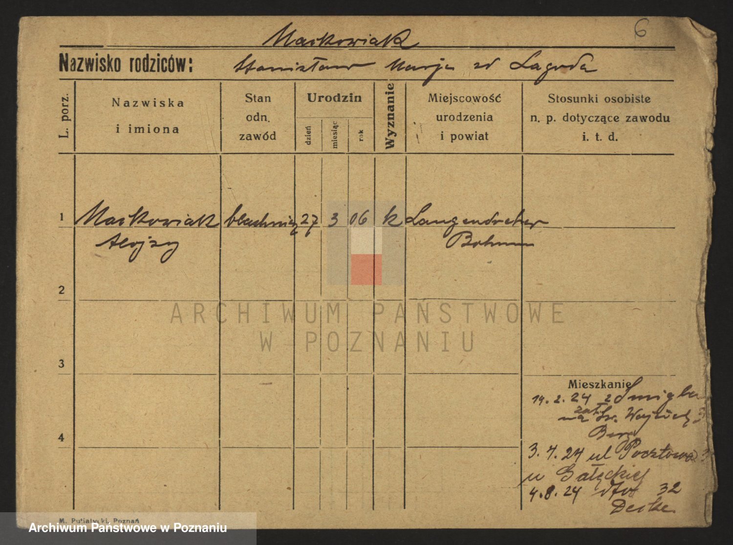 Podgląd karty osobowej dostępny jest po kliknięciu na nazwisko lub ikonkę karty. Można dokonywać powiększenia (ikony na górze) lub przechodzić między kolejnymi skanami (strzałki po bokach).