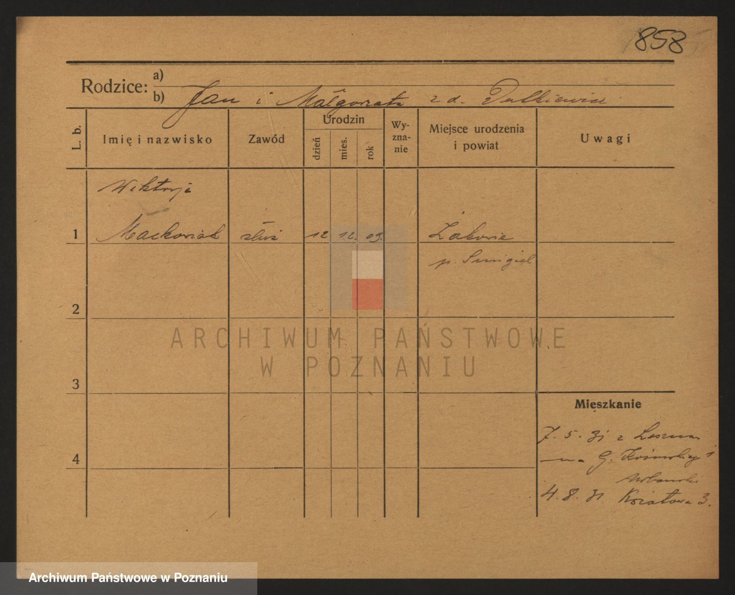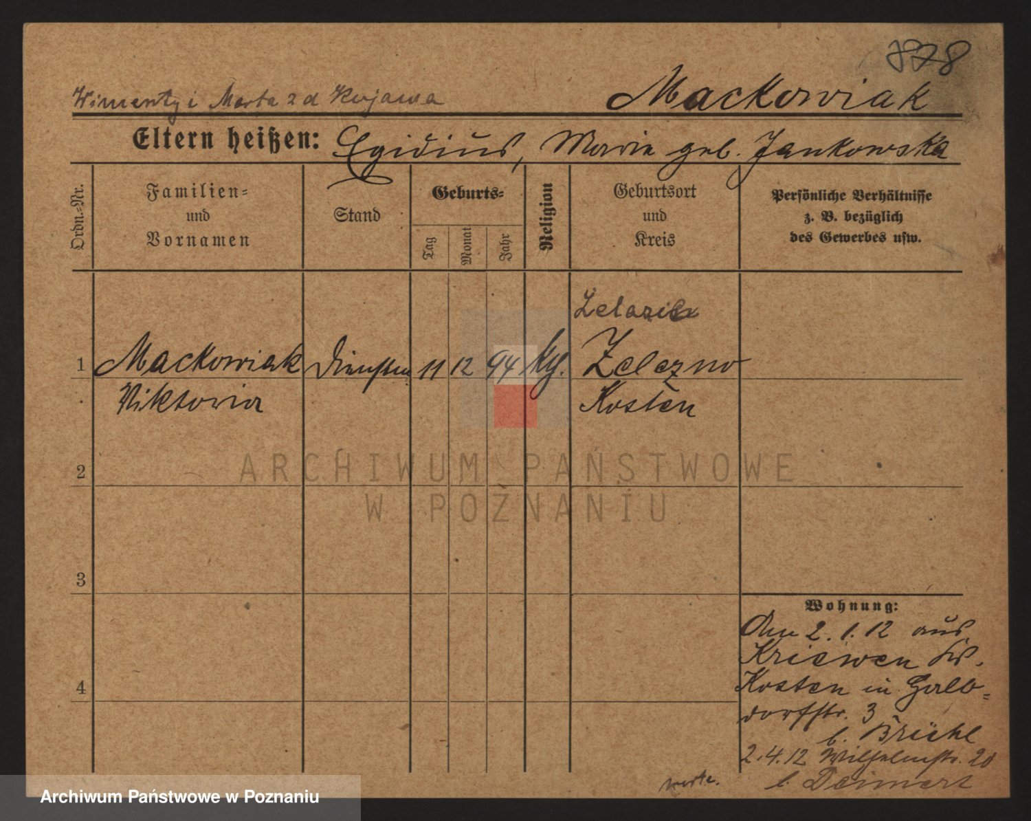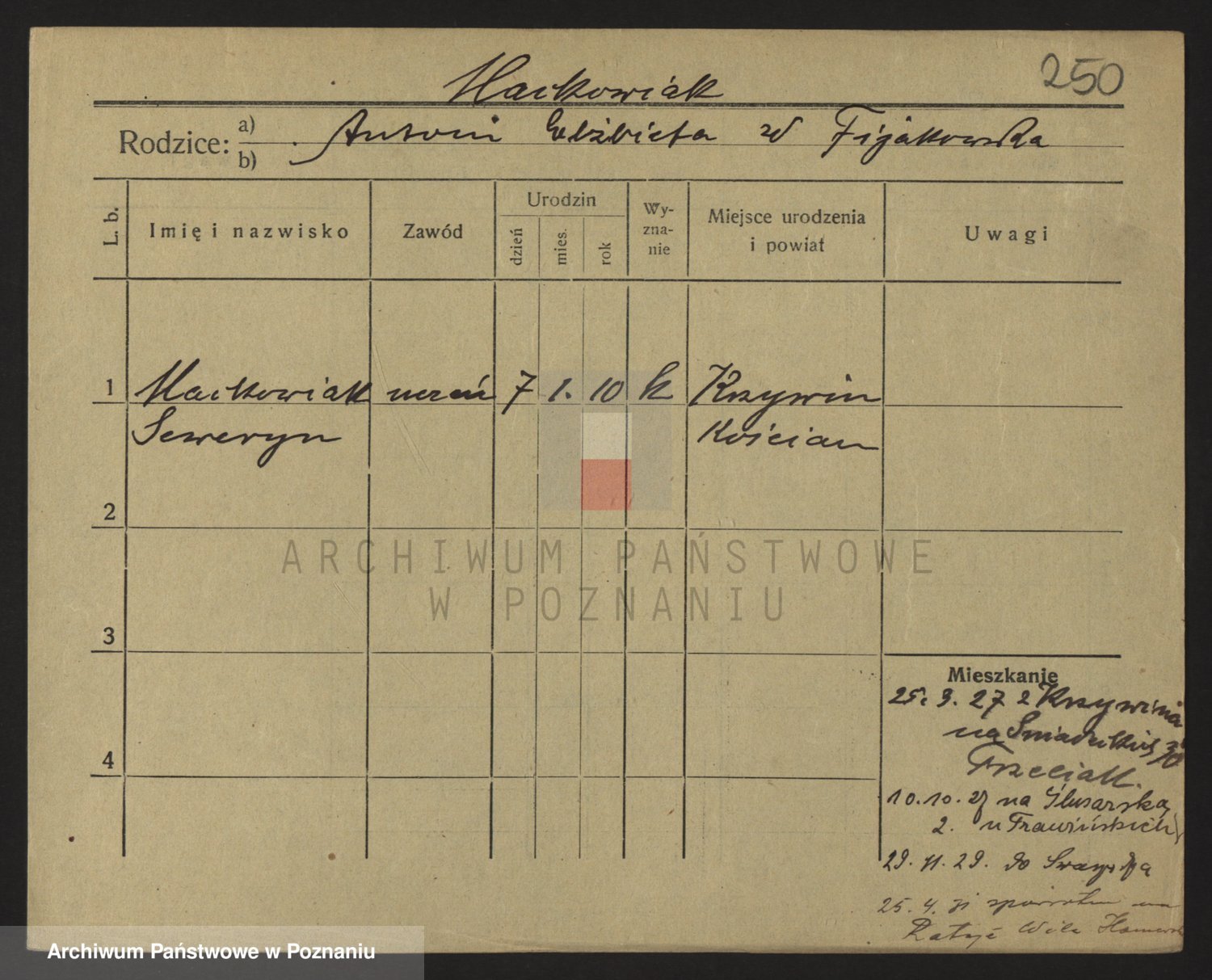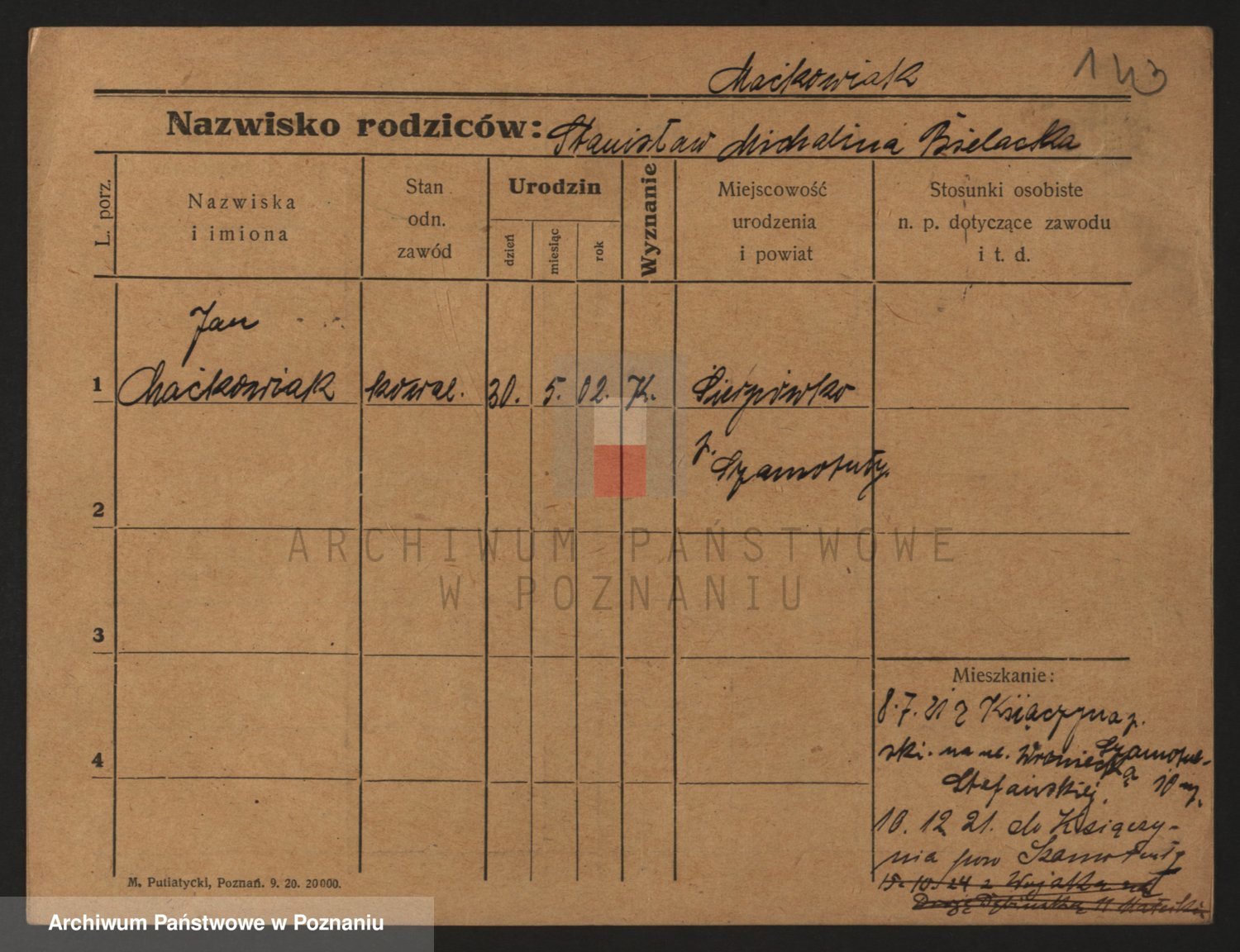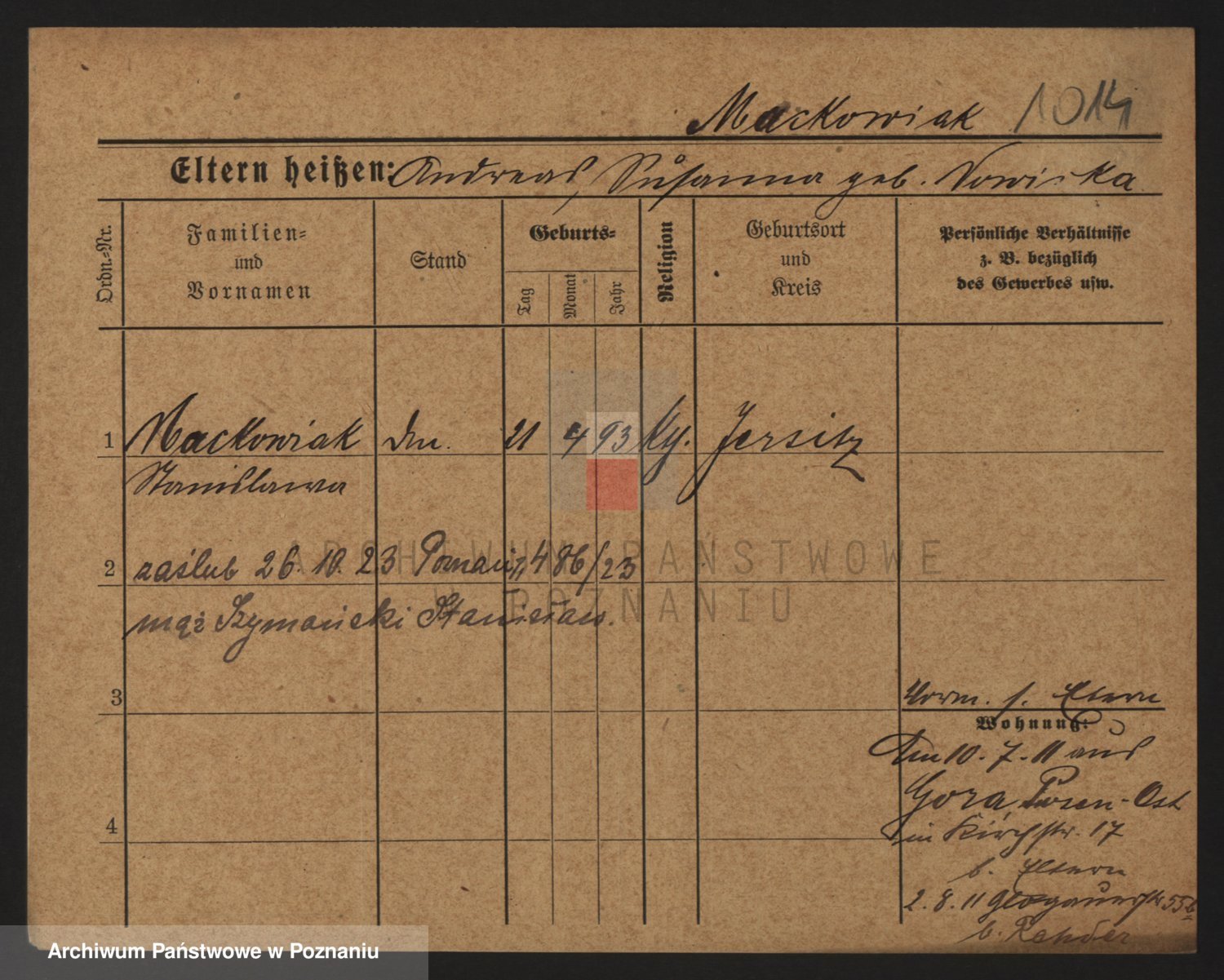 Podgląd karty osobowej dostępny jest po kliknięciu na nazwisko lub ikonkę karty. Można dokonywać powiększenia (ikony na górze) lub przechodzić między kolejnymi skanami (strzałki po bokach).