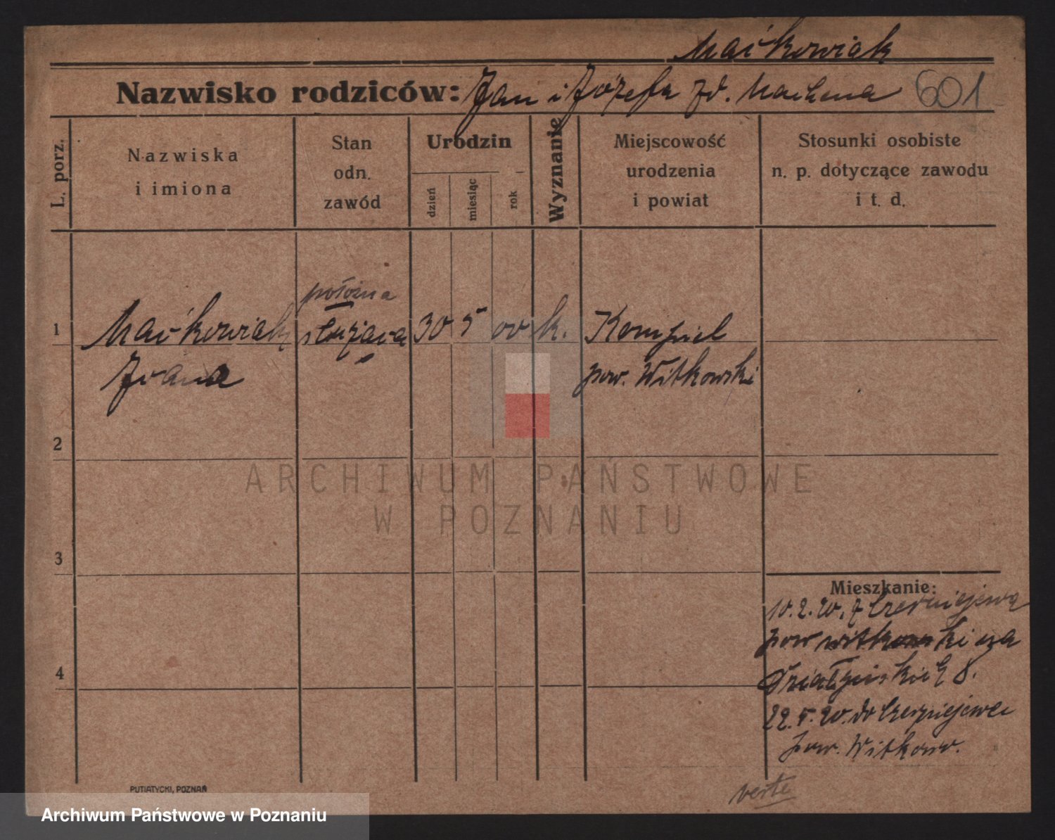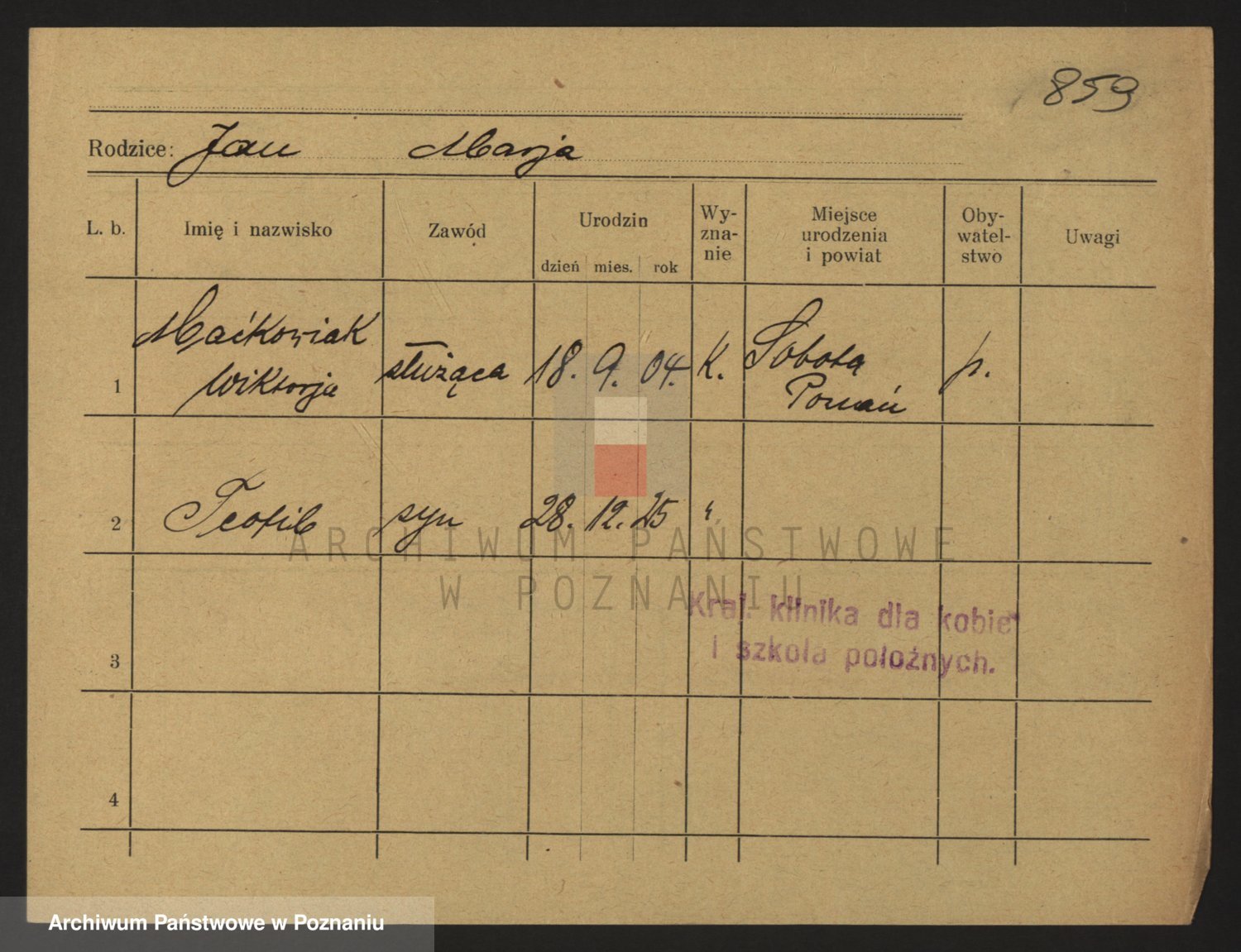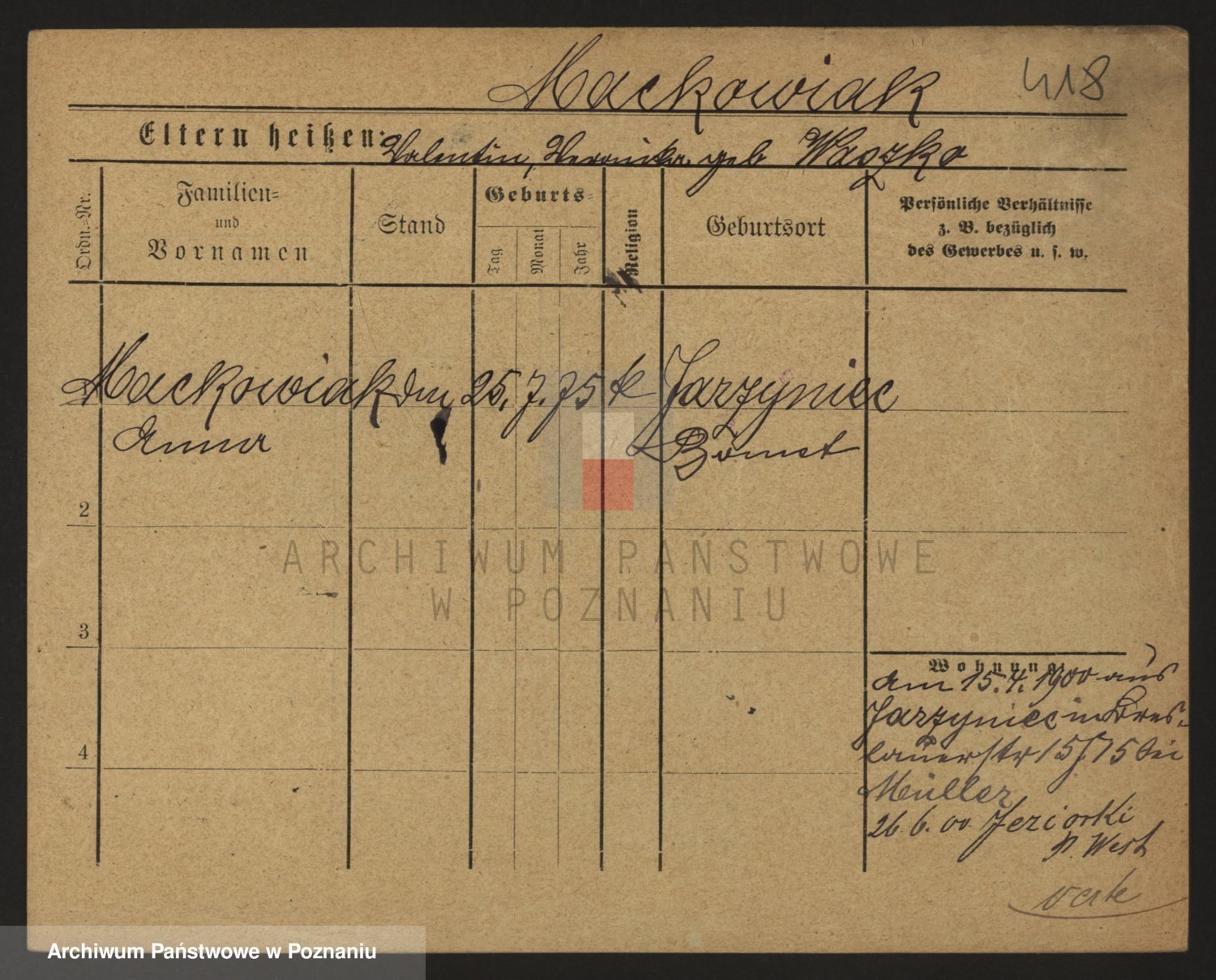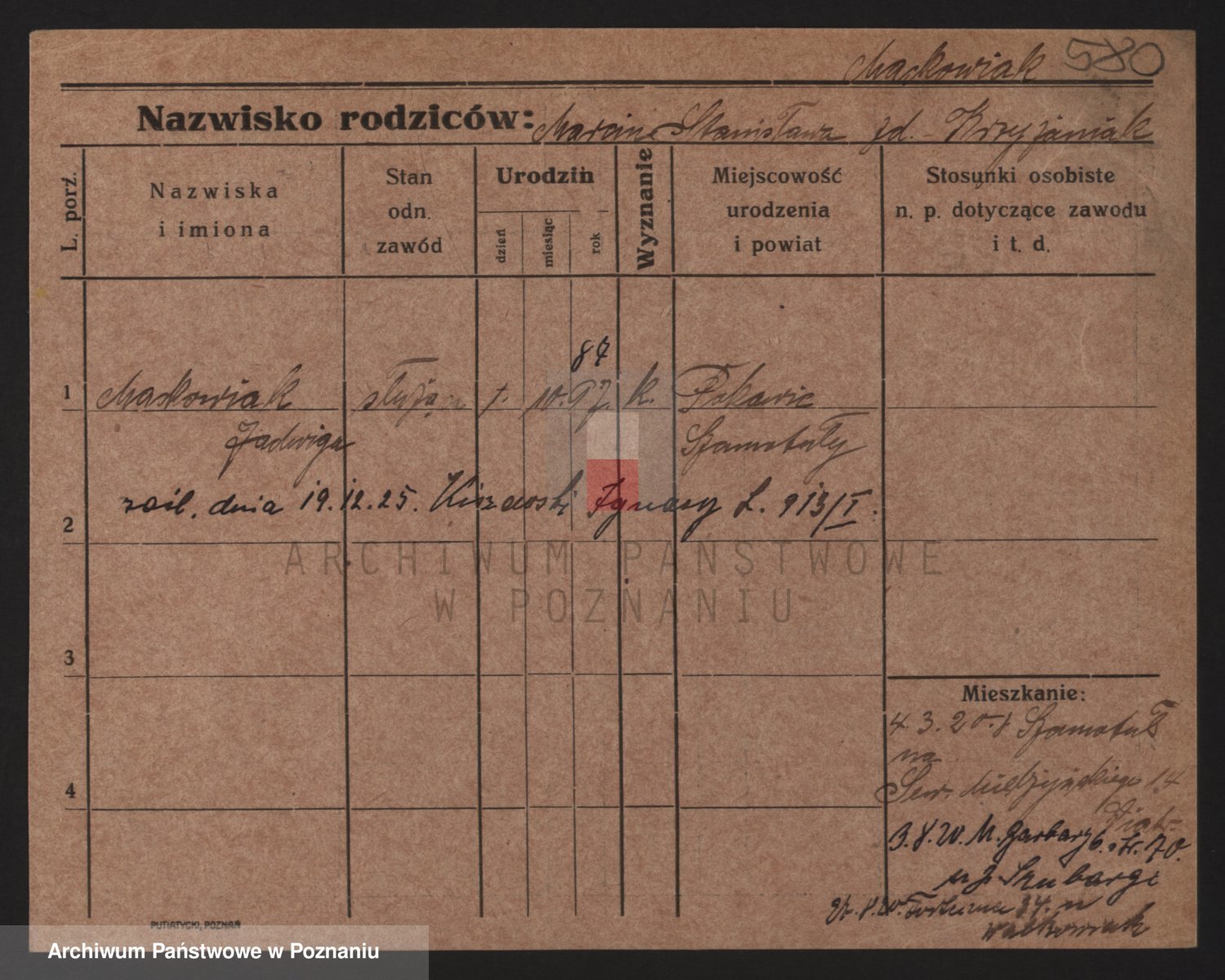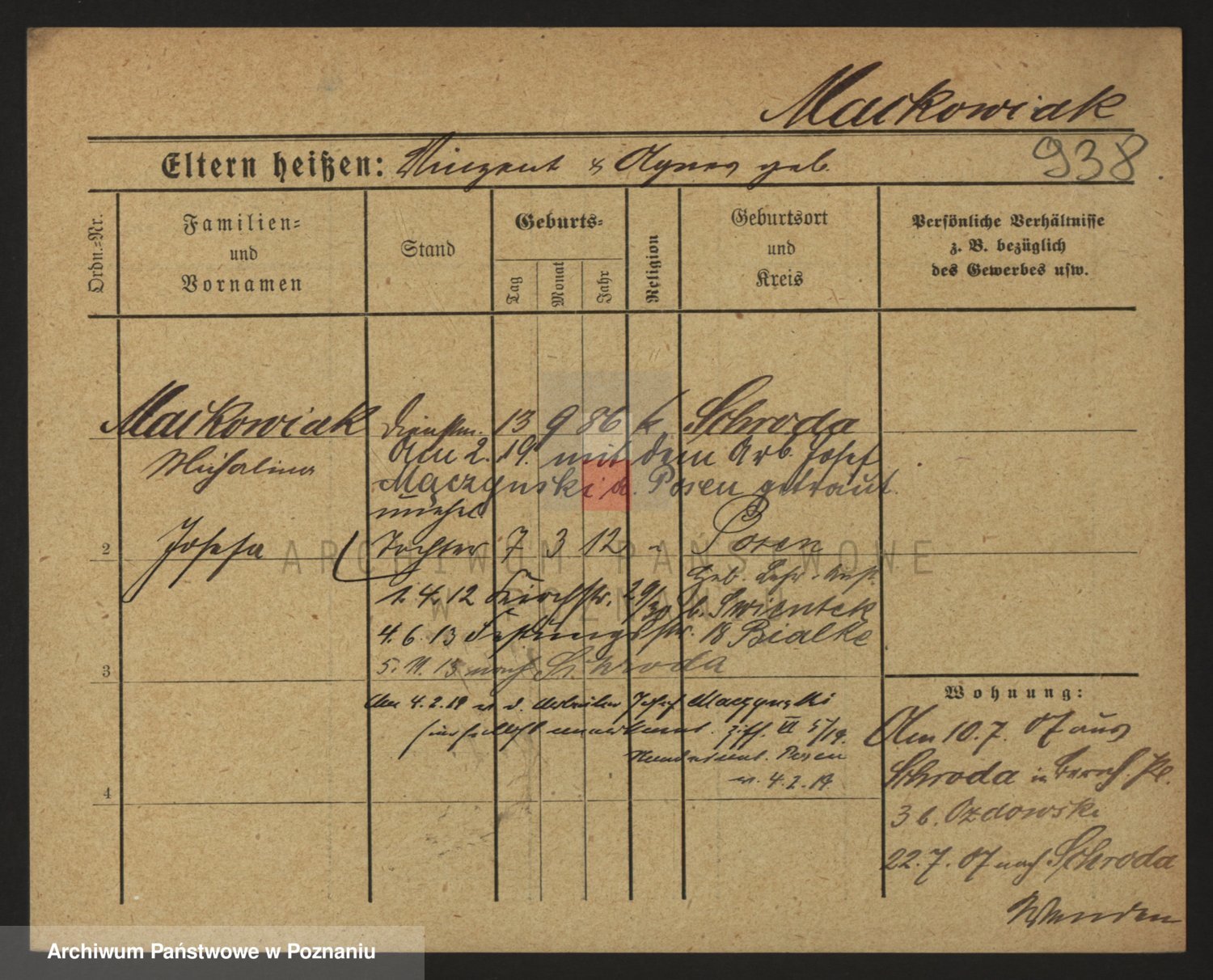 Podgląd karty osobowej dostępny jest po kliknięciu na nazwisko lub ikonkę karty. Można dokonywać powiększenia (ikony na górze) lub przechodzić między kolejnymi skanami (strzałki po bokach).