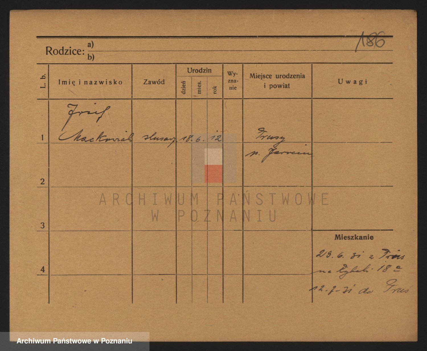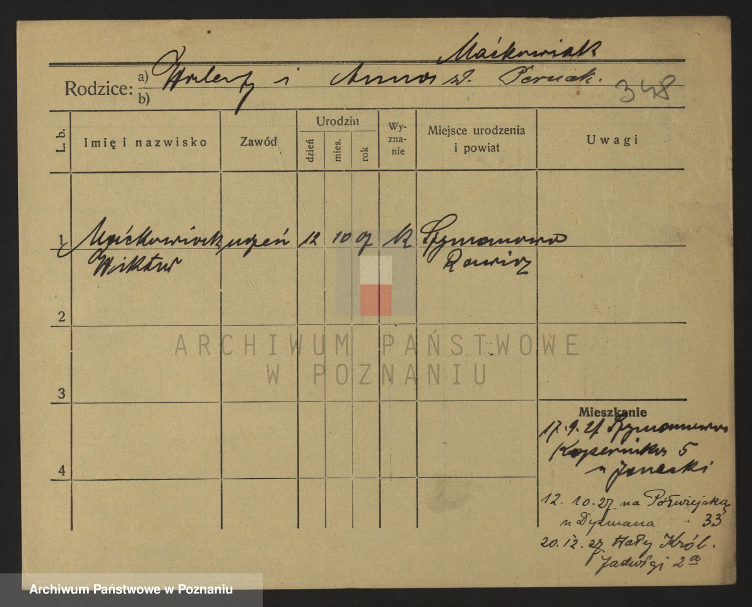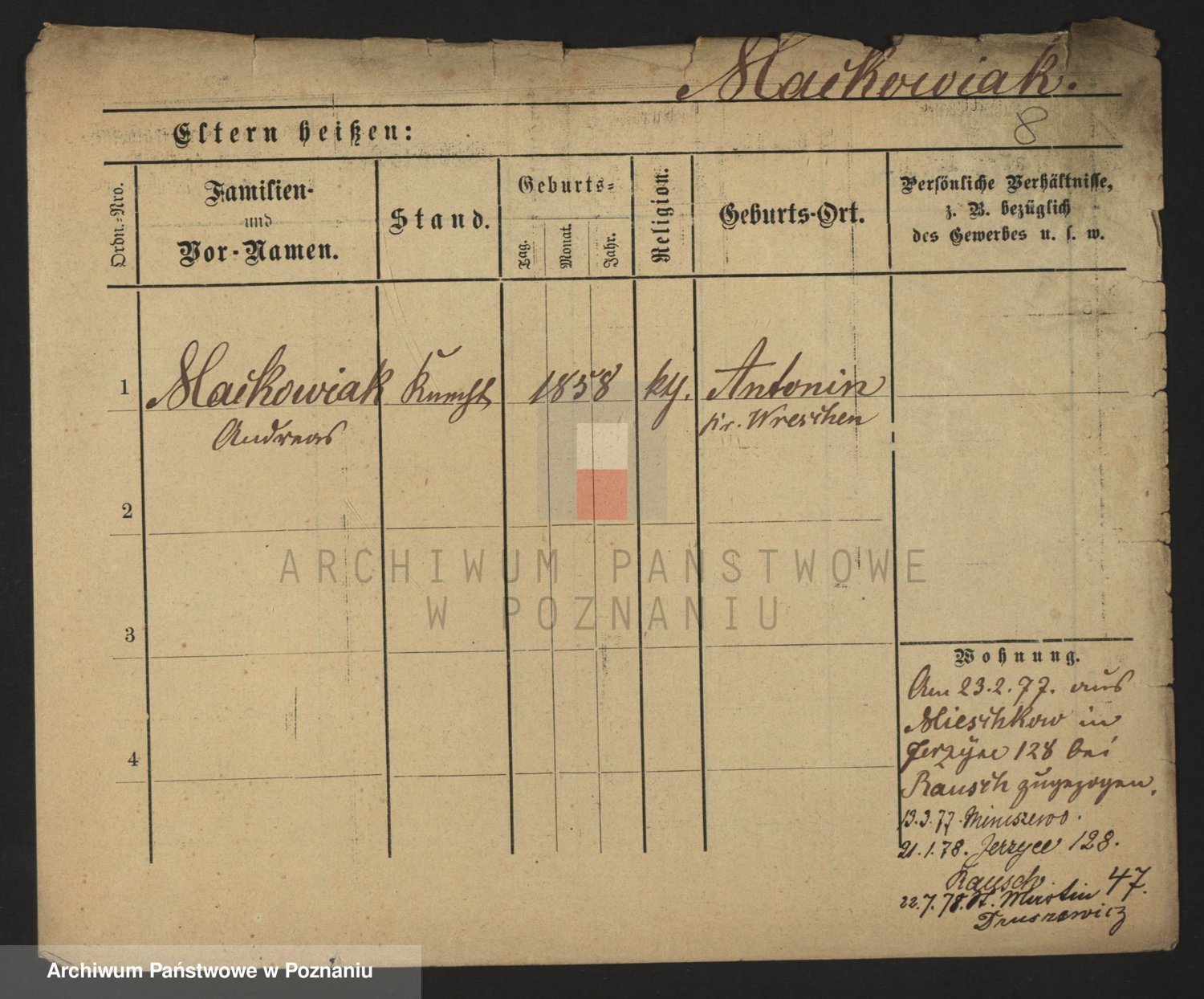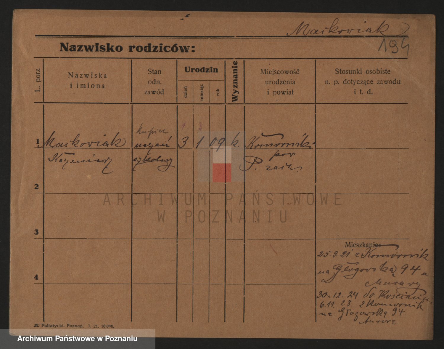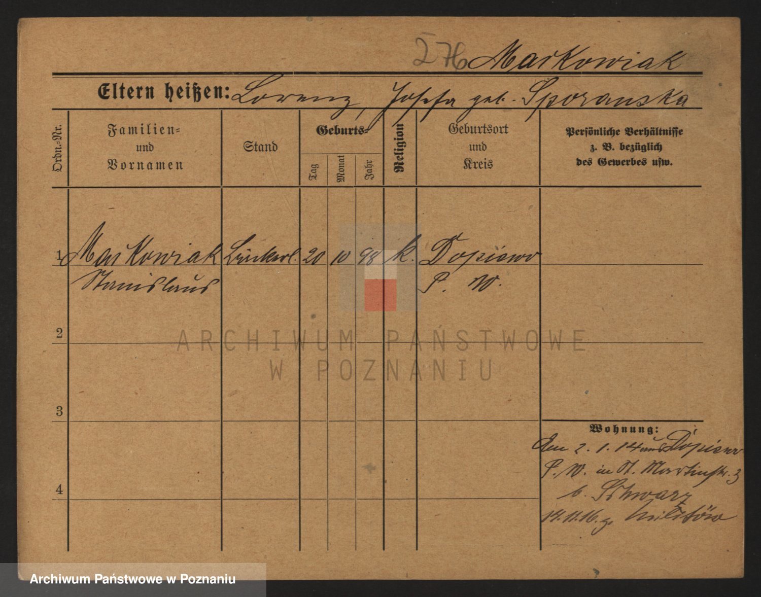 Podgląd karty osobowej dostępny jest po kliknięciu na nazwisko lub ikonkę karty. Można dokonywać powiększenia (ikony na górze) lub przechodzić między kolejnymi skanami (strzałki po bokach).