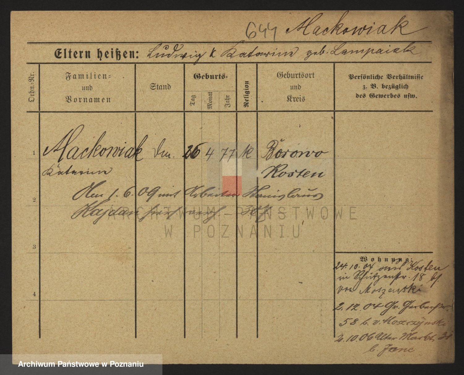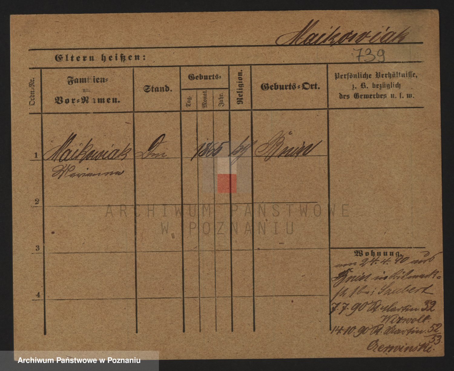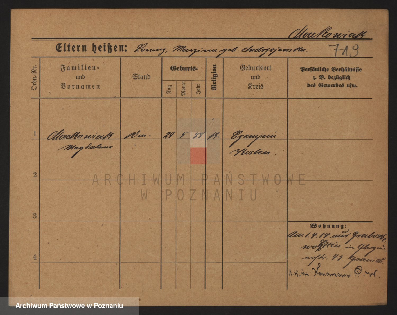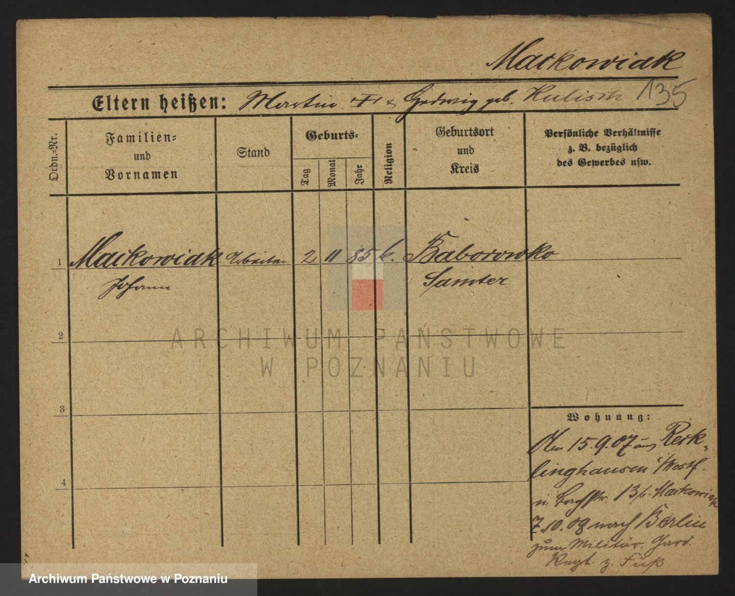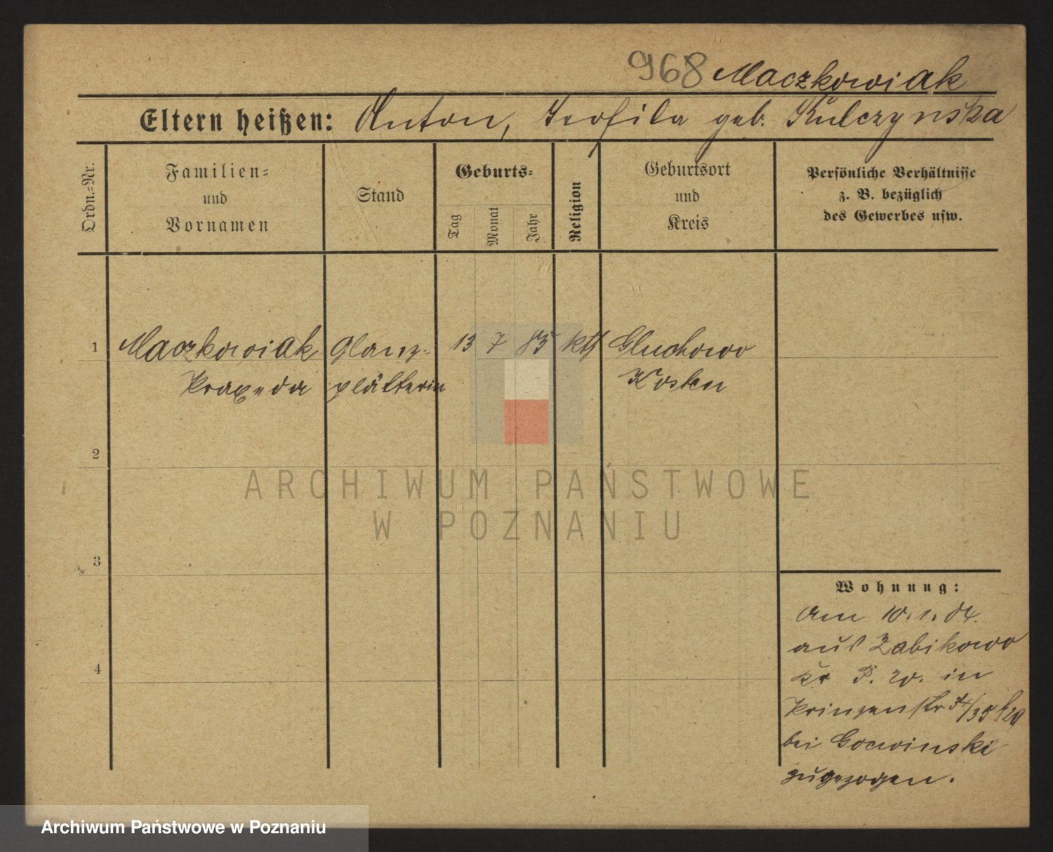 Podgląd karty osobowej dostępny jest po kliknięciu na nazwisko lub ikonkę karty. Można dokonywać powiększenia (ikony na górze) lub przechodzić między kolejnymi skanami (strzałki po bokach).
