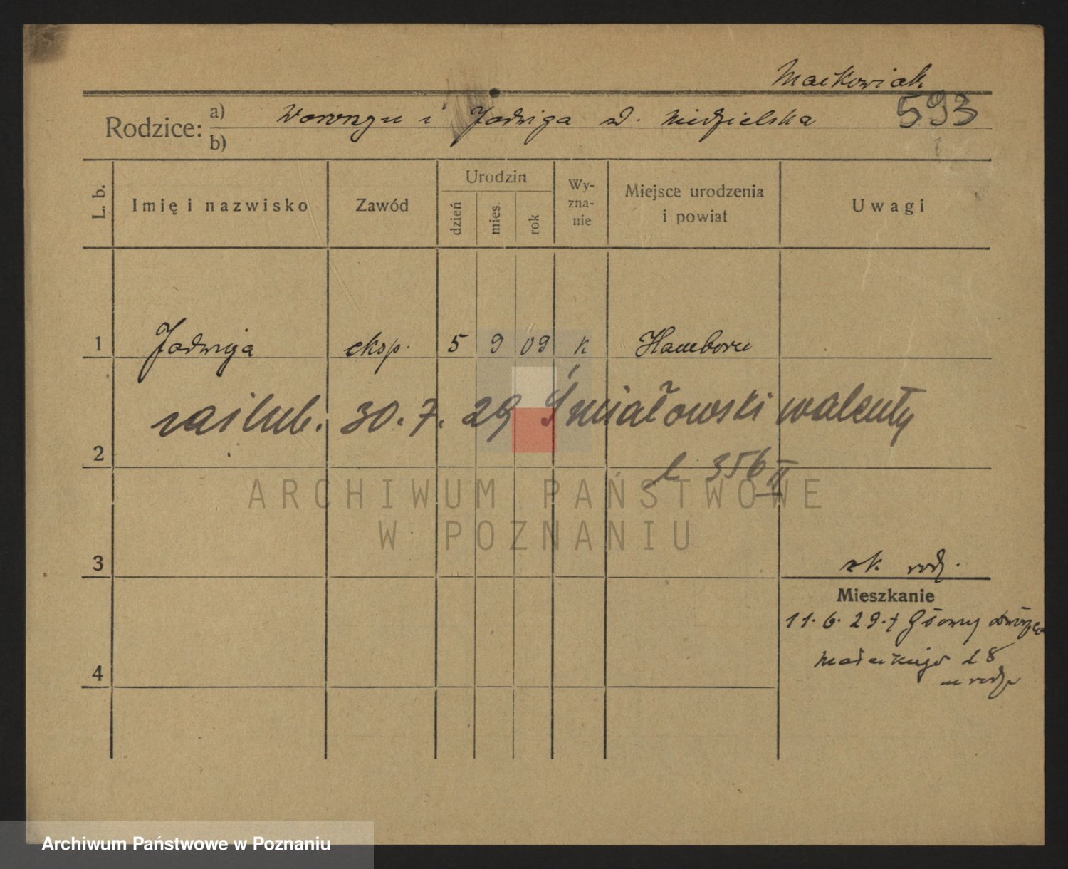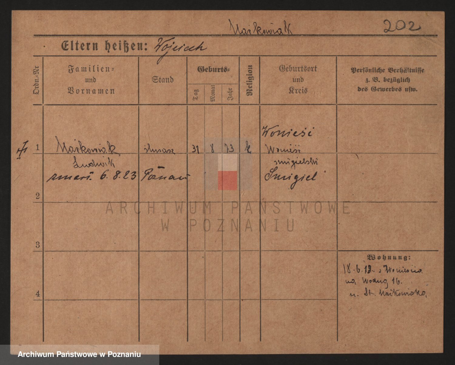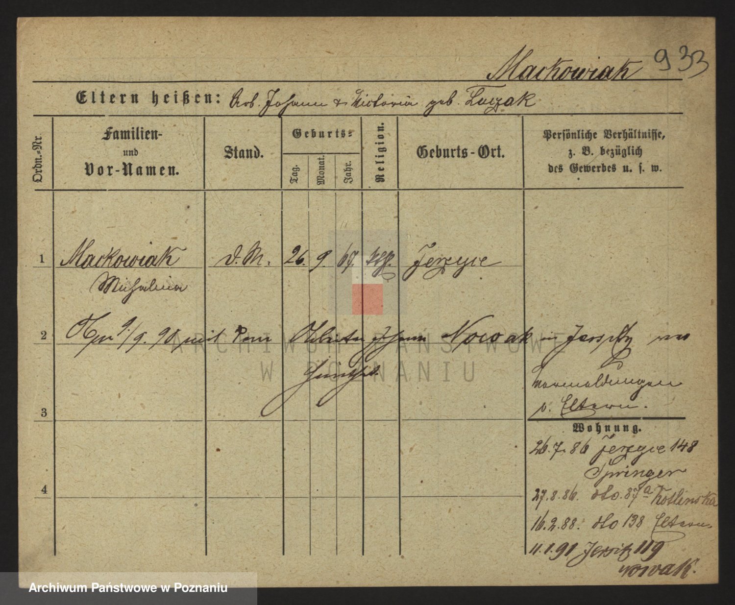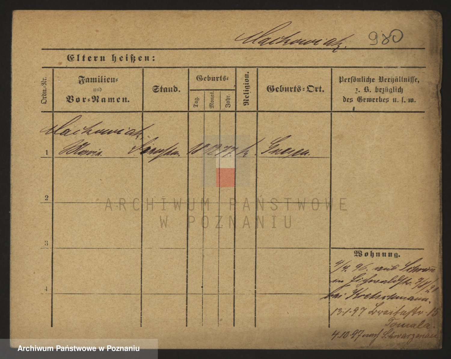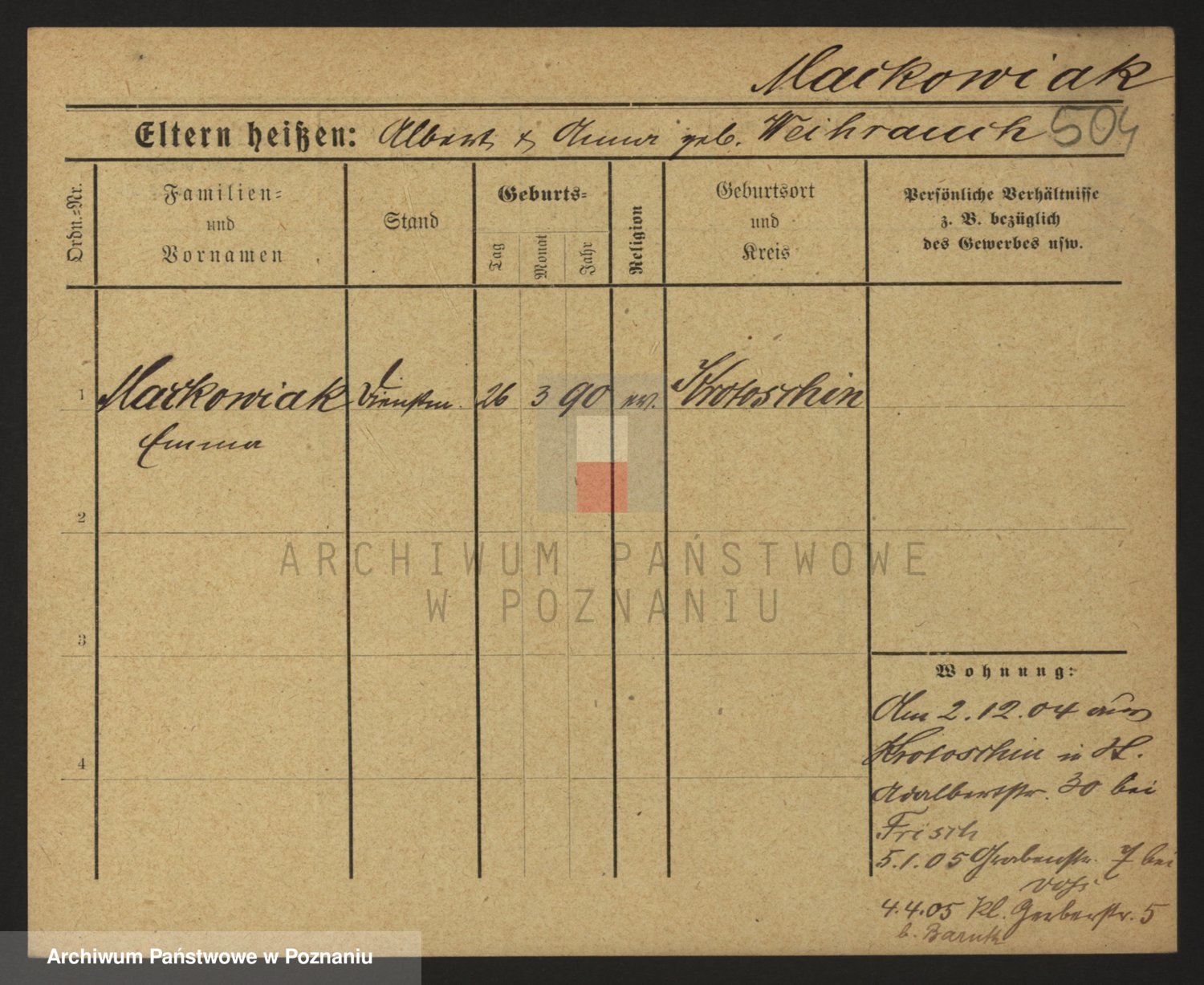 Podgląd karty osobowej dostępny jest po kliknięciu na nazwisko lub ikonkę karty. Można dokonywać powiększenia (ikony na górze) lub przechodzić między kolejnymi skanami (strzałki po bokach).