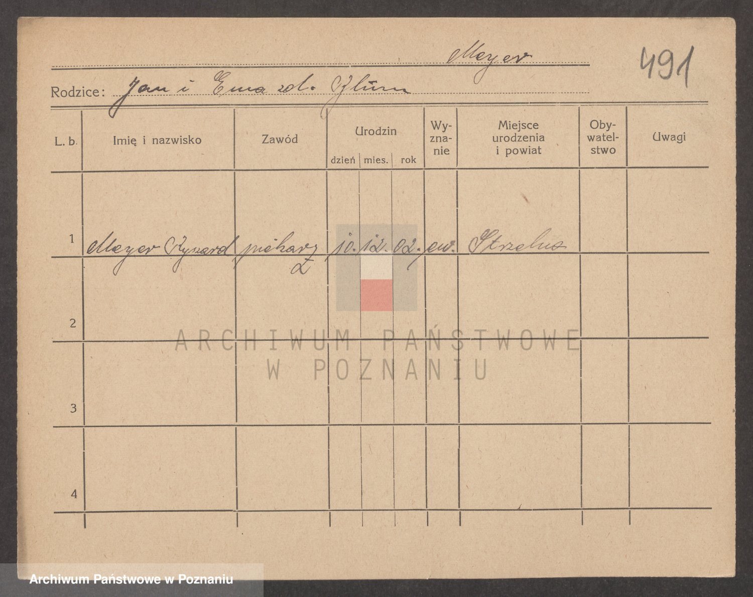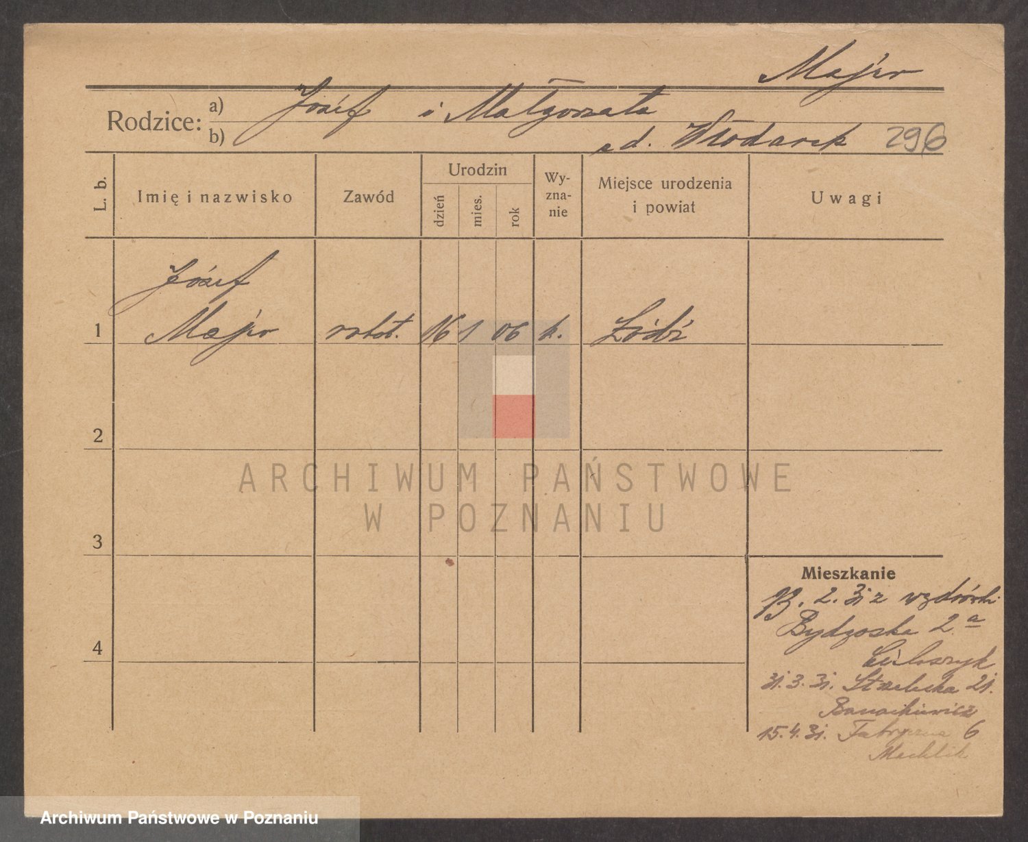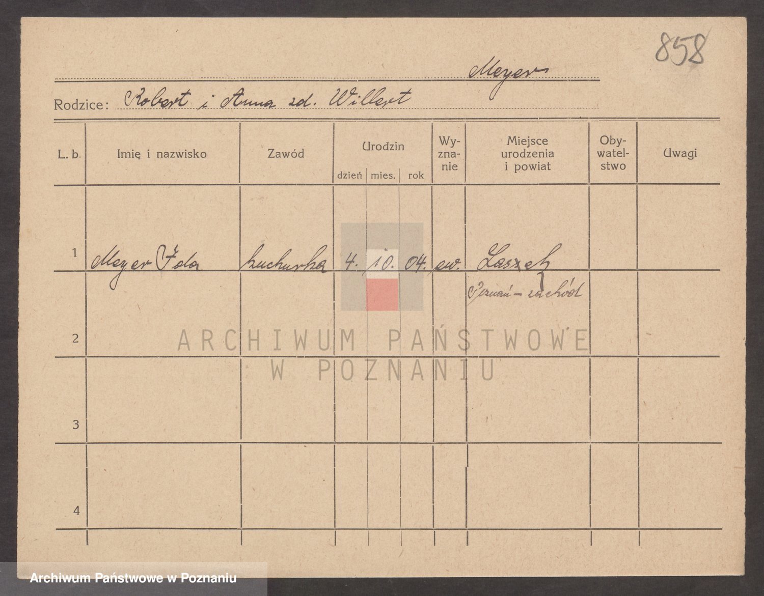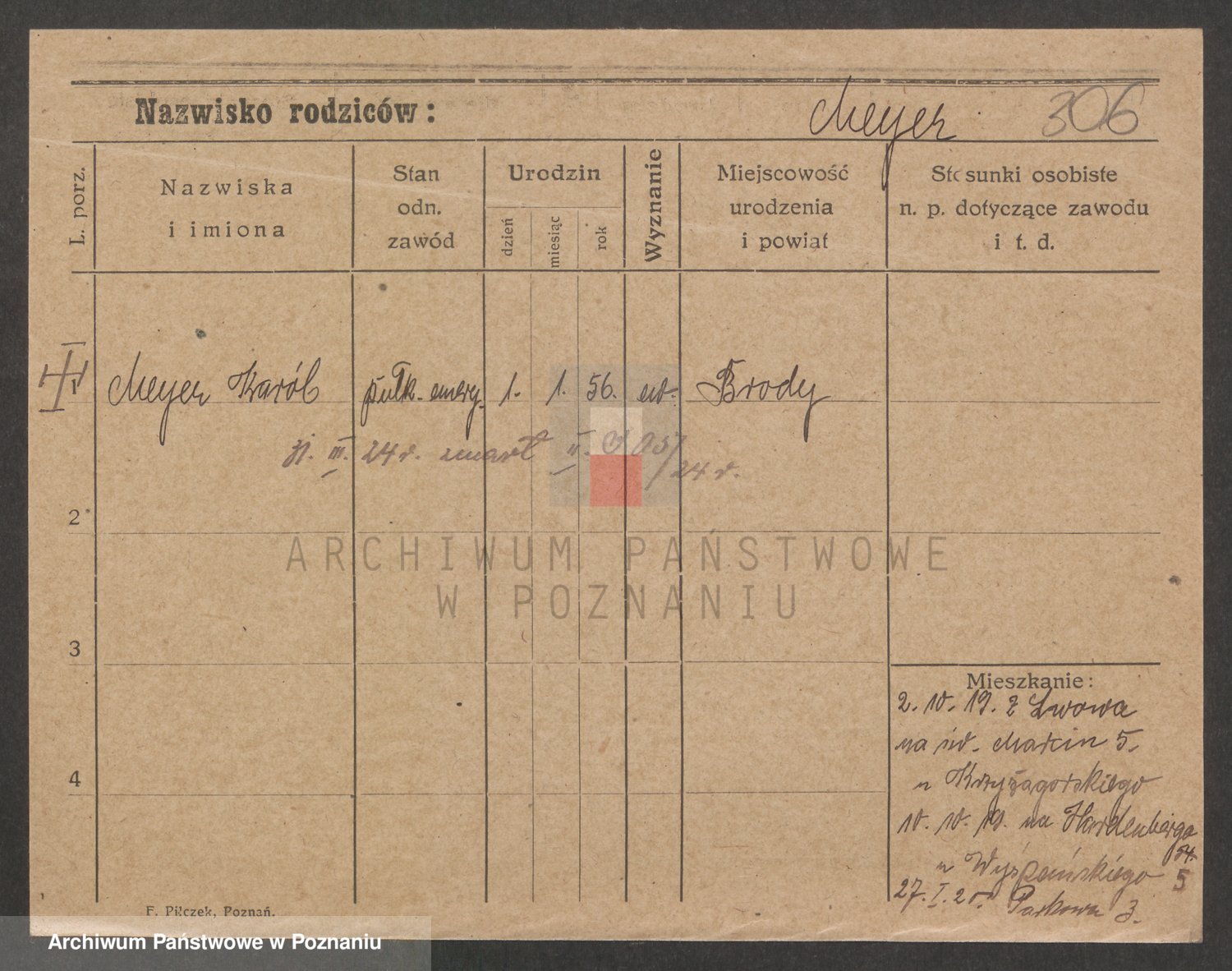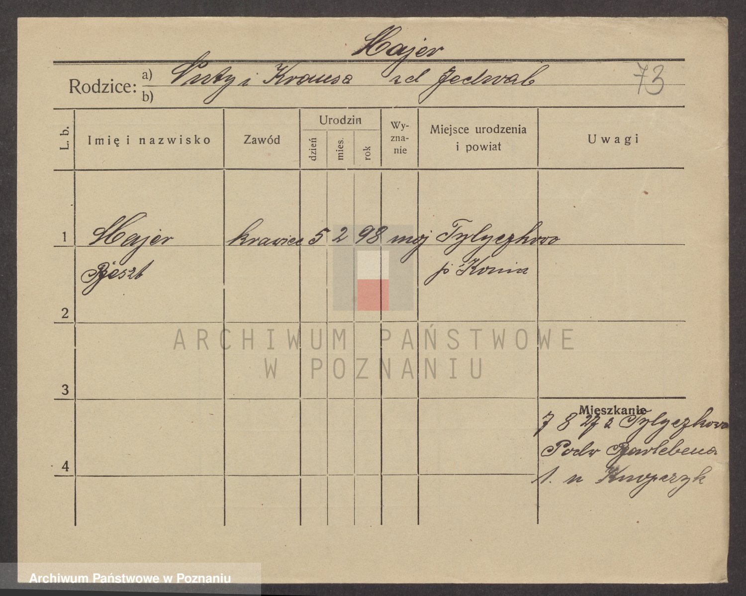 Podgląd karty osobowej dostępny jest po kliknięciu na nazwisko lub ikonkę karty. Można dokonywać powiększenia (ikony na górze) lub przechodzić między kolejnymi skanami (strzałki po bokach).