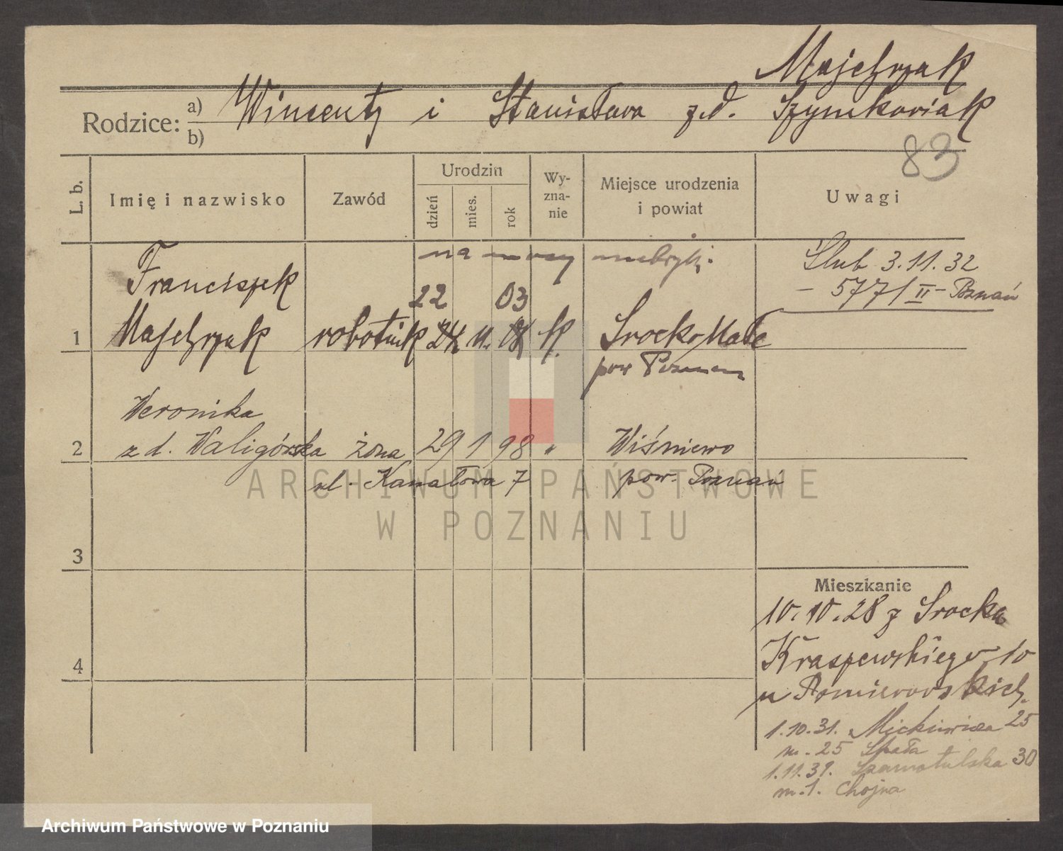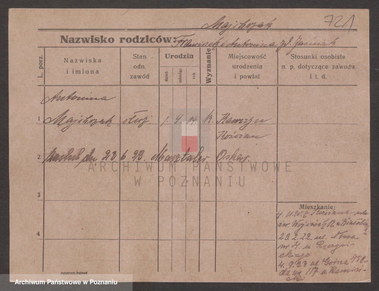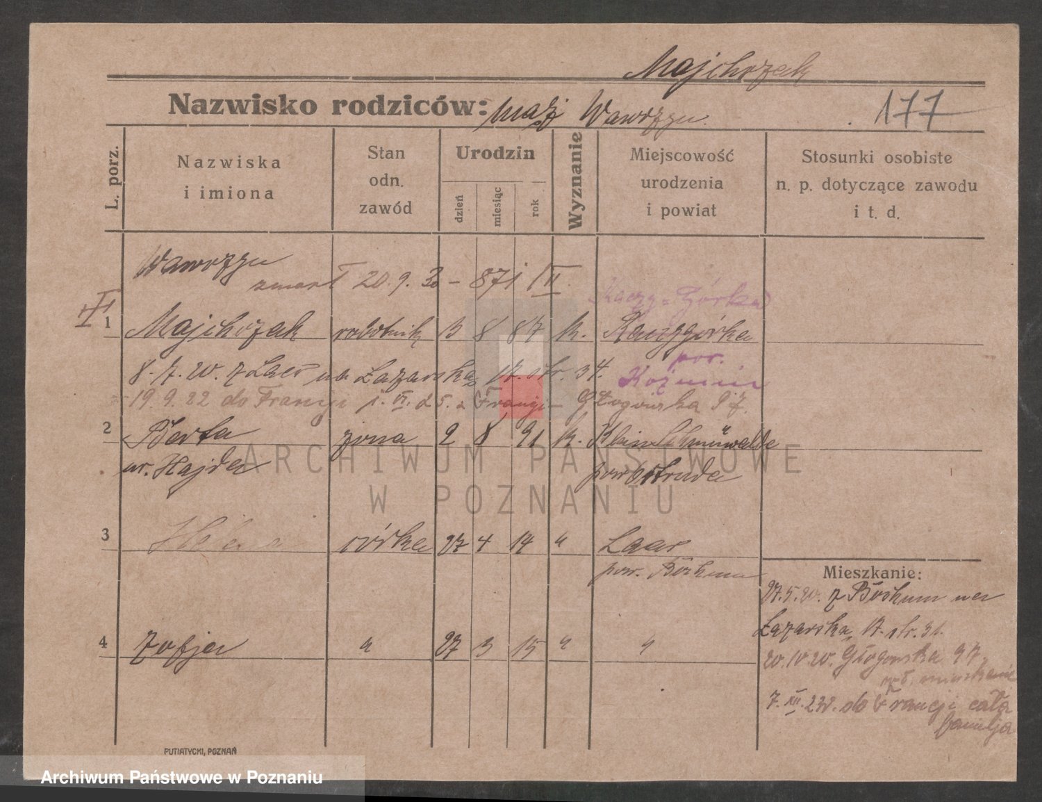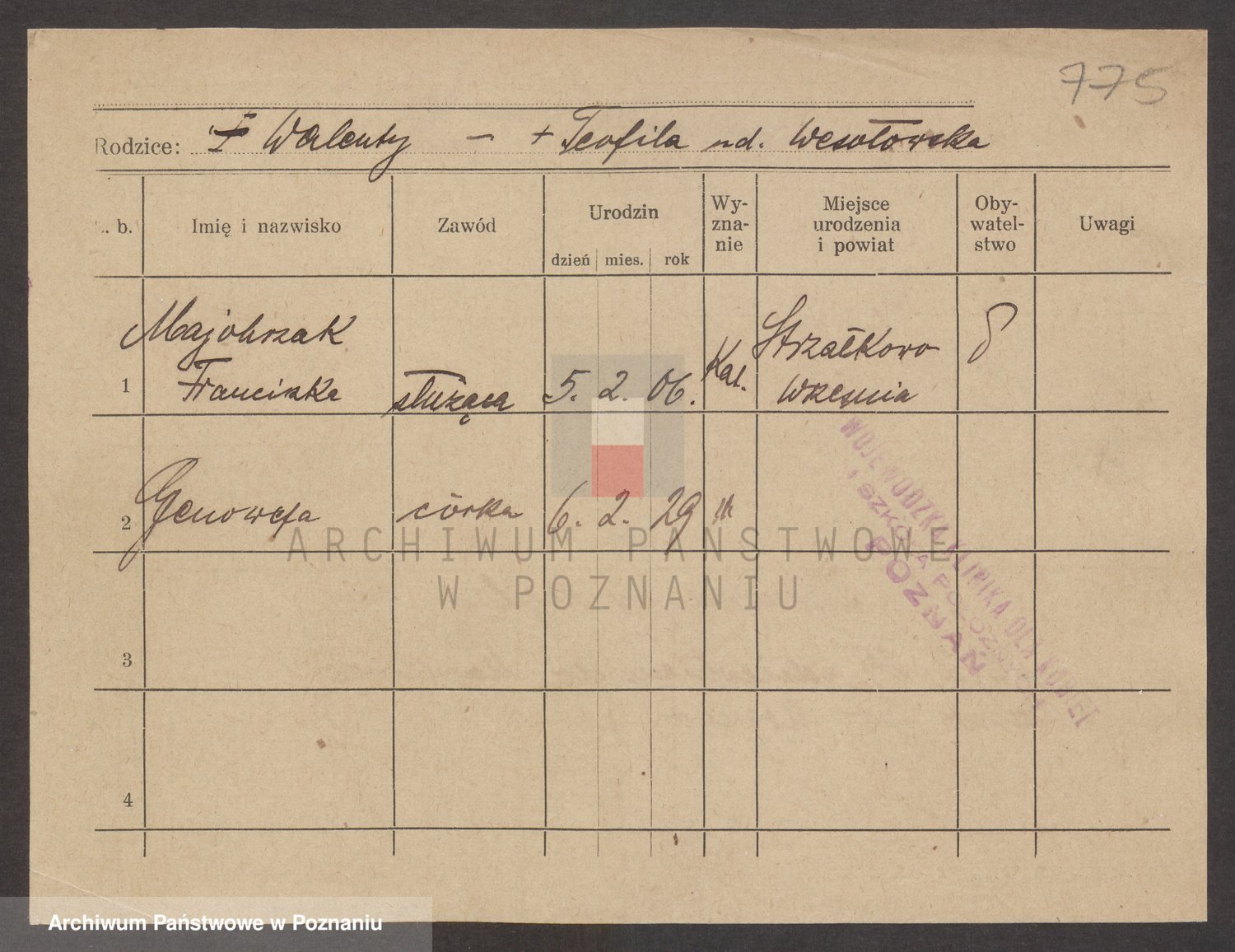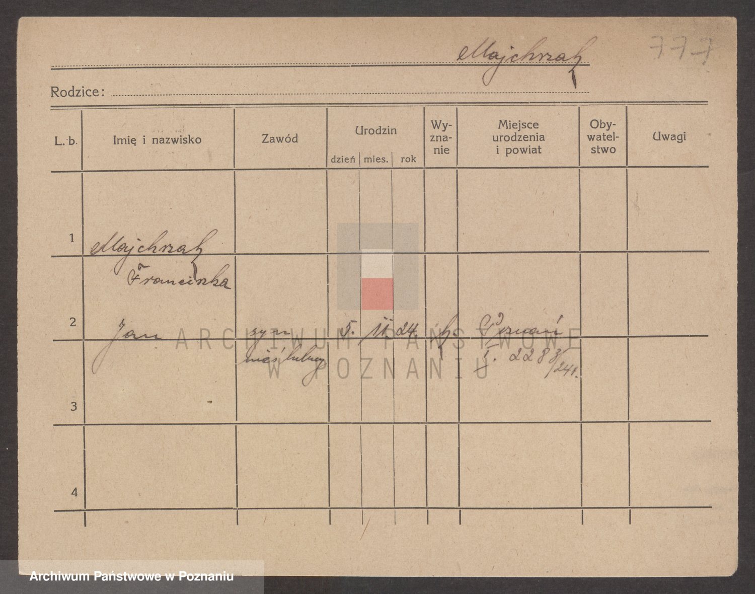 Podgląd karty osobowej dostępny jest po kliknięciu na nazwisko lub ikonkę karty. Można dokonywać powiększenia (ikony na górze) lub przechodzić między kolejnymi skanami (strzałki po bokach).