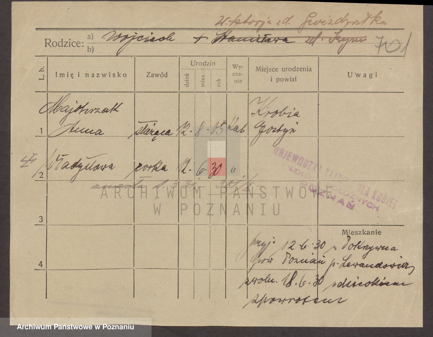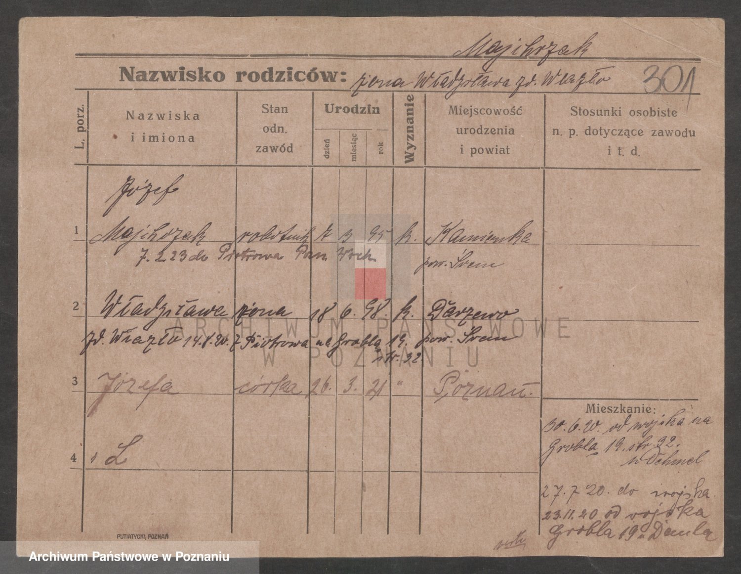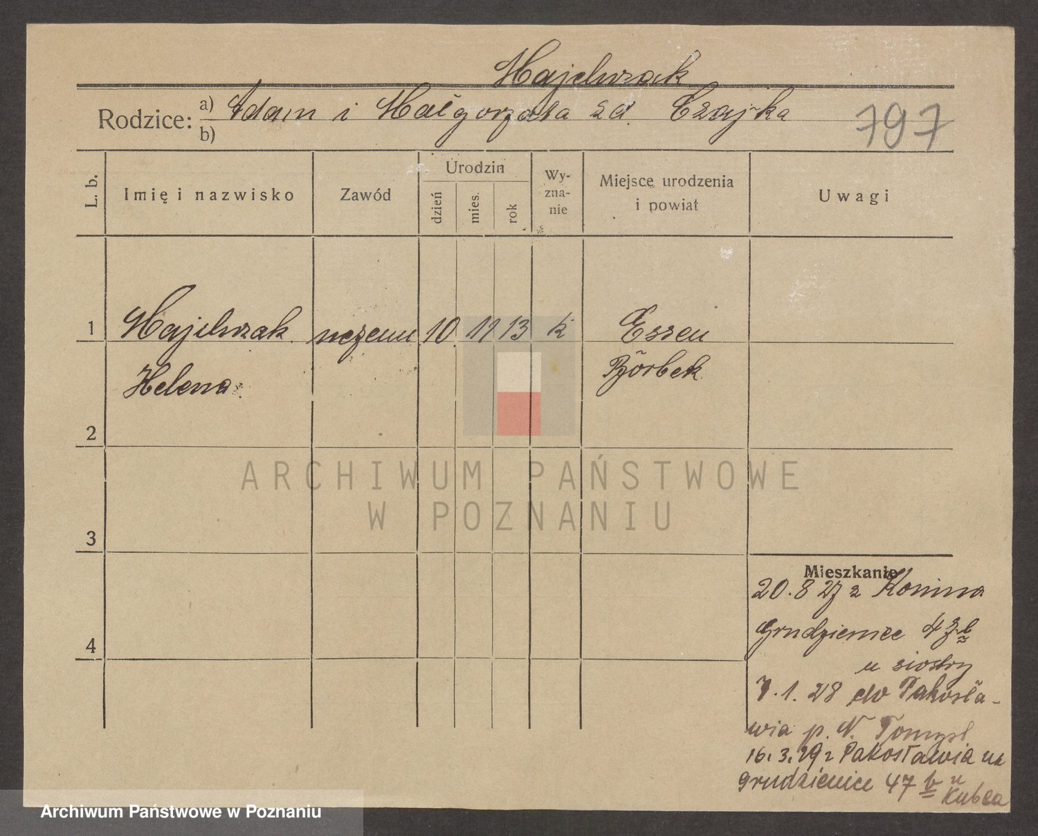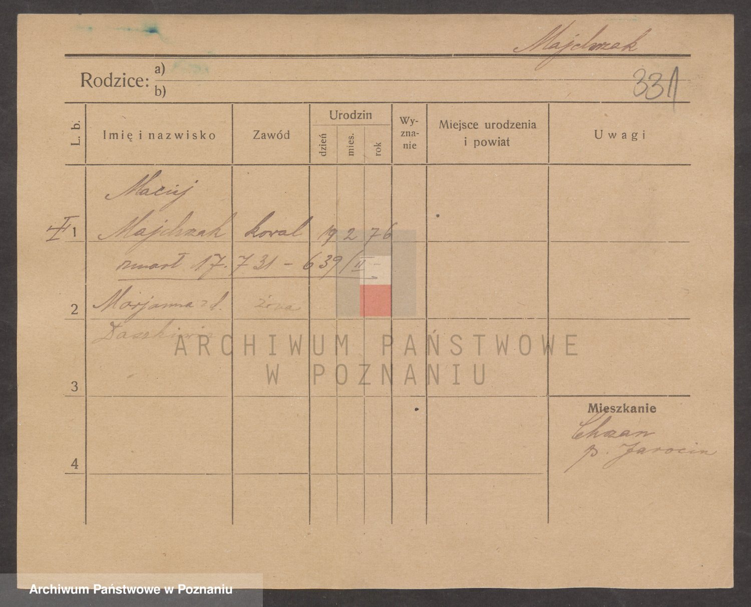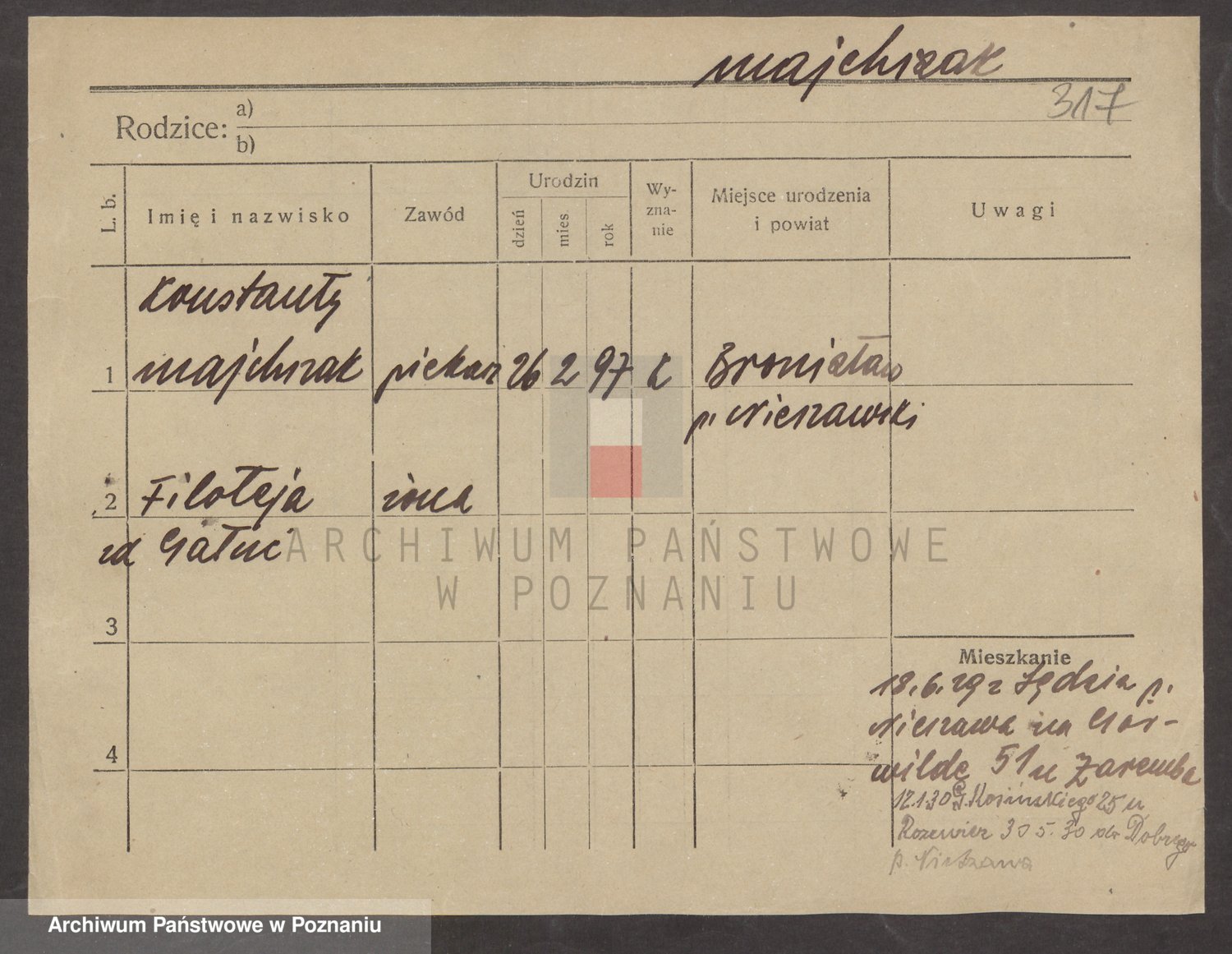 Podgląd karty osobowej dostępny jest po kliknięciu na nazwisko lub ikonkę karty. Można dokonywać powiększenia (ikony na górze) lub przechodzić między kolejnymi skanami (strzałki po bokach).