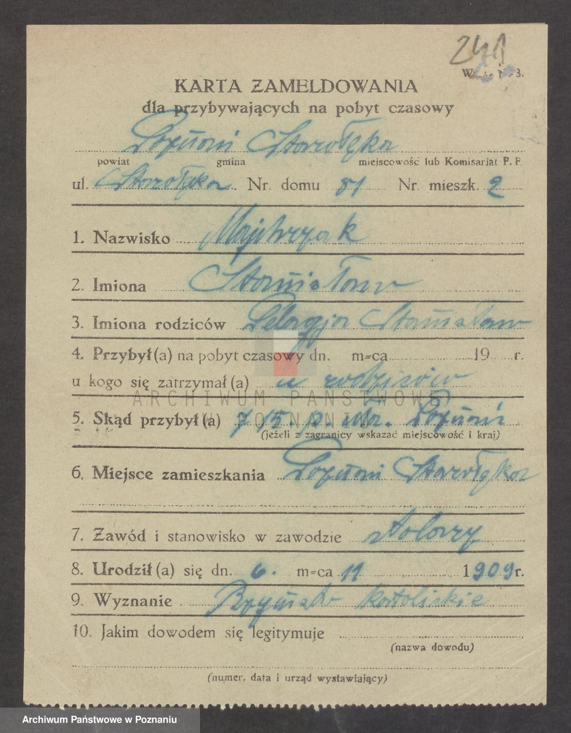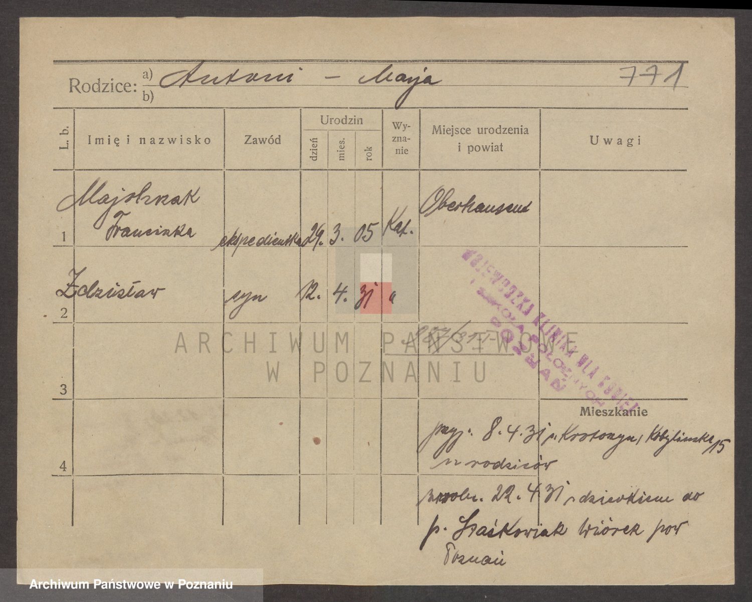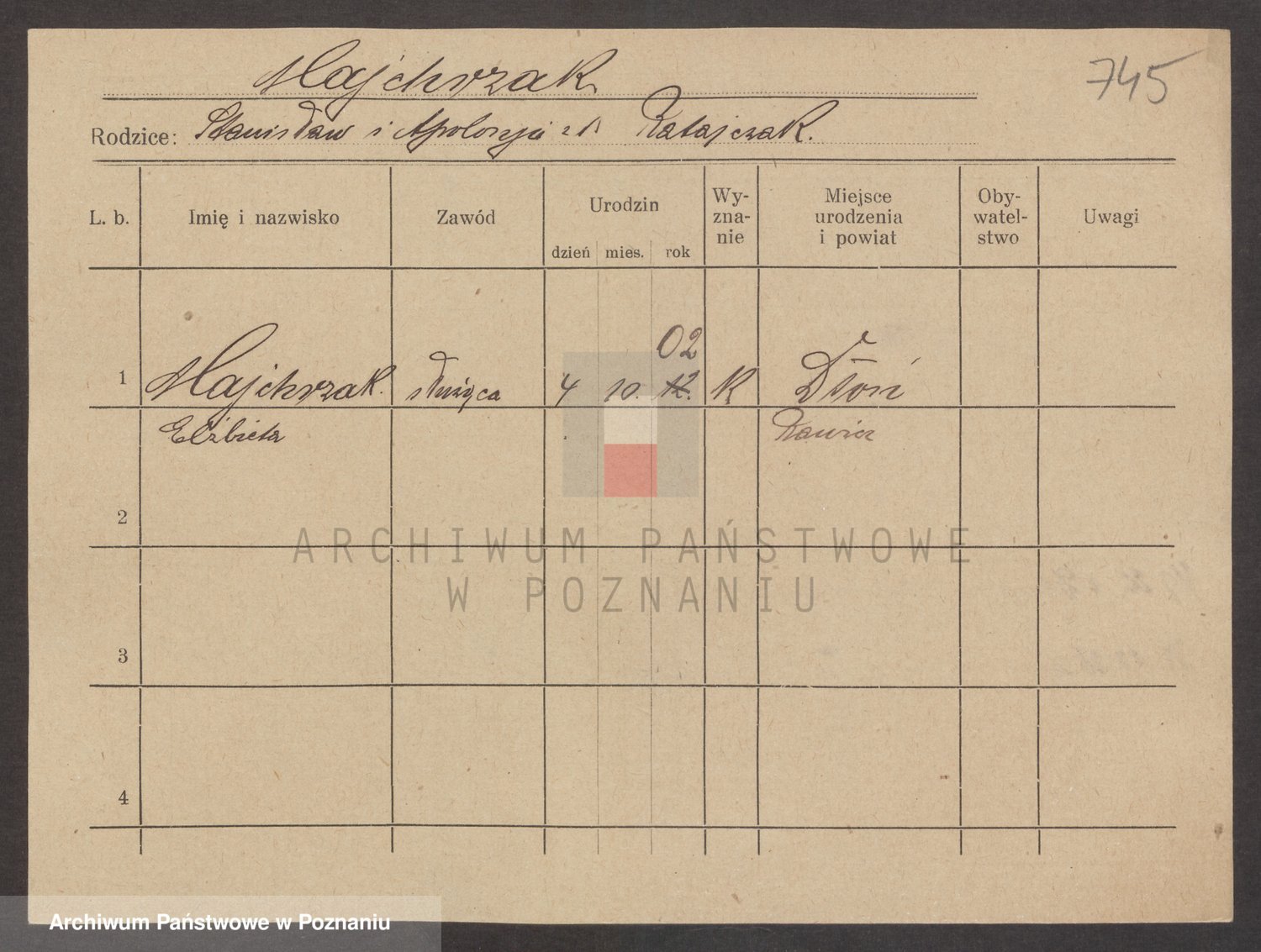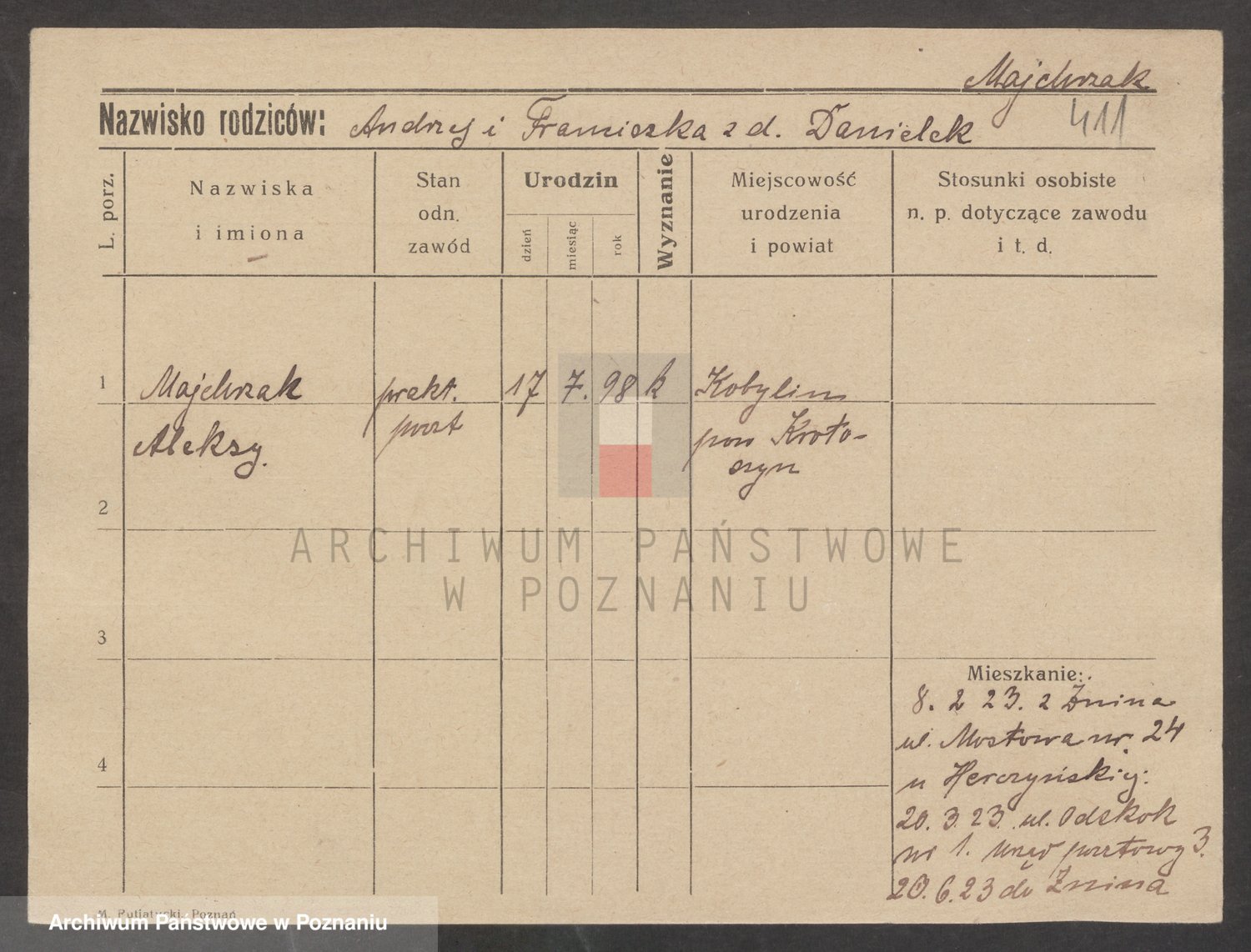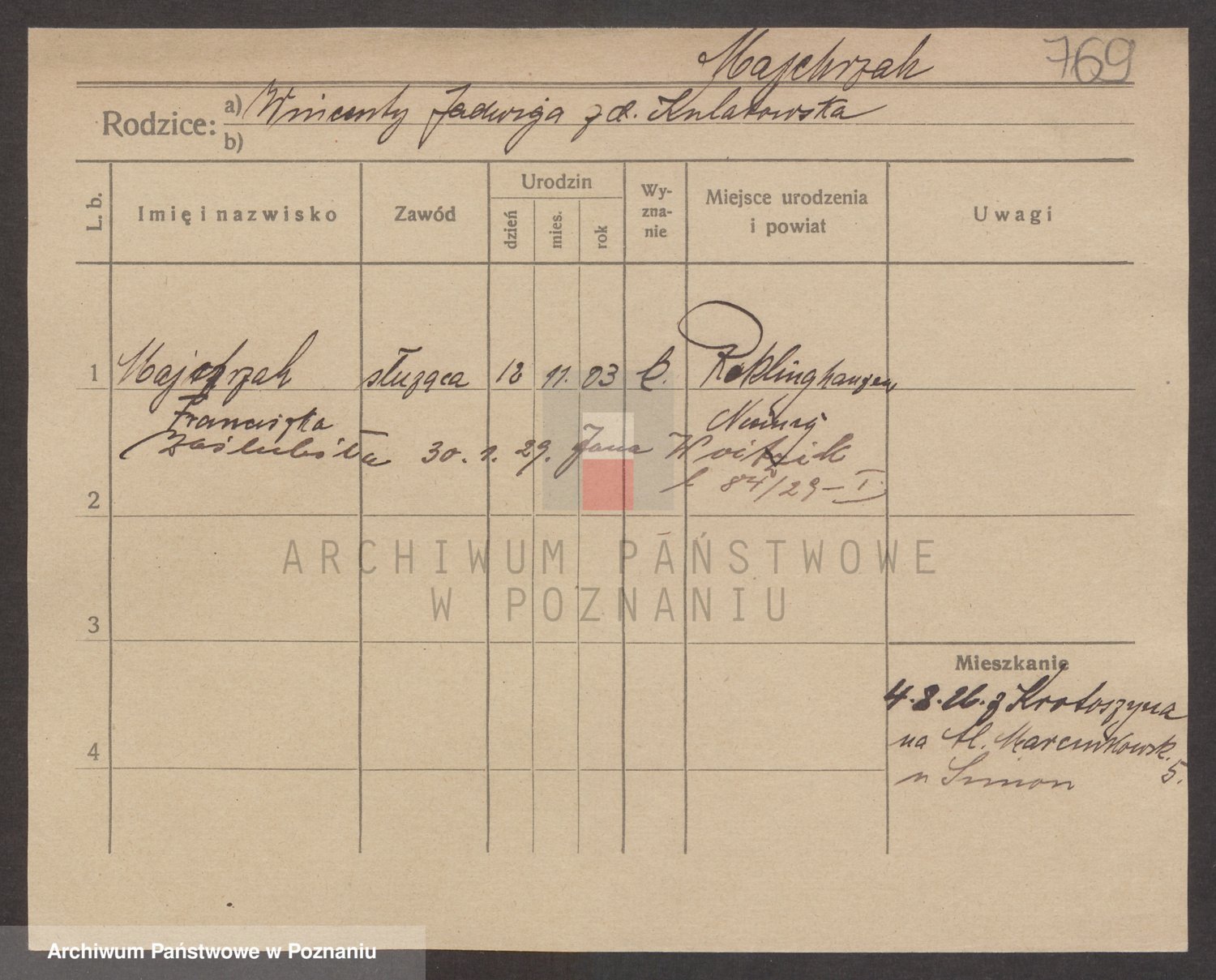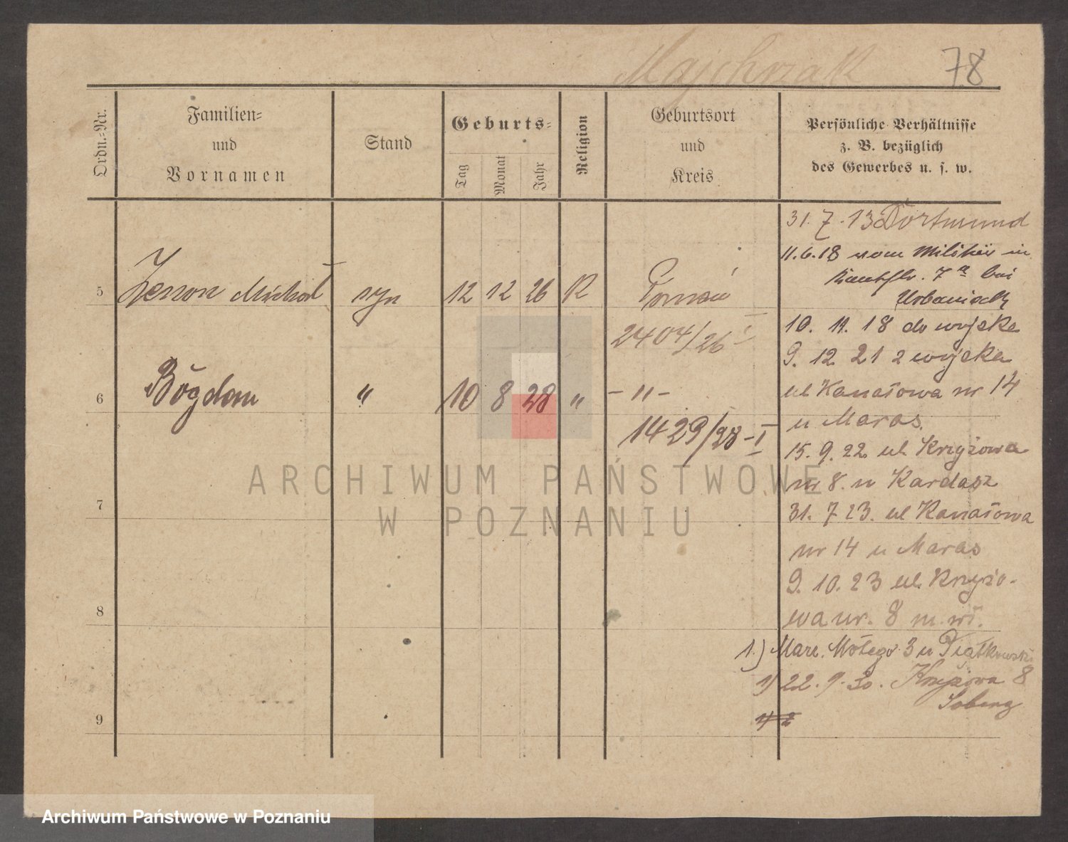 Podgląd karty osobowej dostępny jest po kliknięciu na nazwisko lub ikonkę karty. Można dokonywać powiększenia (ikony na górze) lub przechodzić między kolejnymi skanami (strzałki po bokach).