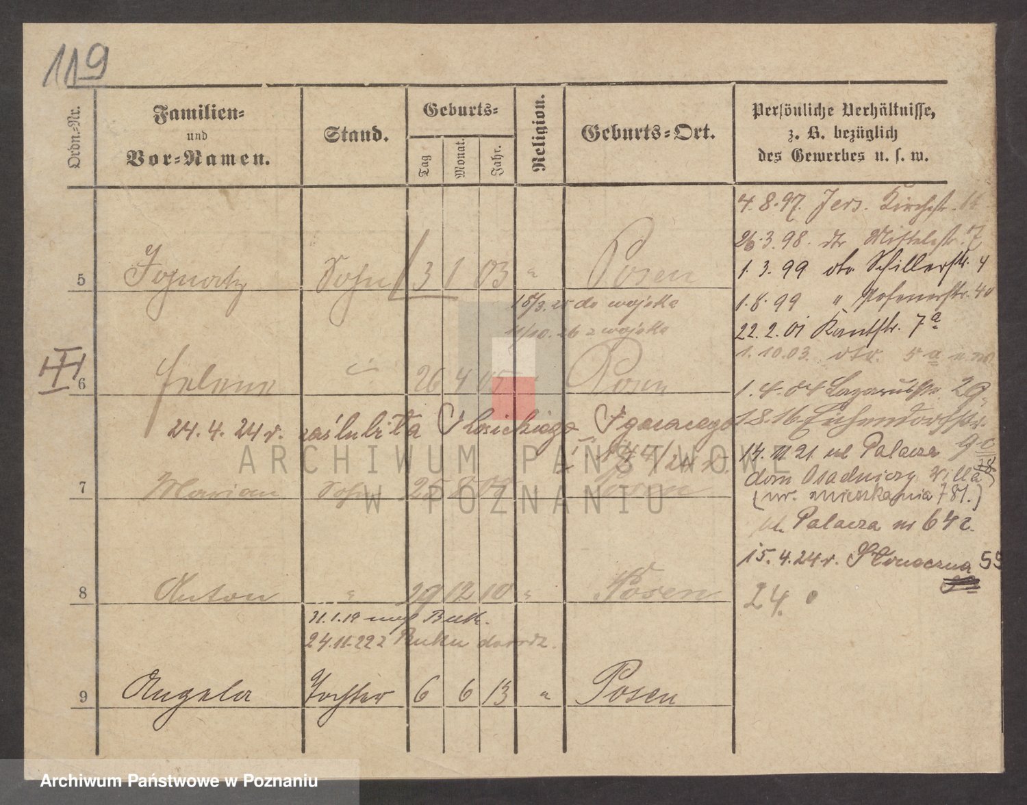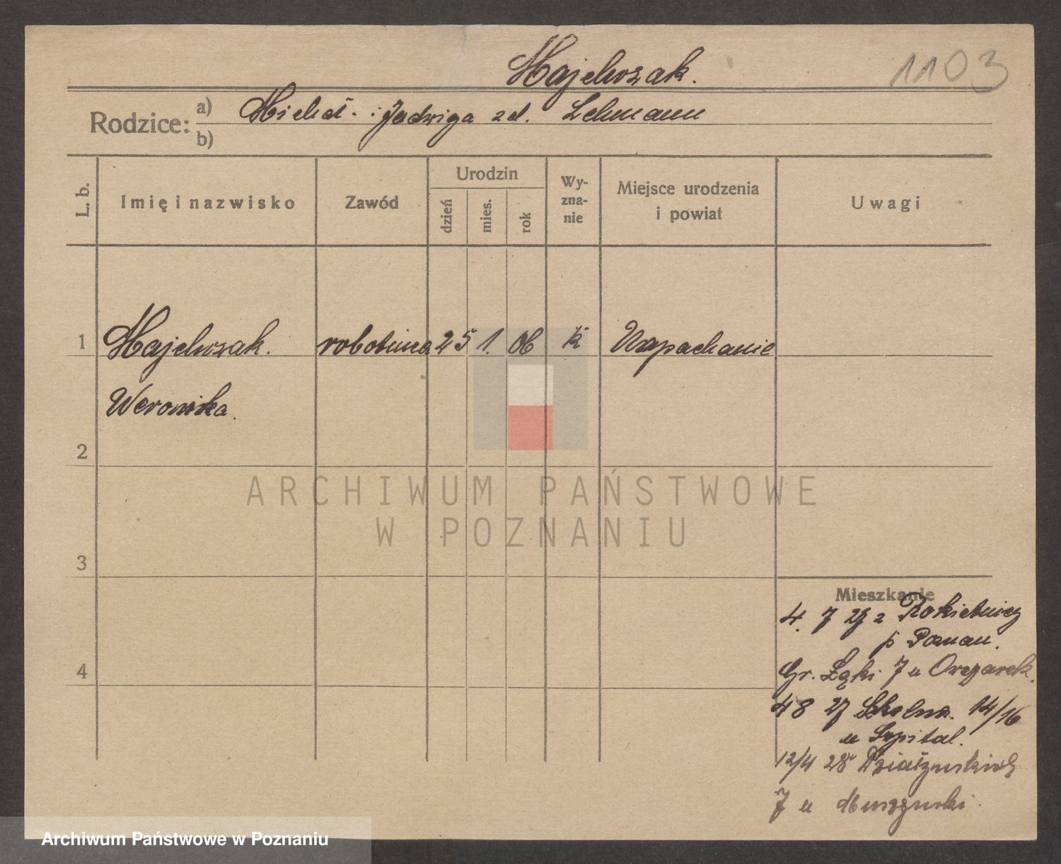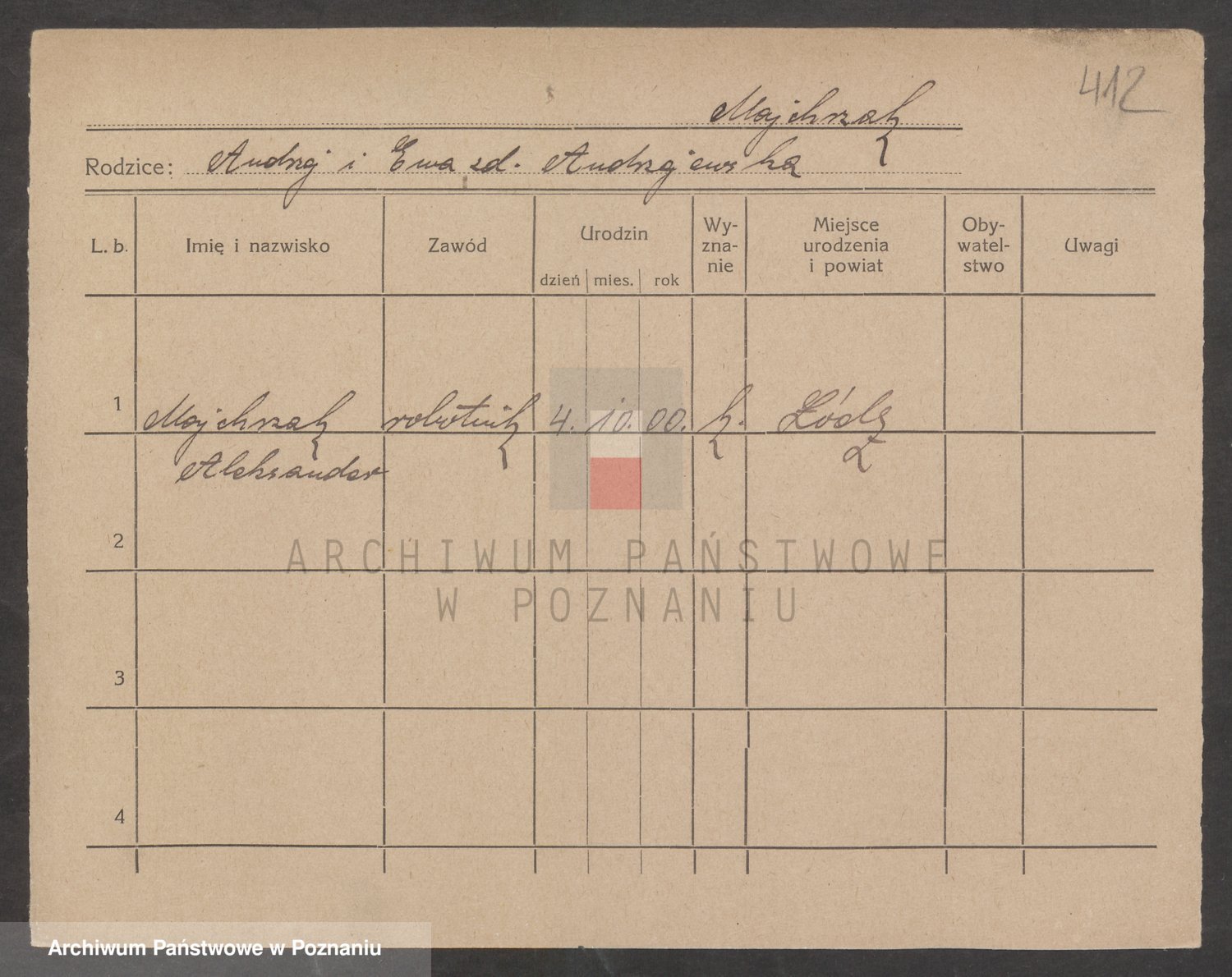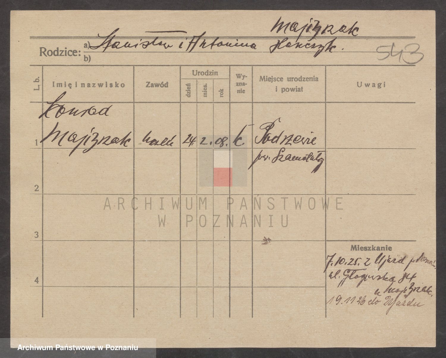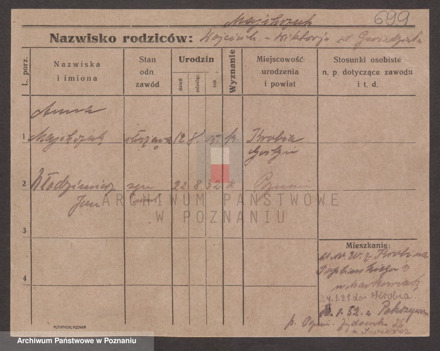 Podgląd karty osobowej dostępny jest po kliknięciu na nazwisko lub ikonkę karty. Można dokonywać powiększenia (ikony na górze) lub przechodzić między kolejnymi skanami (strzałki po bokach).