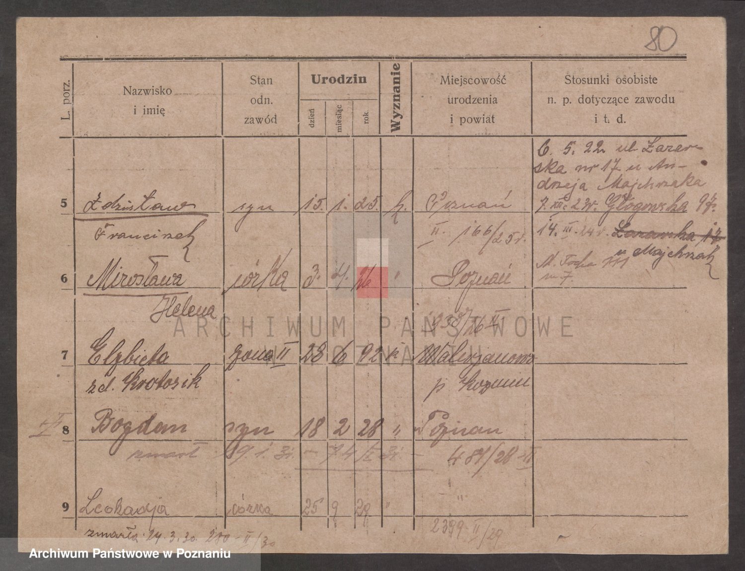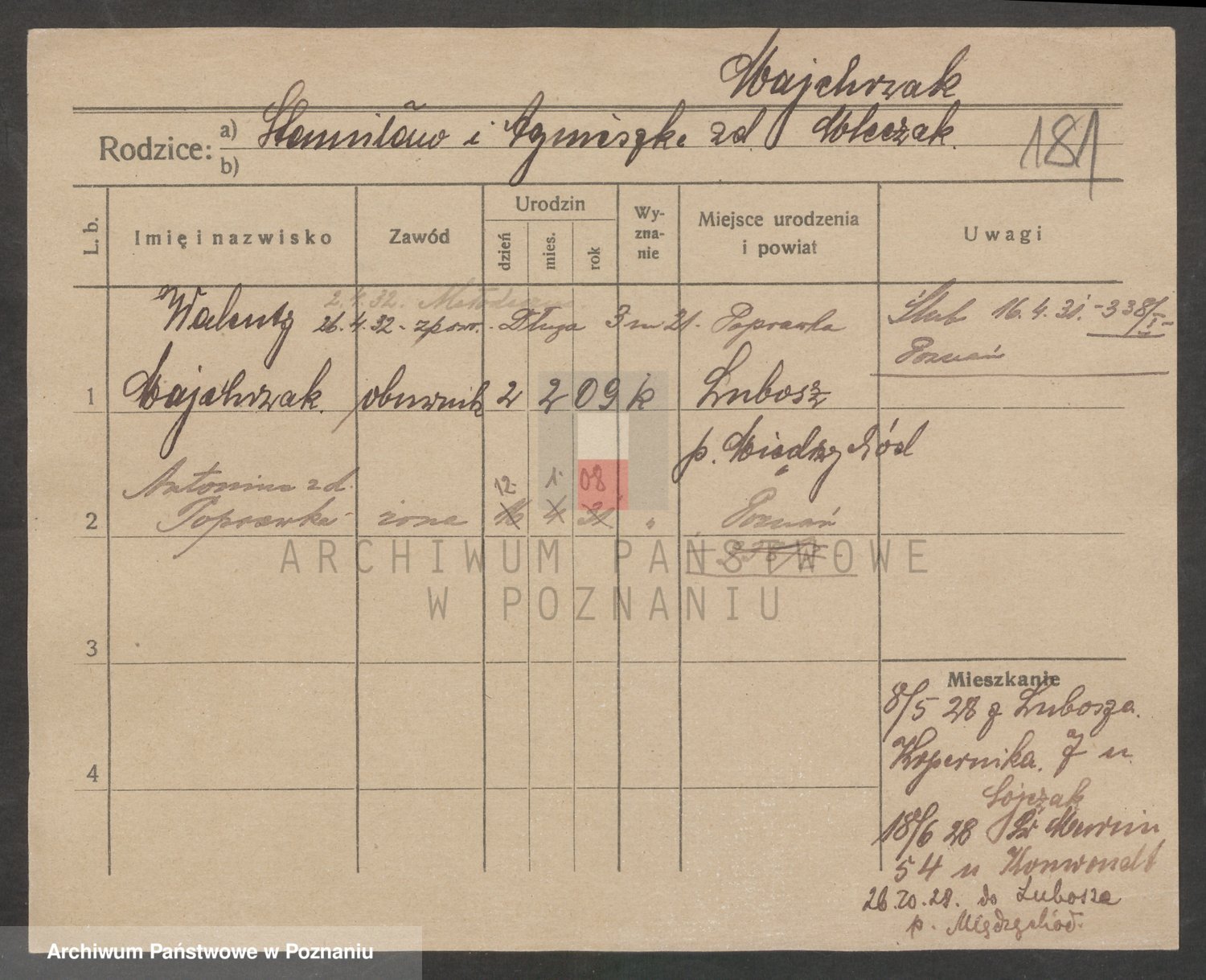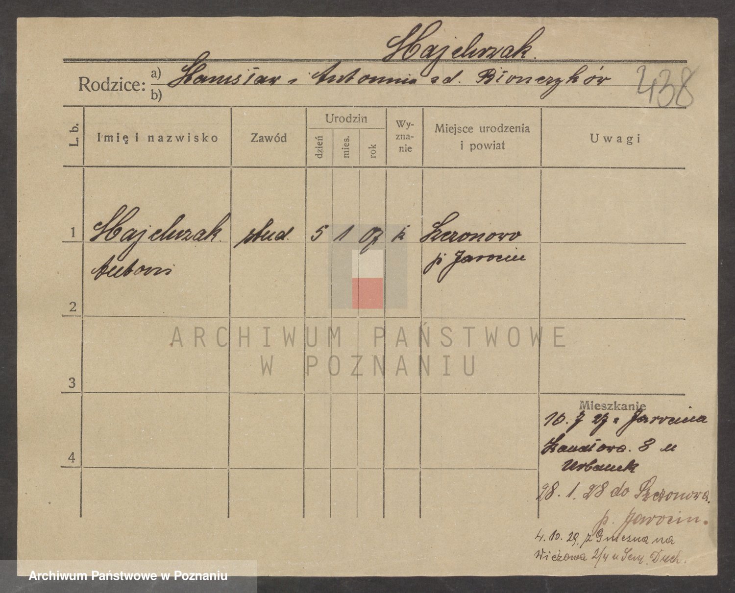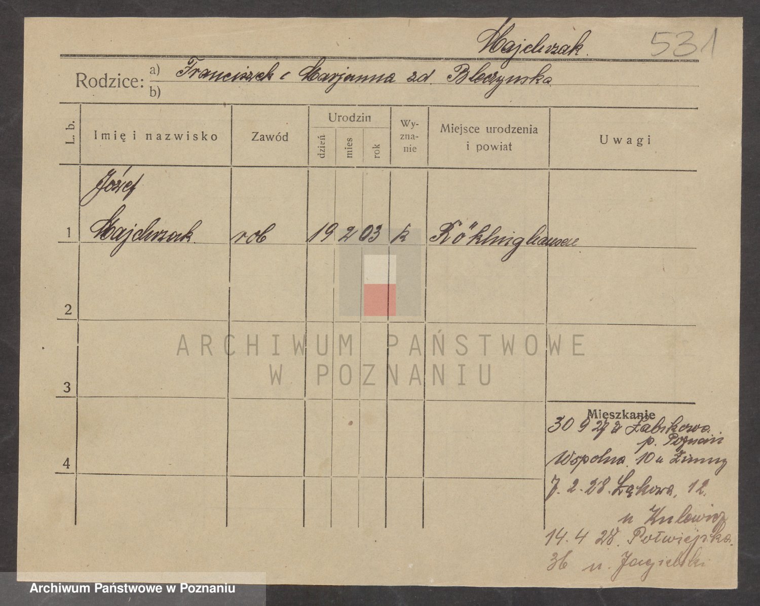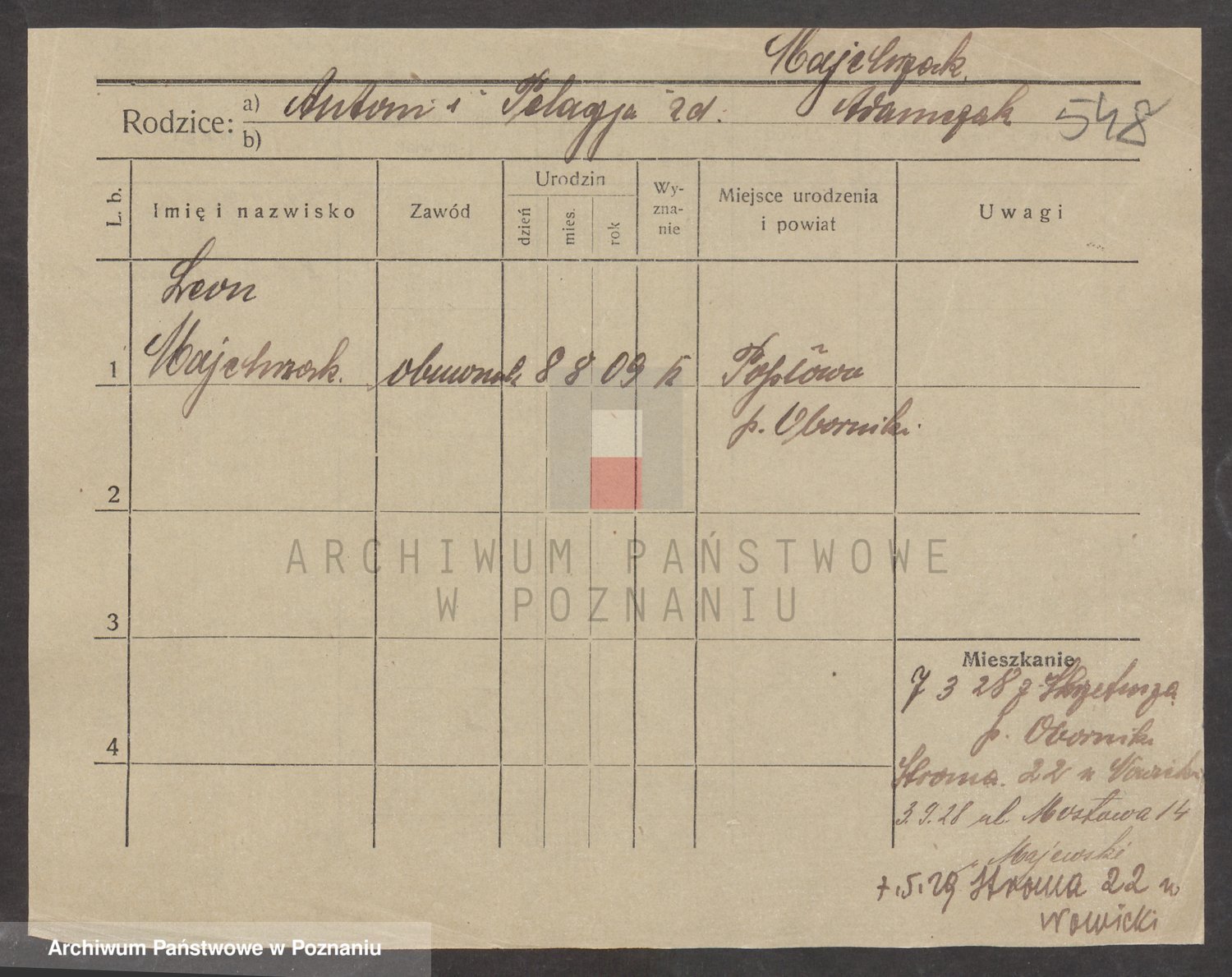 Podgląd karty osobowej dostępny jest po kliknięciu na nazwisko lub ikonkę karty. Można dokonywać powiększenia (ikony na górze) lub przechodzić między kolejnymi skanami (strzałki po bokach).