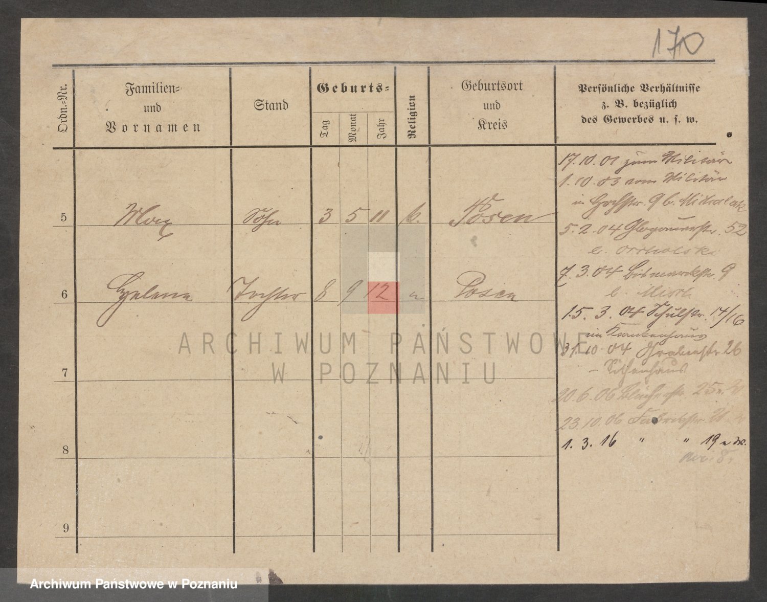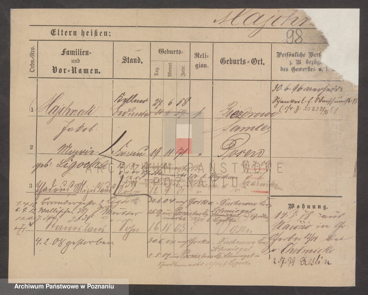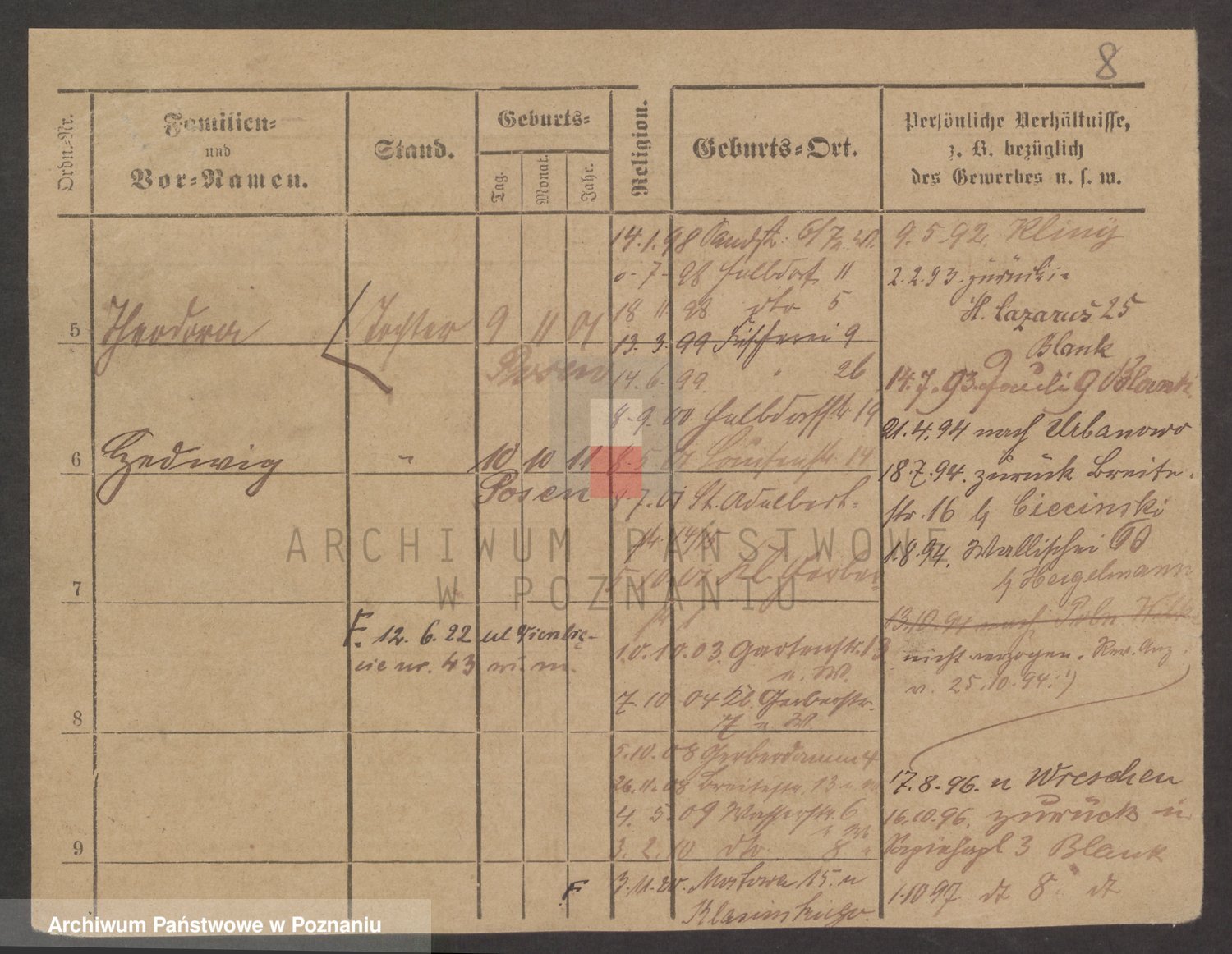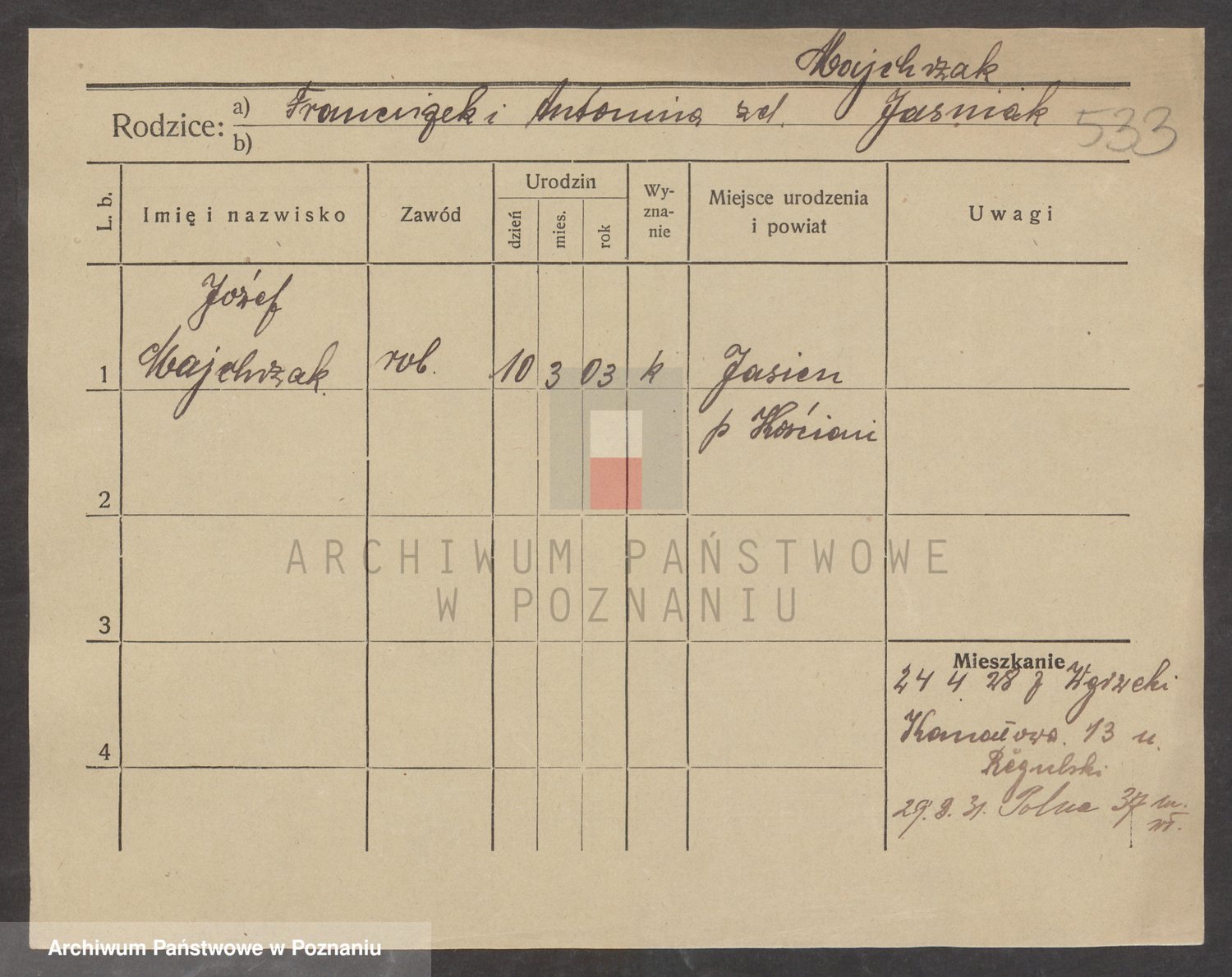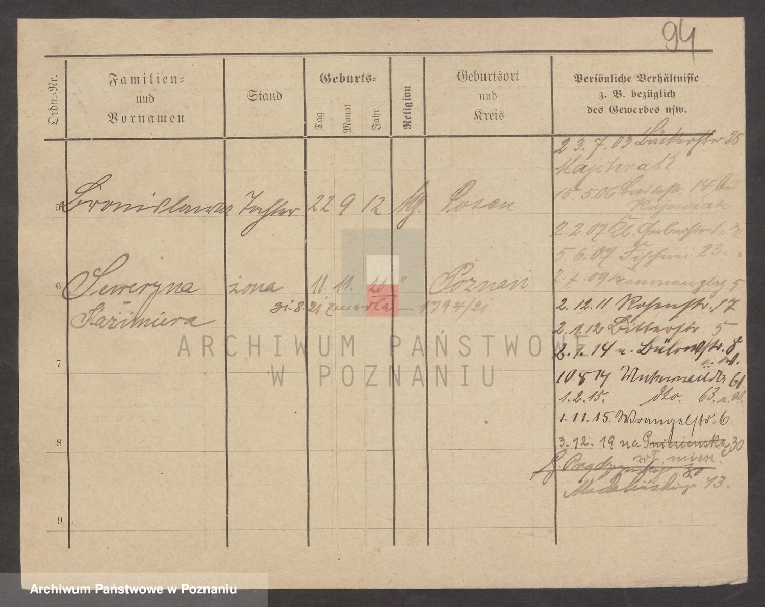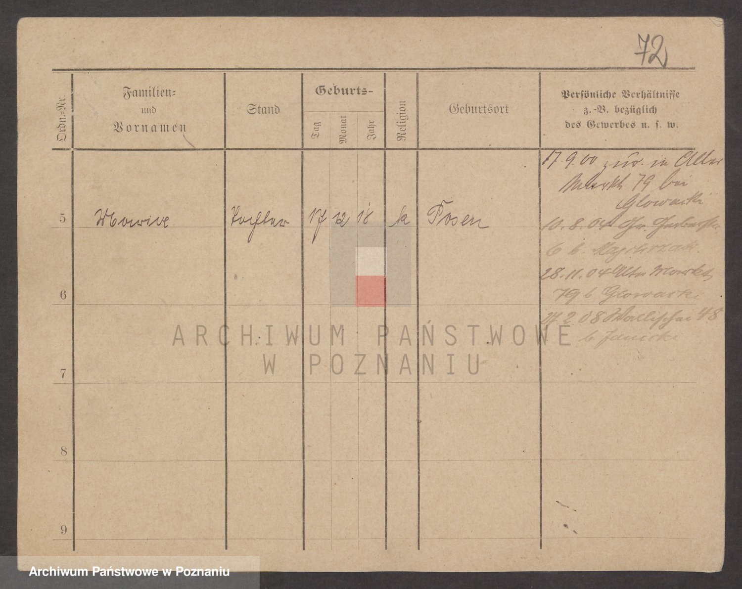 Podgląd karty osobowej dostępny jest po kliknięciu na nazwisko lub ikonkę karty. Można dokonywać powiększenia (ikony na górze) lub przechodzić między kolejnymi skanami (strzałki po bokach).